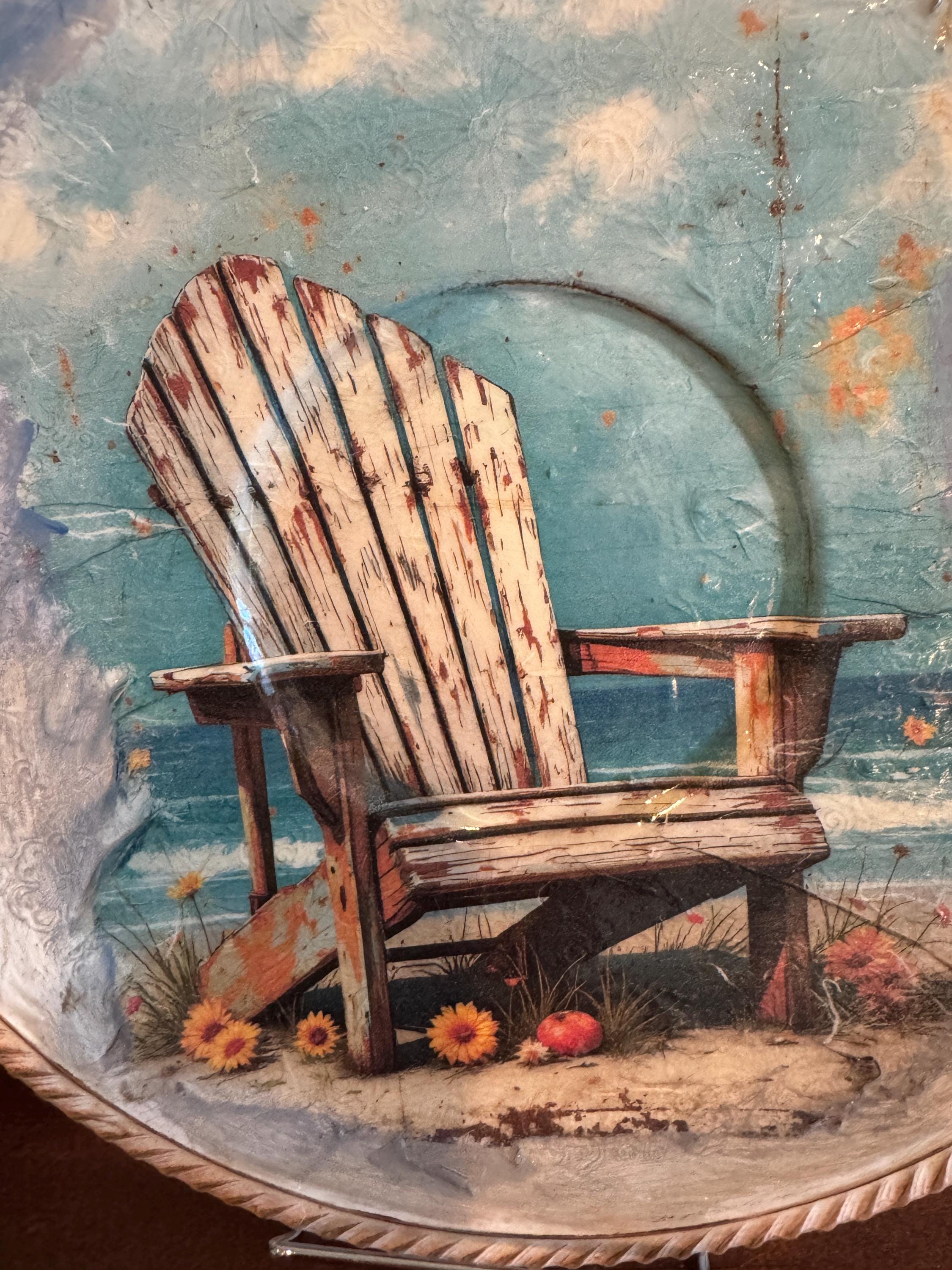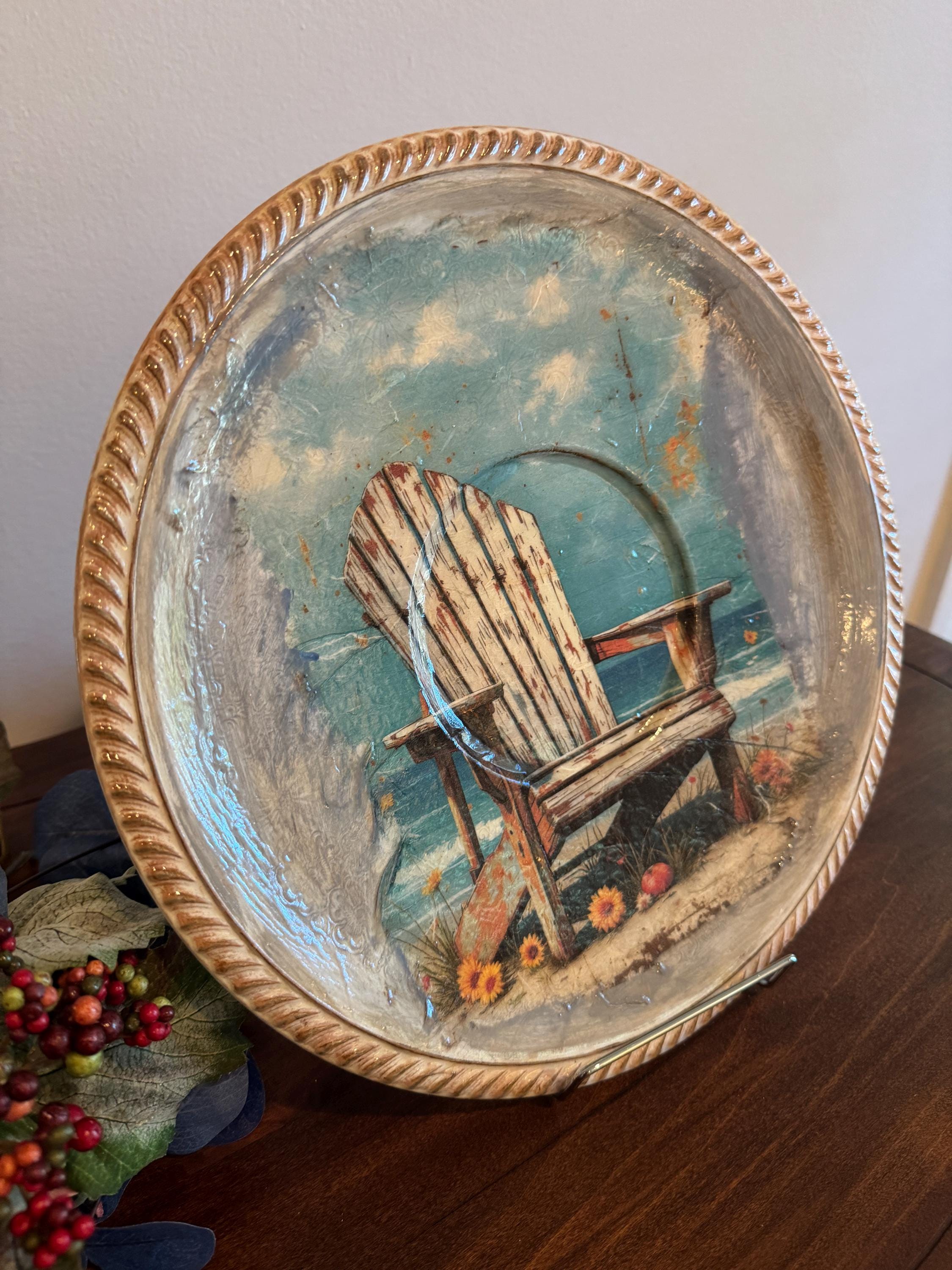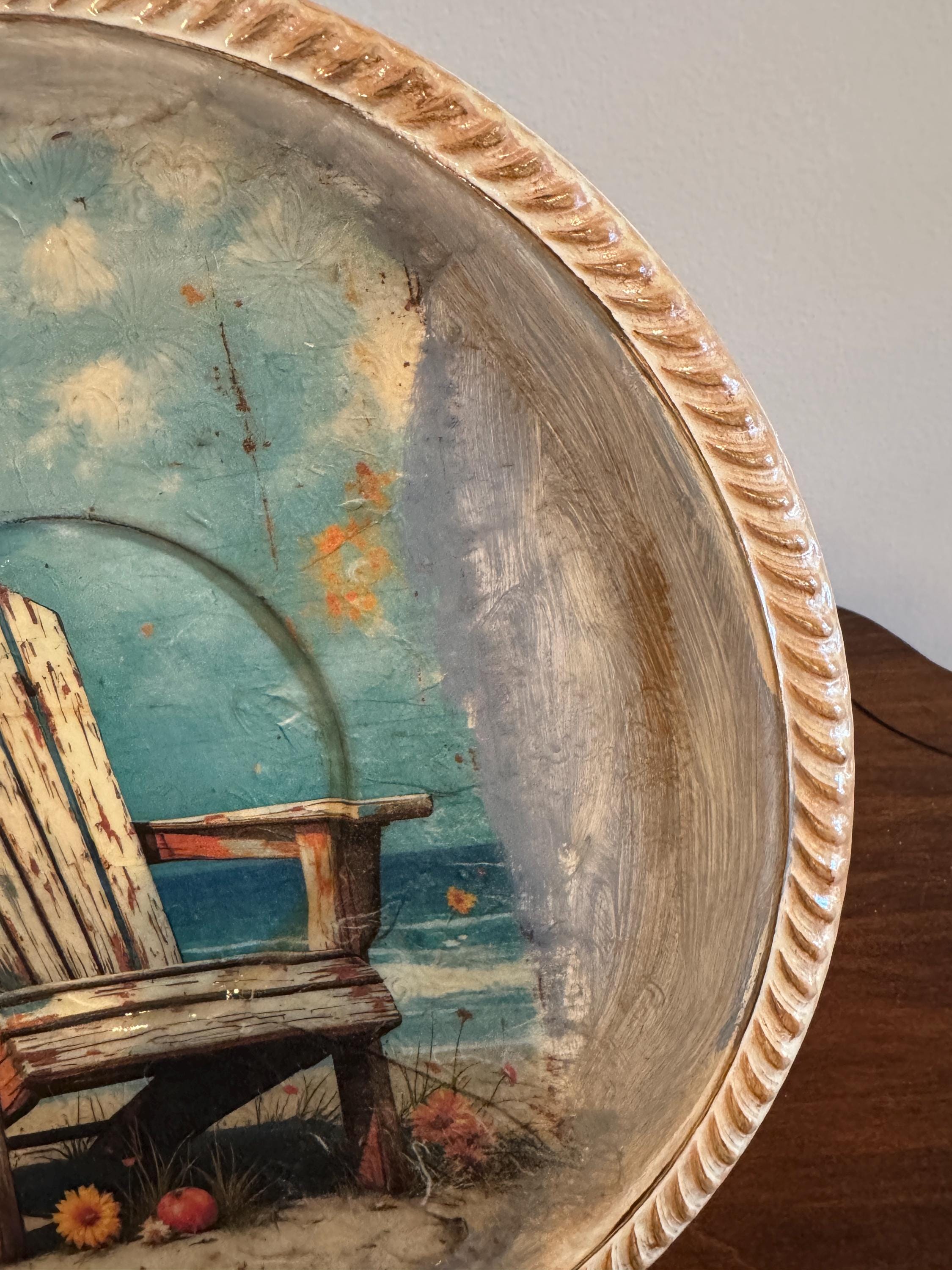 Bring timeless charm to your home with this vintage 12” metal serving tray, beautifully upcycled in a shabby chic style. Hand-painted and adorned with a classic beach photograph, it’s perfect for serving, display, or adding a touch of decorative flair. Ideal for beach décor lovers, thrift store flip enthusiasts, and anyone seeking unique home accents.