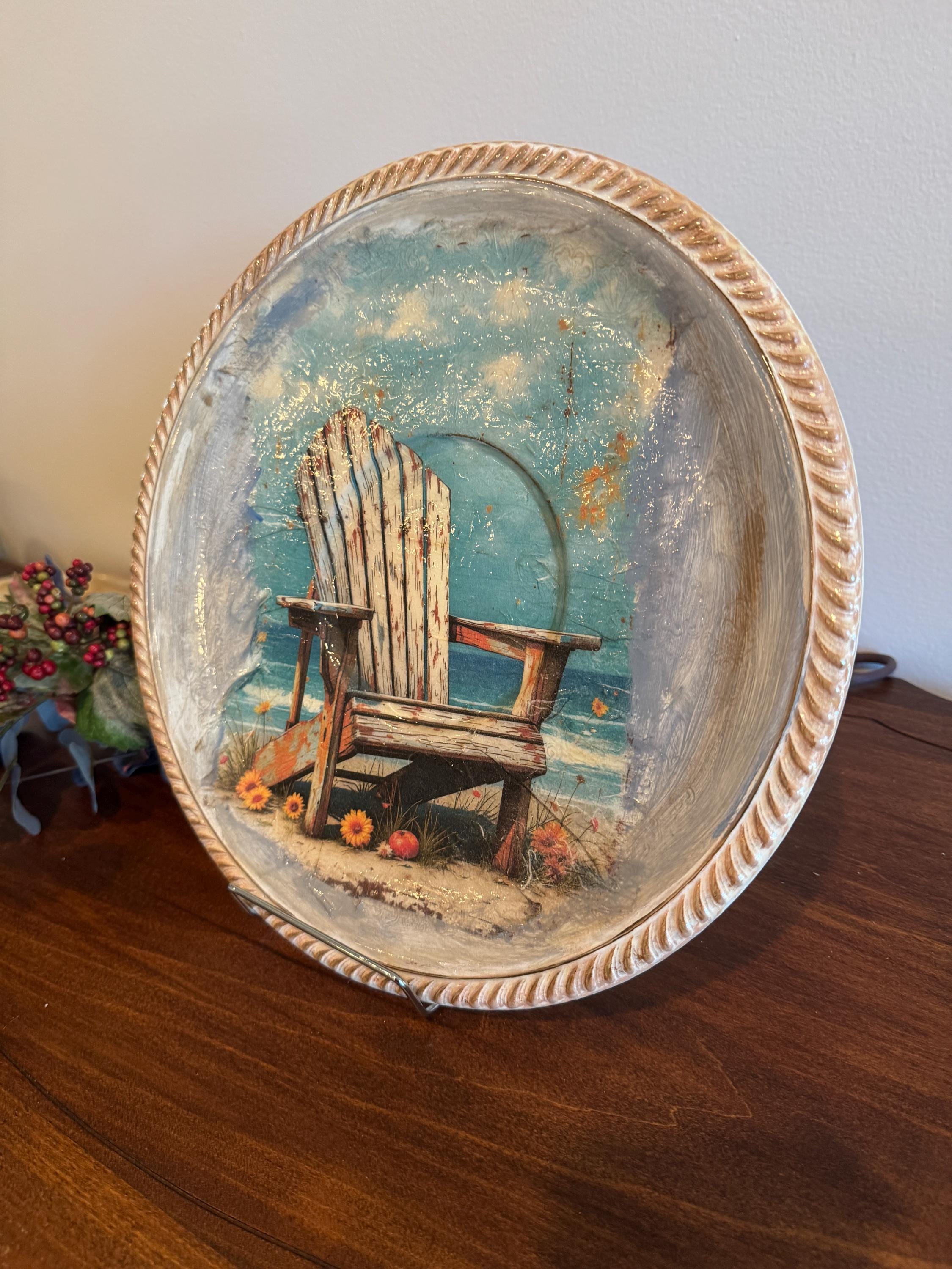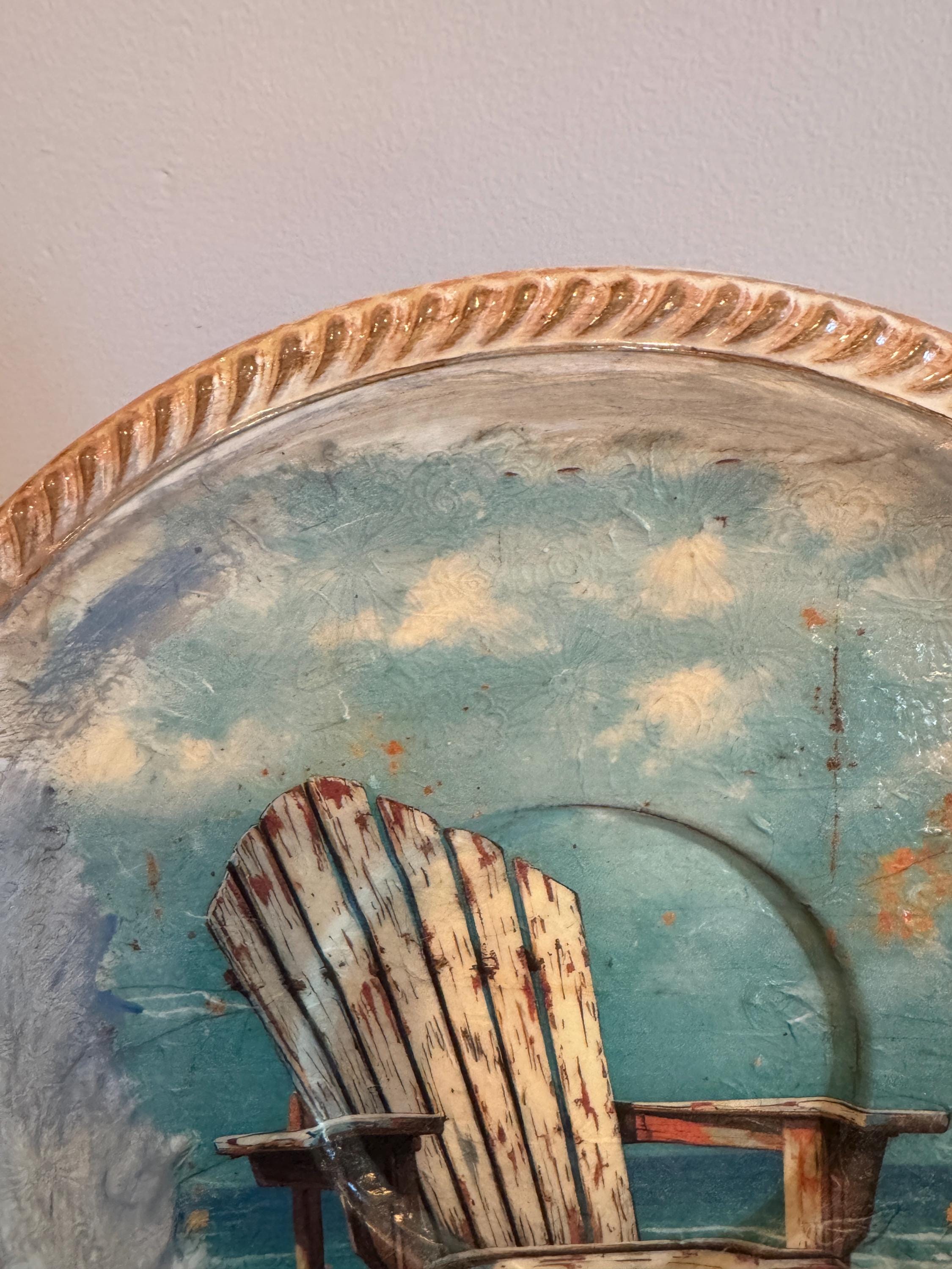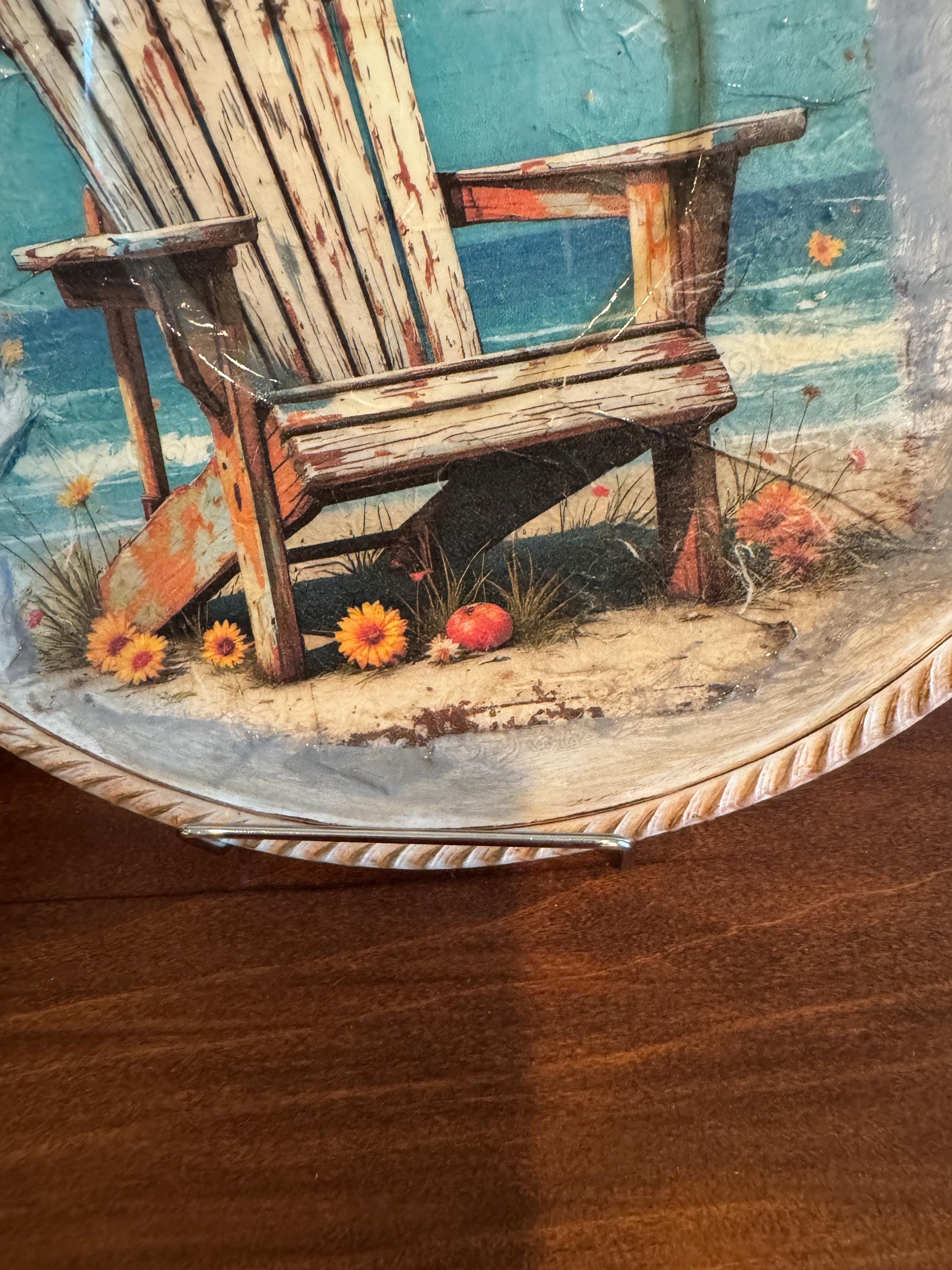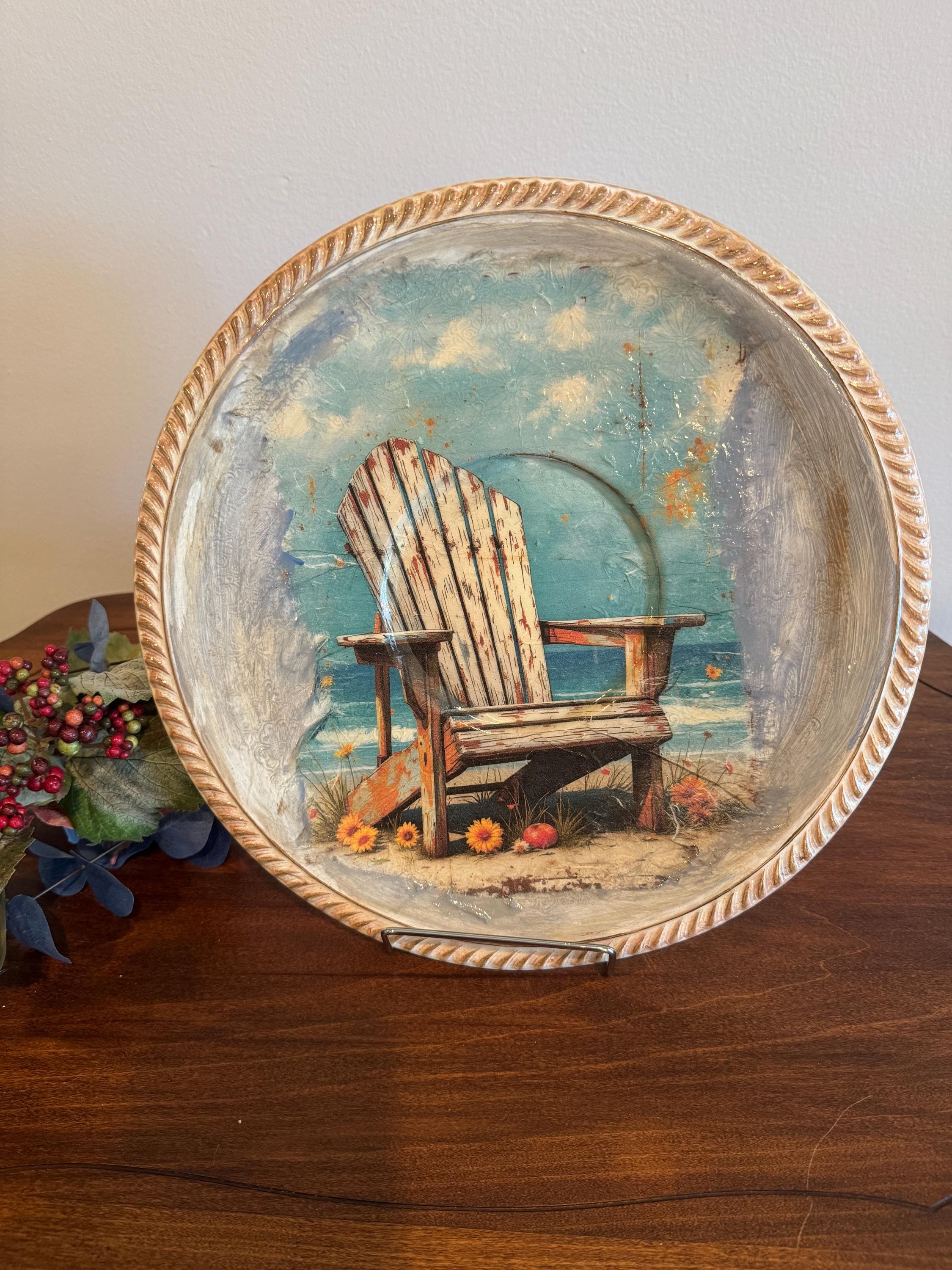 Bring timeless charm to your home with this vintage 12” metal serving tray, beautifully upcycled in a shabby chic style. Hand-painted and adorned with a classic beach photograph, it’s perfect for serving, display, or adding a touch of decorative flair. Ideal for beach décor lovers, thrift store flip enthusiasts, and anyone seeking unique home accents.