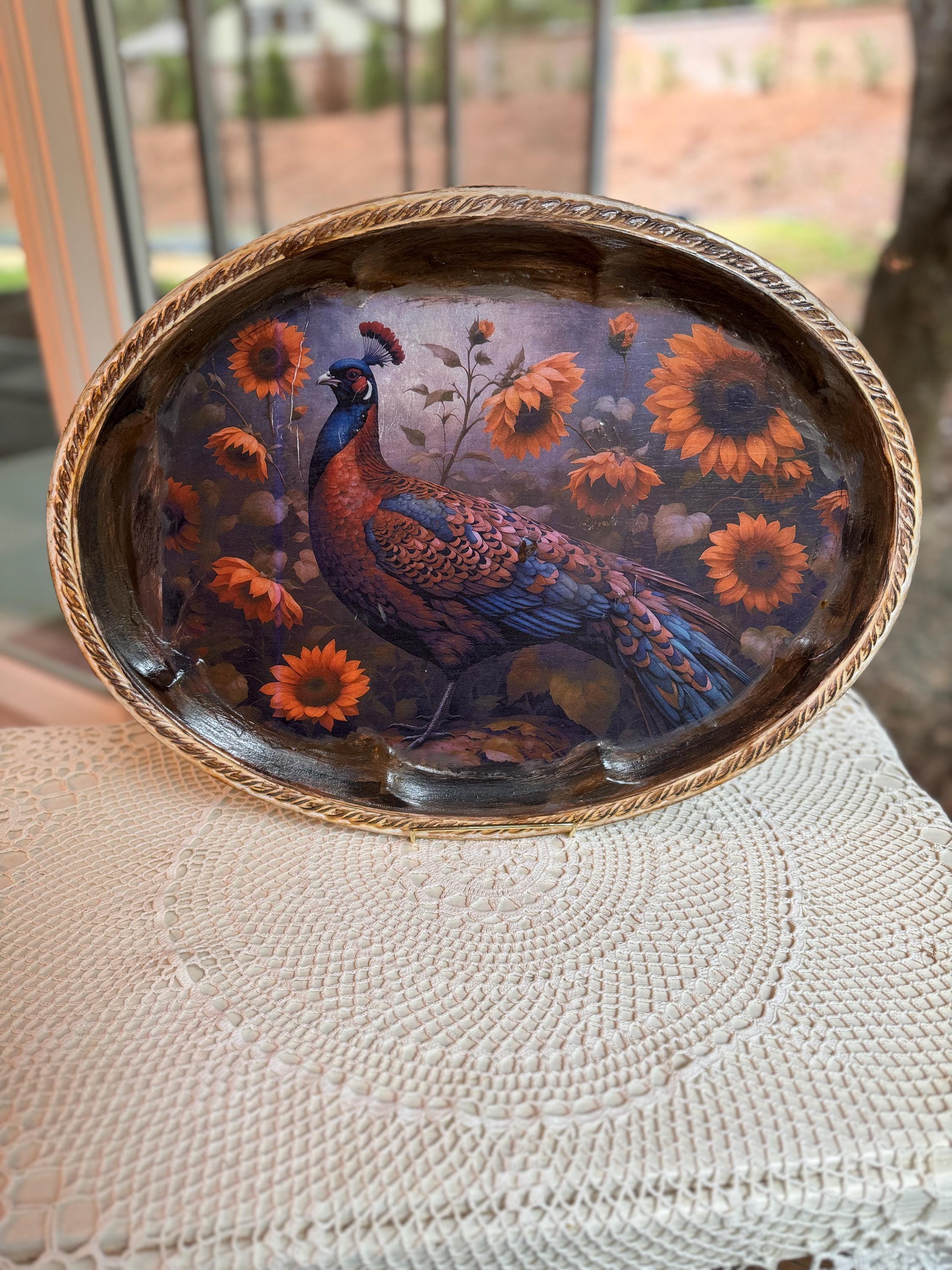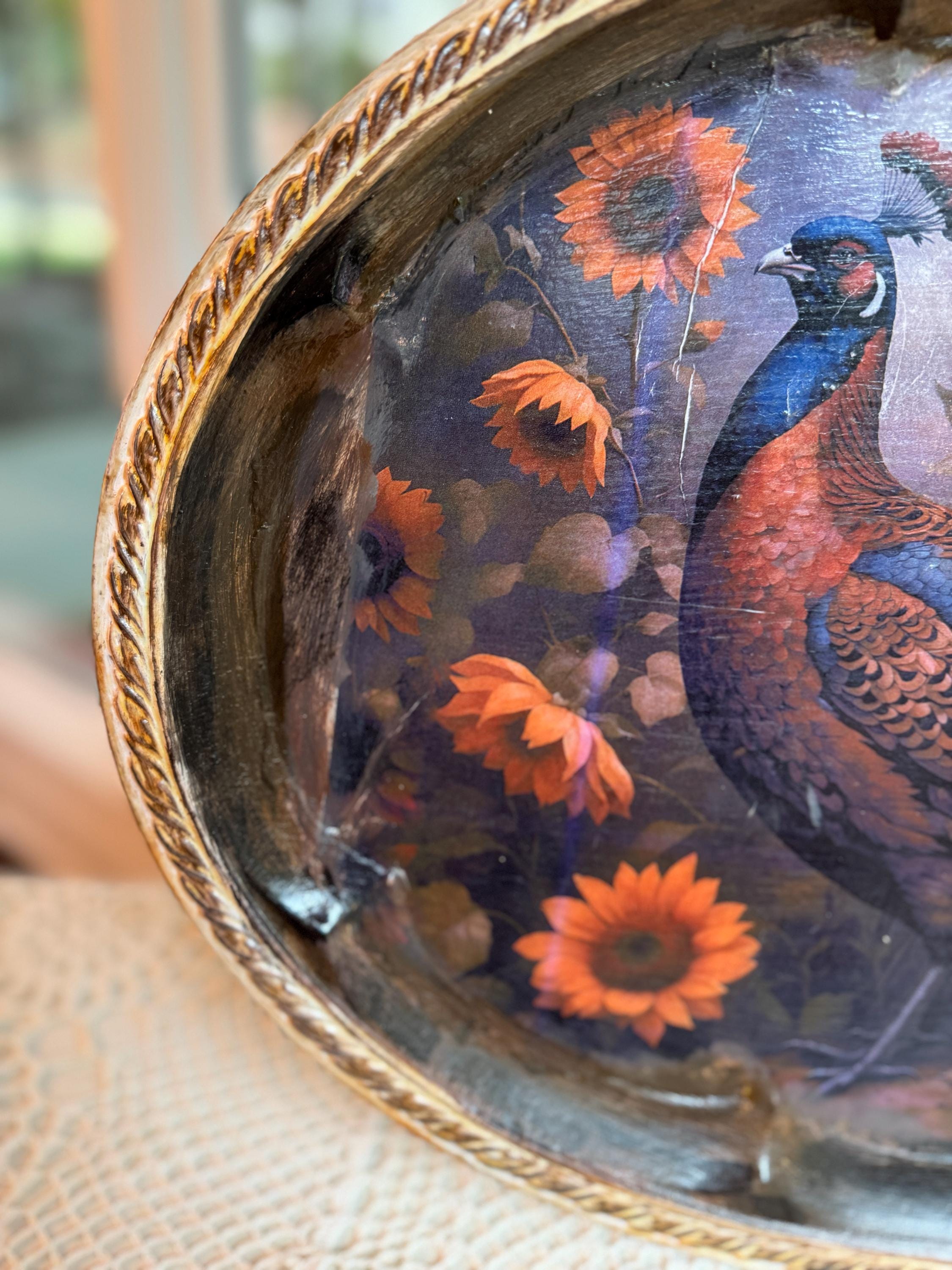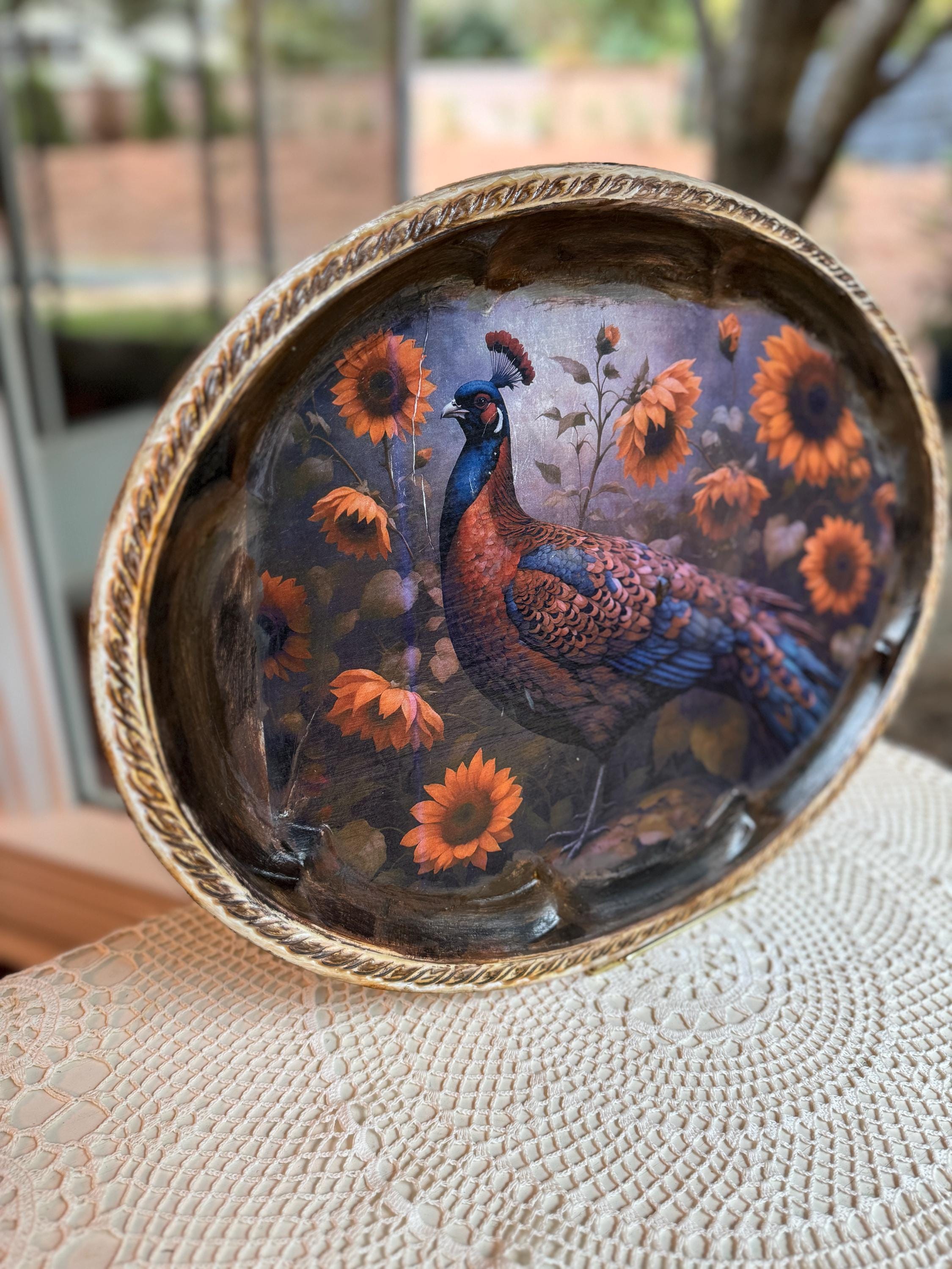 Add a touch of nostalgia and elegance to your home with this vintage 13” metal tray, expertly upcycled into a unique shabby chic serving piece. This thrift store flip features a hand-painted winter scene inspired by vintage photographs, with a beautifully detailed graceful pheasant bird, making it a one-of-a-kind holiday gift. Perfect for serving treats, displaying décor, or as a stunning centerpiece, this decorative tray blends classic charm with eco-friendly style. Ideal for those who love shabby chic décor and appreciate upcycled treasures, it’s a memorable addition to any home this holiday season.