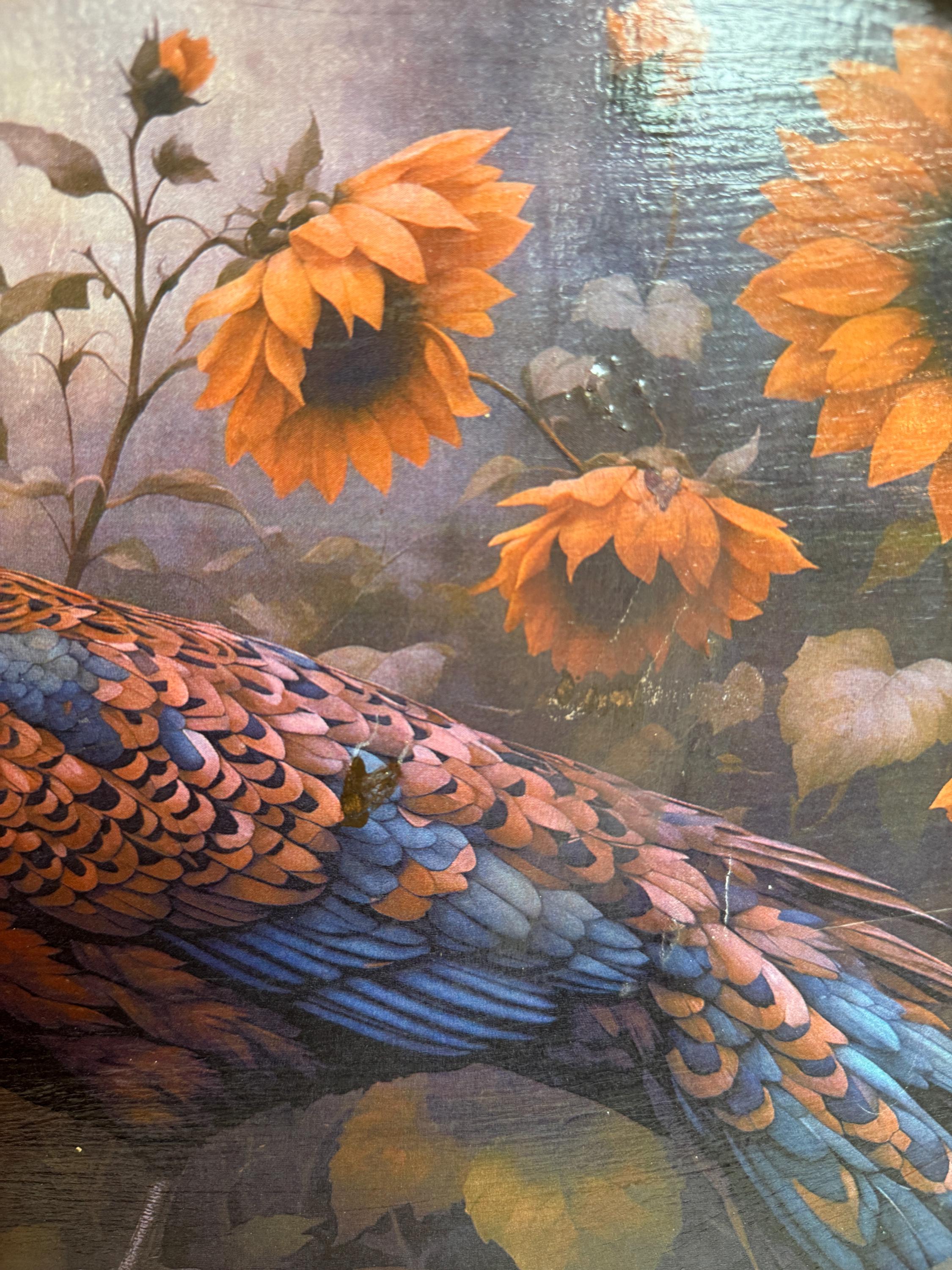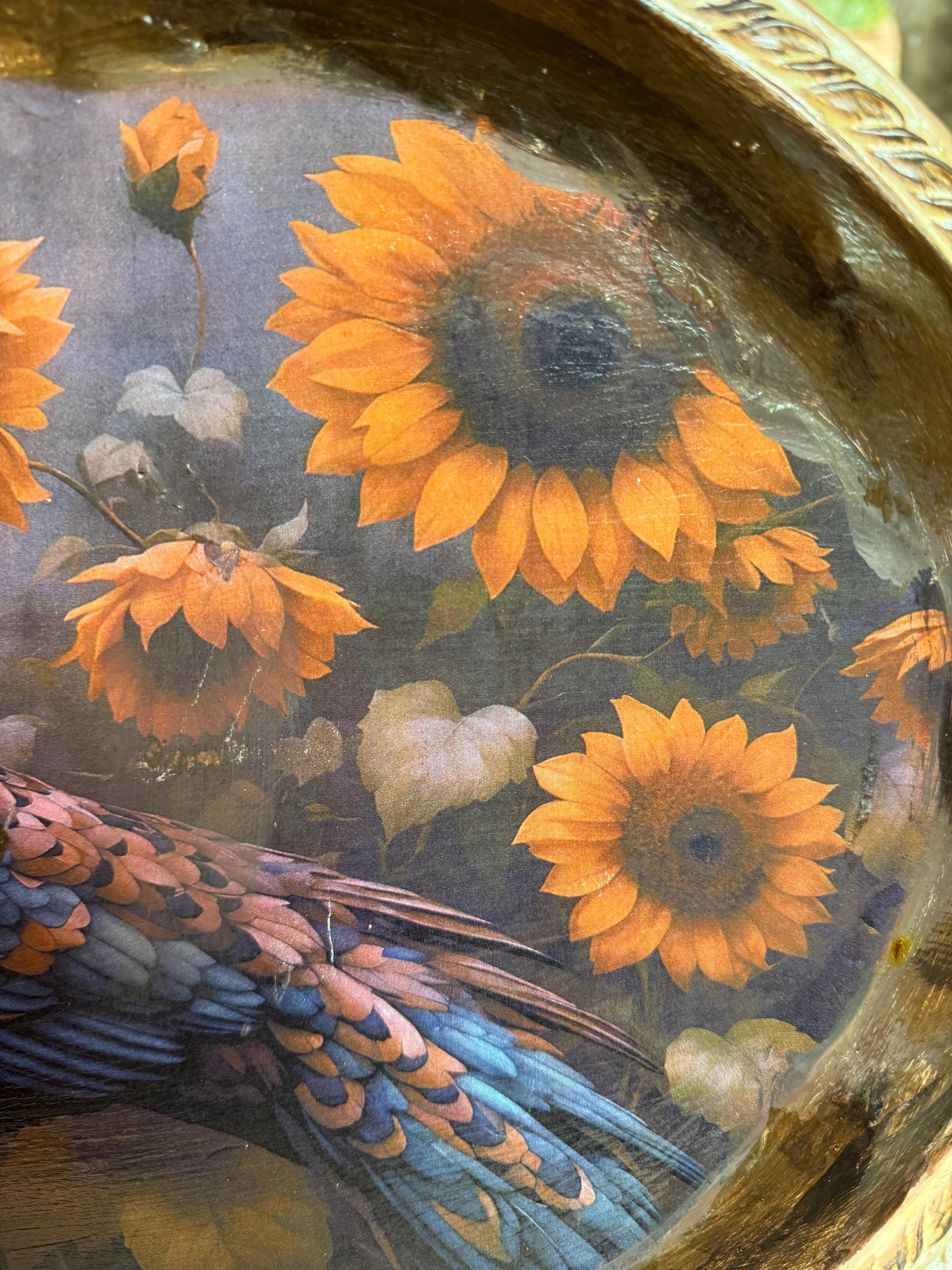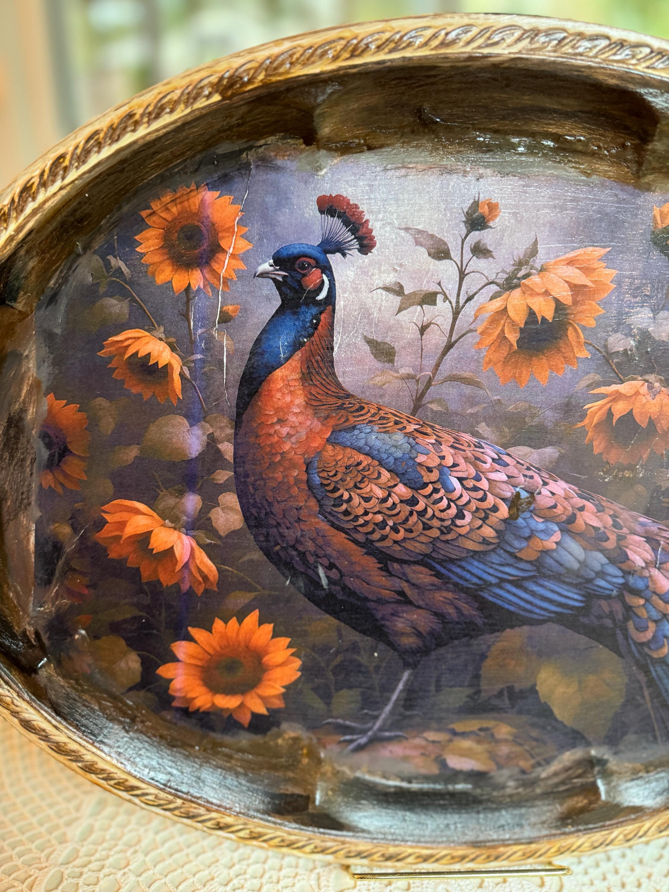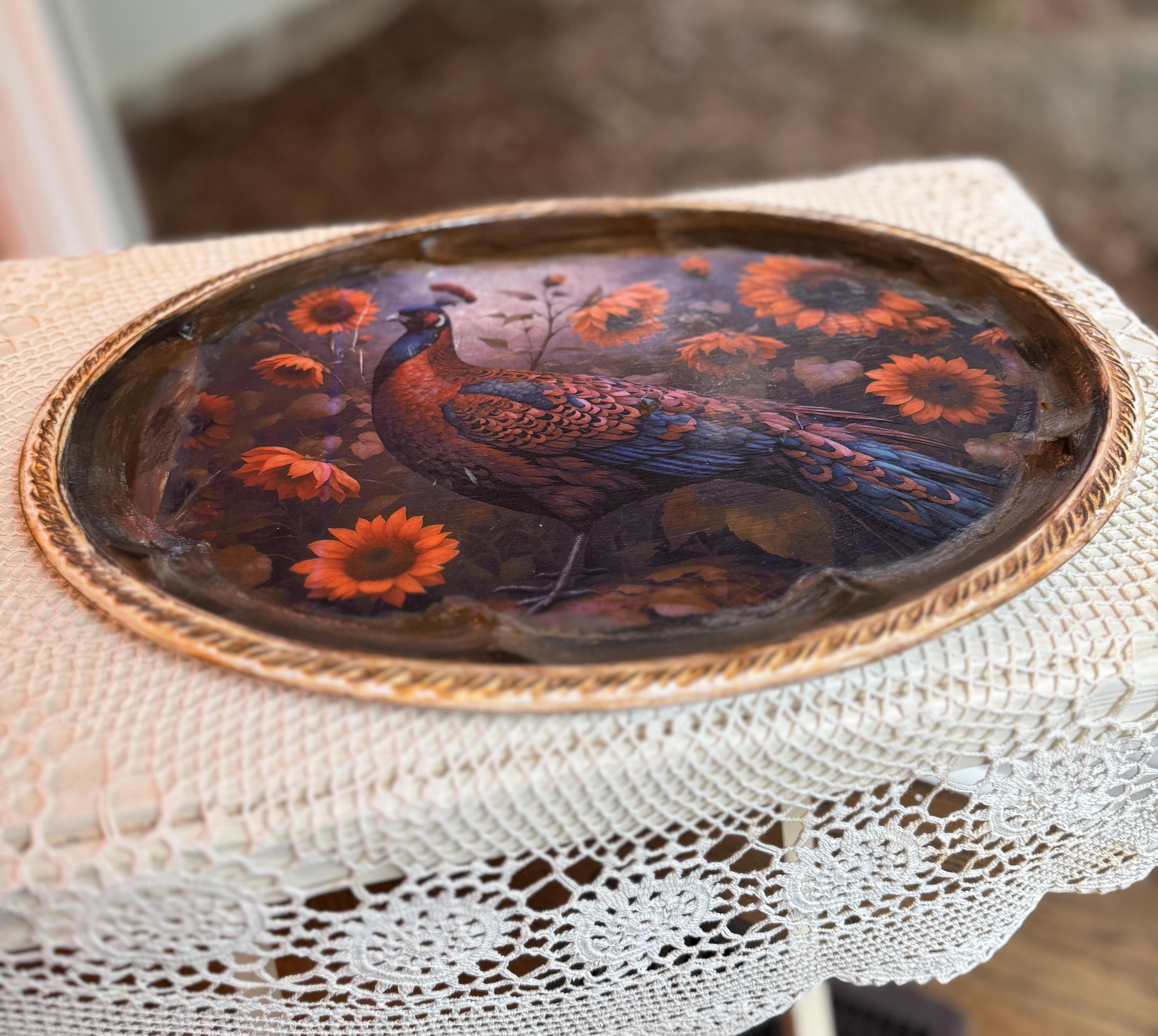Add a touch of nostalgia and elegance to your home with this vintage 13” metal tray, expertly upcycled into a unique shabby chic serving piece. This thrift store flip features a hand-painted winter scene inspired by vintage photographs, with a beautifully detailed graceful pheasant bird, making it a one-of-a-kind holiday gift. Perfect for serving treats, displaying décor, or as a stunning centerpiece, this decorative tray blends classic charm with eco-friendly style. Ideal for those who love shabby chic décor and appreciate upcycled treasures, it’s a memorable addition to any home this holiday season.
