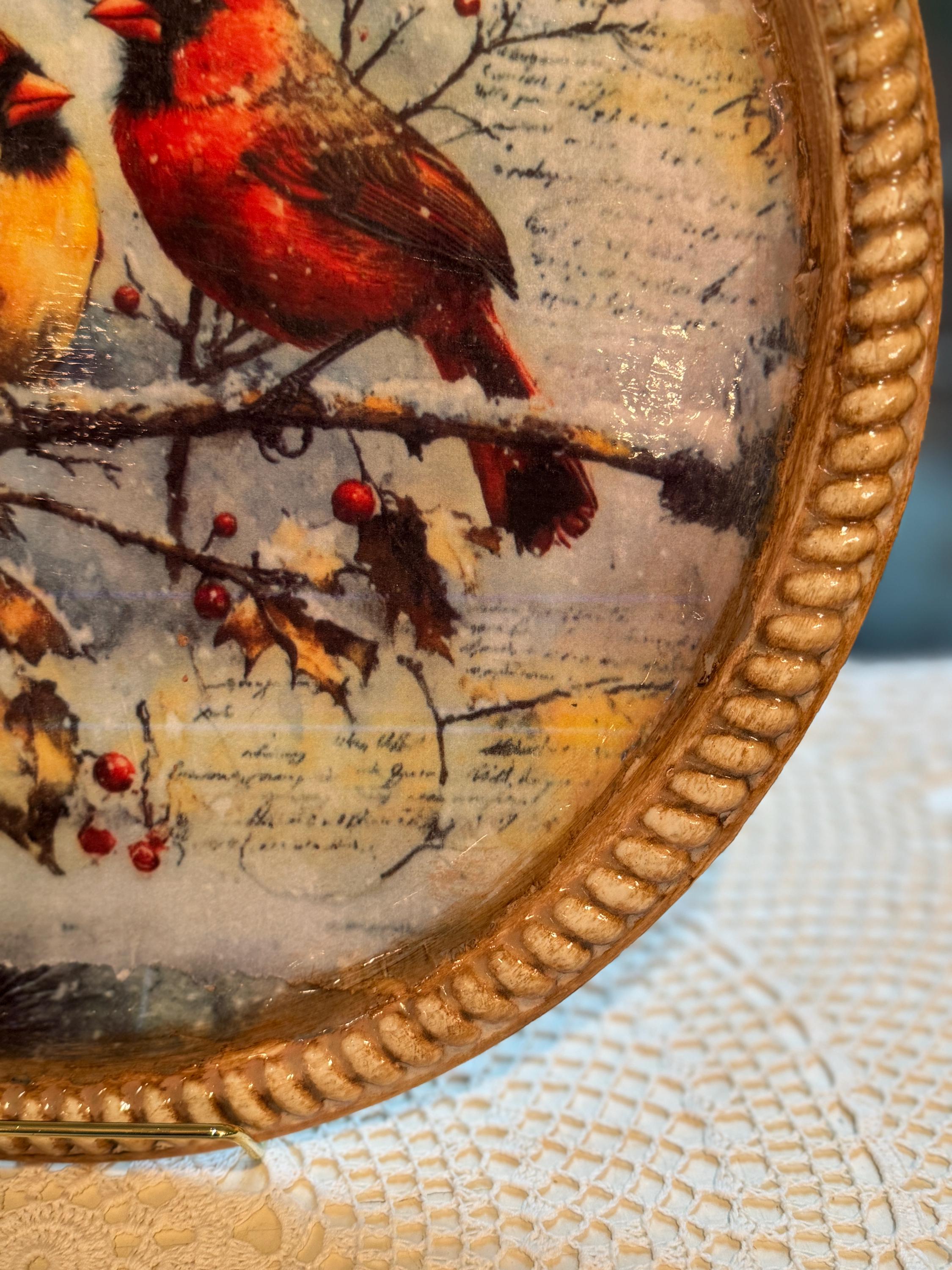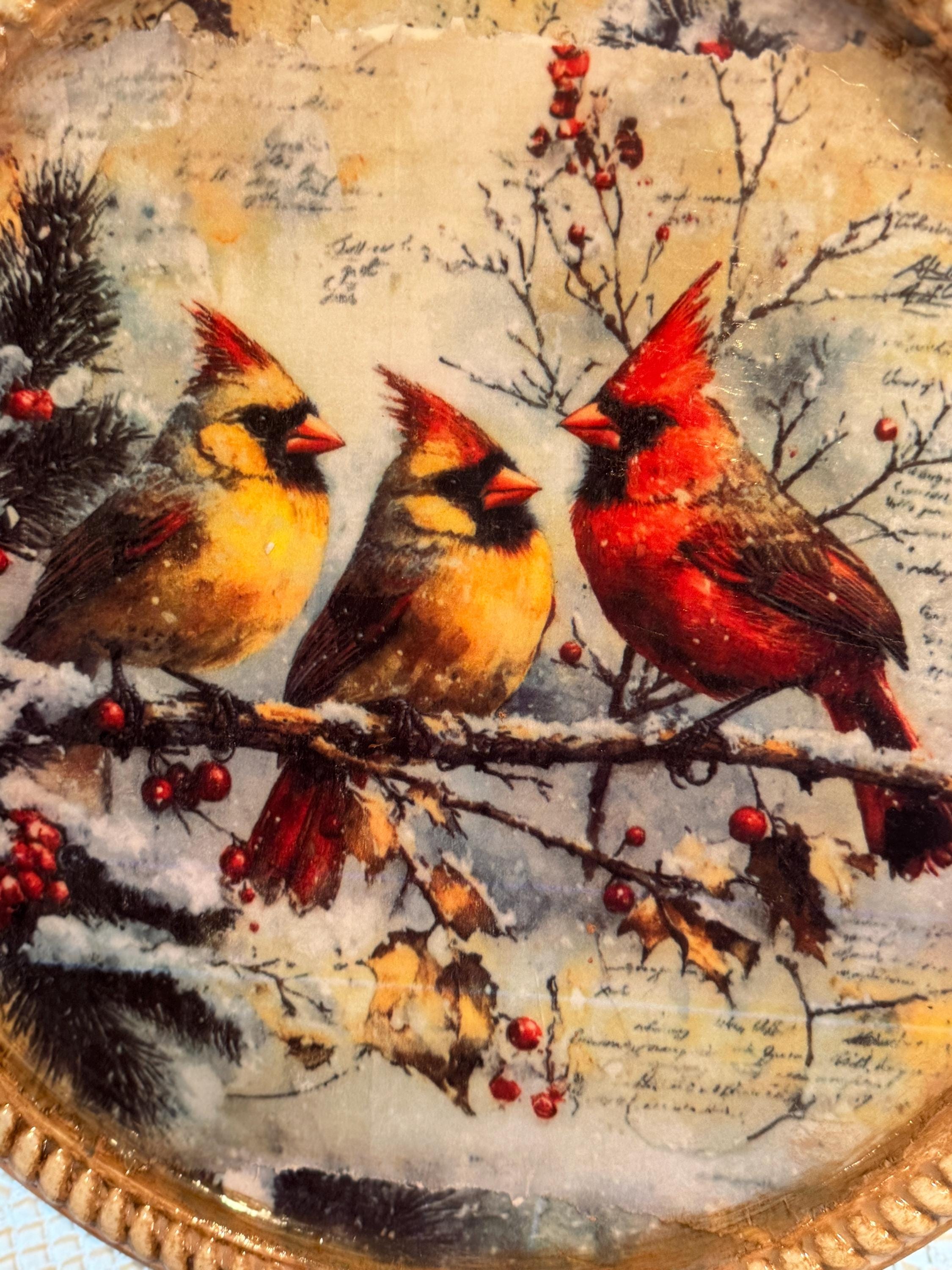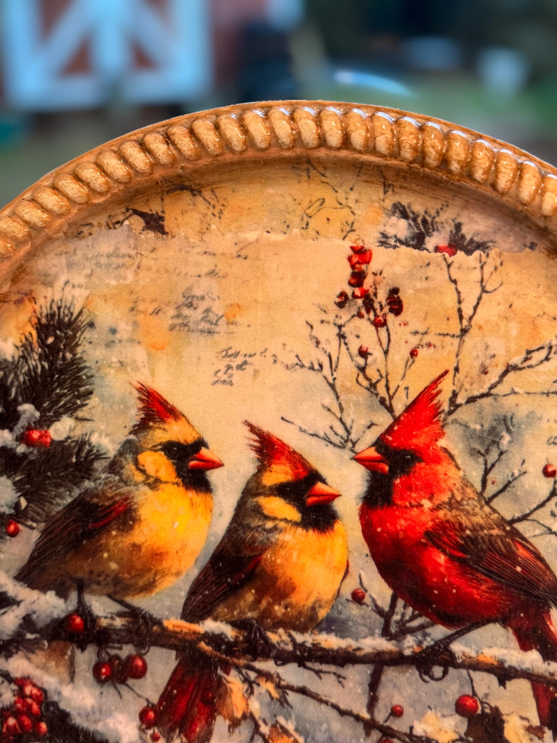 Bring the beauty of a winter wonderland into your home with this stunning decorative round tray featuring a vibrant trio of cardinal birds. This charming piece captures the serene scene of three colorful cardinals perched on a snowy branch, set against a backdrop of vintage-inspired script.