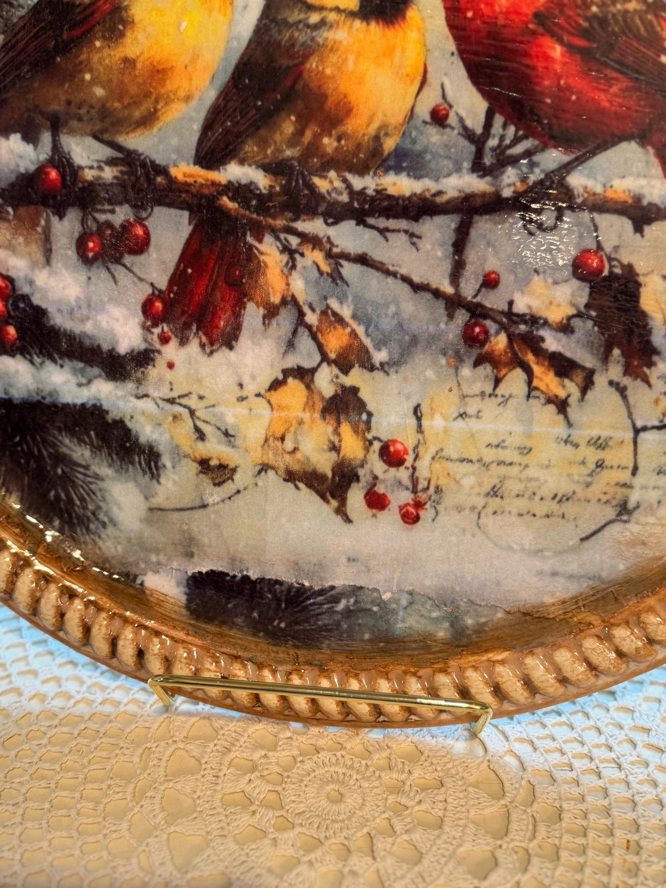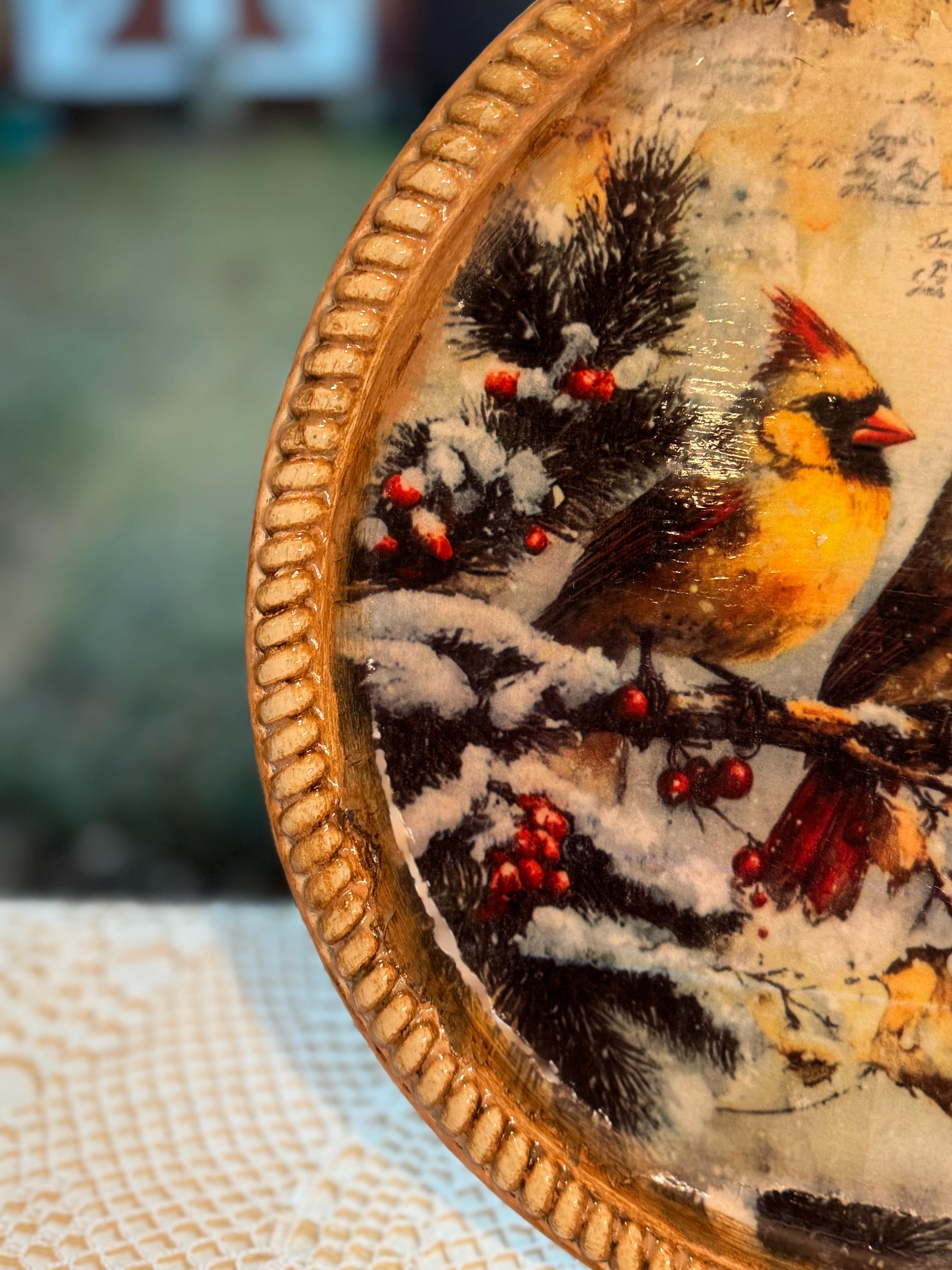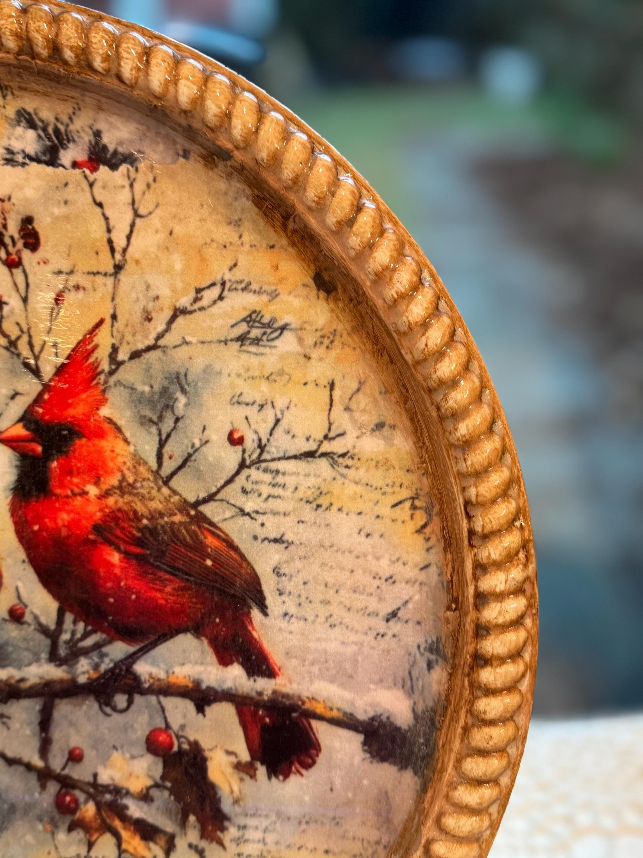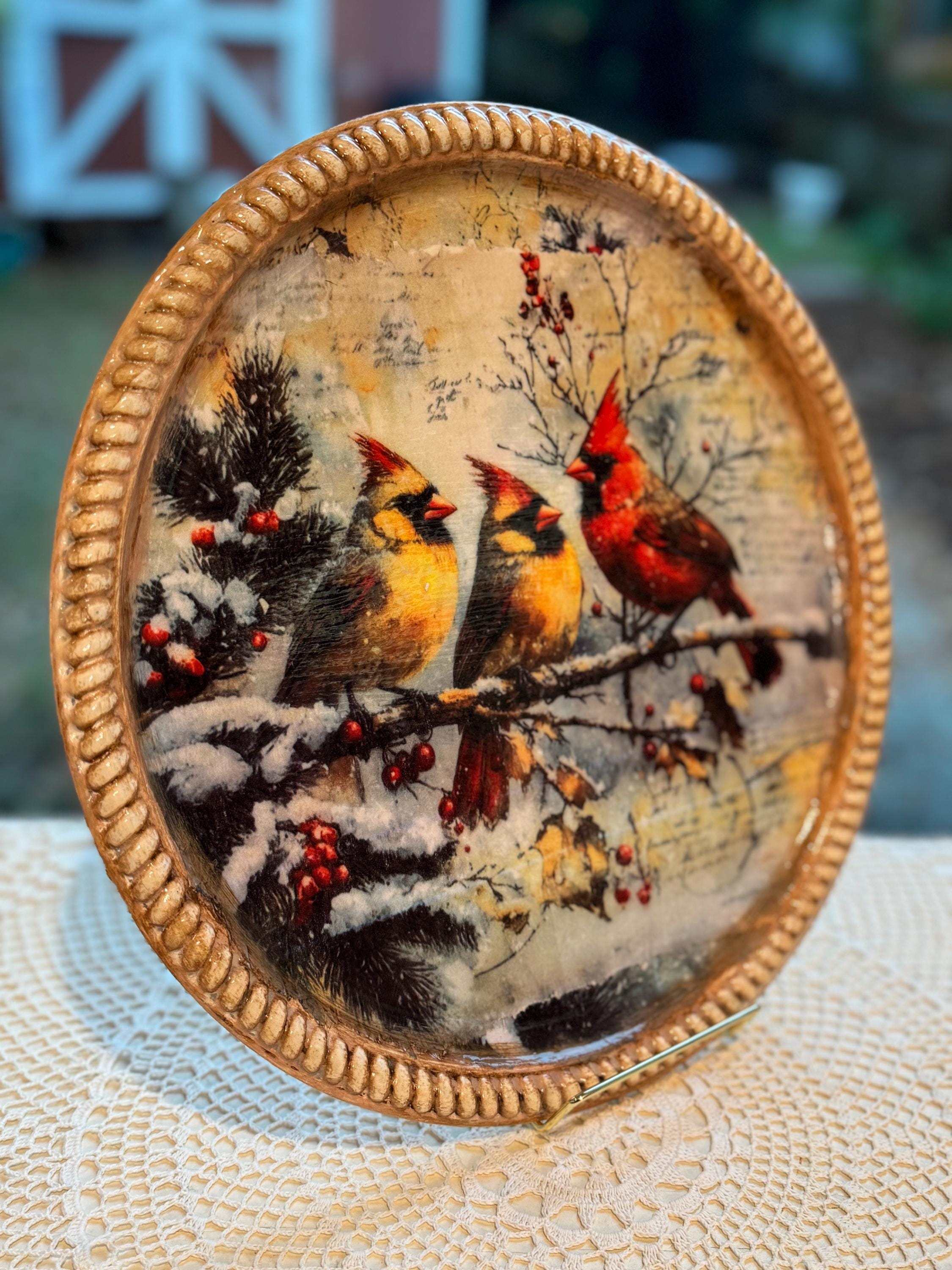 Bring the beauty of a winter wonderland into your home with this stunning decorative round tray featuring a vibrant trio of cardinal birds. This charming piece captures the serene scene of three colorful cardinals perched on a snowy branch, set against a backdrop of vintage-inspired script.