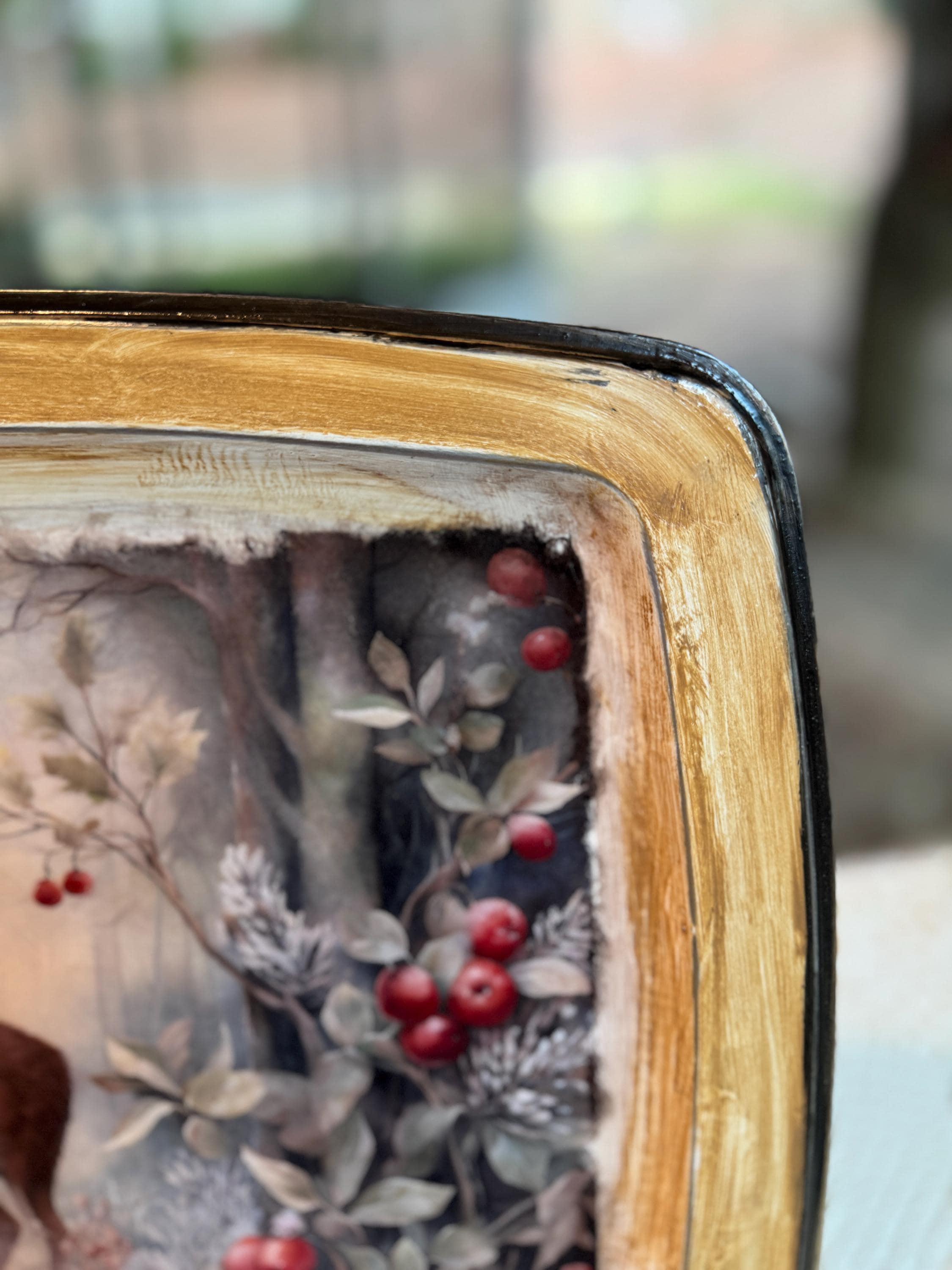 The tray itself has a lovely textured, antiqued gold and black frame that complements the winter woodland theme perfectly. This versatile piece is ideal for use as a decorative centerpiece on a coffee table, a stylish serving platter for holiday gatherings, or as a cozy accent in a cabin or lodge-themed room. It also makes a thoughtful gift for deer lovers, nature enthusiasts, or anyone who appreciates rustic and seasonal home decor.