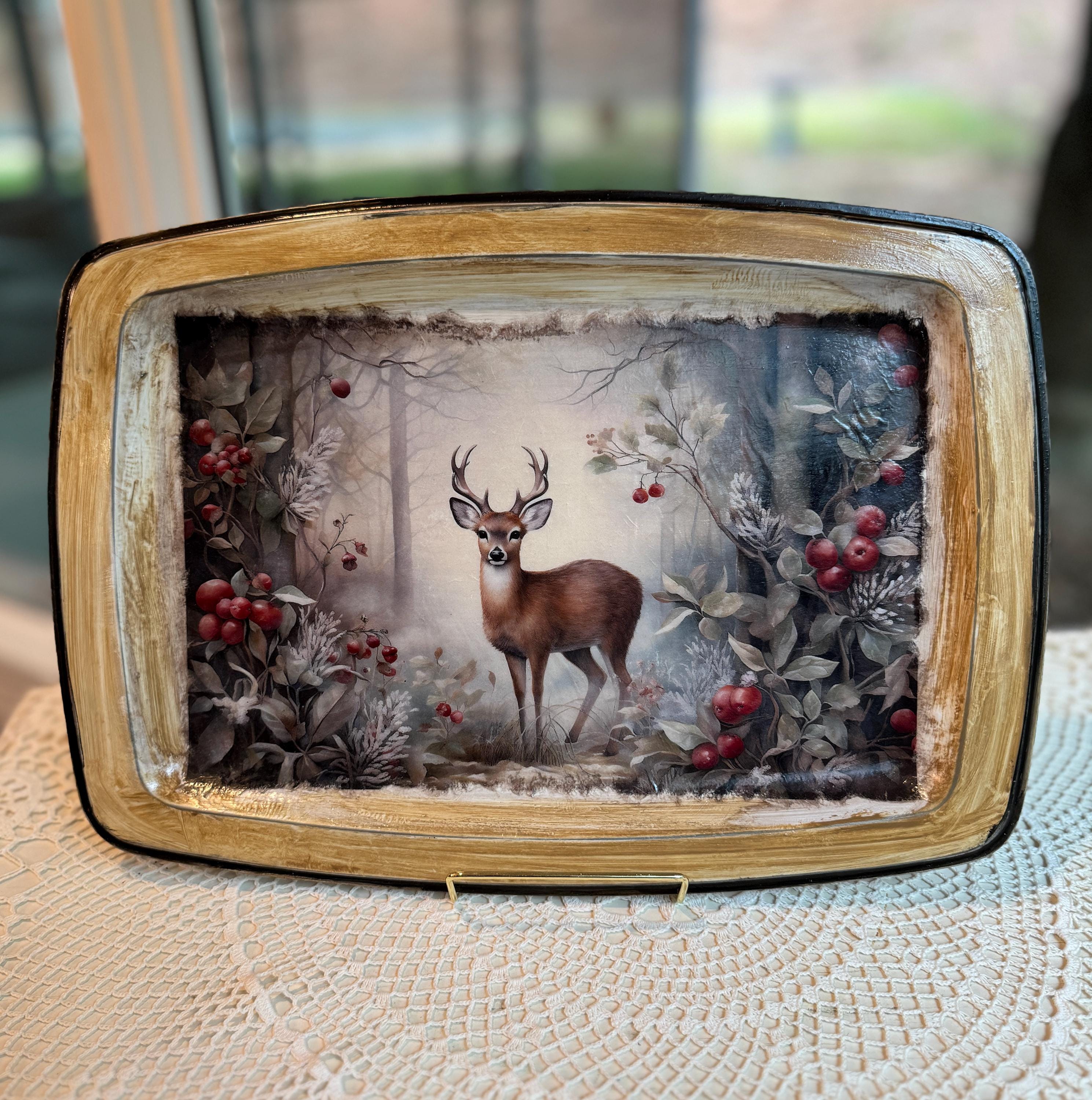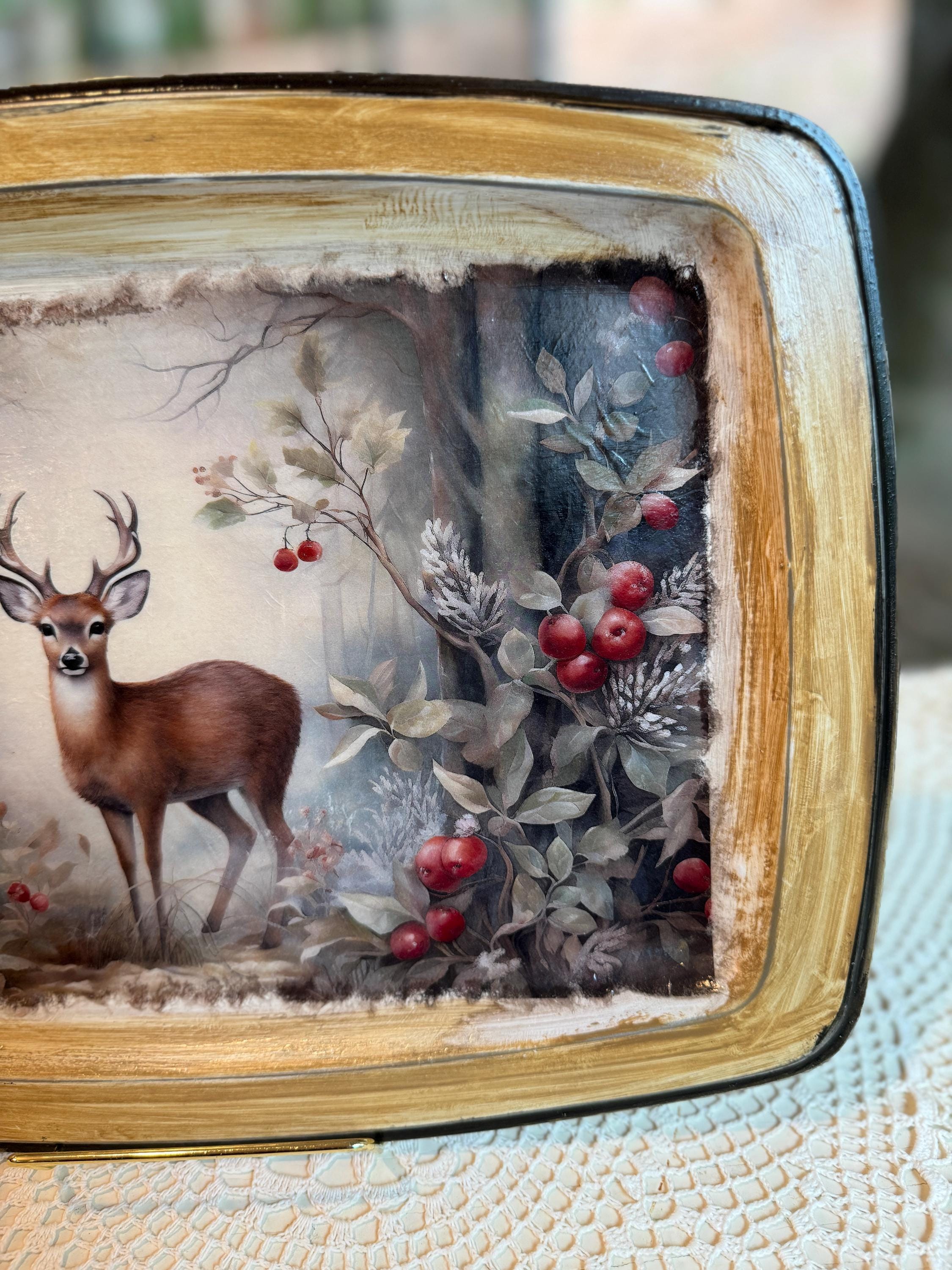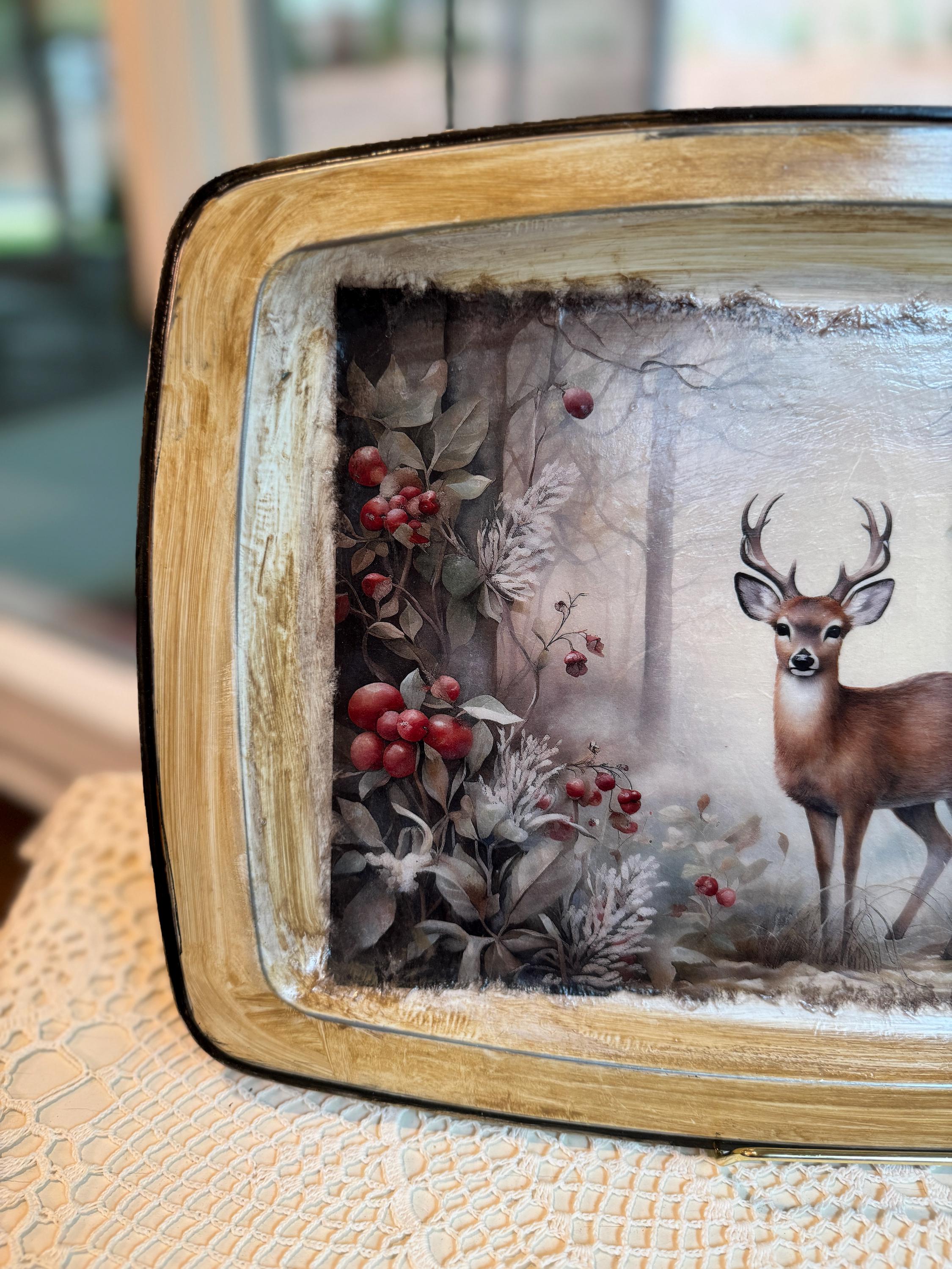 Bring the serene beauty of a winter forest into your home with this charming decorative metal tray. This unique piece features a stunning and detailed image of a majestic deer standing in a snowy woodland scene, surrounded by frost-covered foliage and vibrant red berries. The artwork is beautifully decoupaged onto the tray, creating a warm, rustic, and elegant feel.