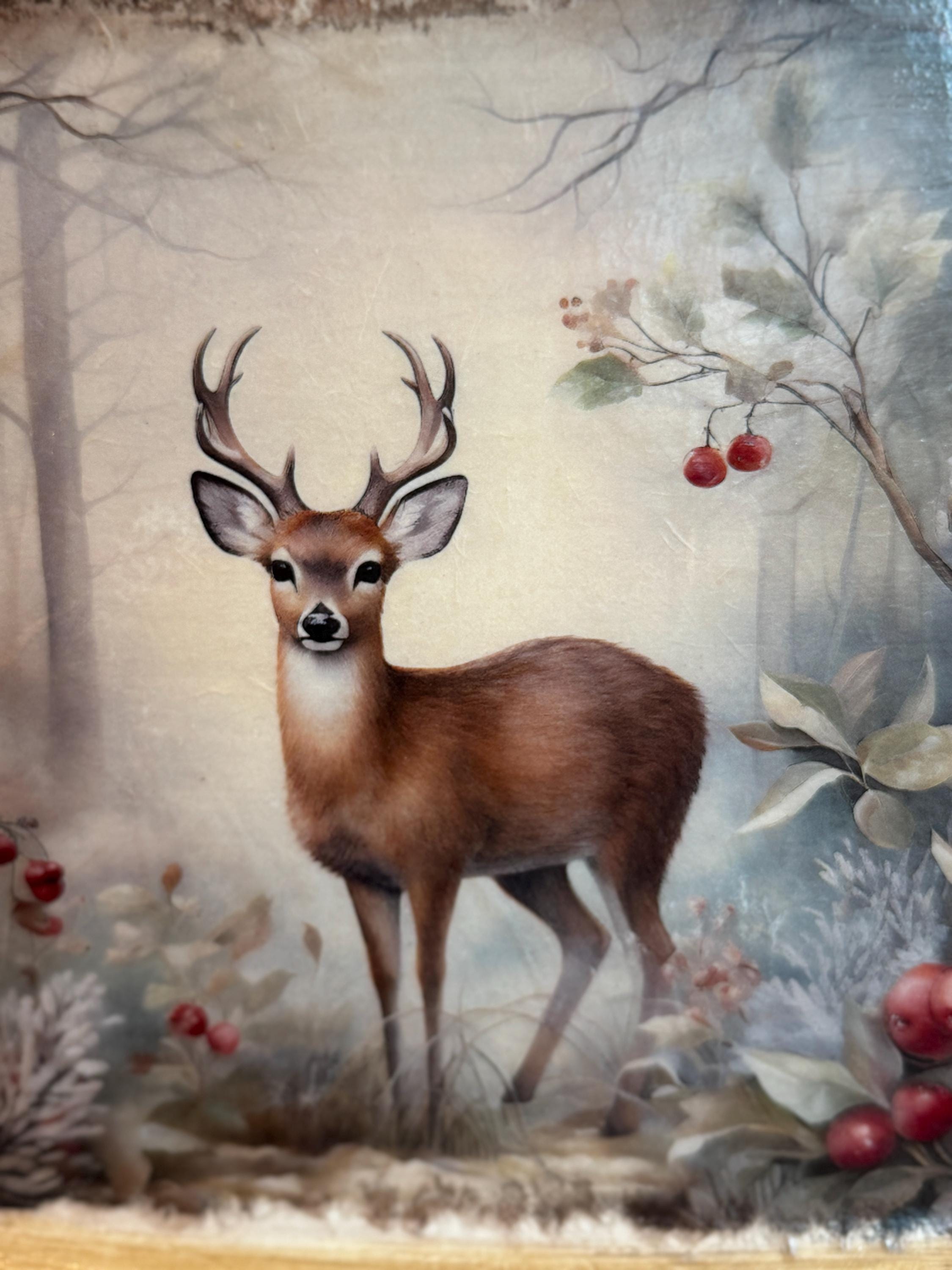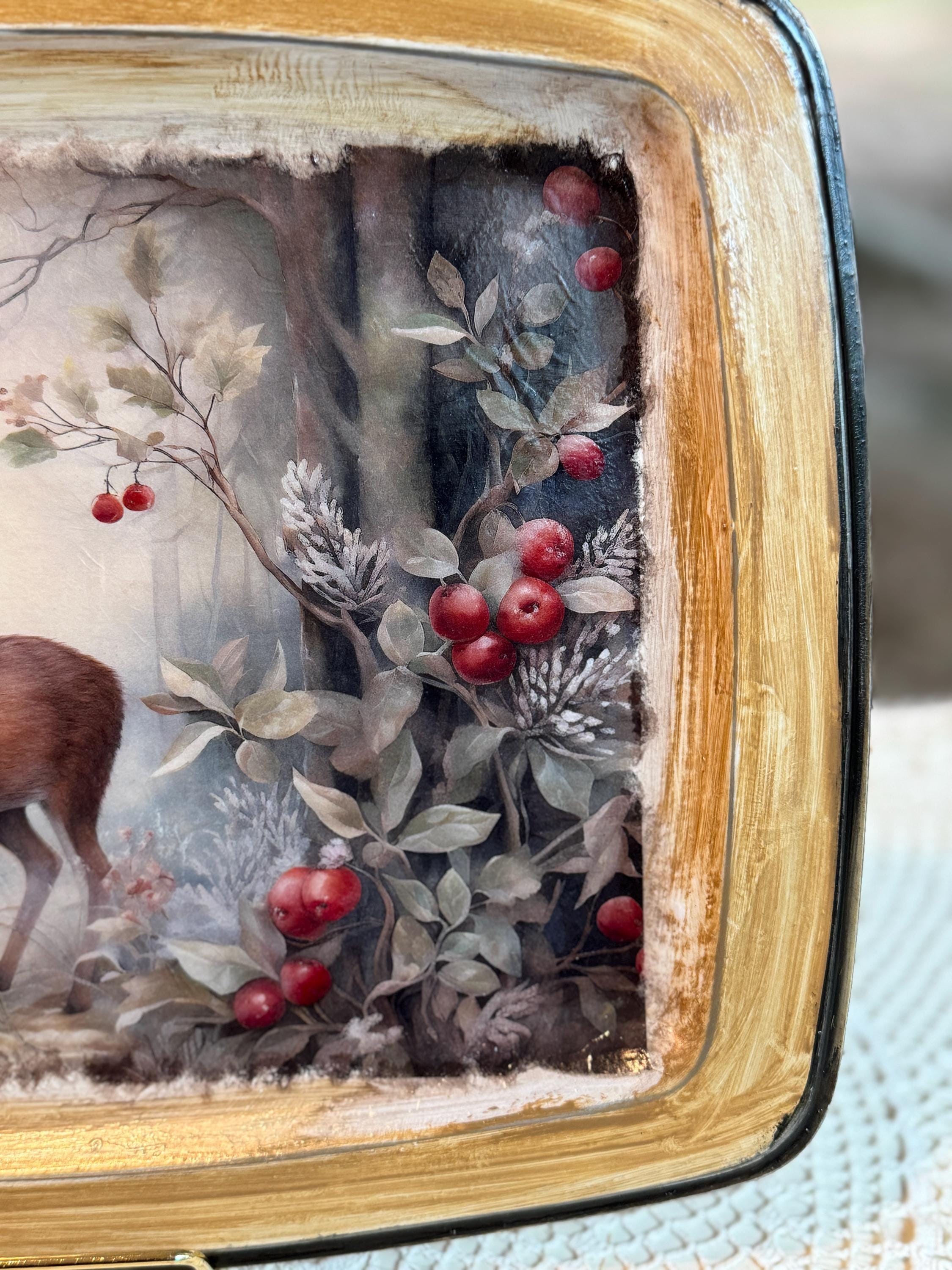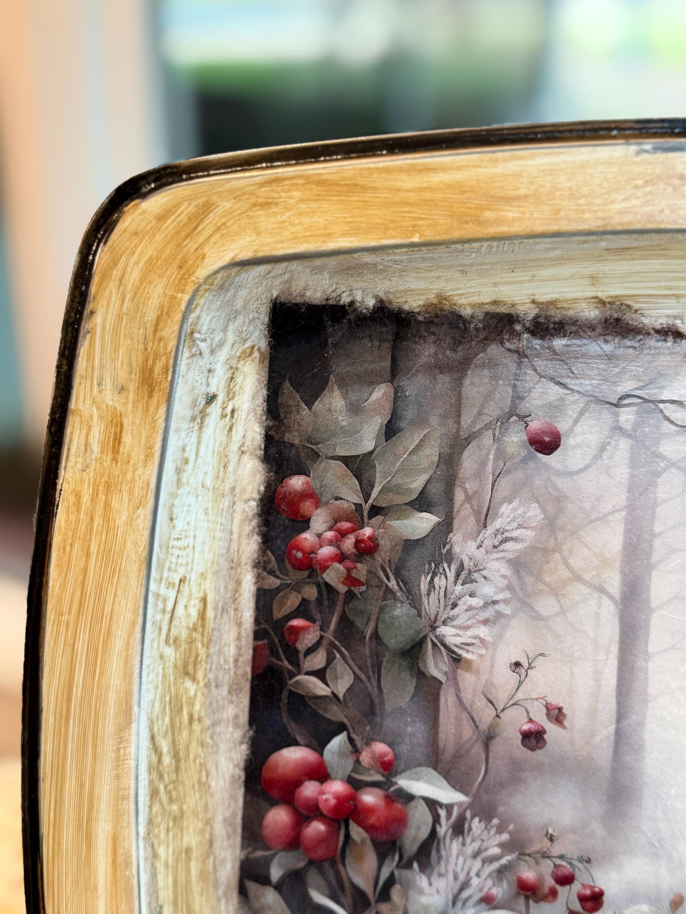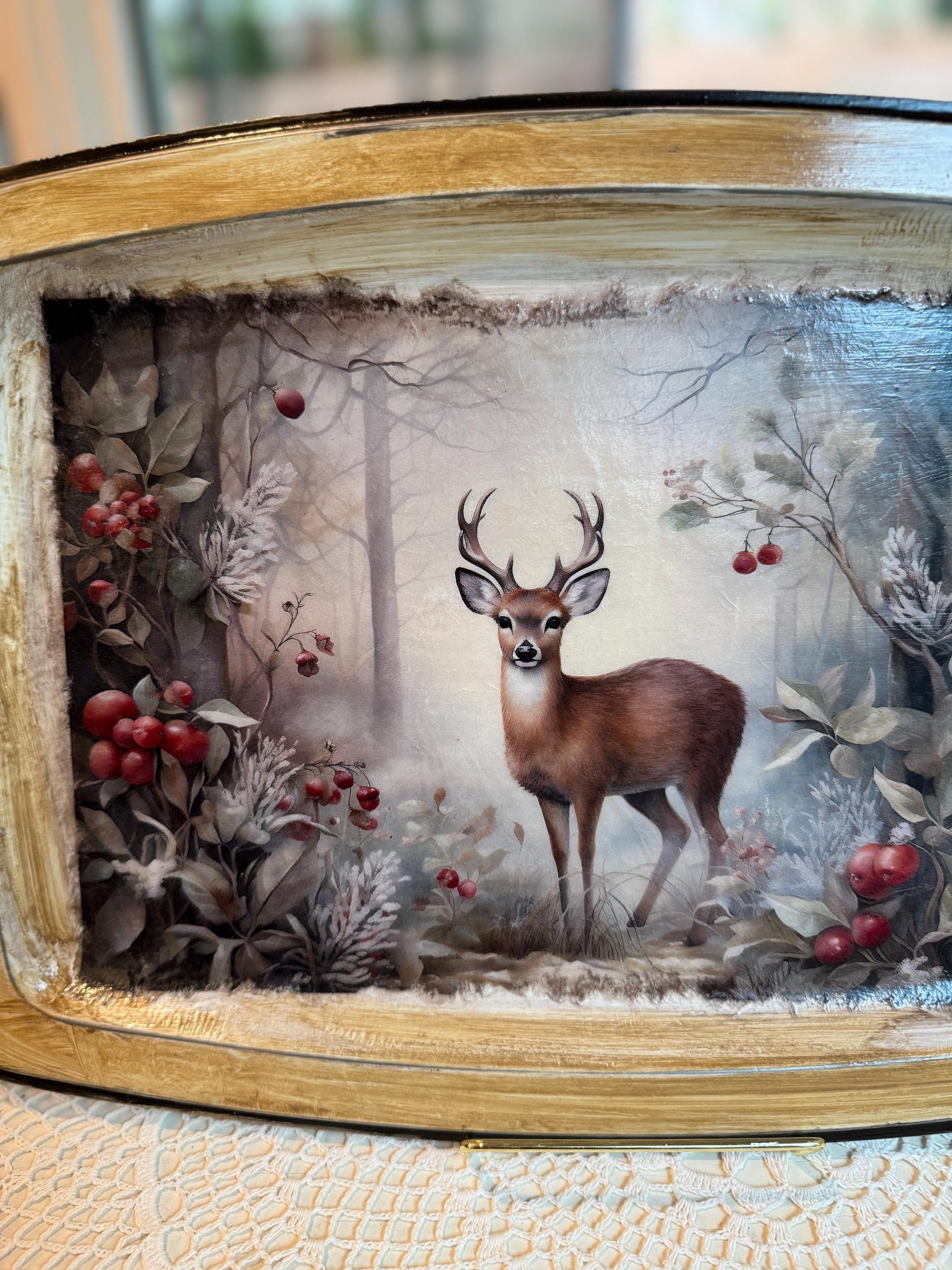 Bring the serene beauty of a winter forest into your home with this charming decorative metal tray. This unique piece features a stunning and detailed image of a majestic deer standing in a snowy woodland scene, surrounded by frost-covered foliage and vibrant red berries. The artwork is beautifully decoupaged onto the tray, creating a warm, rustic, and elegant feel.