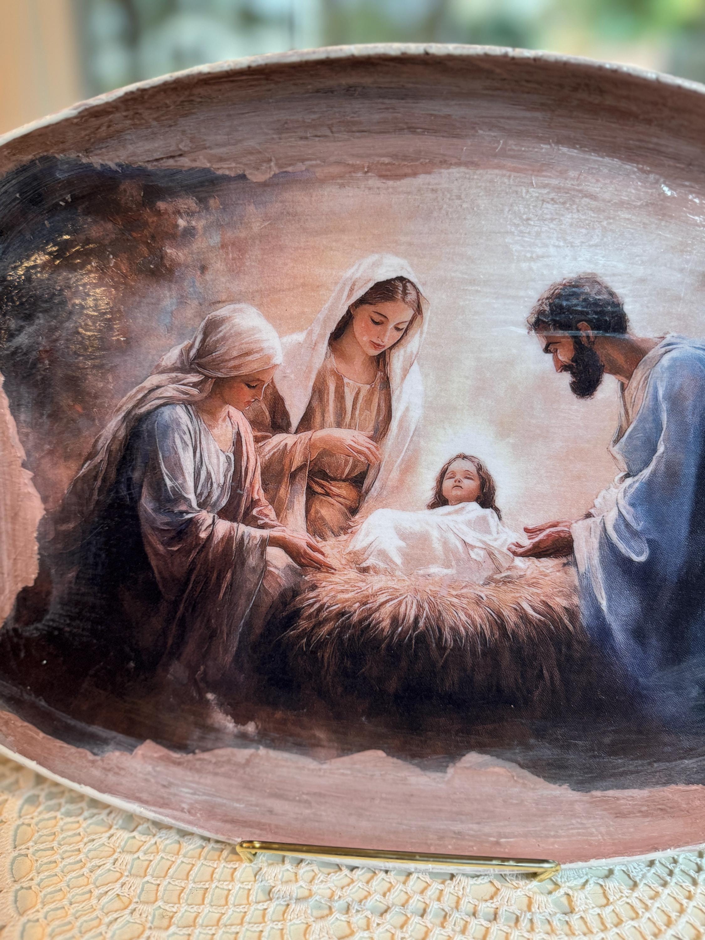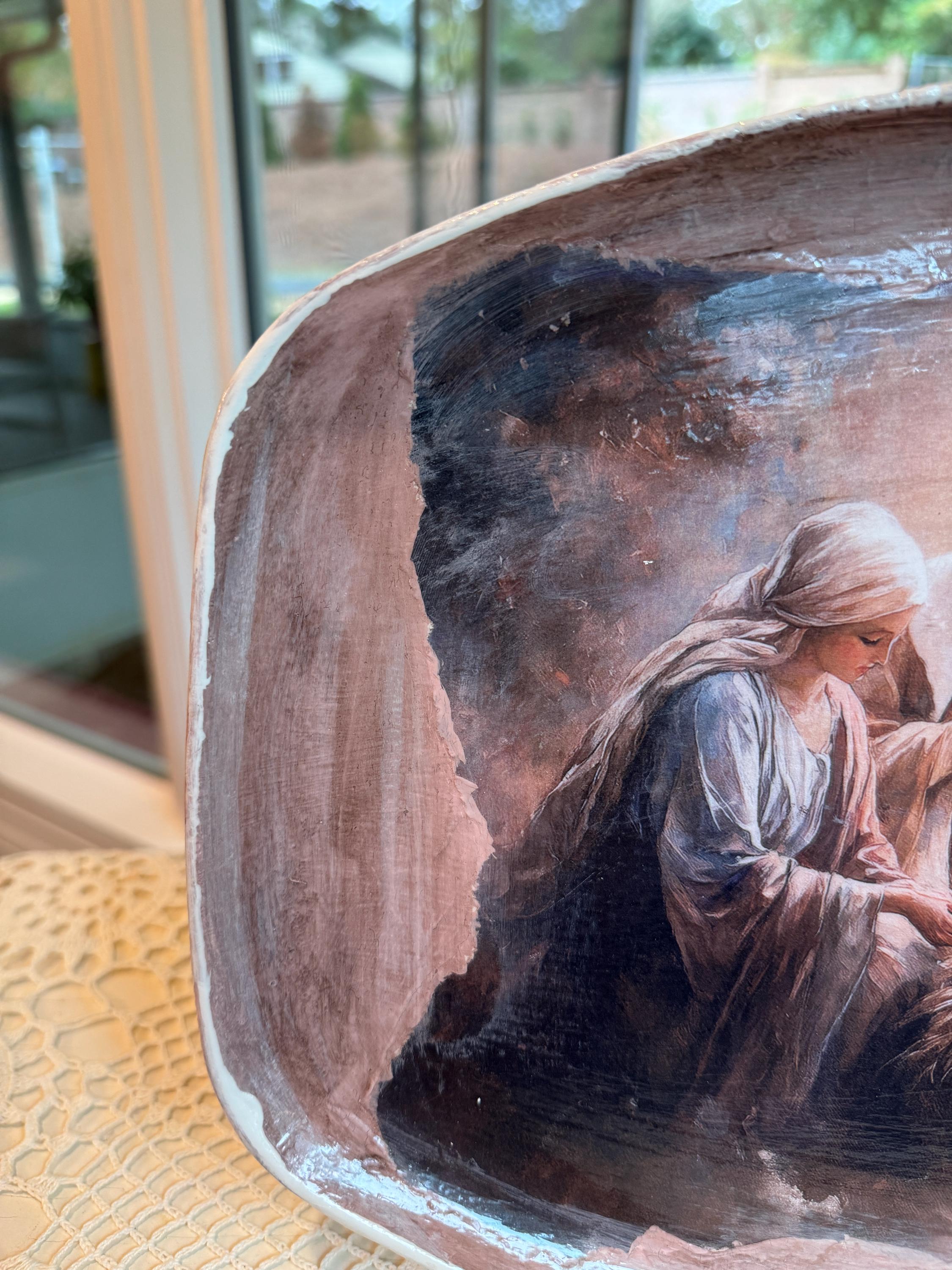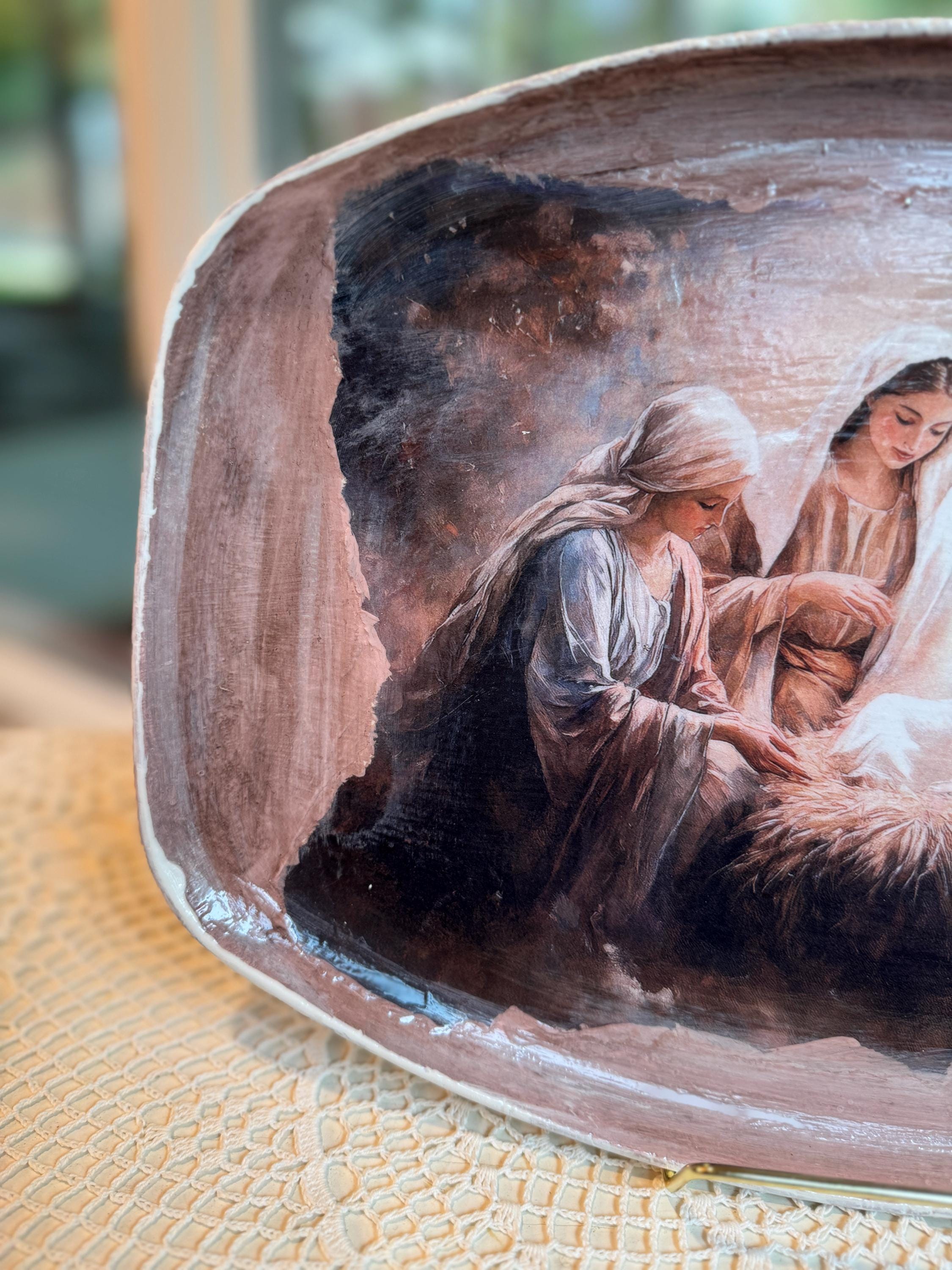 Discover a truly special and one-of-a-kind piece with this unique shape decorative tray, beautifully upcycled from a thrift store find. This tray features a serene nativity scene, meticulously crafted using the art of decoupage with high-quality rice paper. The detailed print of the Holy Family brings a touch of reverence and warmth to this already unique item.