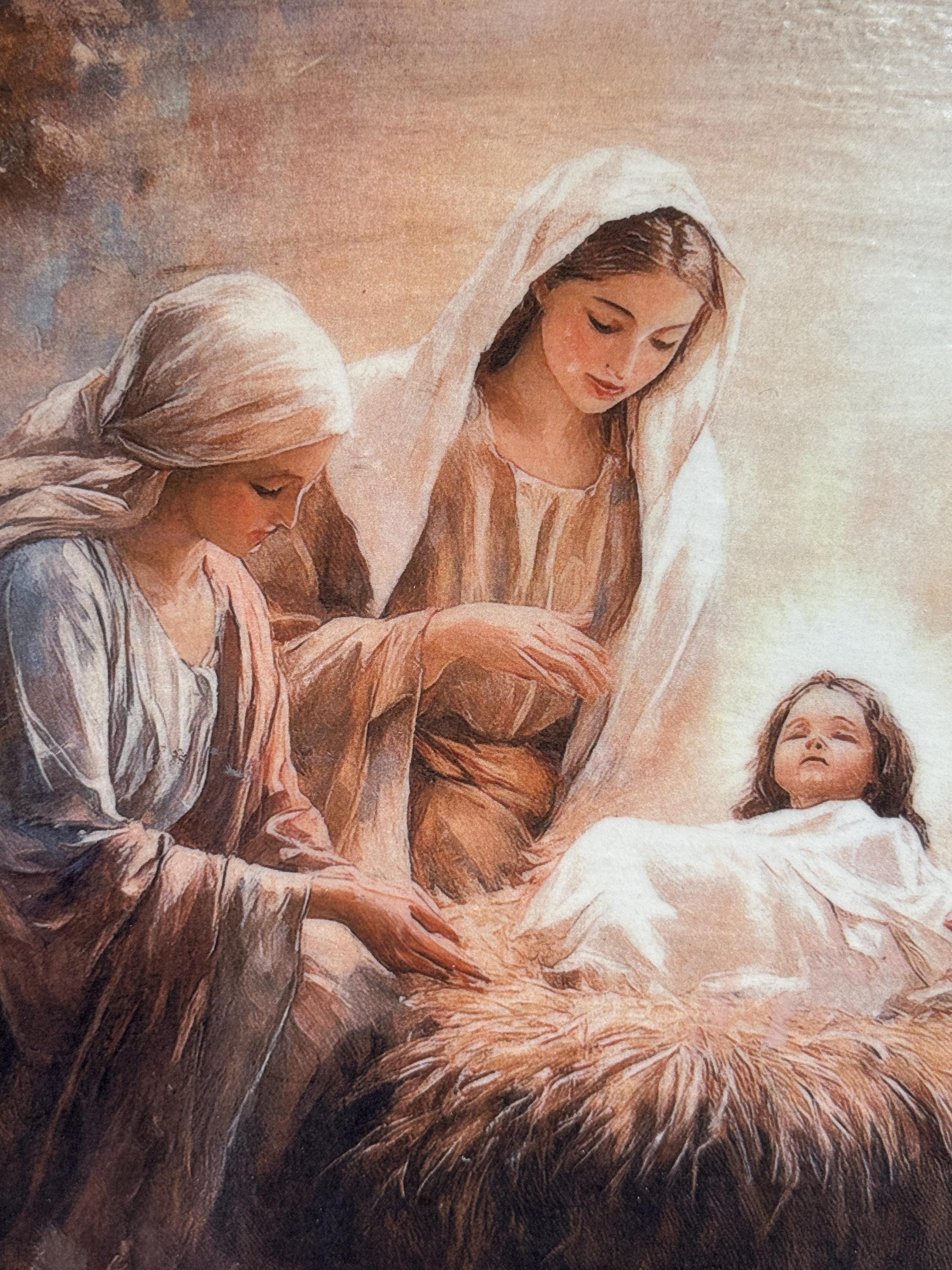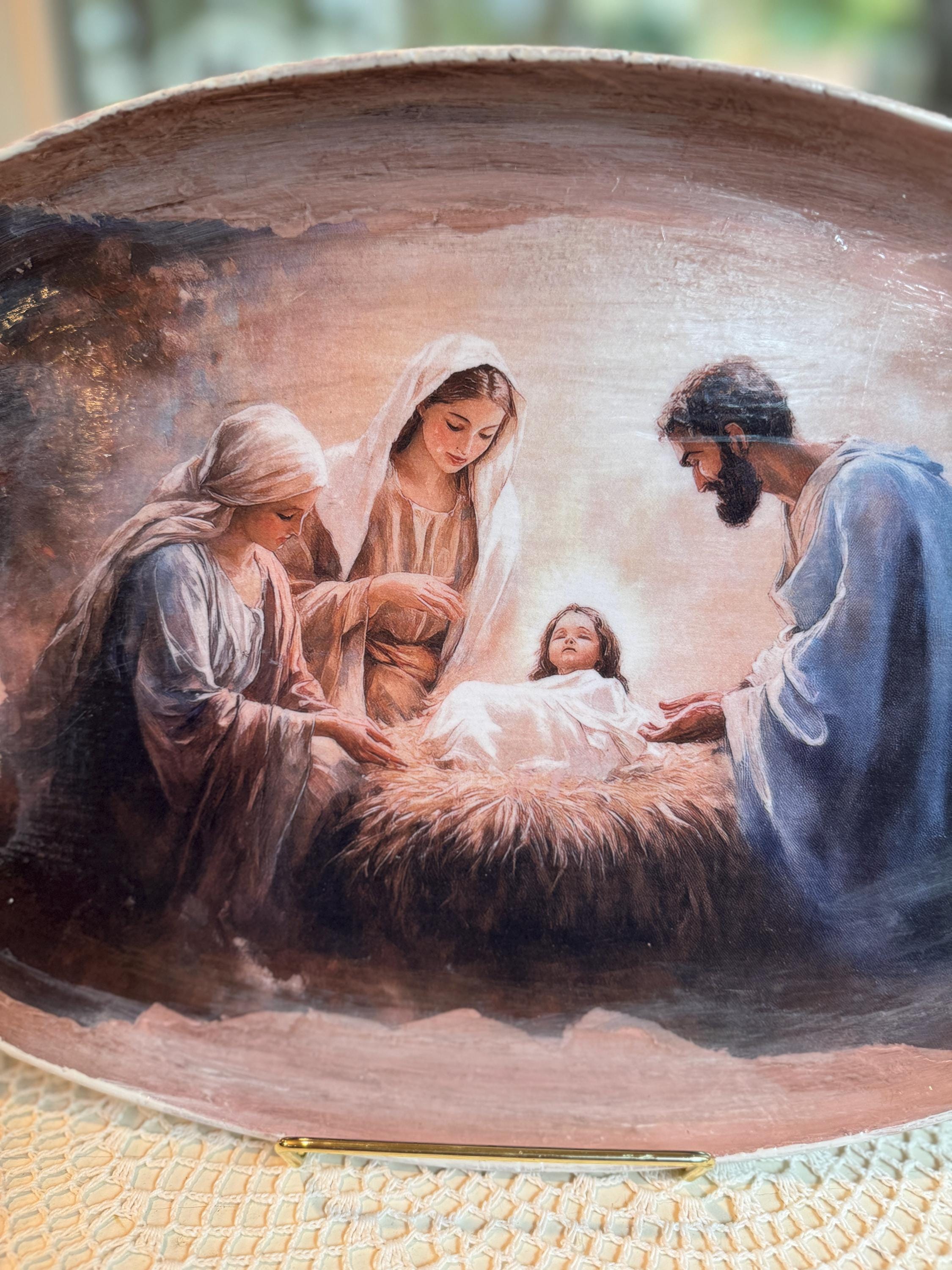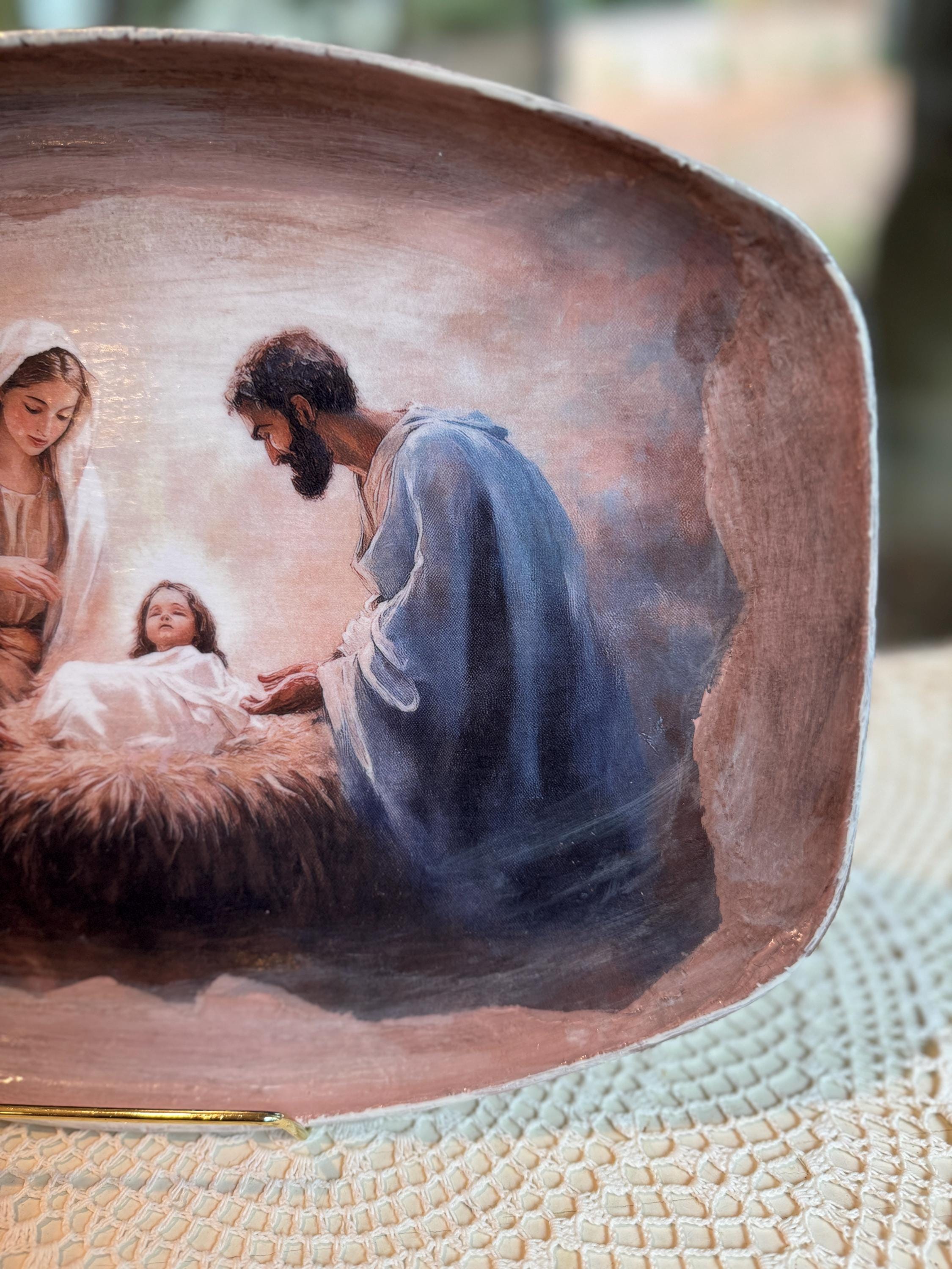 Discover a truly special and one-of-a-kind piece with this unique shape decorative tray, beautifully upcycled from a thrift store find. This tray features a serene nativity scene, meticulously crafted using the art of decoupage with high-quality rice paper. The detailed print of the Holy Family brings a touch of reverence and warmth to this already unique item.