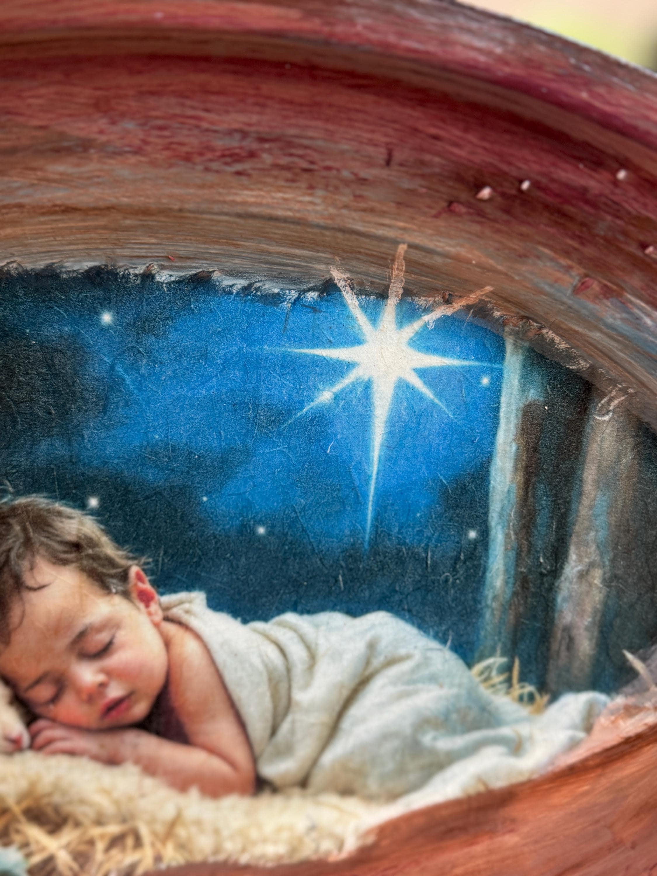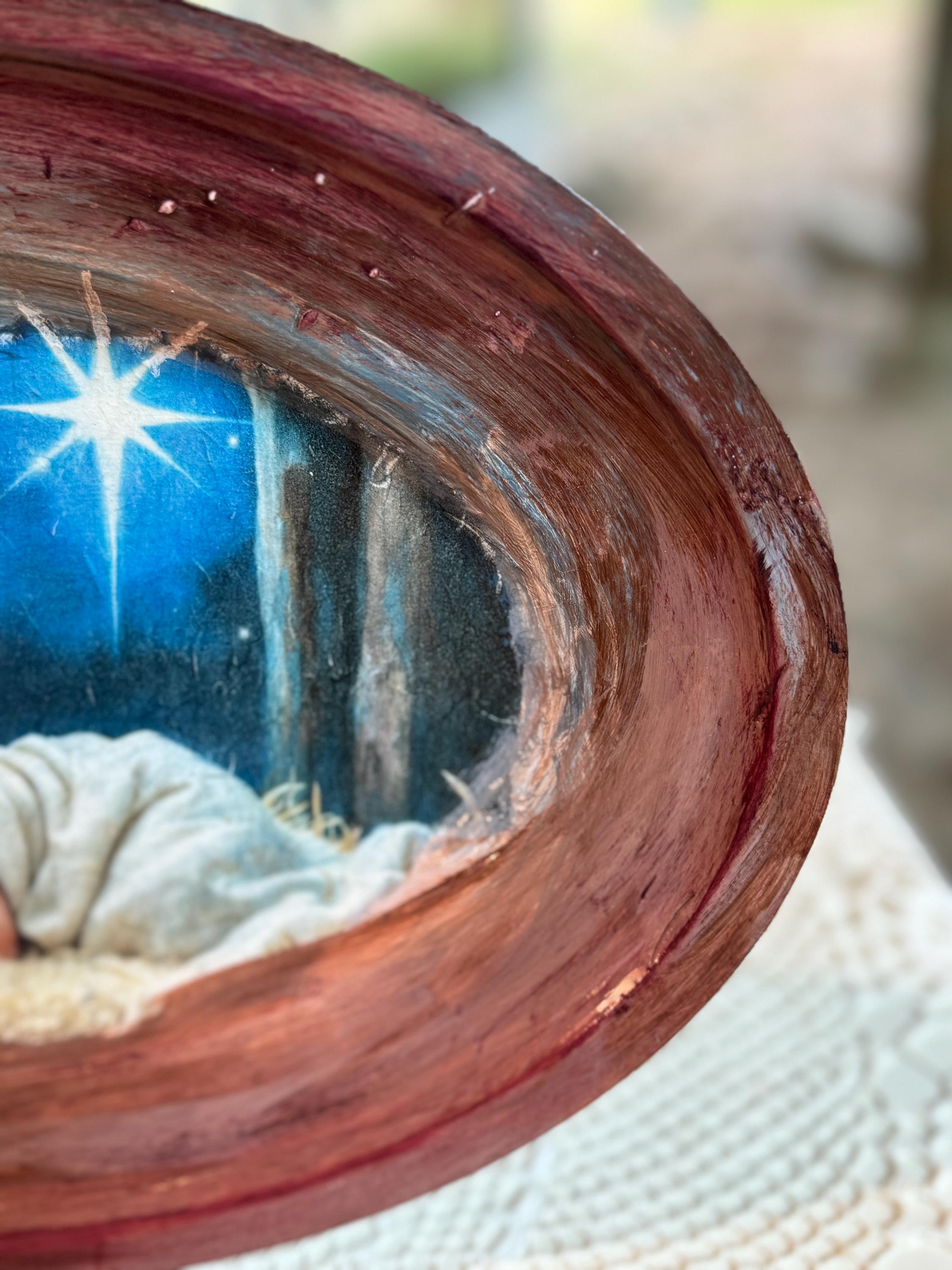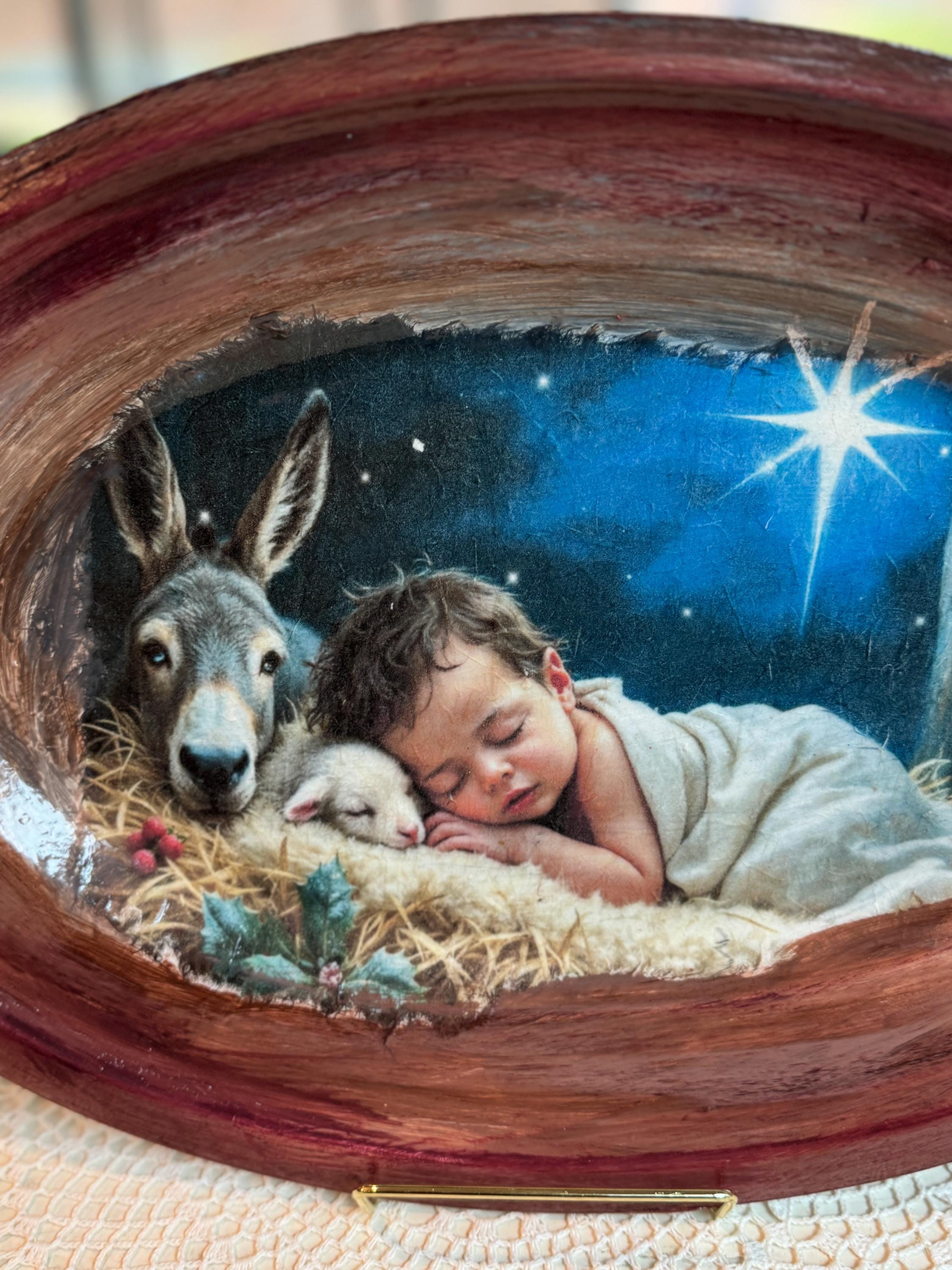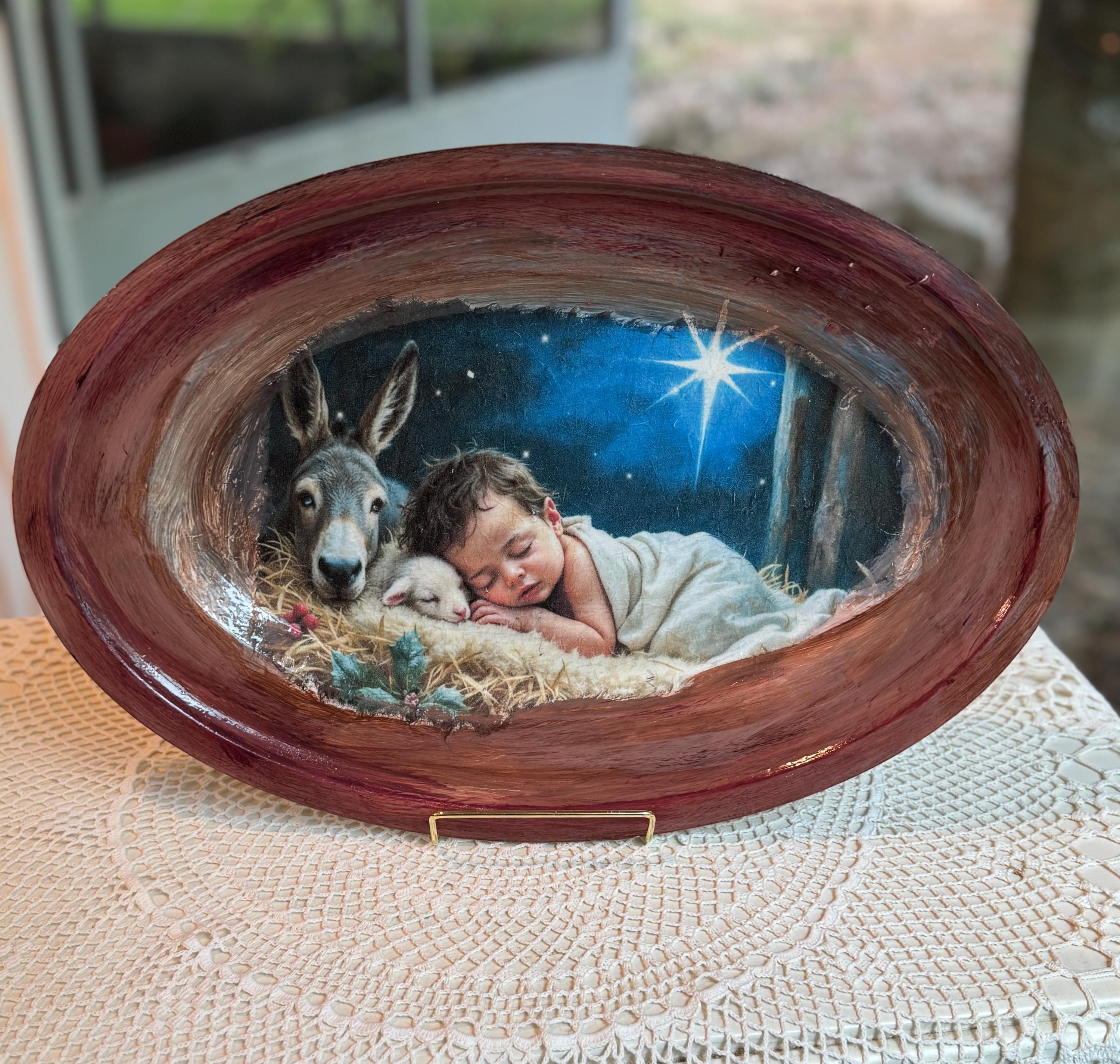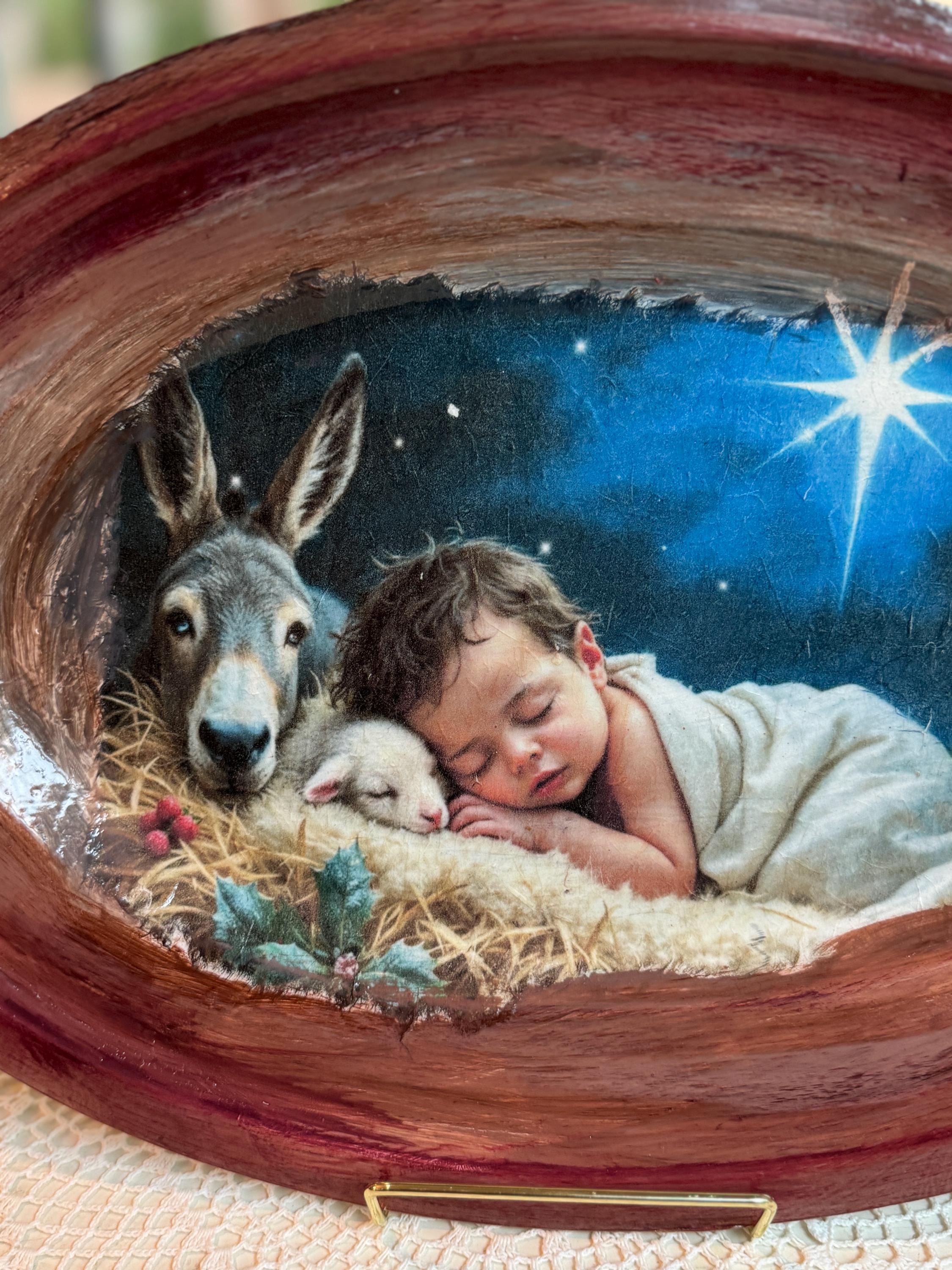 Discover a unique and heartfelt piece for your home with this beautiful oval recycled metal tray, featuring a serene and touching rice paper print of Baby Jesus. This piece captures a peaceful scene, perfect for adding a sense of faith and tranquility to any room. The decoupage technique ensures the print is beautifully preserved, creating a durable and decorative work of art.