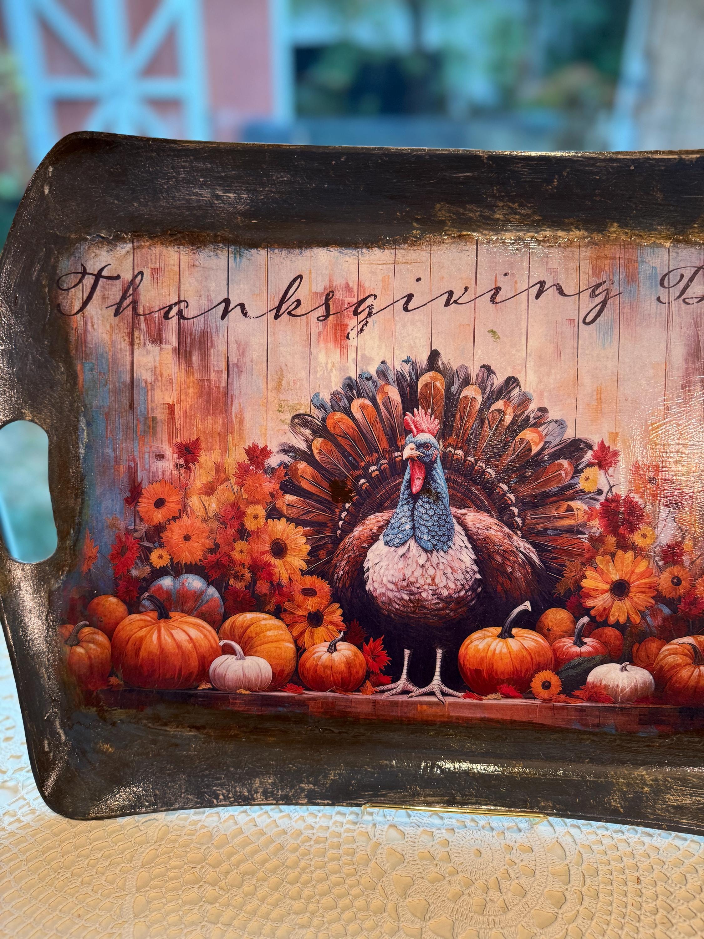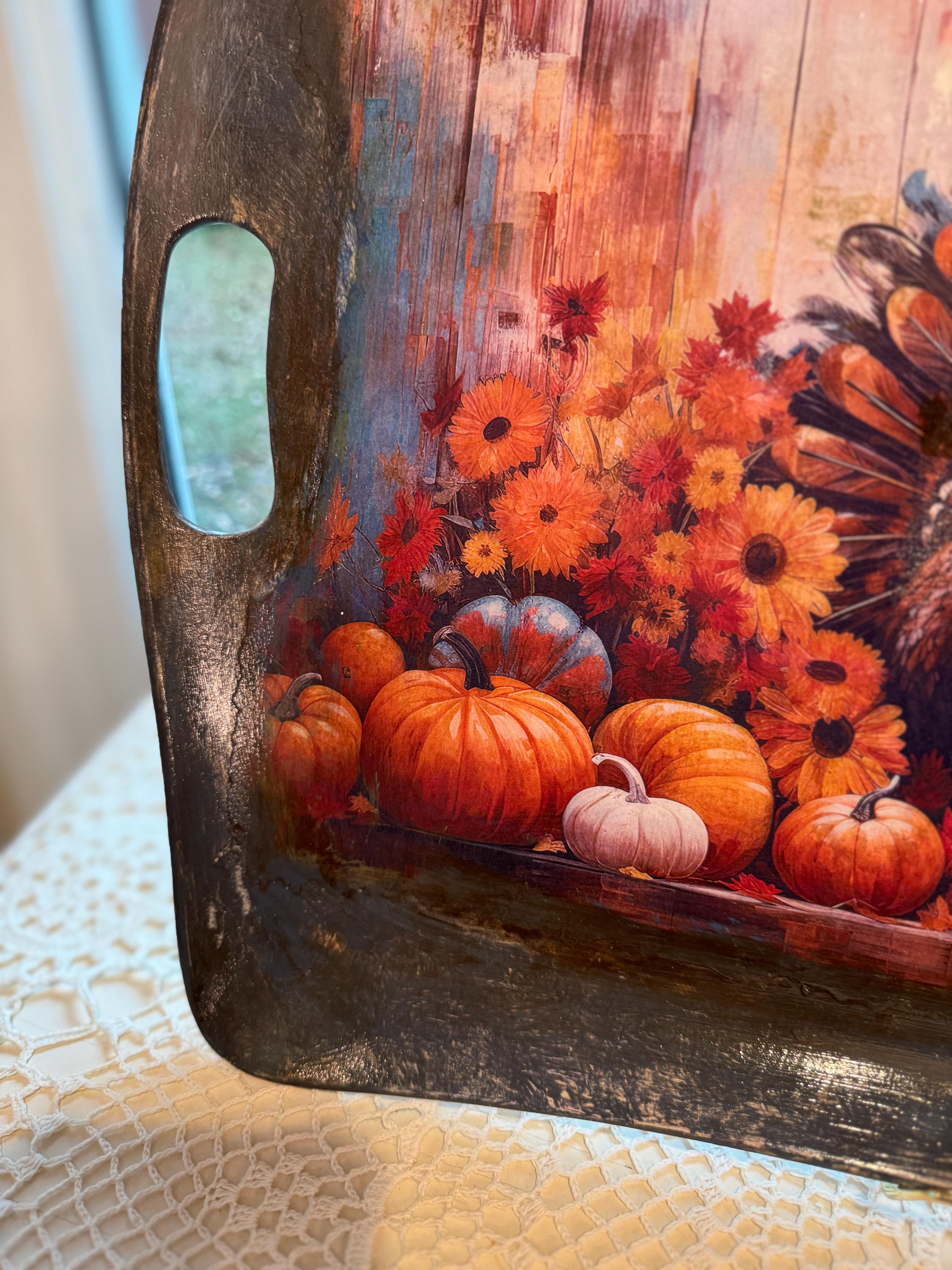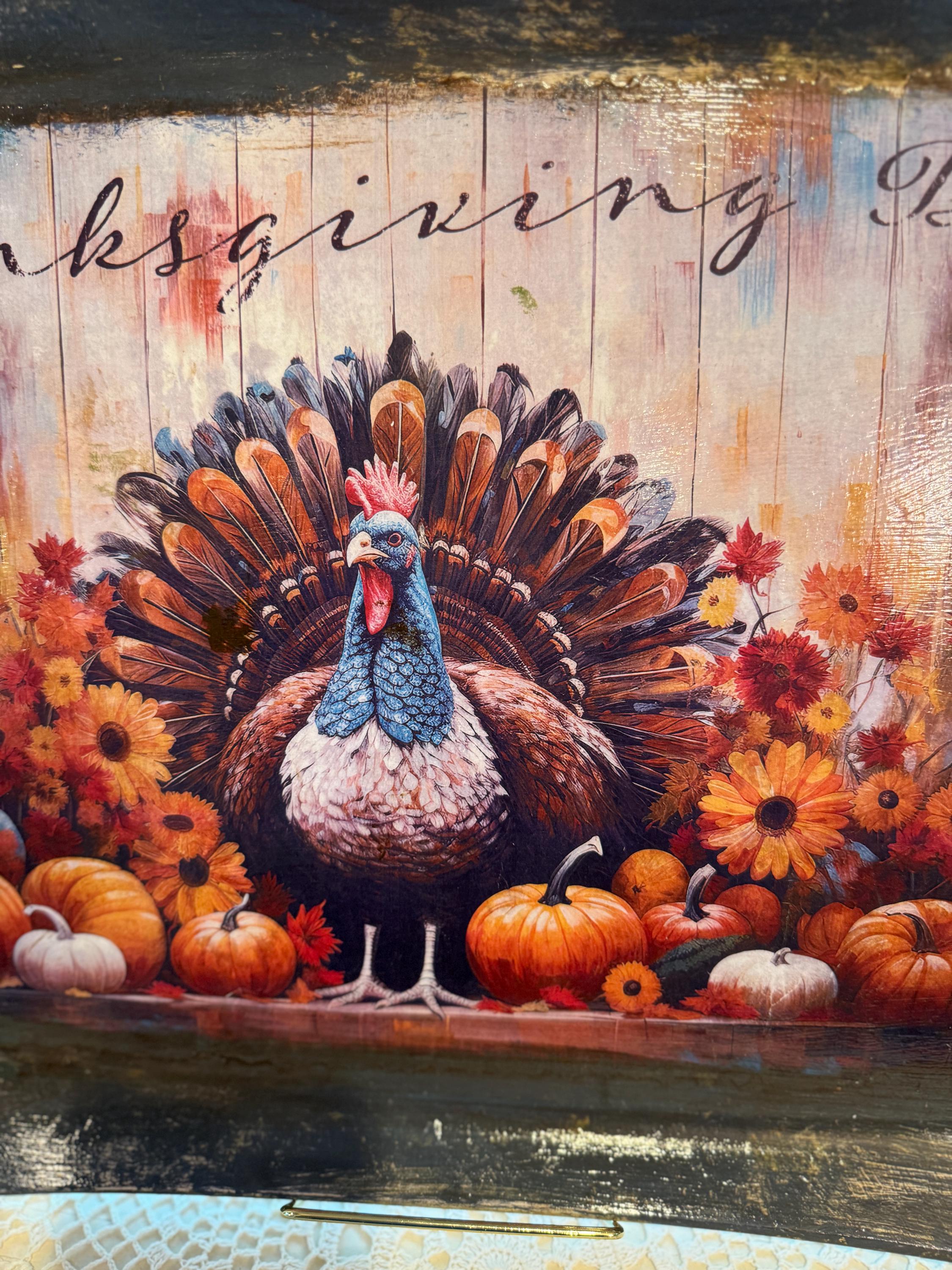 This beautiful, upcycled recycled serving tray is the perfect addition to your fall decor and Thanksgiving celebrations. Featuring a vibrant, rustic print of a turkey surrounded by pumpkins and fall flowers, it adds a touch of warmth and charm to any table setting. The distressed black finish and integrated handles make it both stylish and functional, whether you're serving appetizers or using it as a centerpiece.