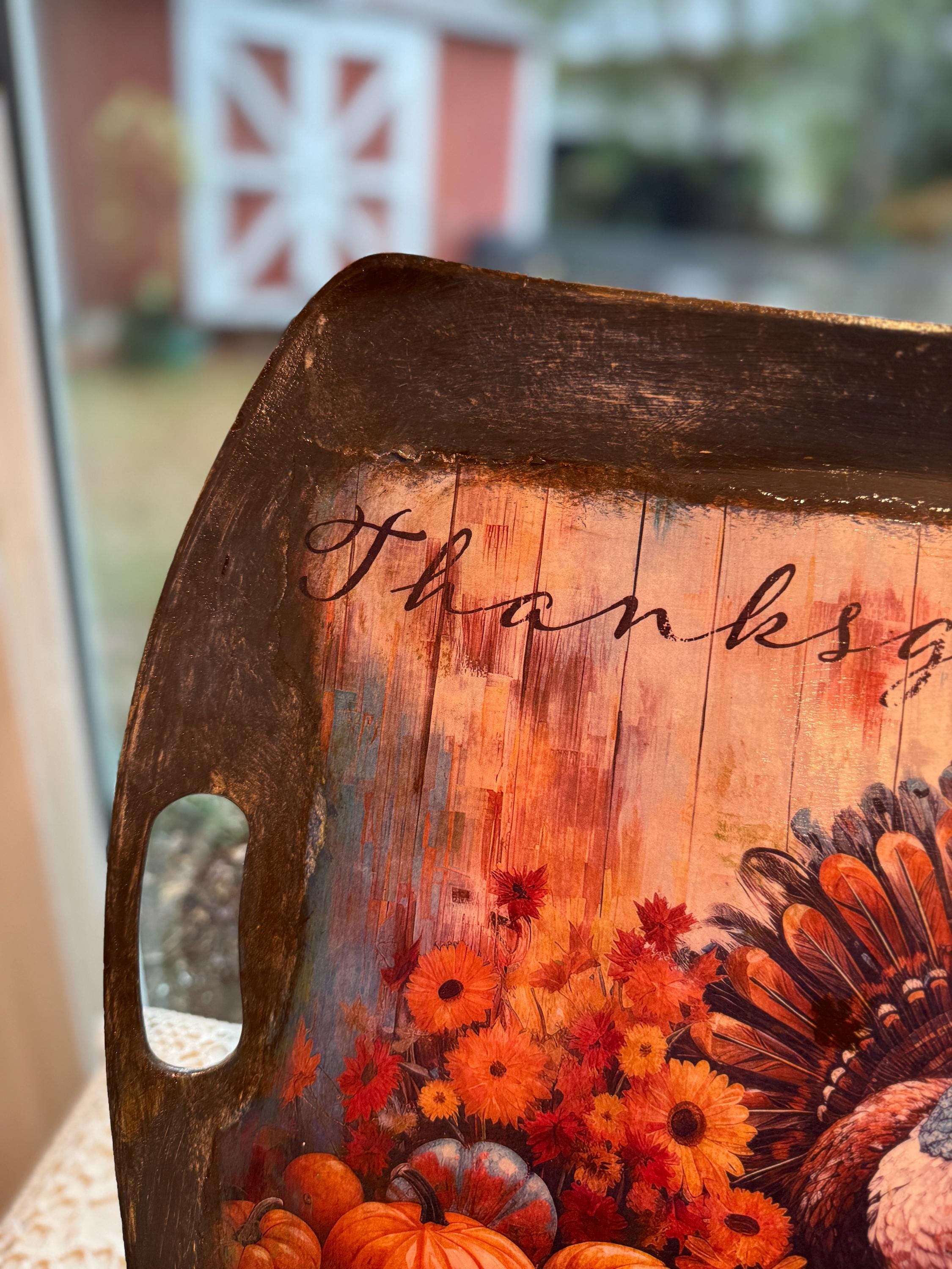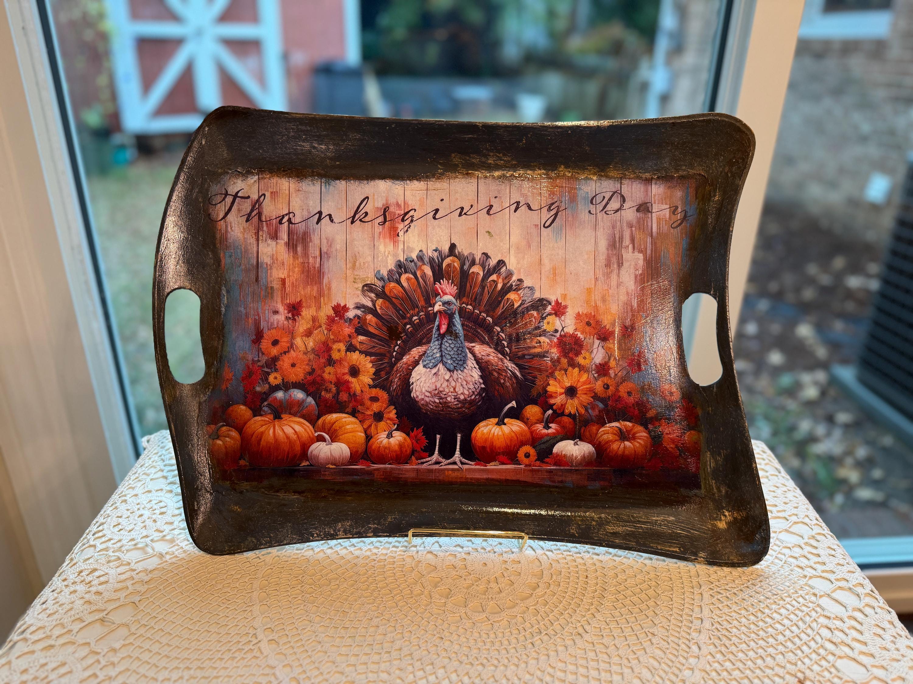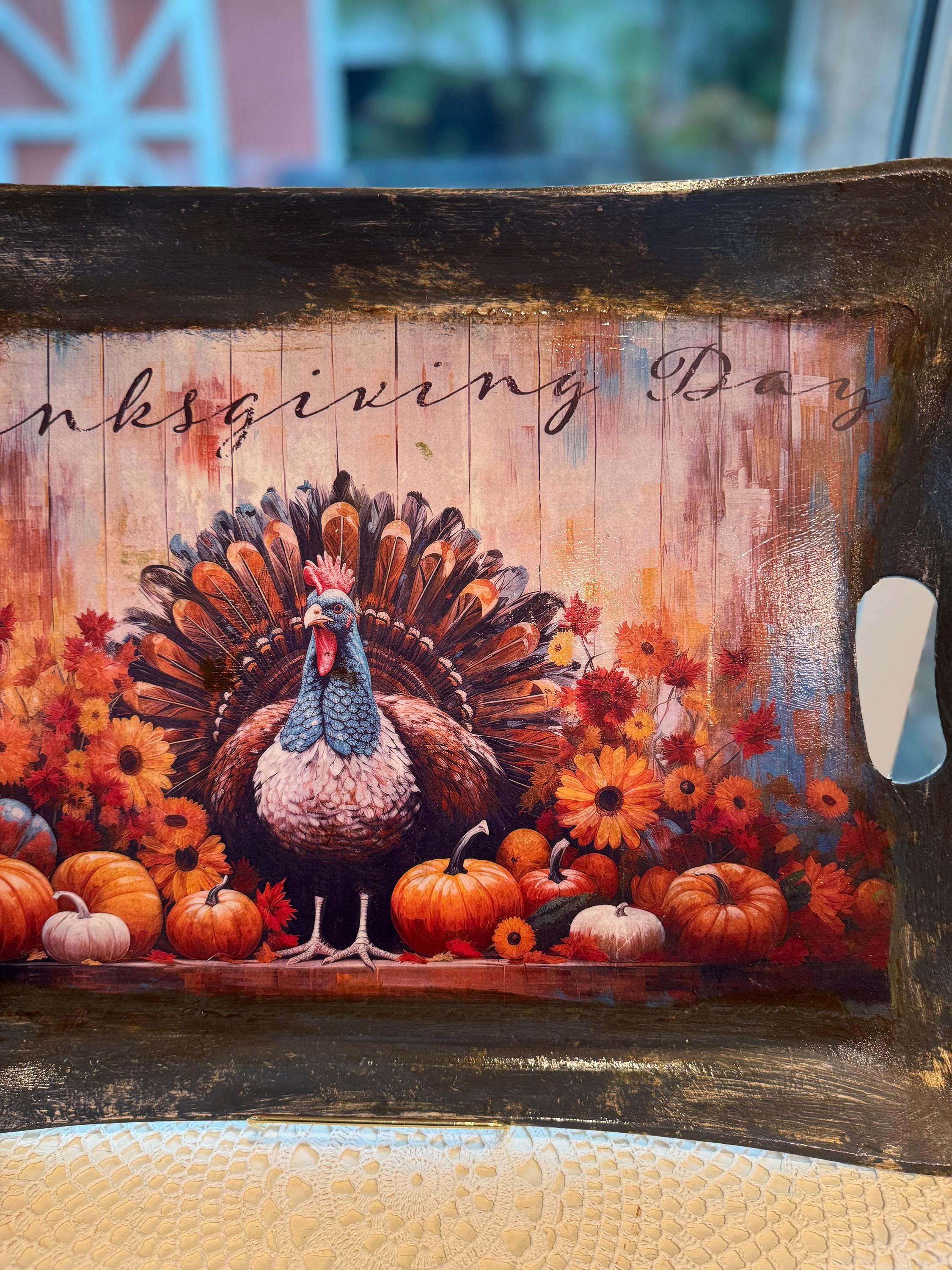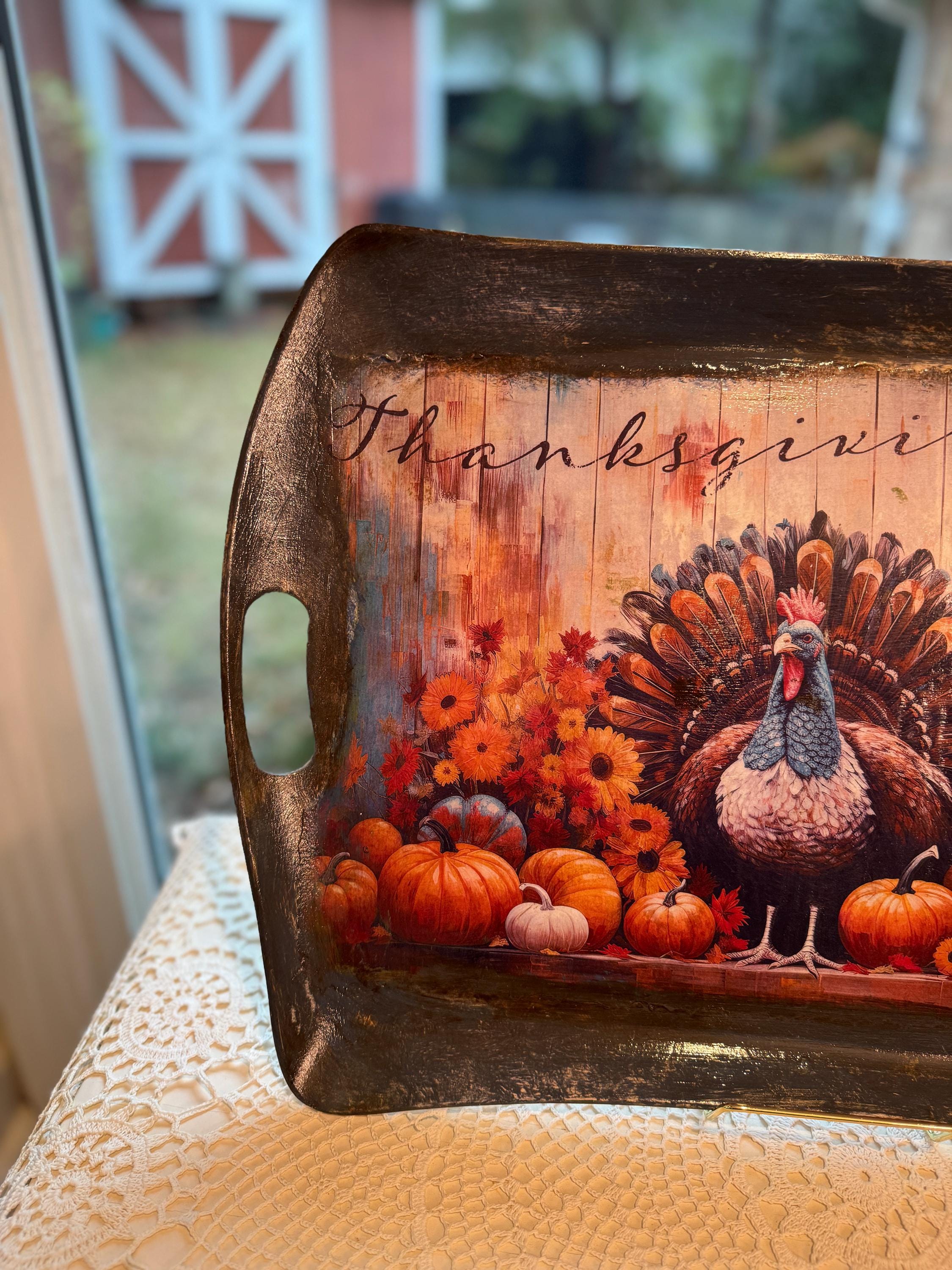 This beautiful, upcycled recycled serving tray is the perfect addition to your fall decor and Thanksgiving celebrations. Featuring a vibrant, rustic print of a turkey surrounded by pumpkins and fall flowers, it adds a touch of warmth and charm to any table setting. The distressed black finish and integrated handles make it both stylish and functional, whether you're serving appetizers or using it as a centerpiece.