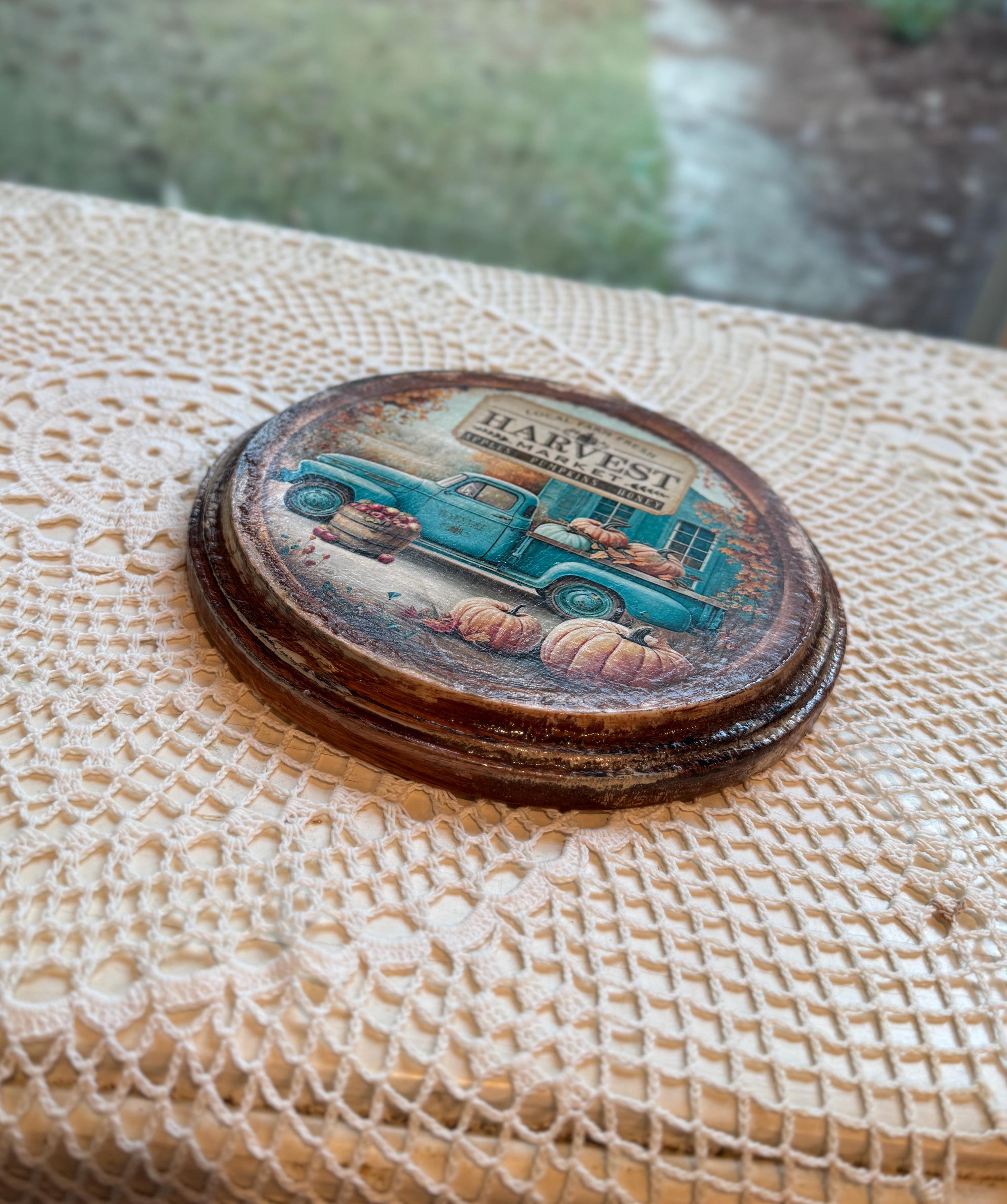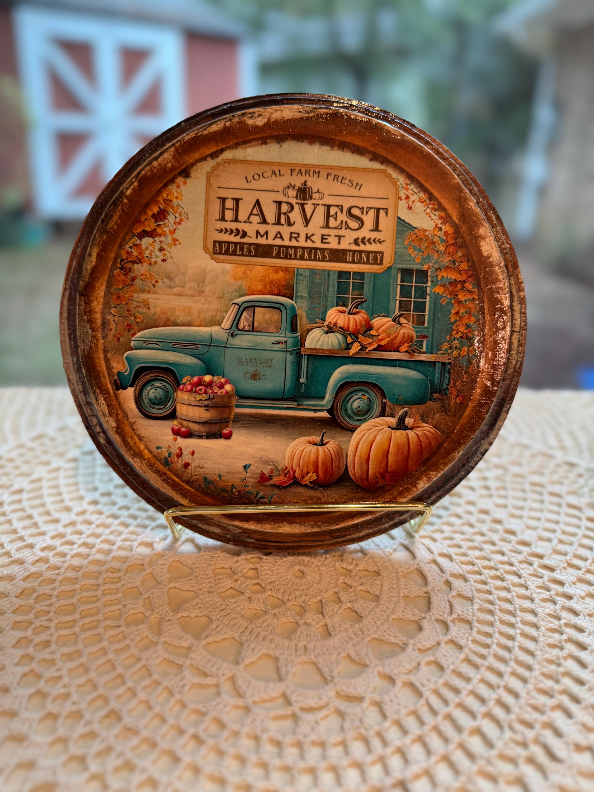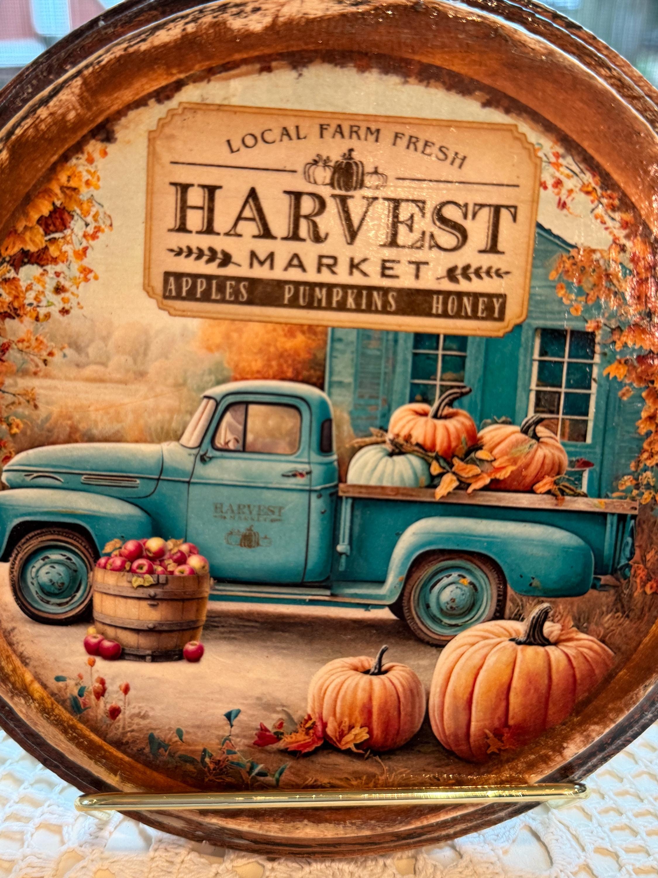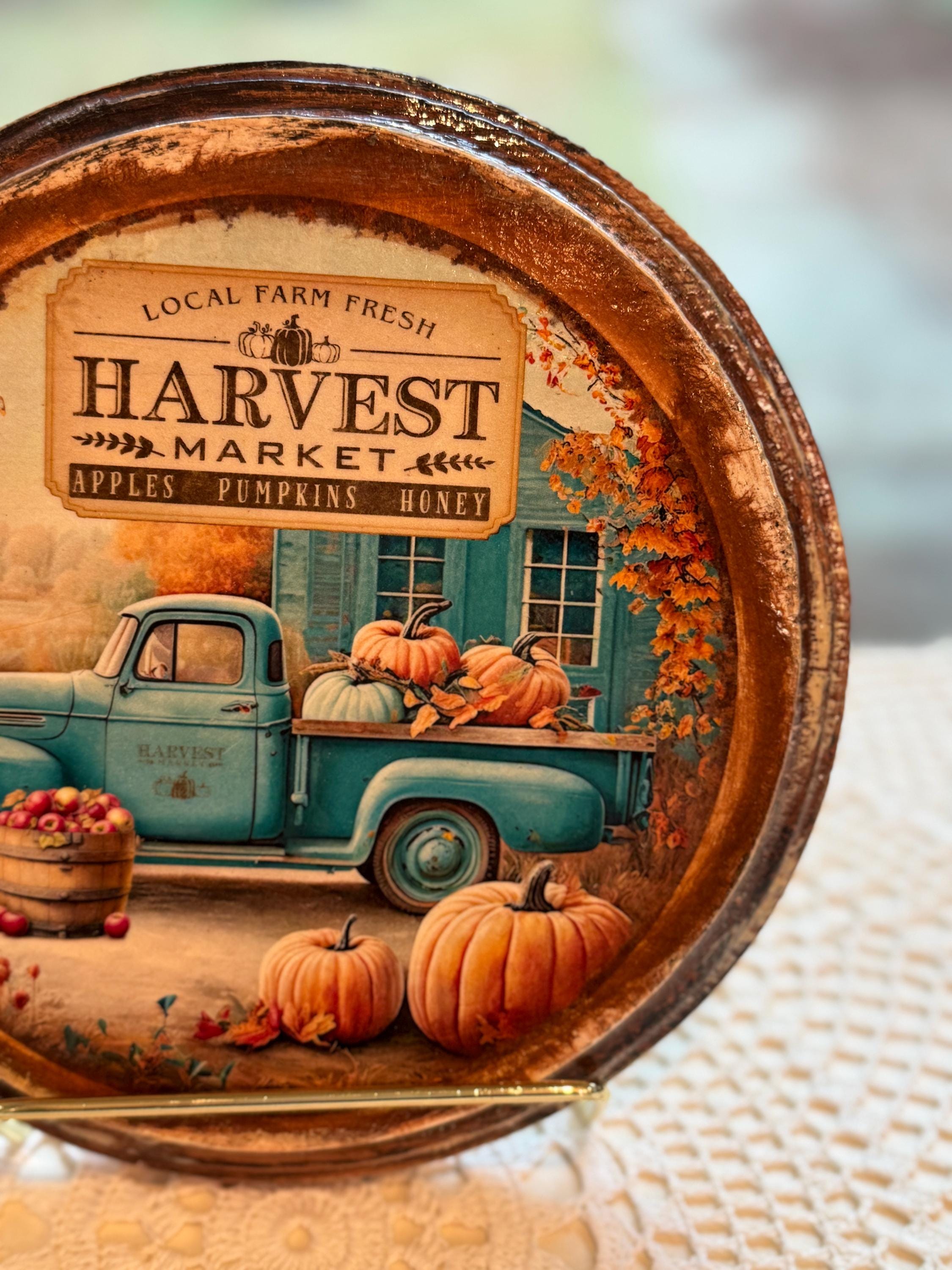 This charming wood plaque is the perfect addition to your fall decor. It features a classic vintage blue truck from the Harvest Market, overflowing with freshly picked pumpkins and apples. The vibrant autumn scene includes rustic details and a distressed finish that captures the cozy farmhouse style. This versatile piece can be displayed on a shelf or hung on a wall to create a welcoming atmosphere for your home. It’s a wonderful Thanksgiving decoration or a thoughtful holiday gift for anyone who loves seasonal decor.
