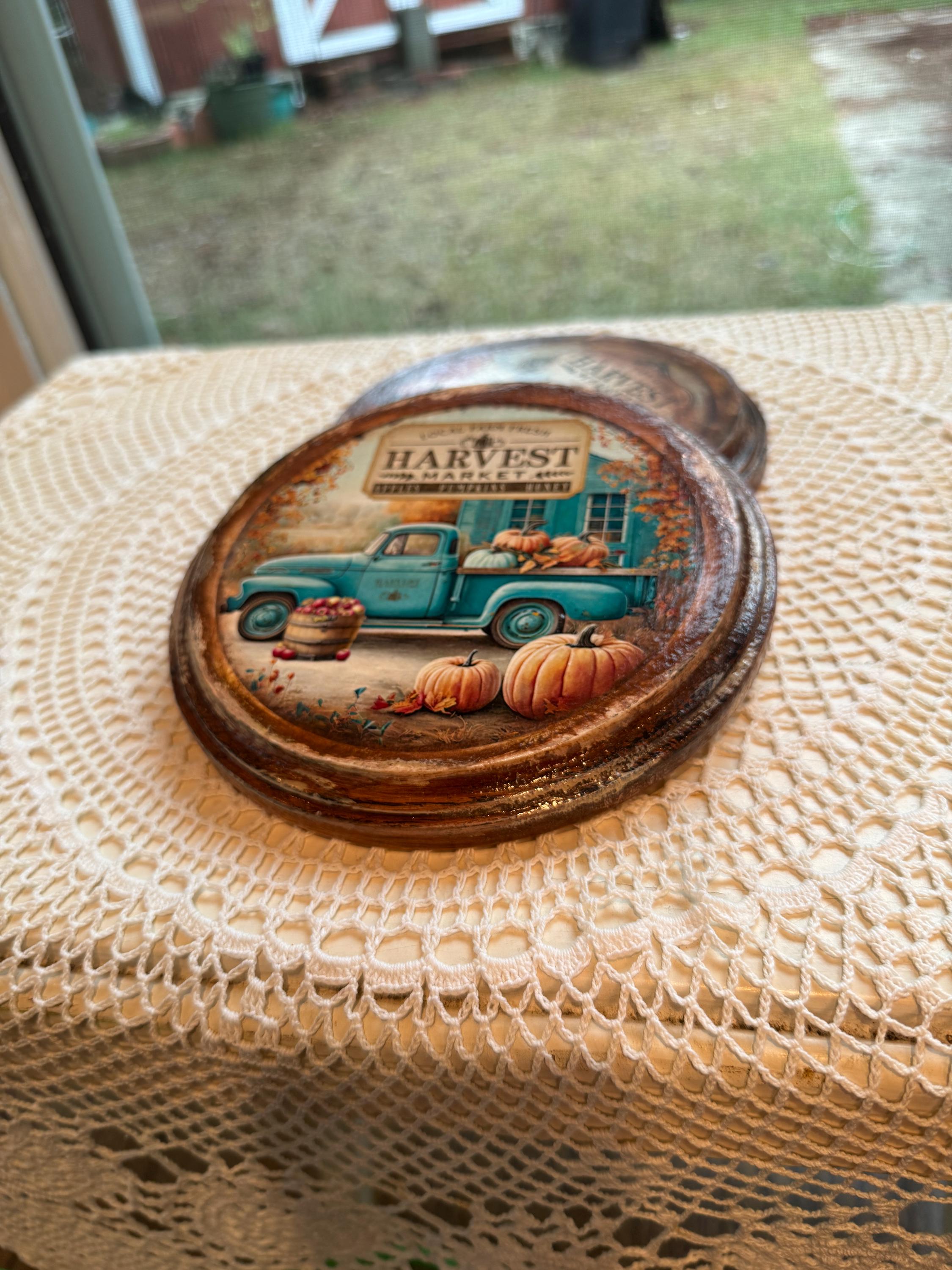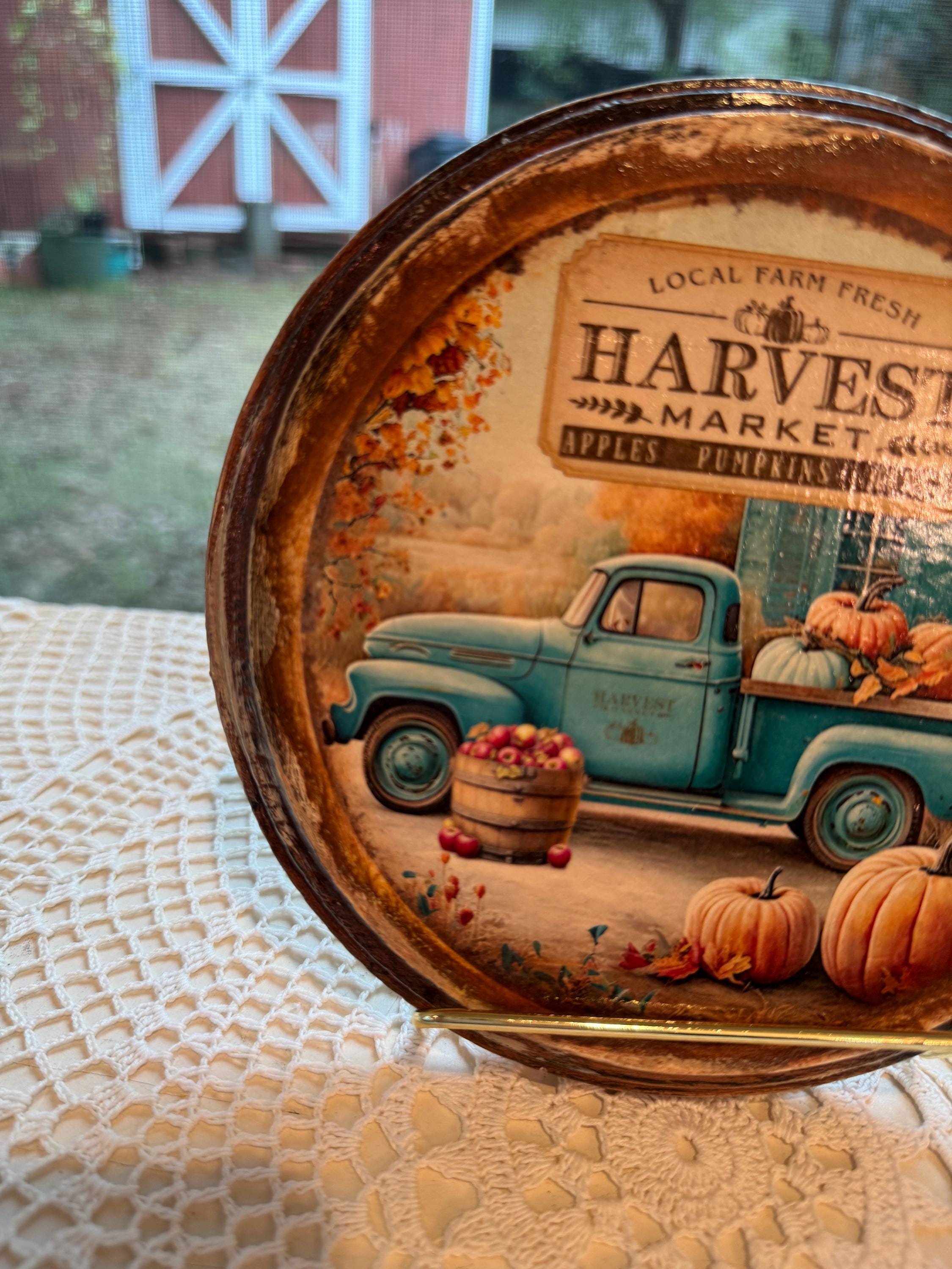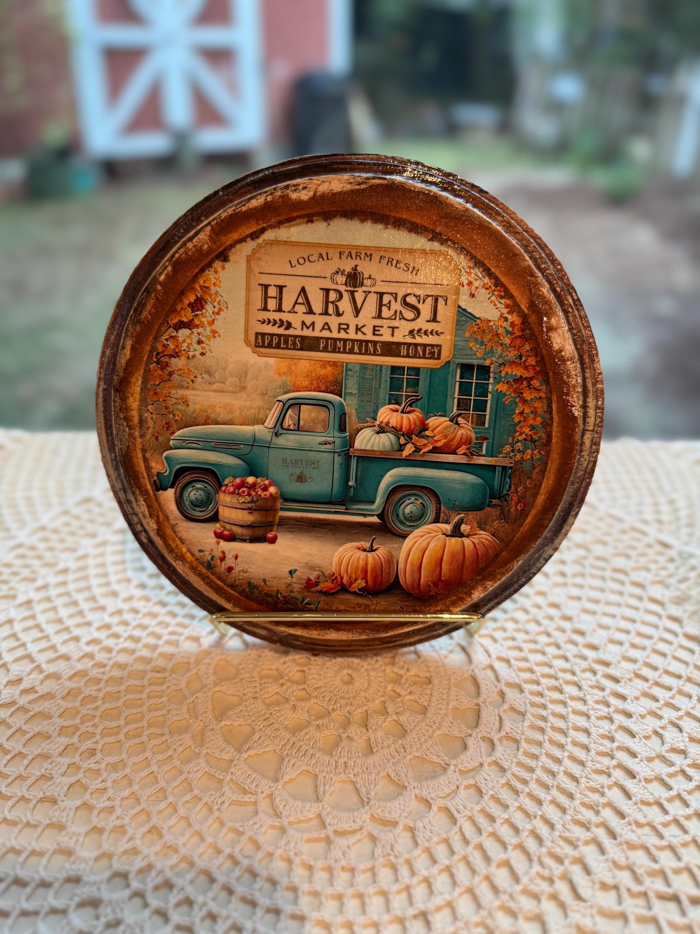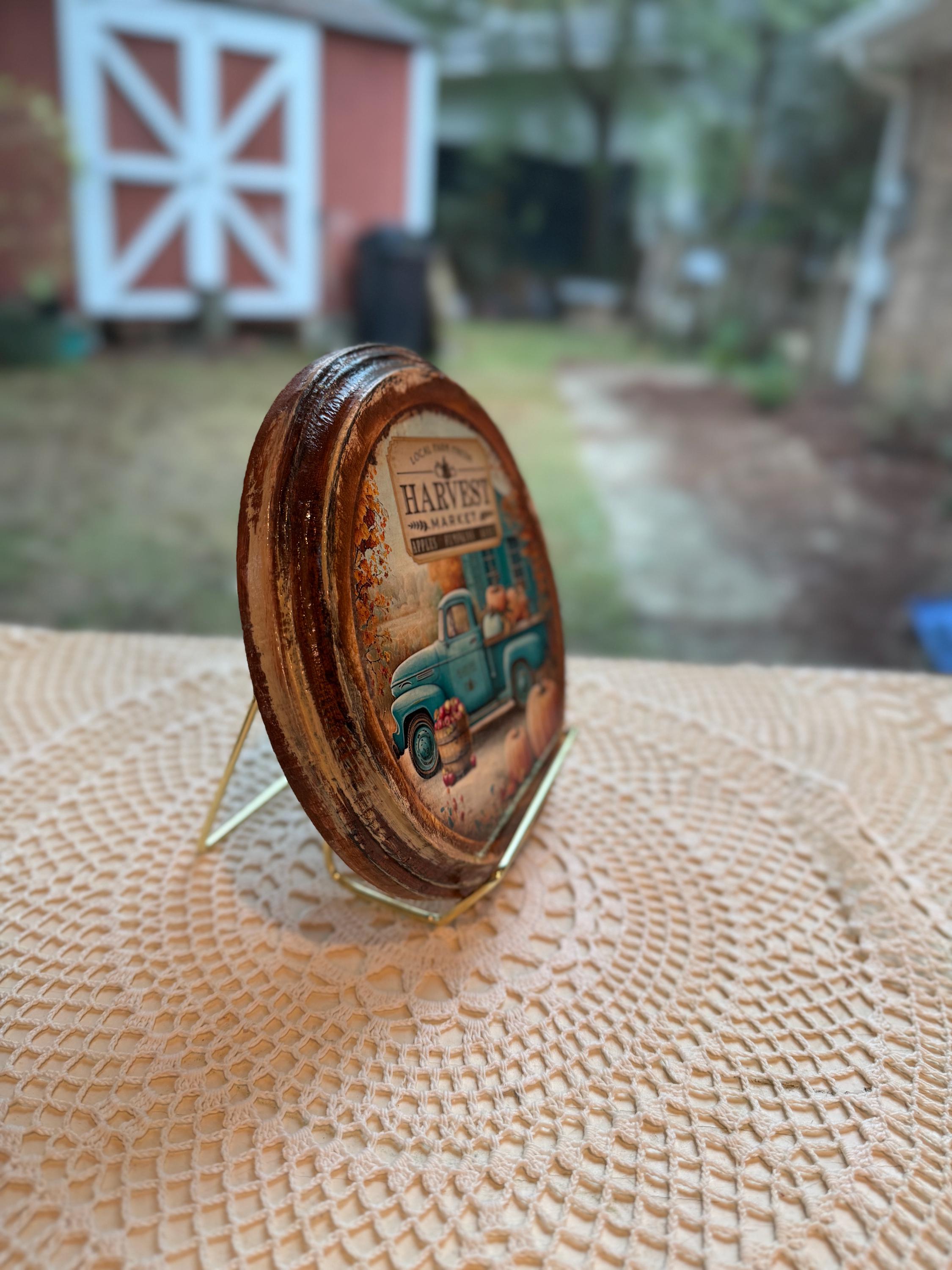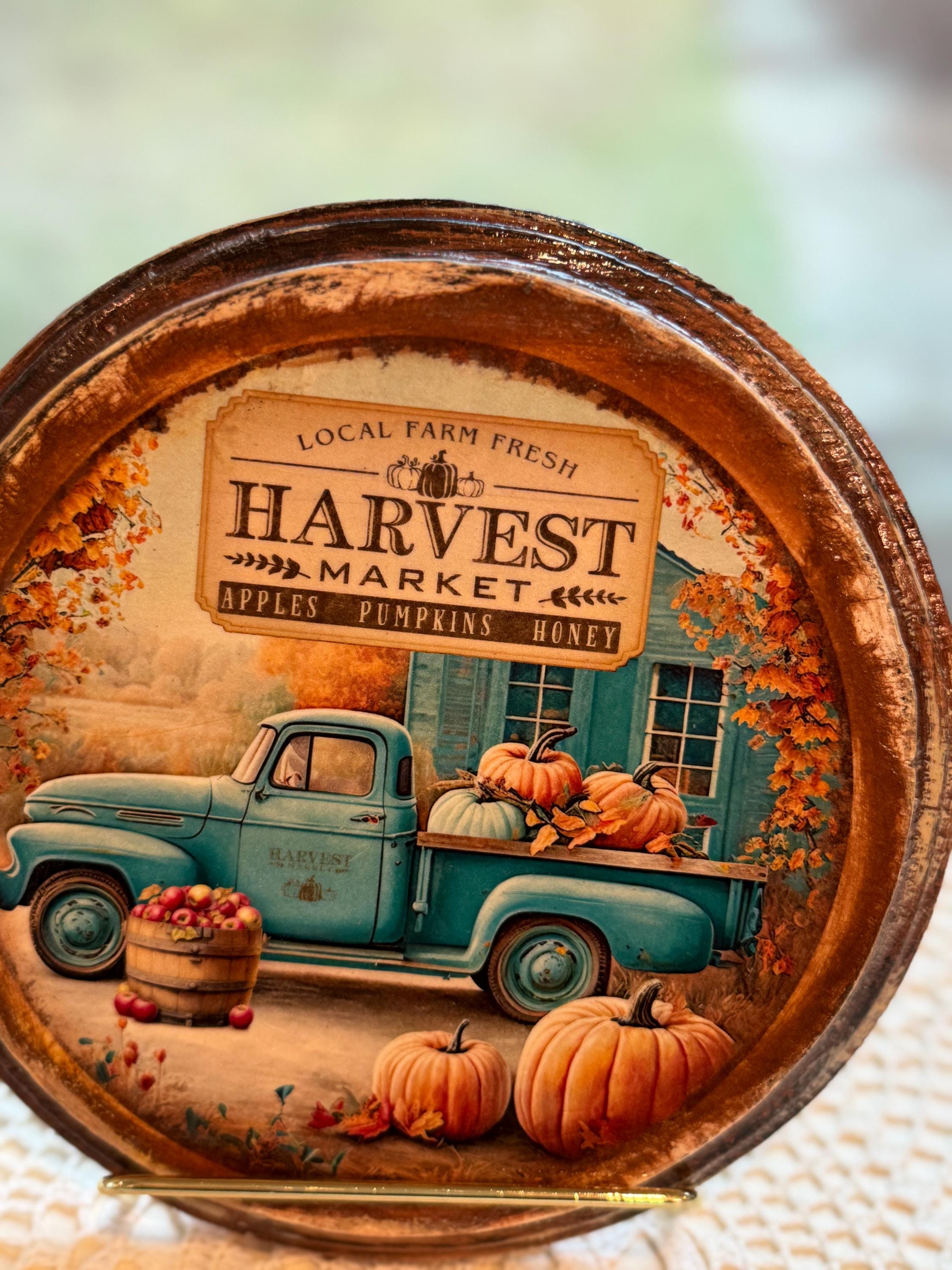 This charming wood plaque is the perfect addition to your fall decor. It features a classic vintage blue truck from the Harvest Market, overflowing with freshly picked pumpkins and apples. The vibrant autumn scene includes rustic details and a distressed finish that captures the cozy farmhouse style. This versatile piece can be displayed on a shelf or hung on a wall to create a welcoming atmosphere for your home. It’s a wonderful Thanksgiving decoration or a thoughtful holiday gift for anyone who loves seasonal decor.