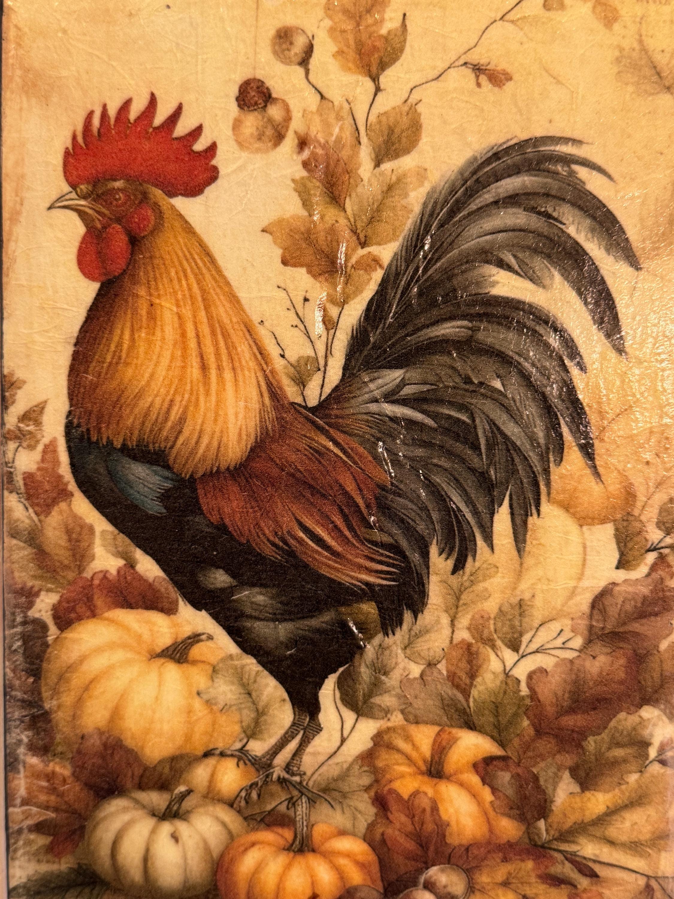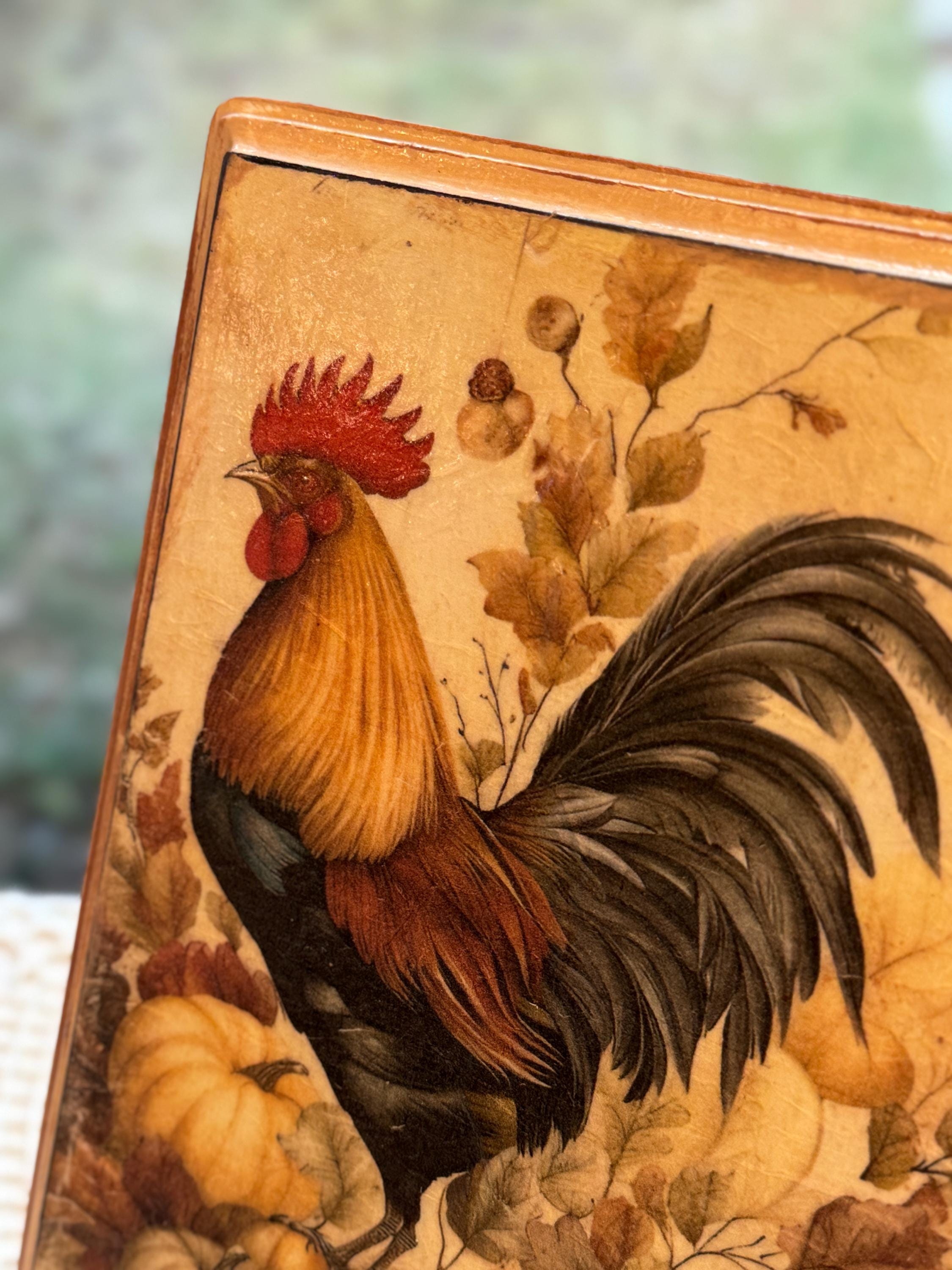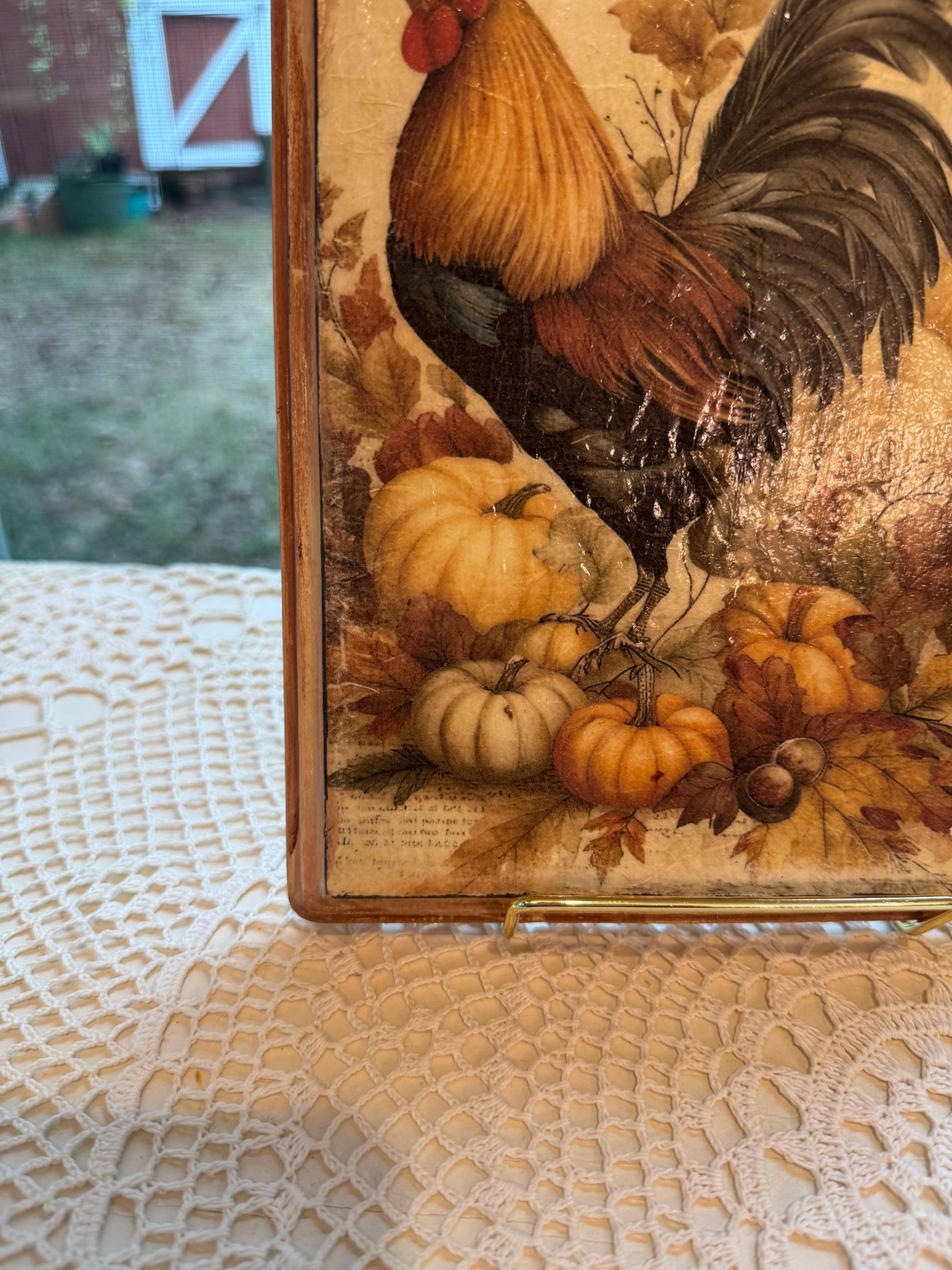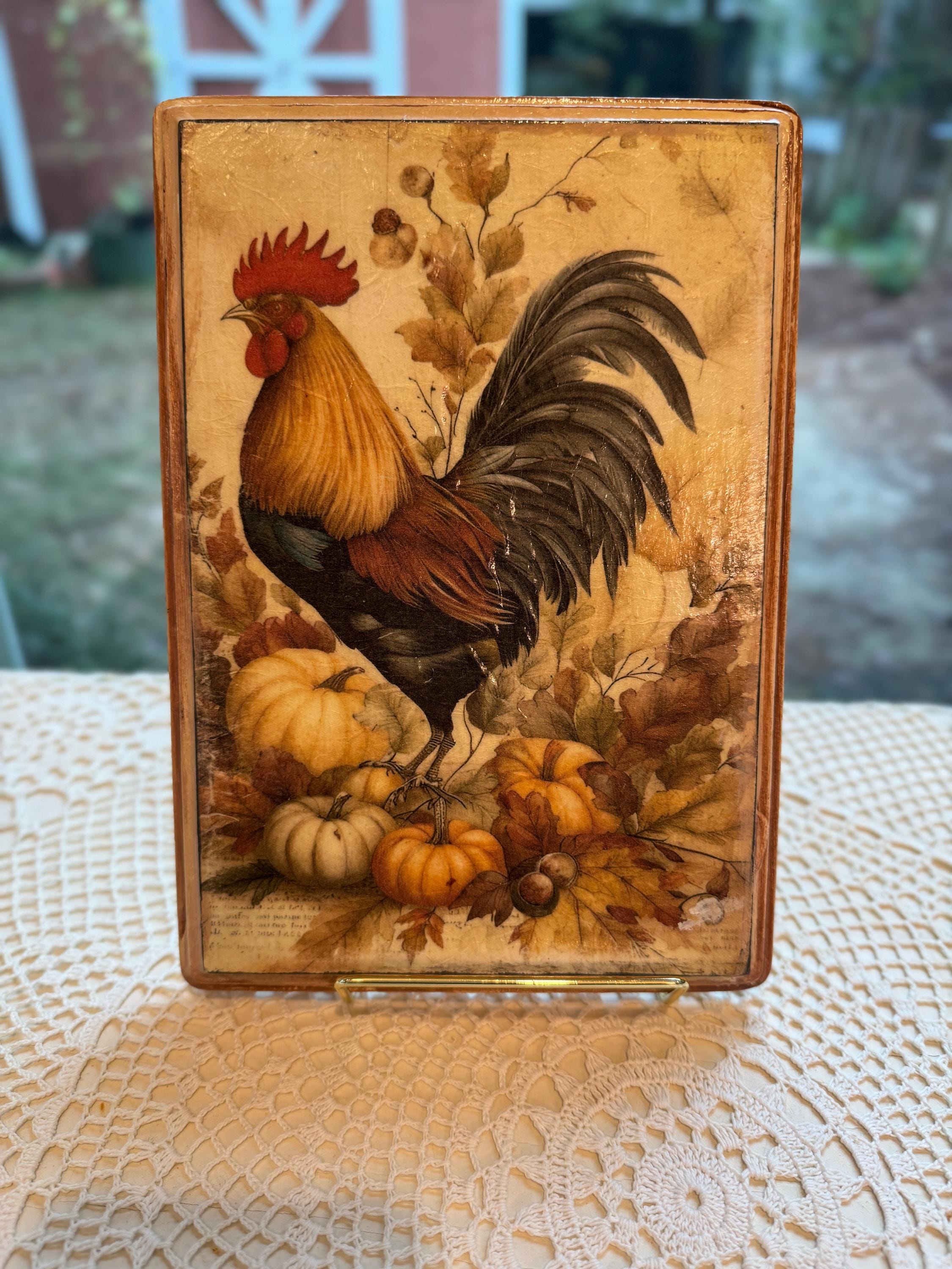 This beautiful wood plaque is the perfect addition to your fall decor and Thanksgiving decoration. It features a handsome rooster surrounded by pumpkins, gourds, and autumn leaves, capturing the vibrant spirit of the season. The rustic, handcrafted style makes it an ideal accent for a mantel, shelf, or kitchen counter. This versatile piece can be displayed on a stand or hung on a wall to enhance your fall farmhouse style. It also makes a thoughtful holiday gift for friends and family who love rooster art and seasonal decor.