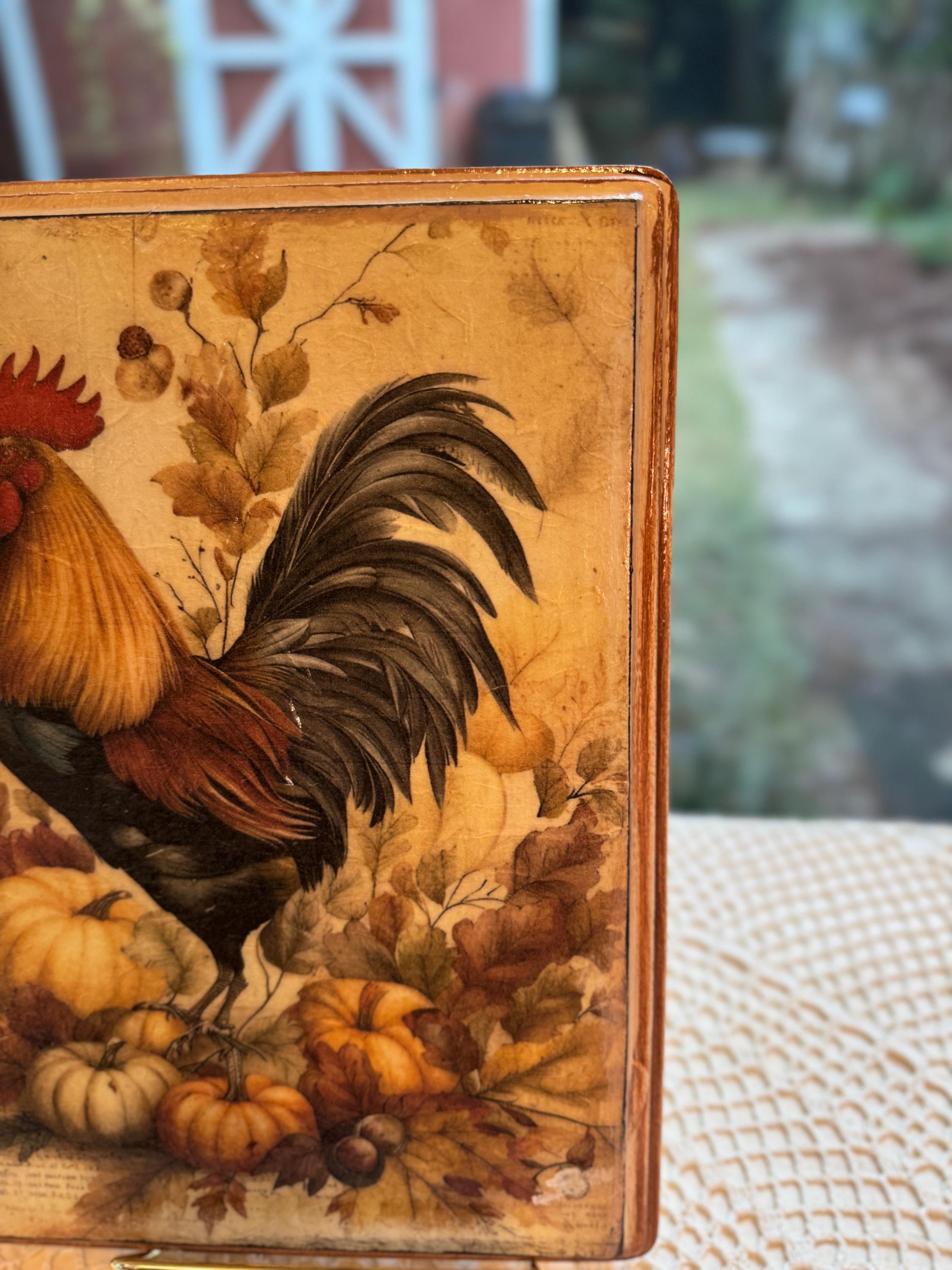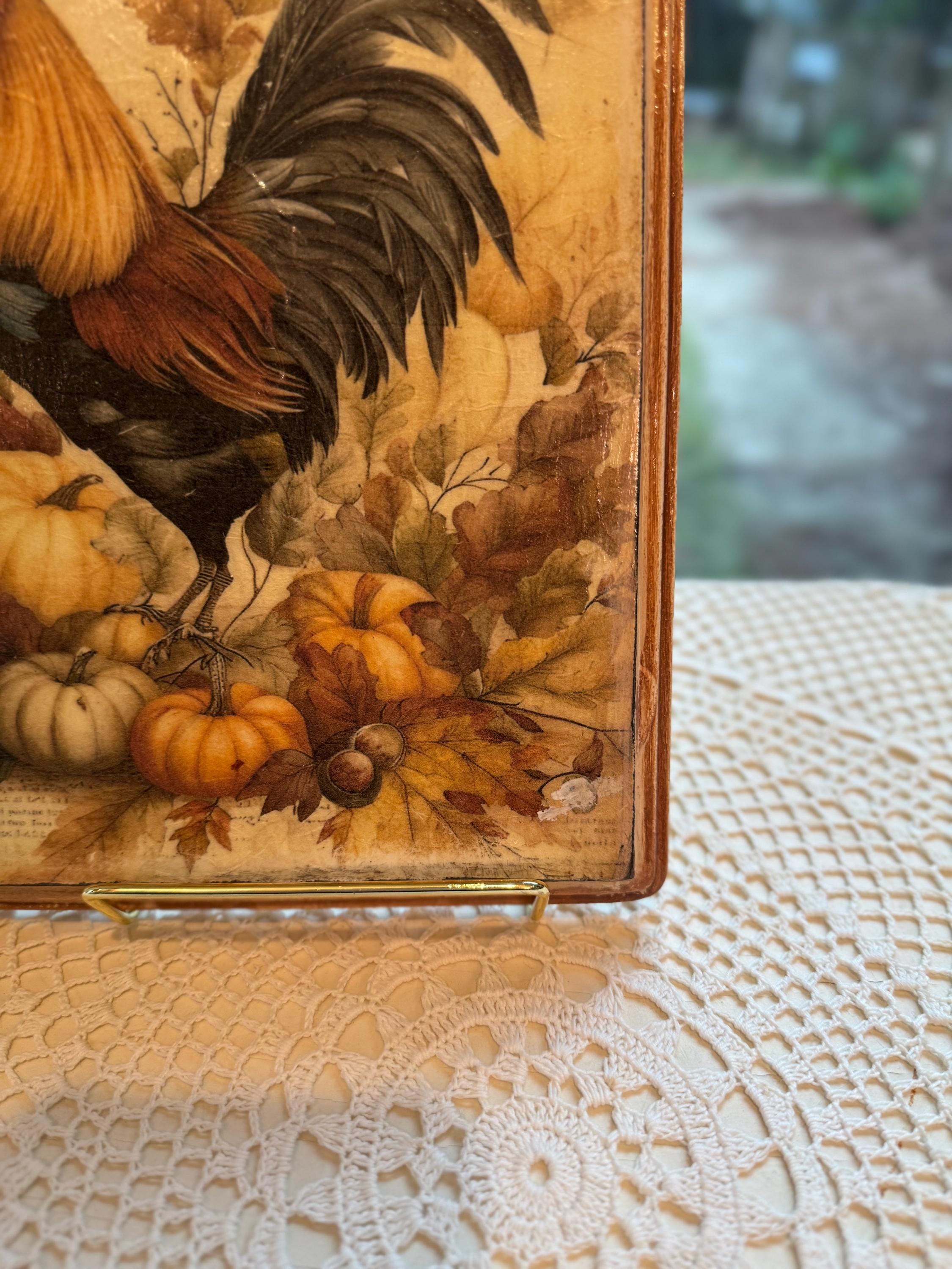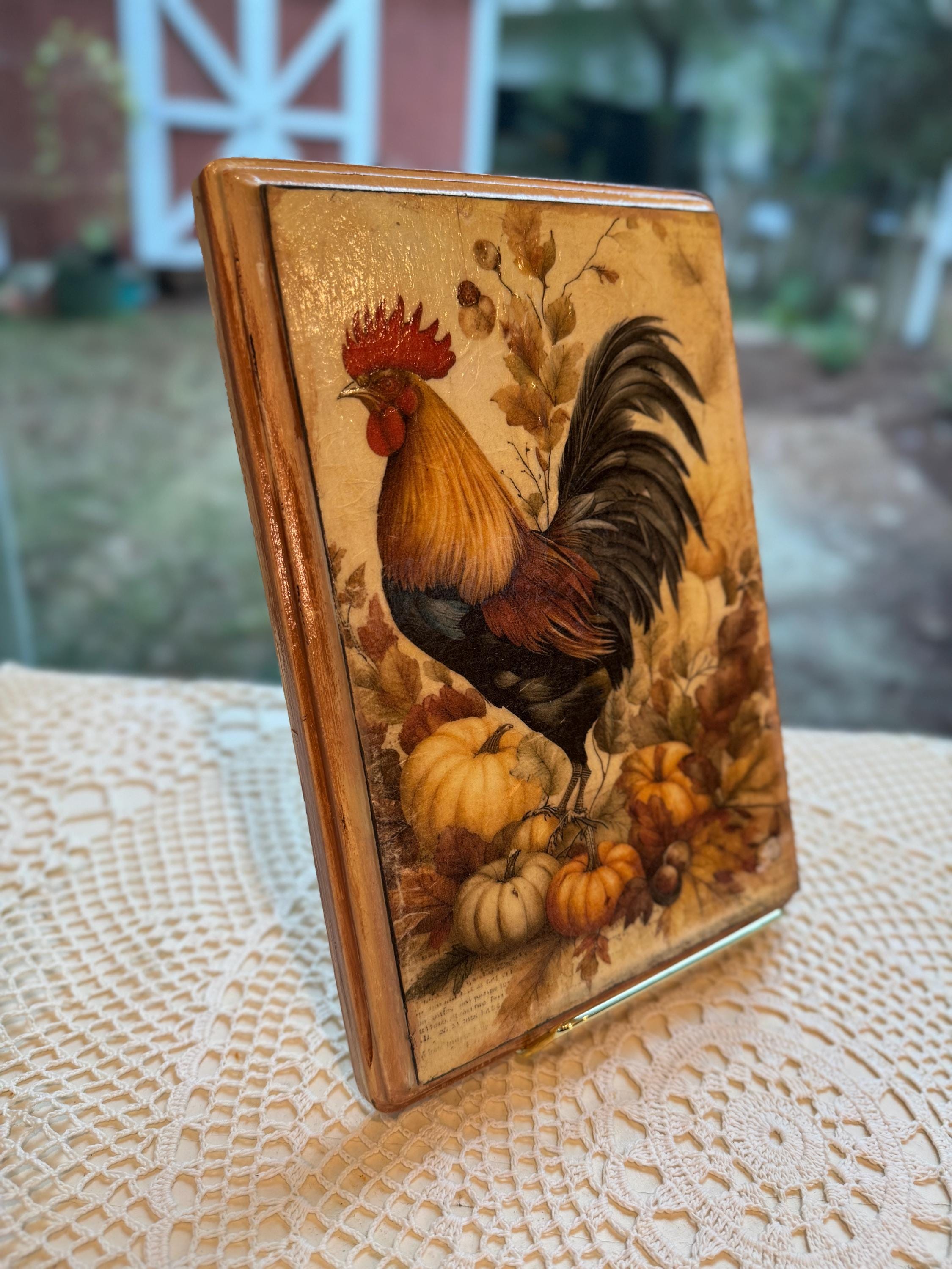 This beautiful wood plaque is the perfect addition to your fall decor and Thanksgiving decoration. It features a handsome rooster surrounded by pumpkins, gourds, and autumn leaves, capturing the vibrant spirit of the season. The rustic, handcrafted style makes it an ideal accent for a mantel, shelf, or kitchen counter. This versatile piece can be displayed on a stand or hung on a wall to enhance your fall farmhouse style. It also makes a thoughtful holiday gift for friends and family who love rooster art and seasonal decor.