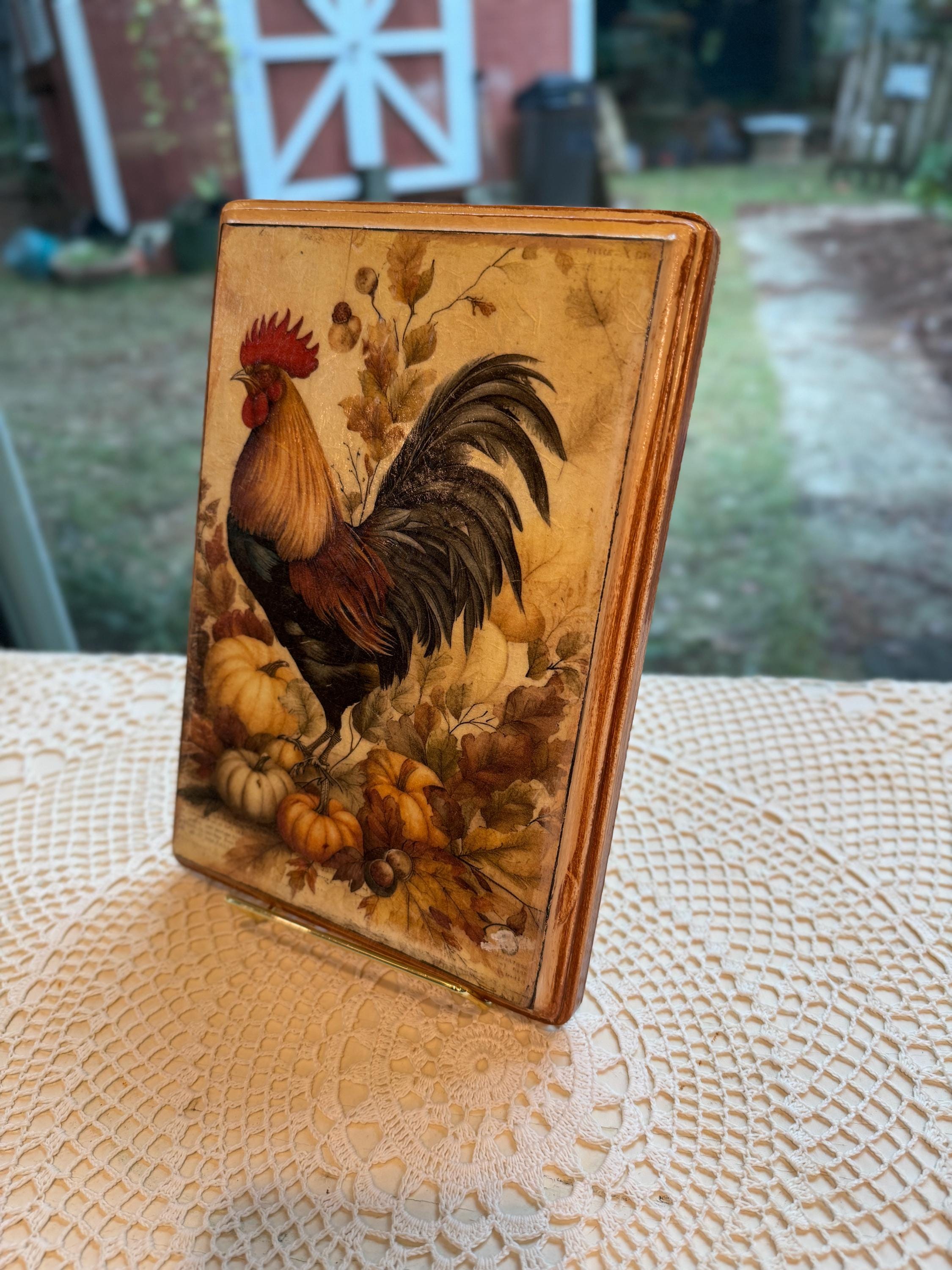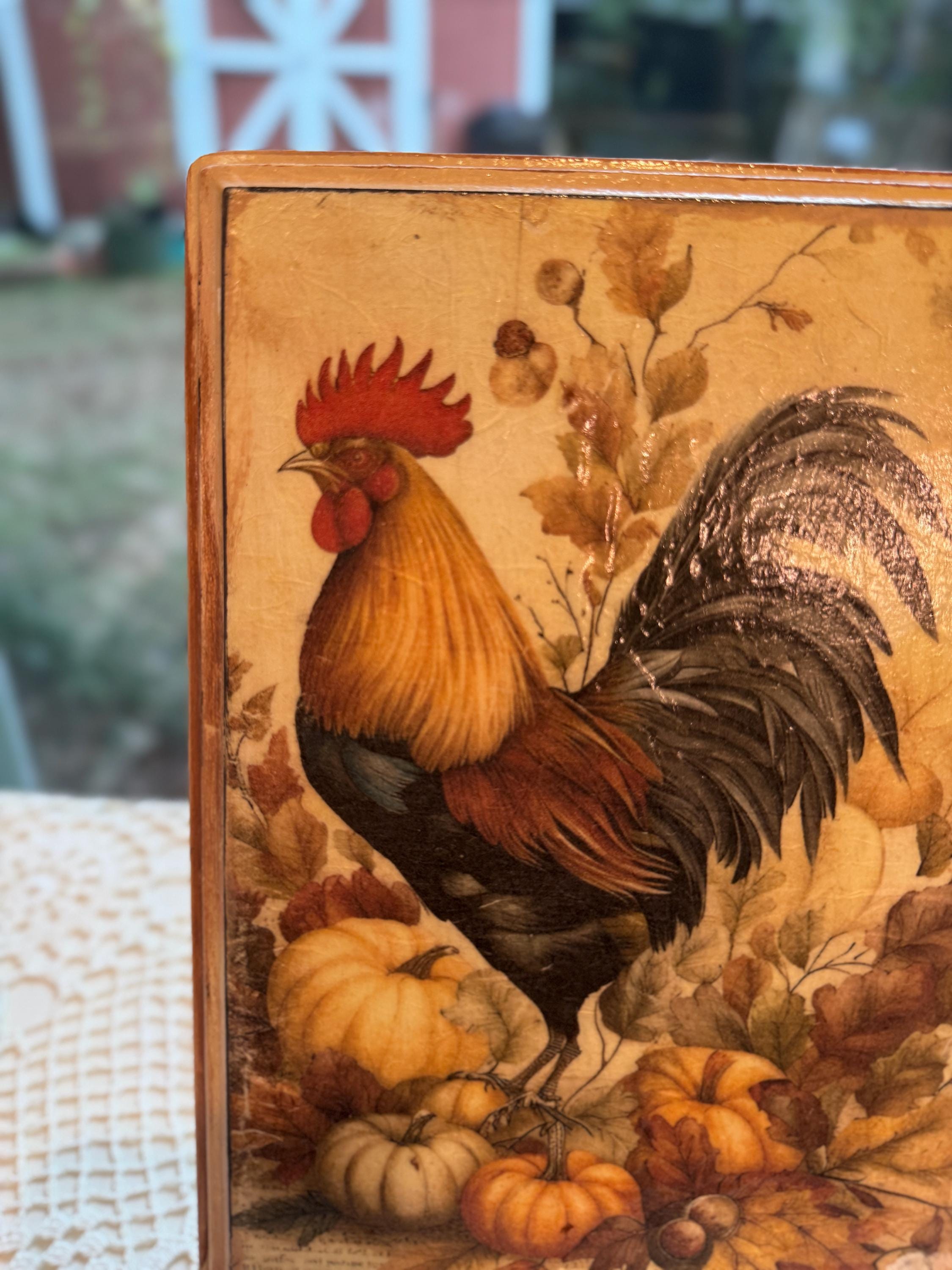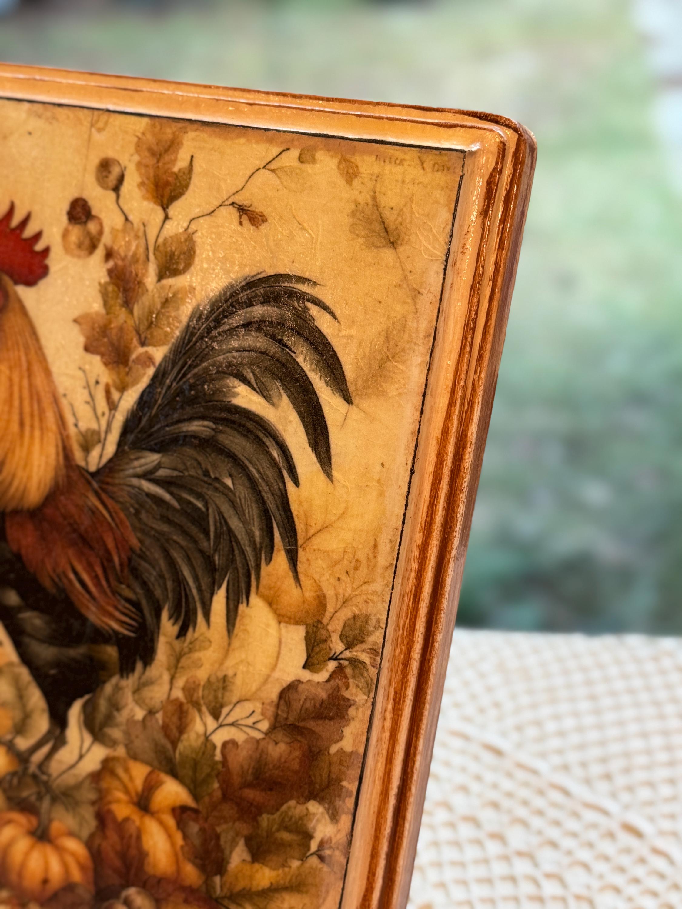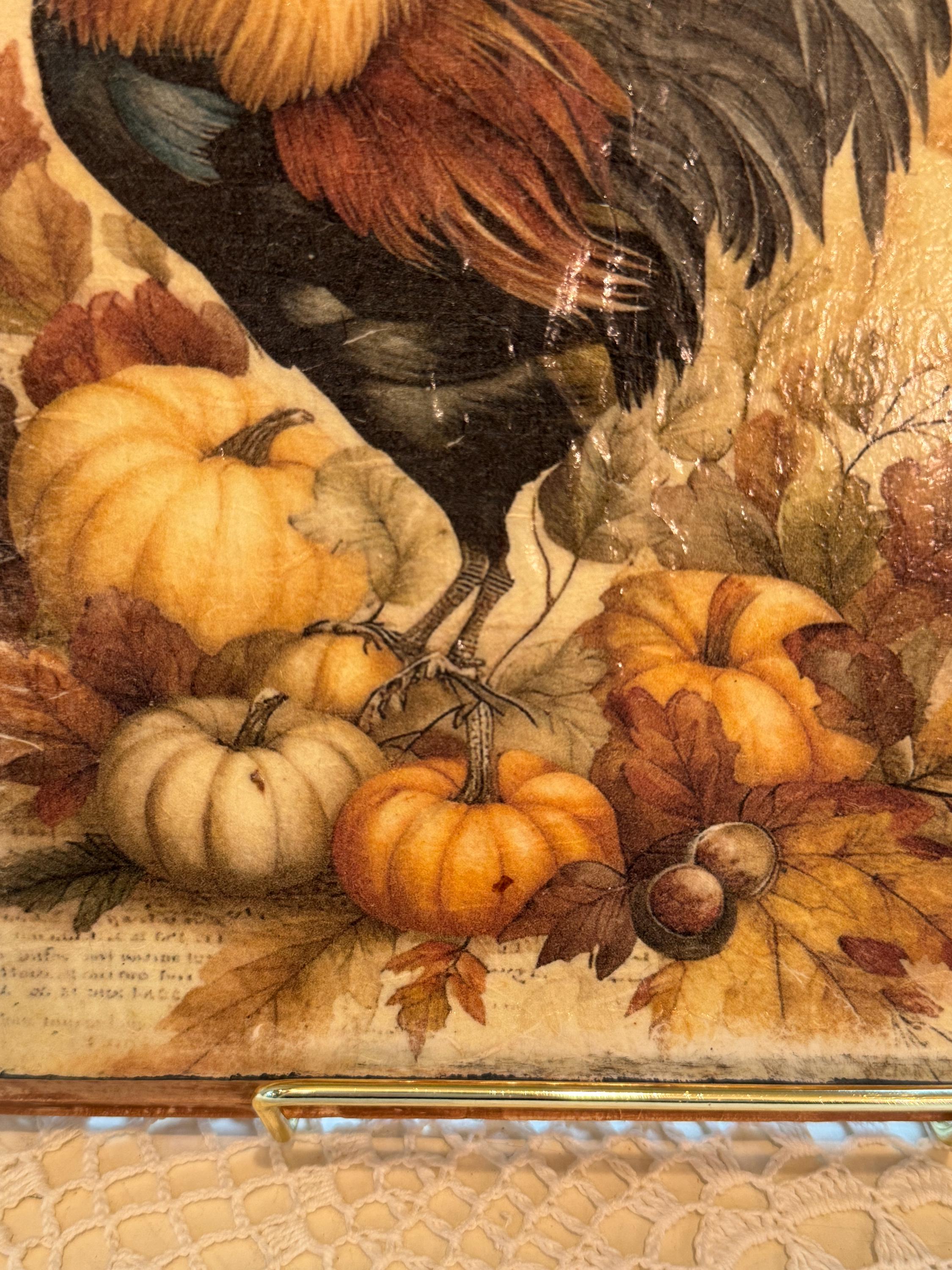 This beautiful wood plaque is the perfect addition to your fall decor and Thanksgiving decoration. It features a handsome rooster surrounded by pumpkins, gourds, and autumn leaves, capturing the vibrant spirit of the season. The rustic, handcrafted style makes it an ideal accent for a mantel, shelf, or kitchen counter. This versatile piece can be displayed on a stand or hung on a wall to enhance your fall farmhouse style. It also makes a thoughtful holiday gift for friends and family who love rooster art and seasonal decor.