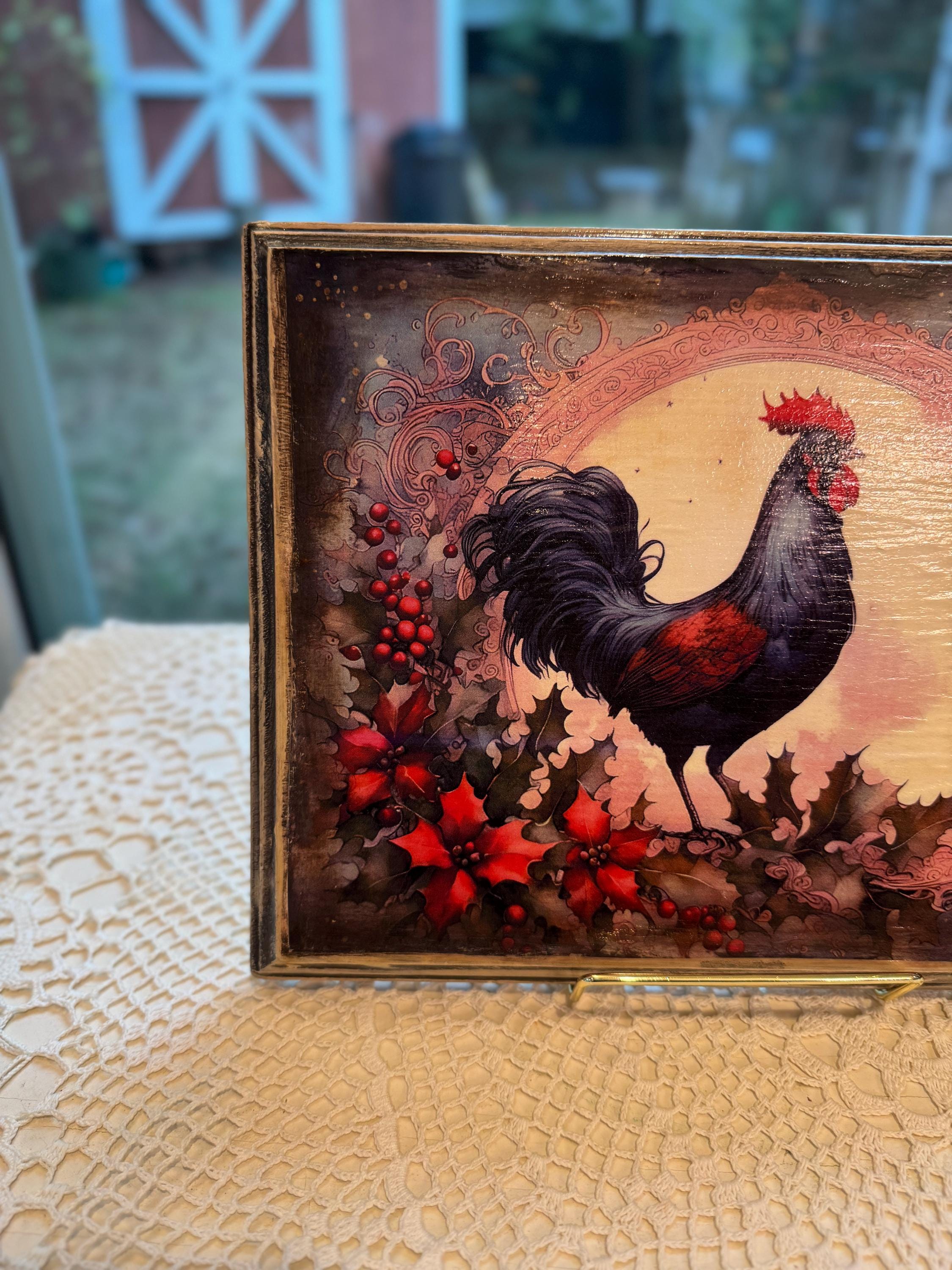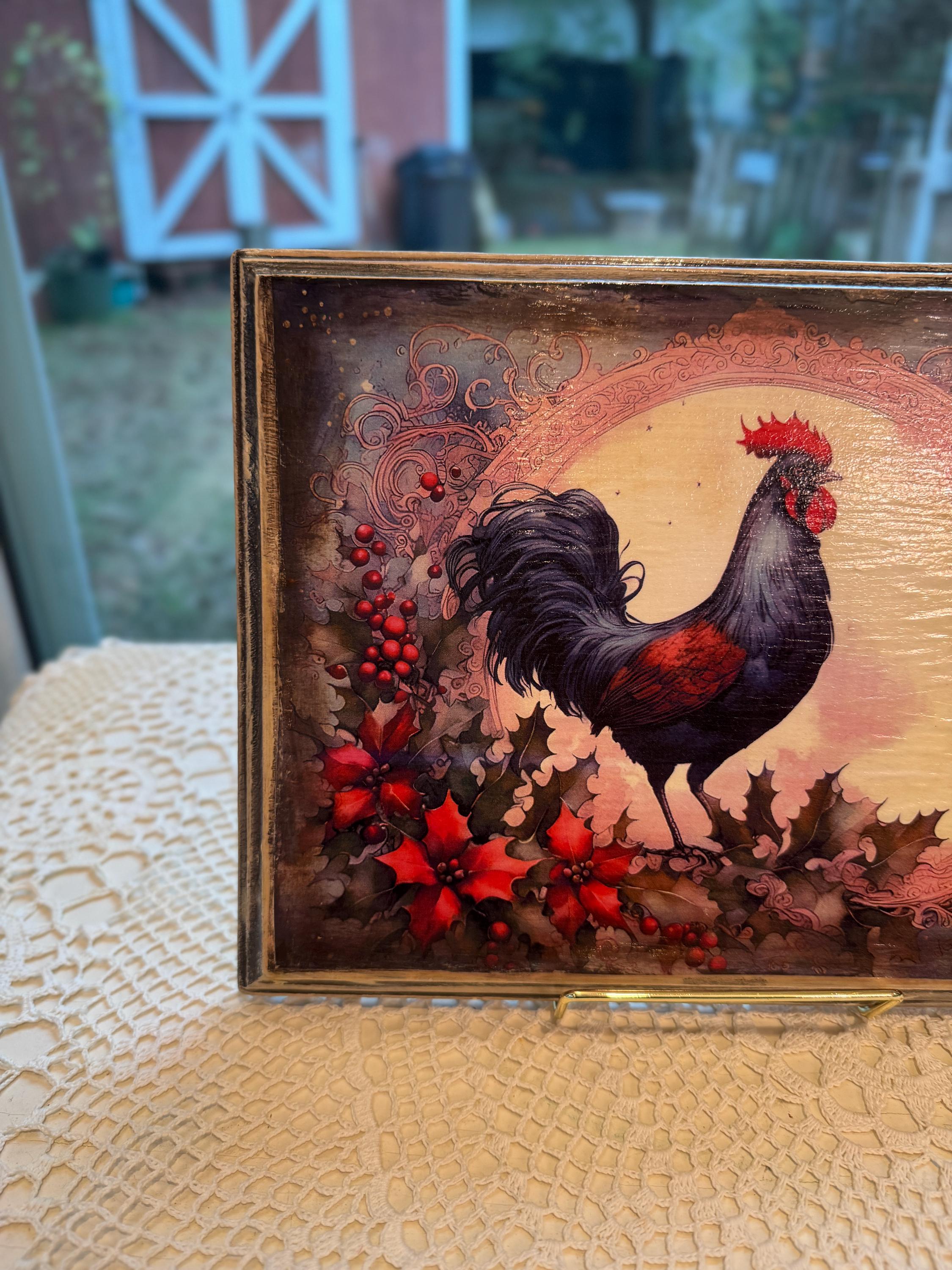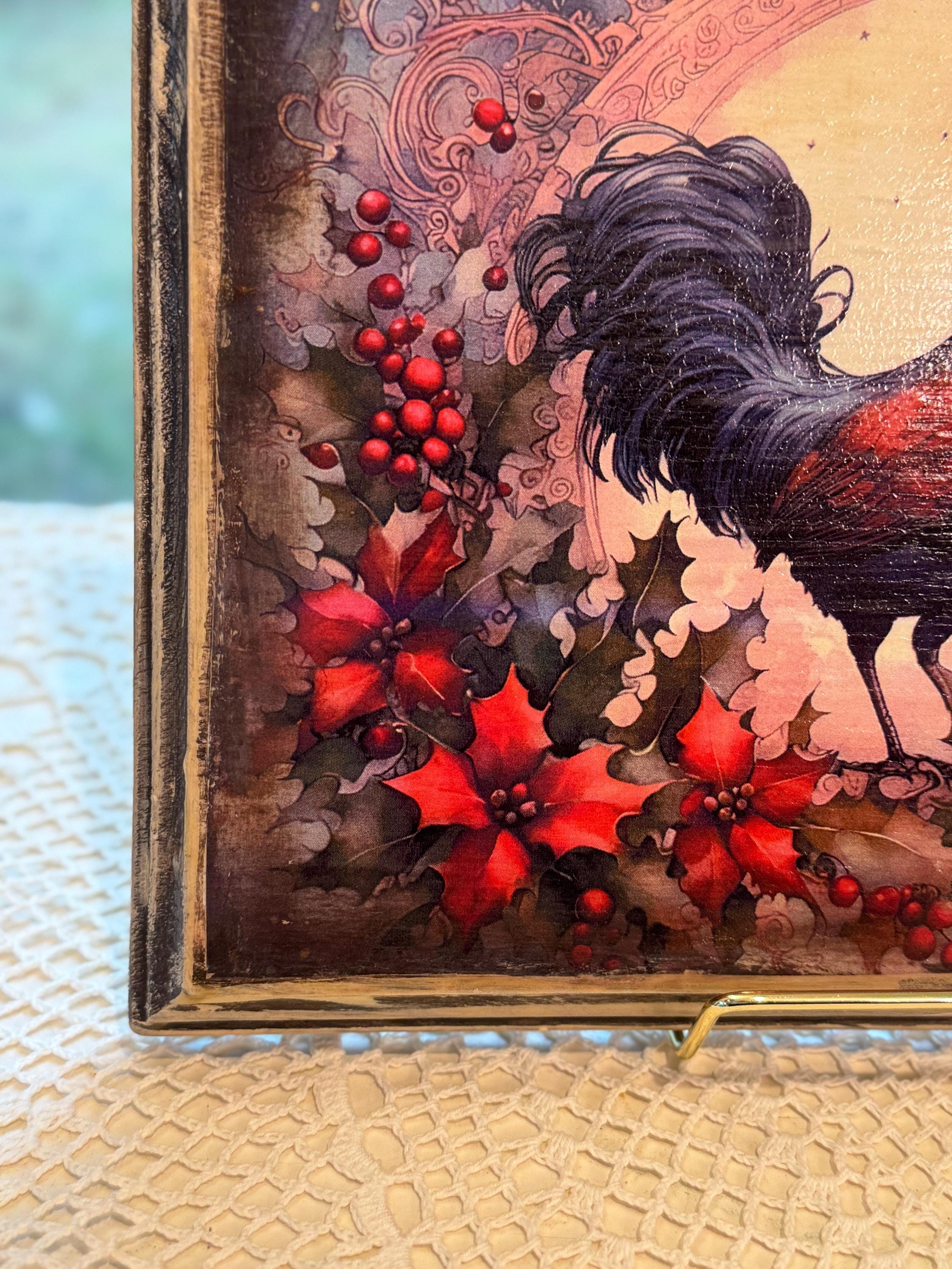 This handcrafted rustic wood plaque is the perfect addition to your holiday decor, blending country charm with festive spirit. The detailed art features a proud rooster adorned with elegant Christmas touches of vibrant red poinsettias and cheerful holly berries. The vintage, distressed look adds a touch of farmhouse style and warmth to any kitchen, living room, or entryway. This handmade decorative piece is ideal for holiday home decor, a thoughtful Christmas gift, or as a unique addition to your rooster collection. Its classic and festive design makes it a treasured part of your seasonal wall art for years to come.