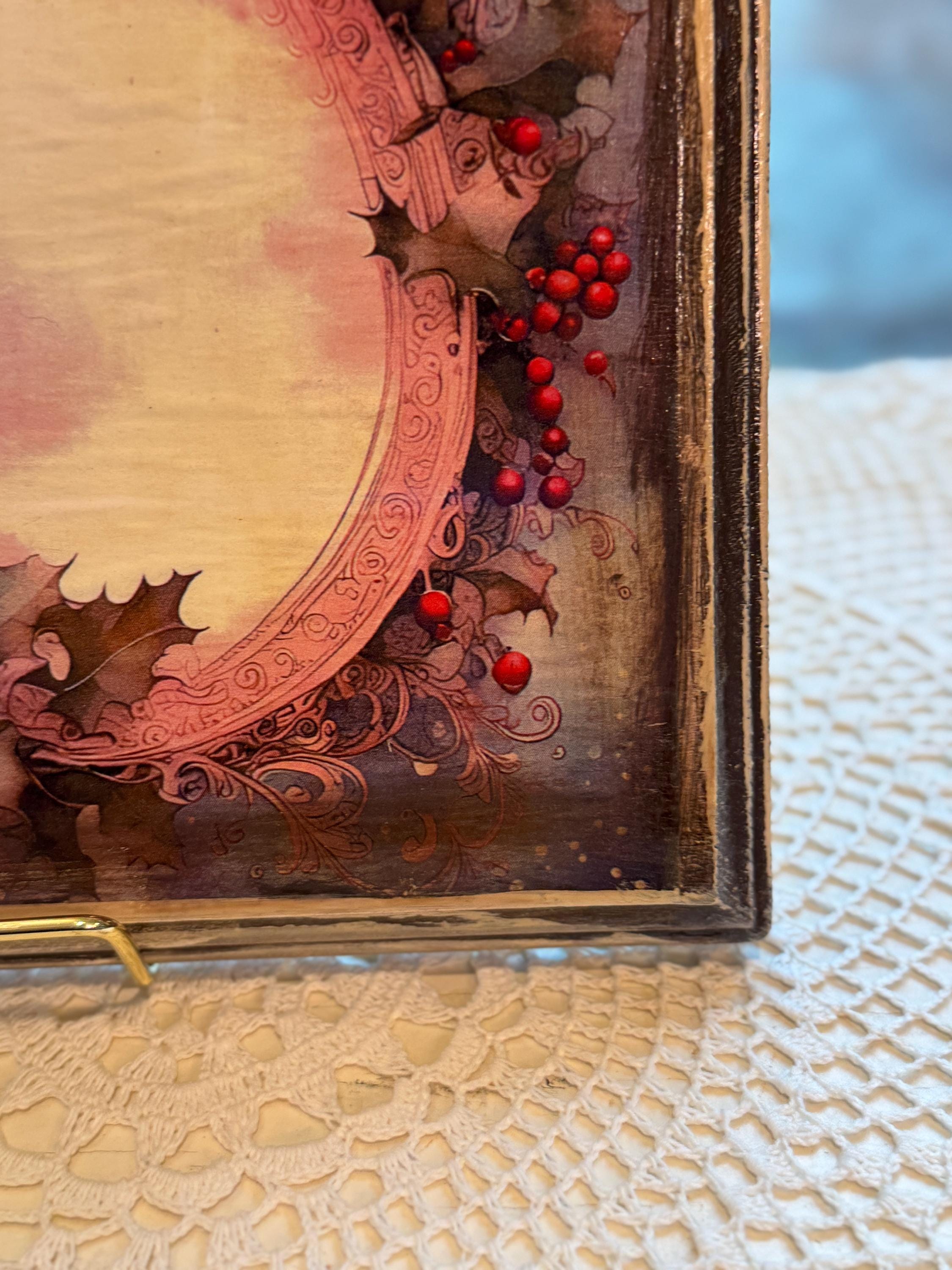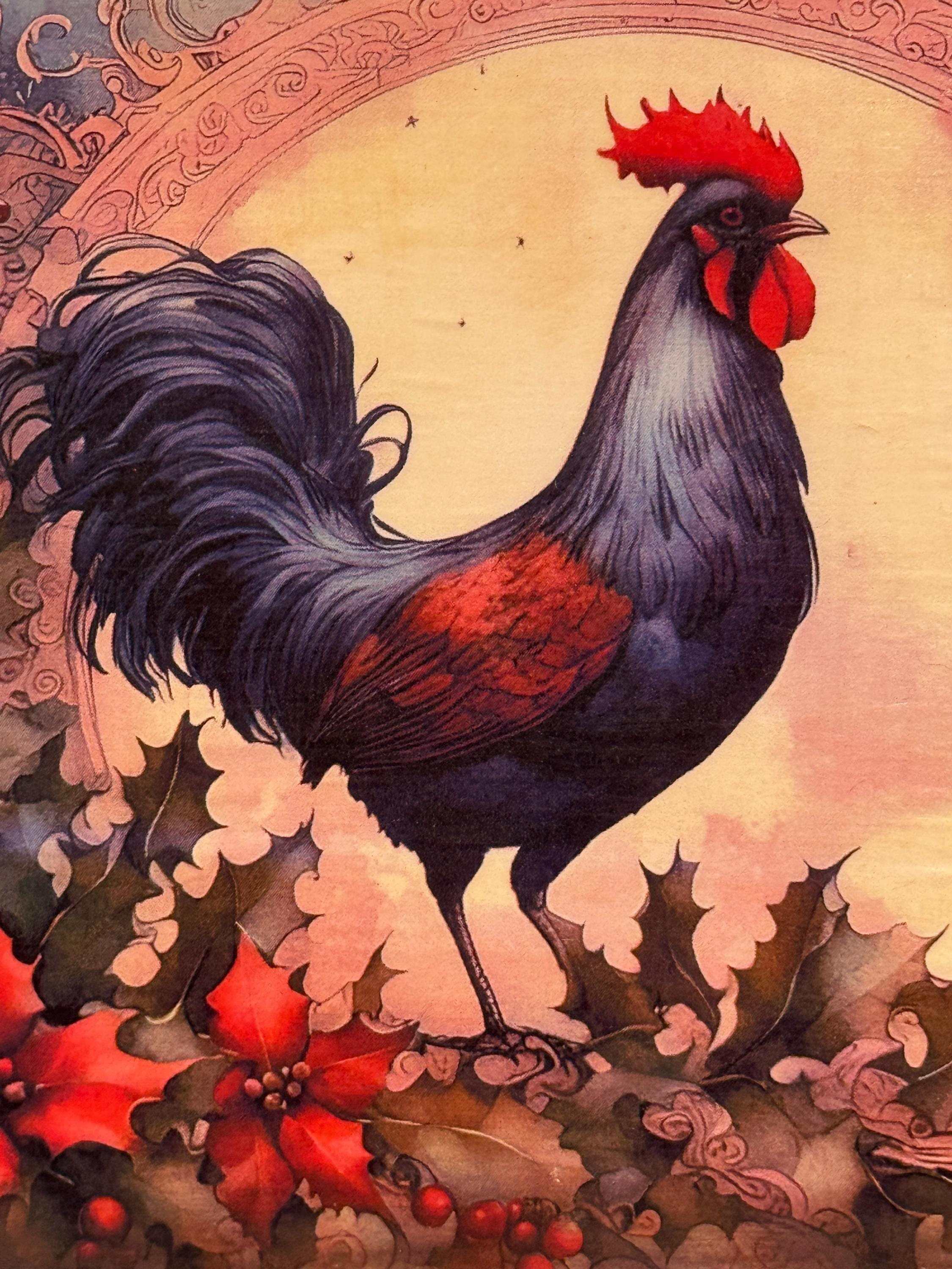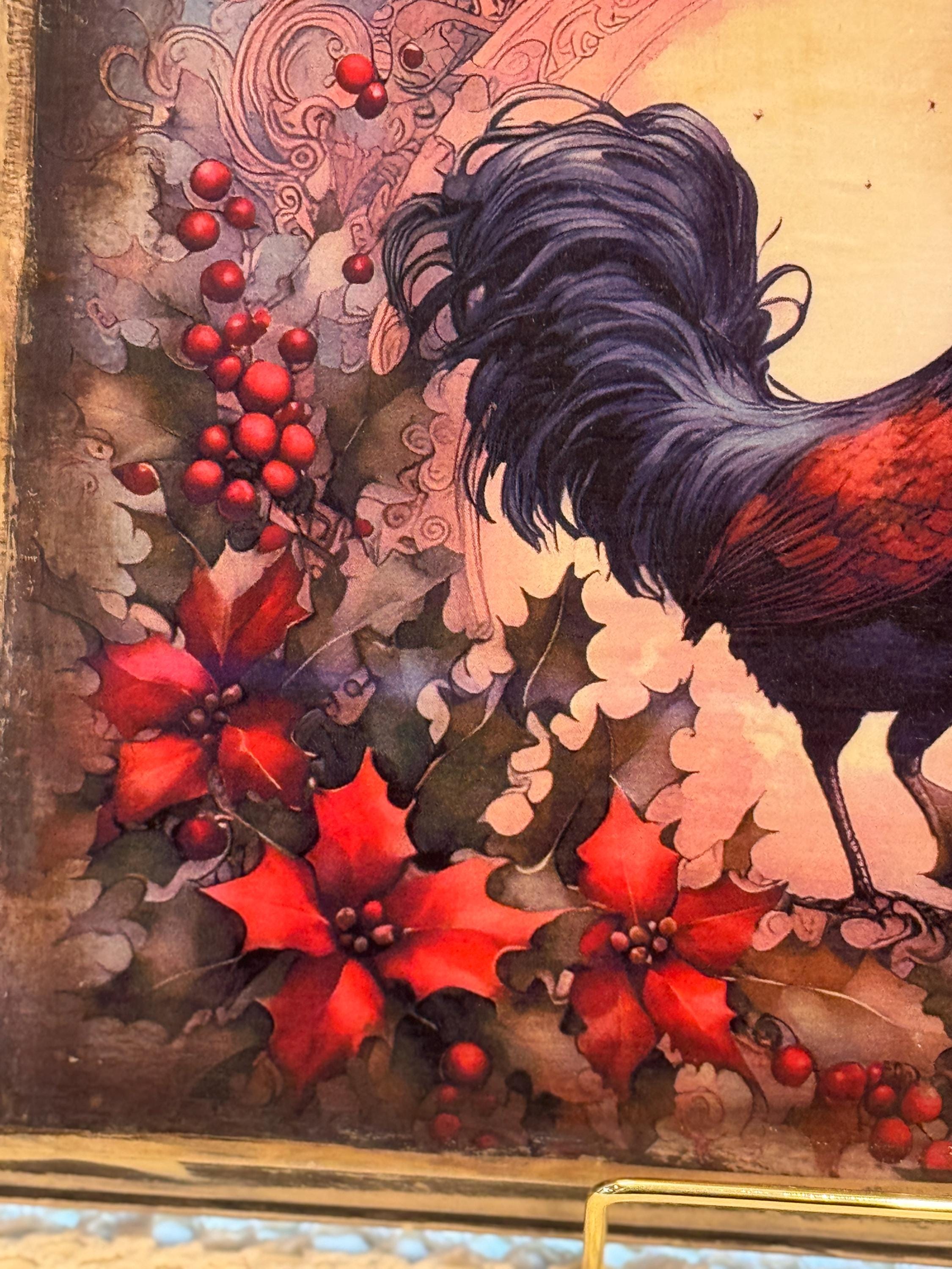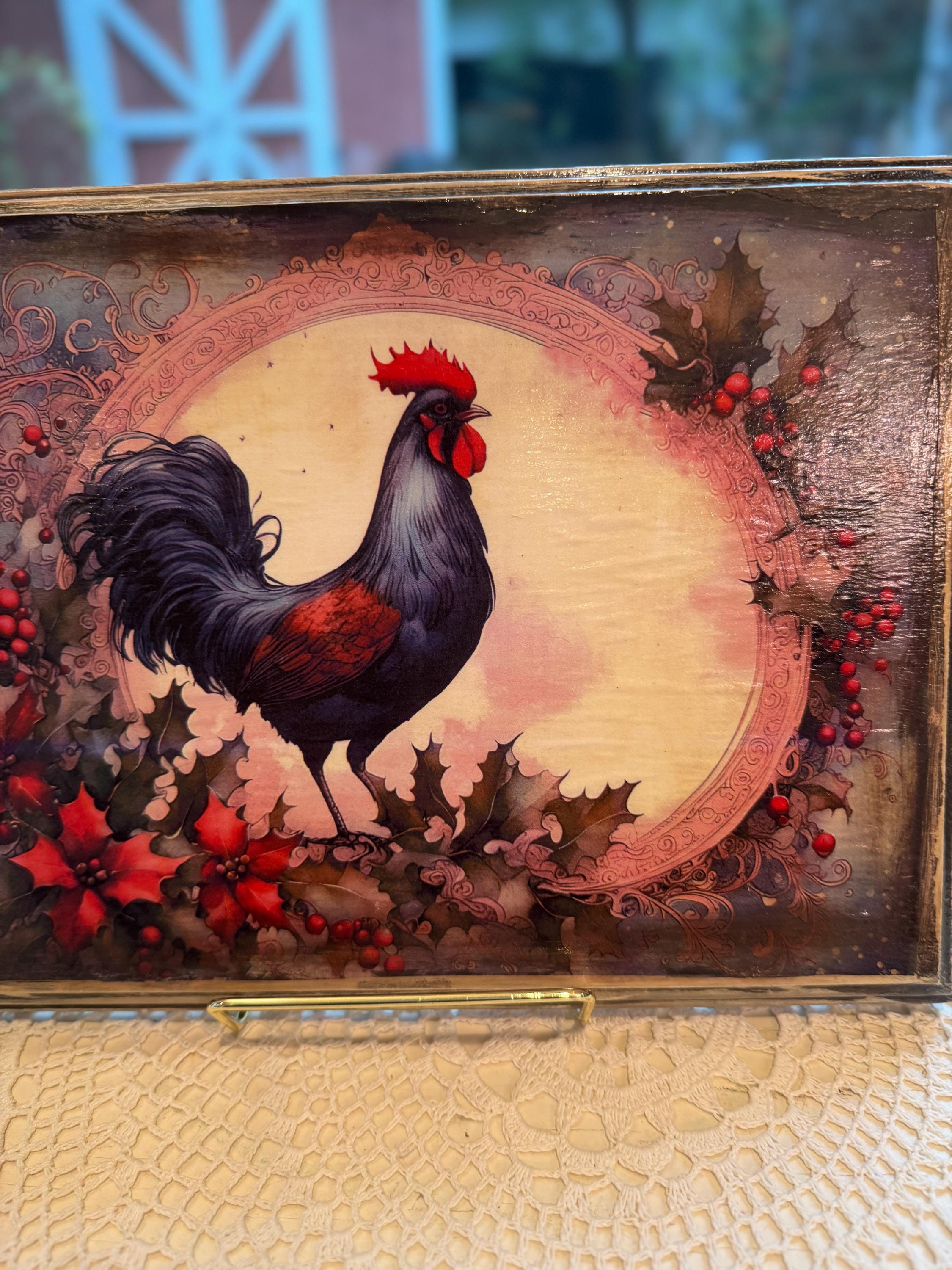 This handcrafted rustic wood plaque is the perfect addition to your holiday decor, blending country charm with festive spirit. The detailed art features a proud rooster adorned with elegant Christmas touches of vibrant red poinsettias and cheerful holly berries. The vintage, distressed look adds a touch of farmhouse style and warmth to any kitchen, living room, or entryway. This handmade decorative piece is ideal for holiday home decor, a thoughtful Christmas gift, or as a unique addition to your rooster collection. Its classic and festive design makes it a treasured part of your seasonal wall art for years to come.