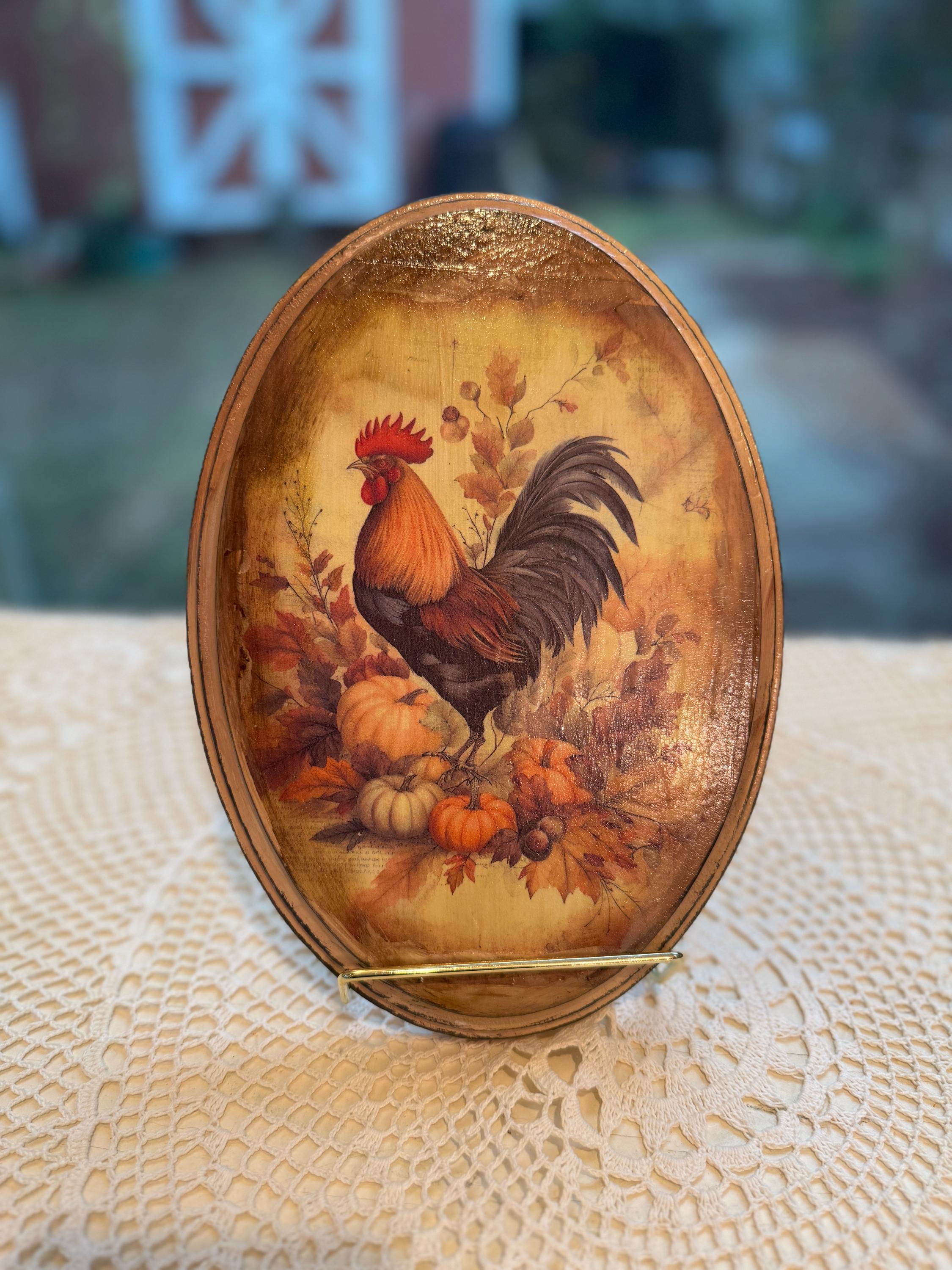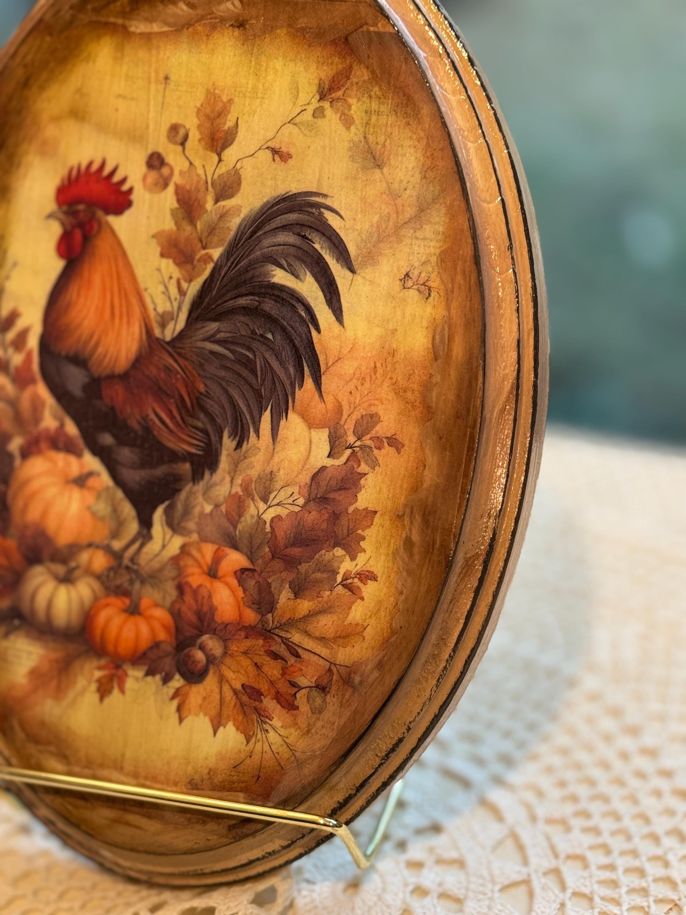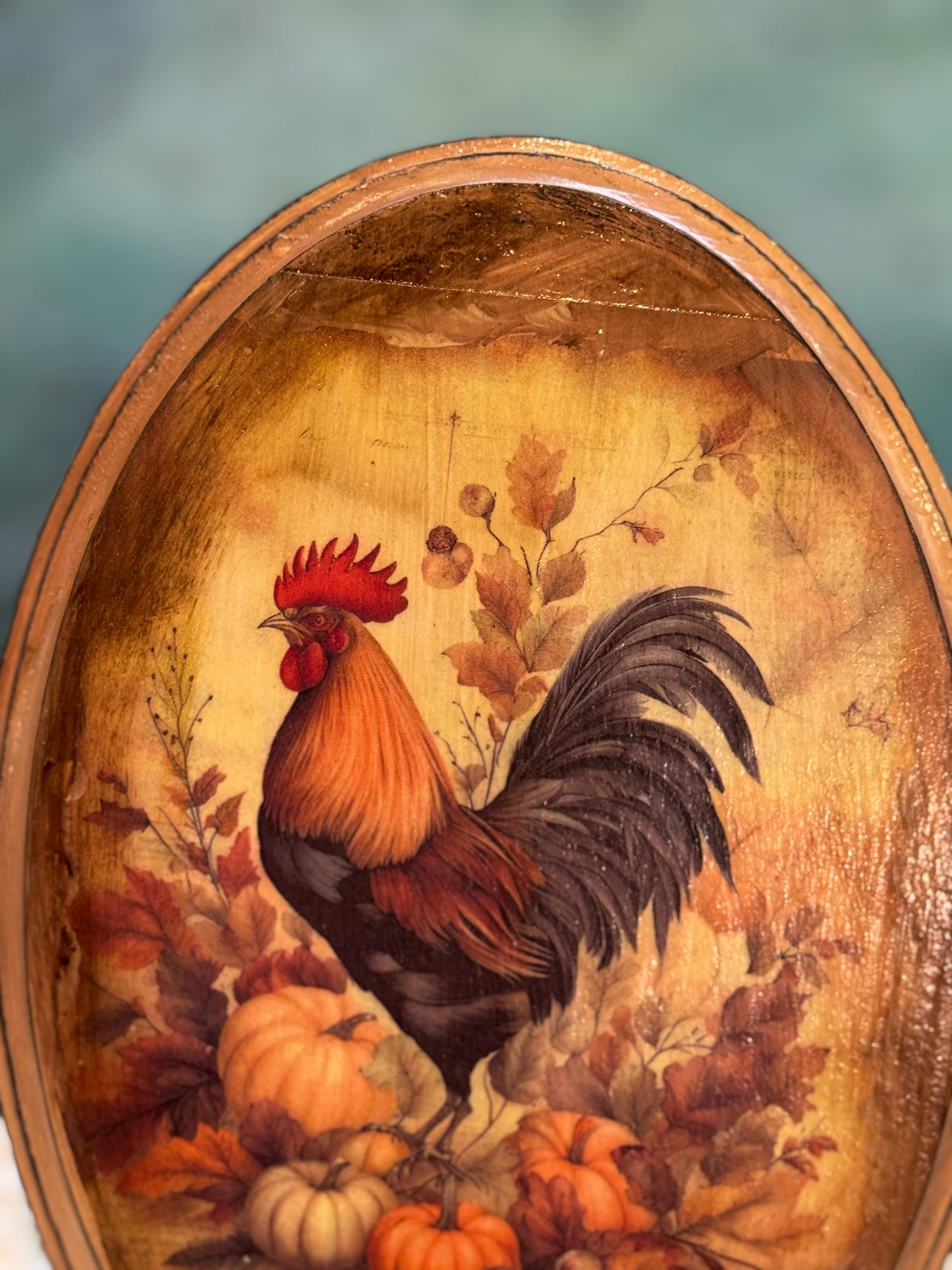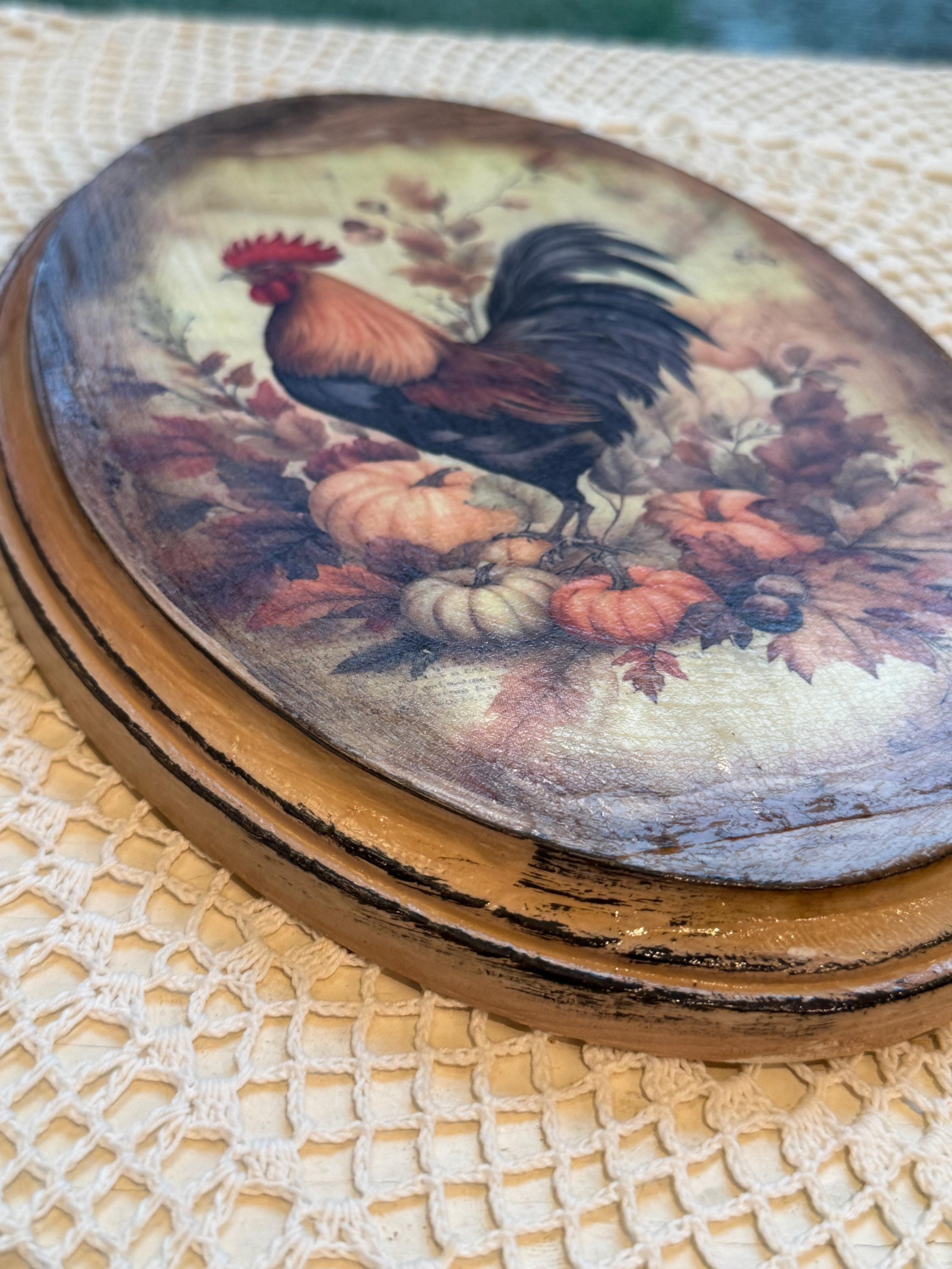 This beautiful rustic oval wood plaque is the perfect accent for your fall home decor. It features a classic rooster surrounded by autumn leaves, pumpkins, and berries, capturing the essence of the harvest season. The design has a vintage farmhouse feel, making it a charming addition to any country-style kitchen, living room, or entryway. Crafted with care, this wooden wall art piece is a wonderful way to add seasonal charm to your home. It's also an ideal hostess gift or a lovely way to enhance your existing rooster collection. This handmade piece of autumn decor will be a treasured part of your Thanksgiving decorations for years to come.
