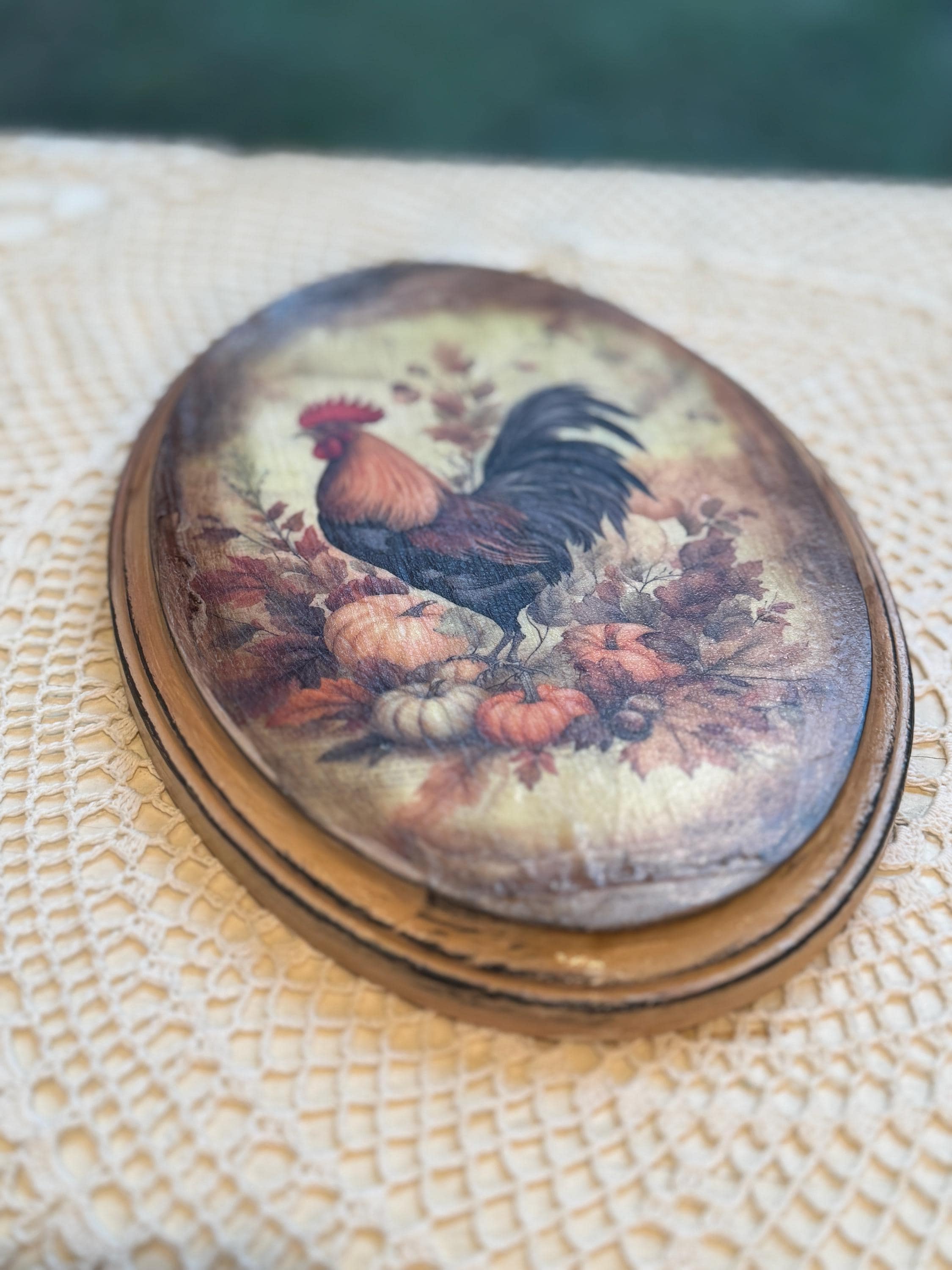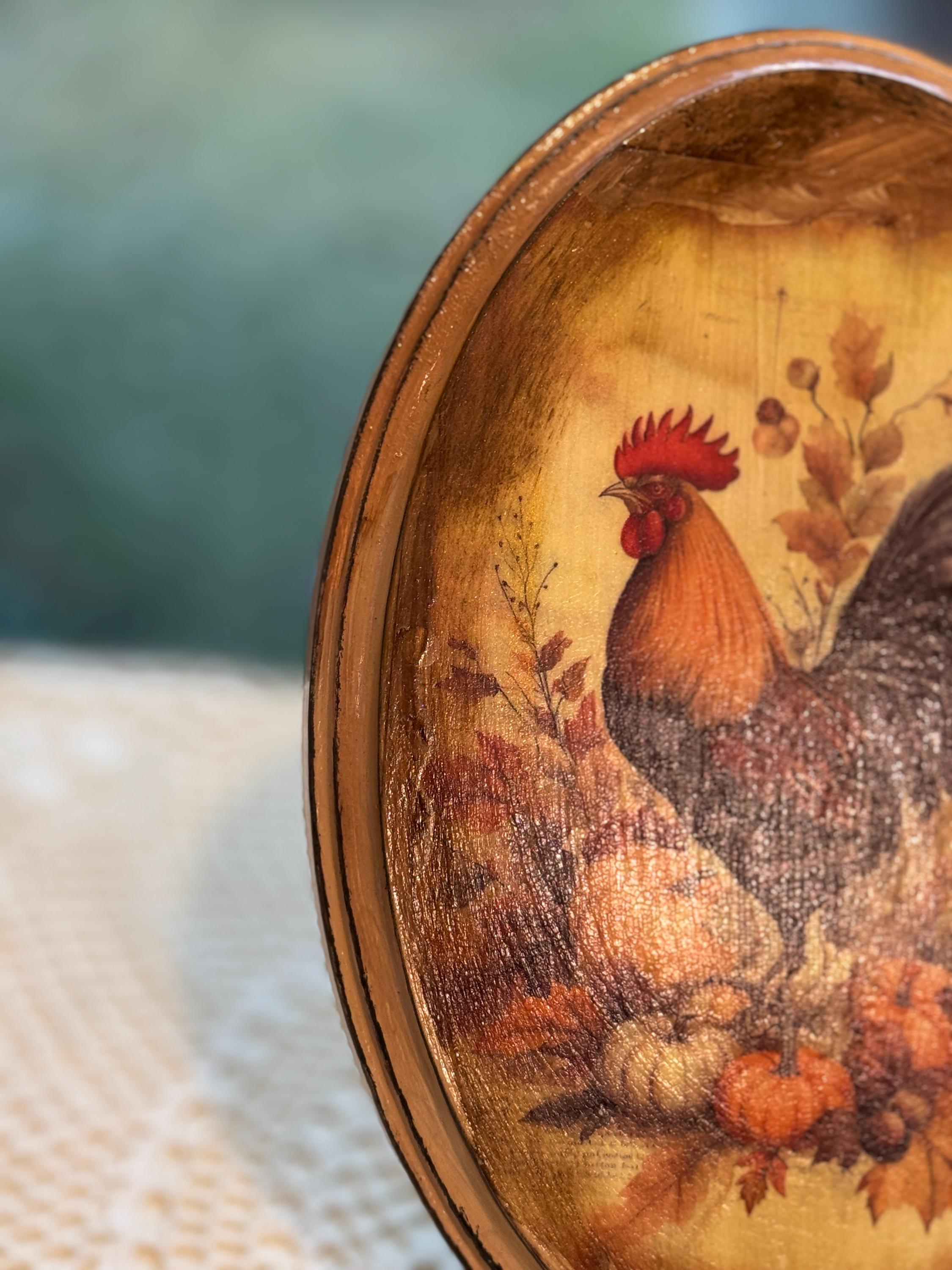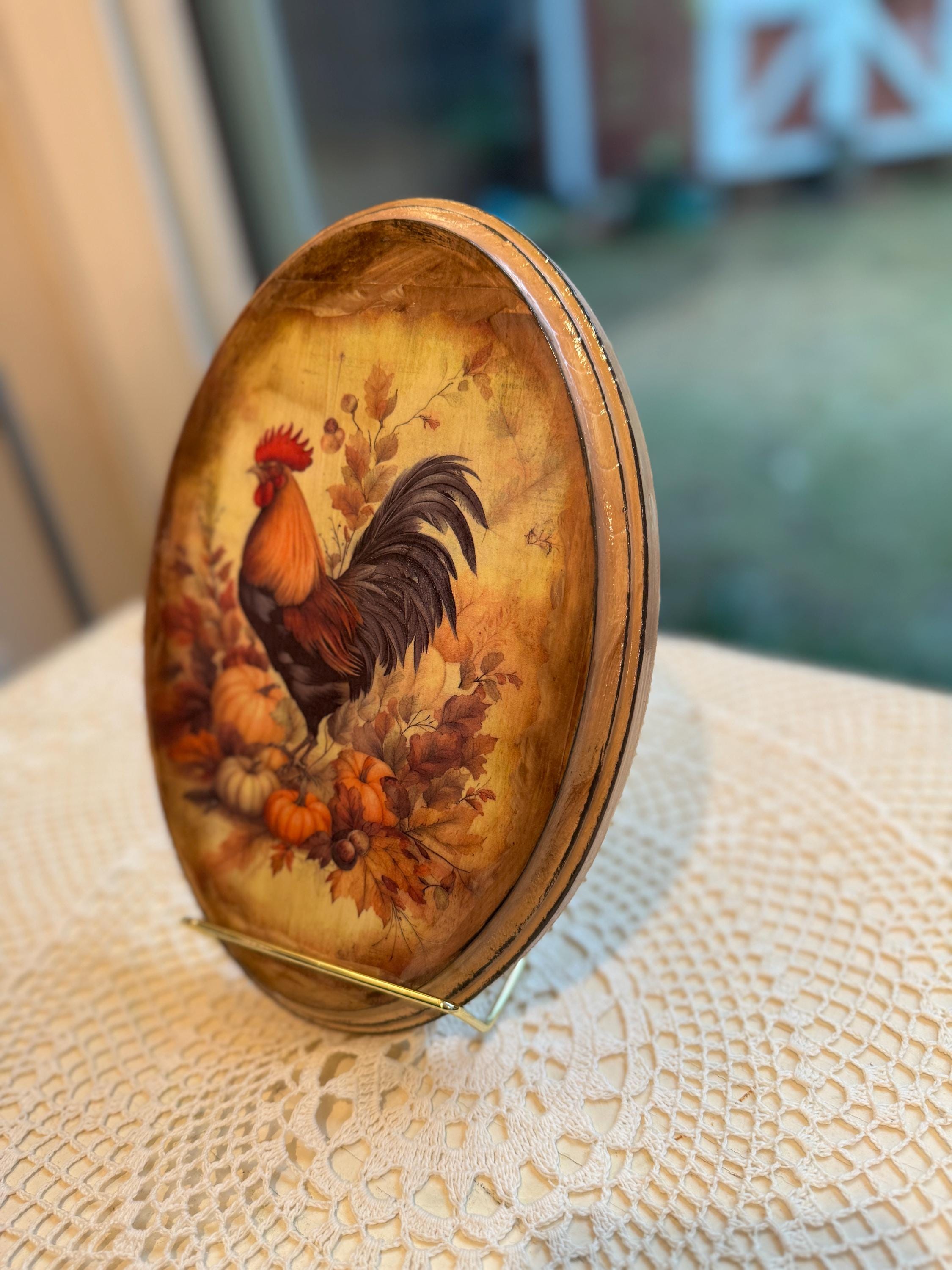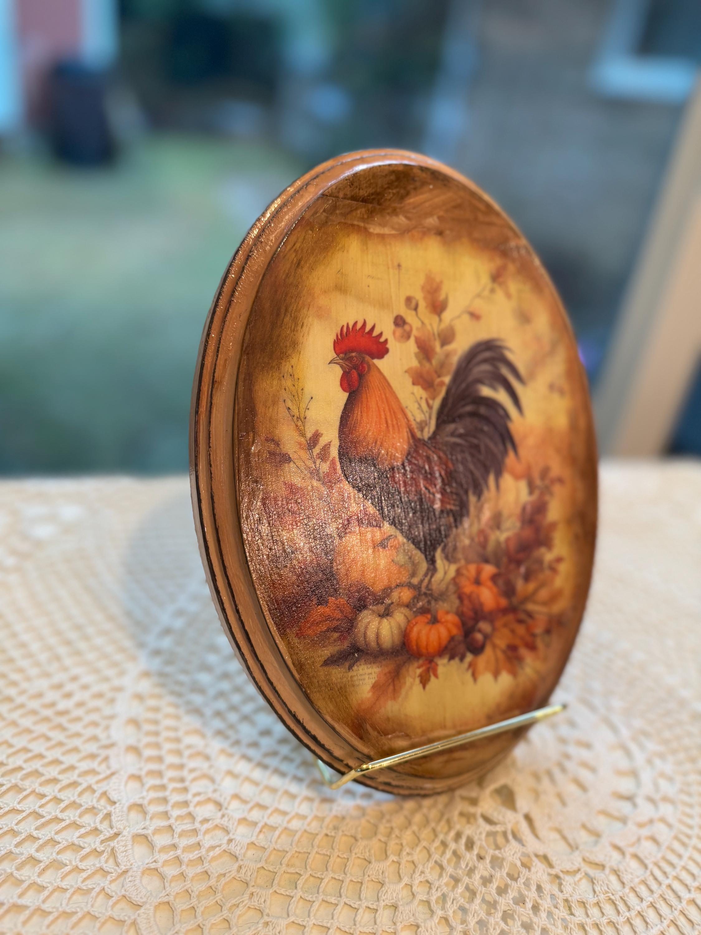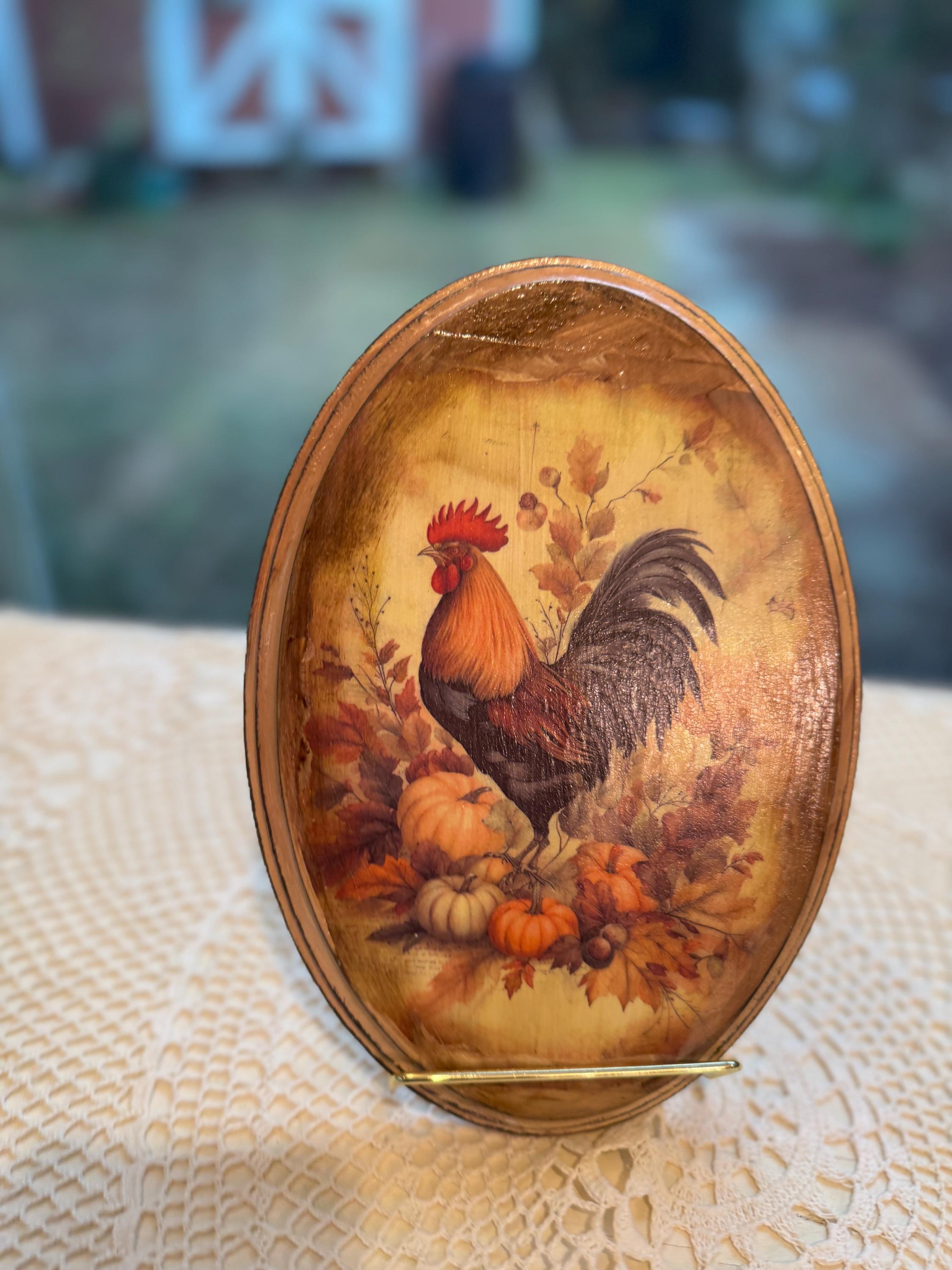 This beautiful rustic oval wood plaque is the perfect accent for your fall home decor. It features a classic rooster surrounded by autumn leaves, pumpkins, and berries, capturing the essence of the harvest season. The design has a vintage farmhouse feel, making it a charming addition to any country-style kitchen, living room, or entryway. Crafted with care, this wooden wall art piece is a wonderful way to add seasonal charm to your home. It's also an ideal hostess gift or a lovely way to enhance your existing rooster collection. This handmade piece of autumn decor will be a treasured part of your Thanksgiving decorations for years to come.