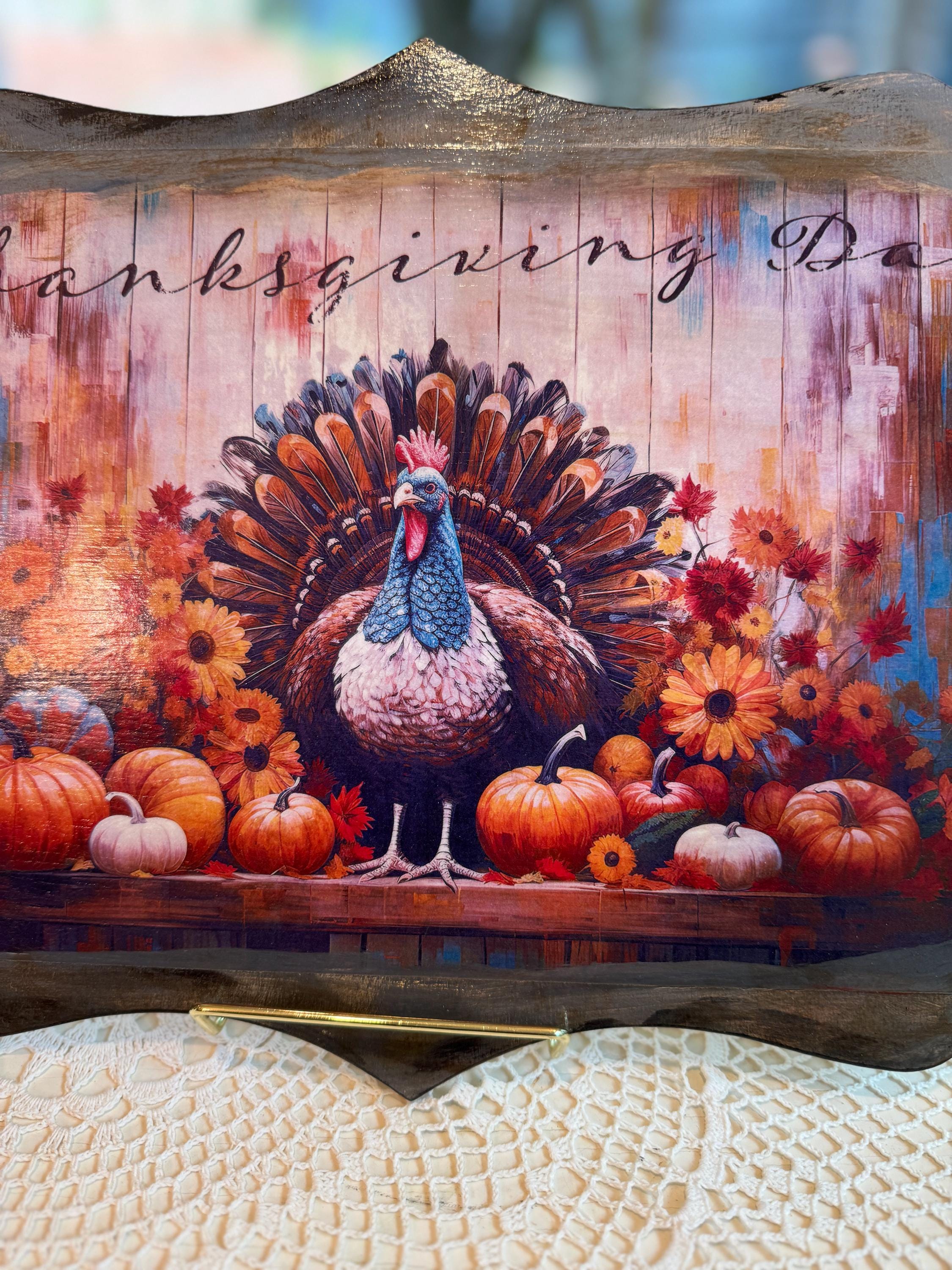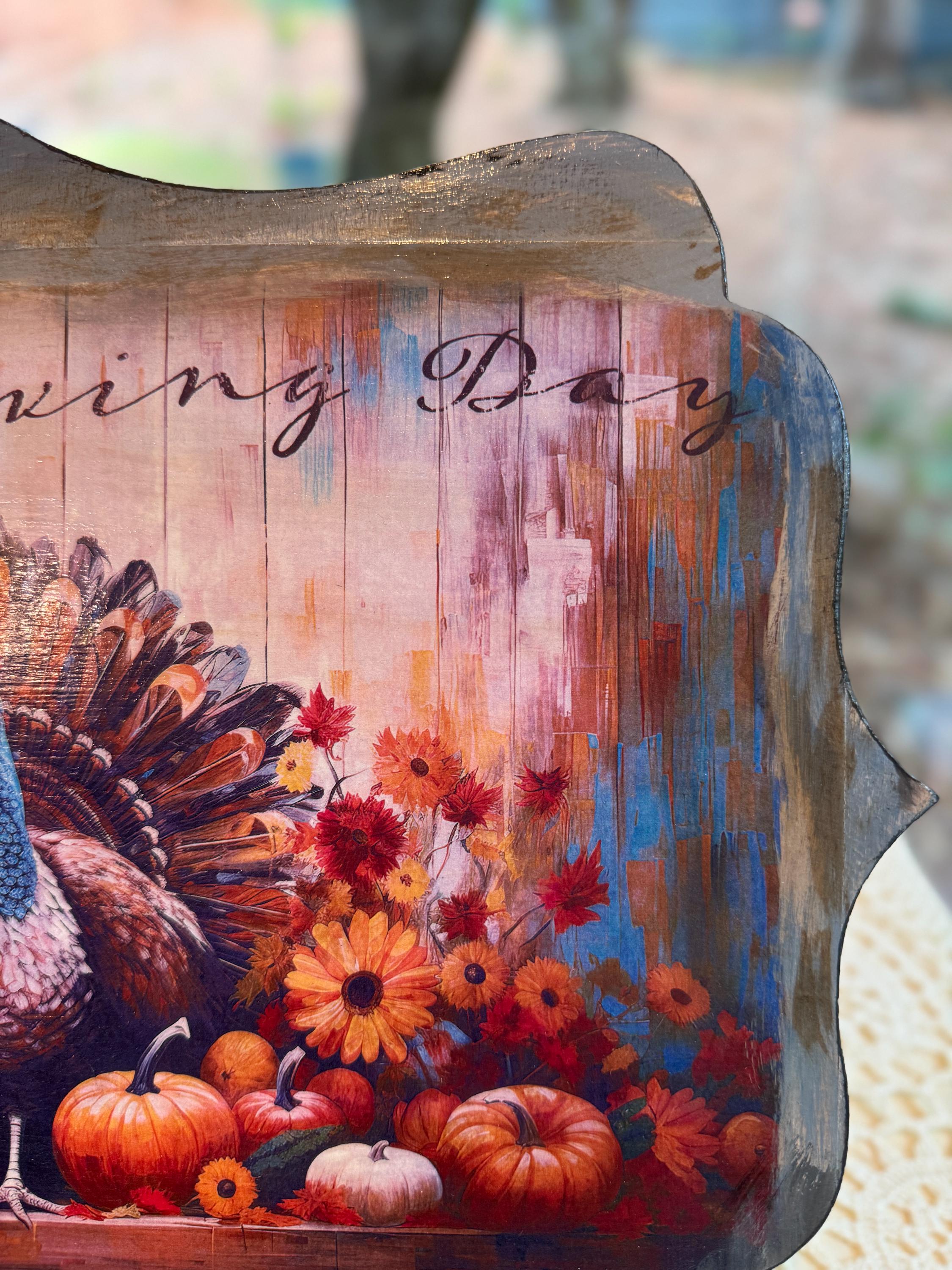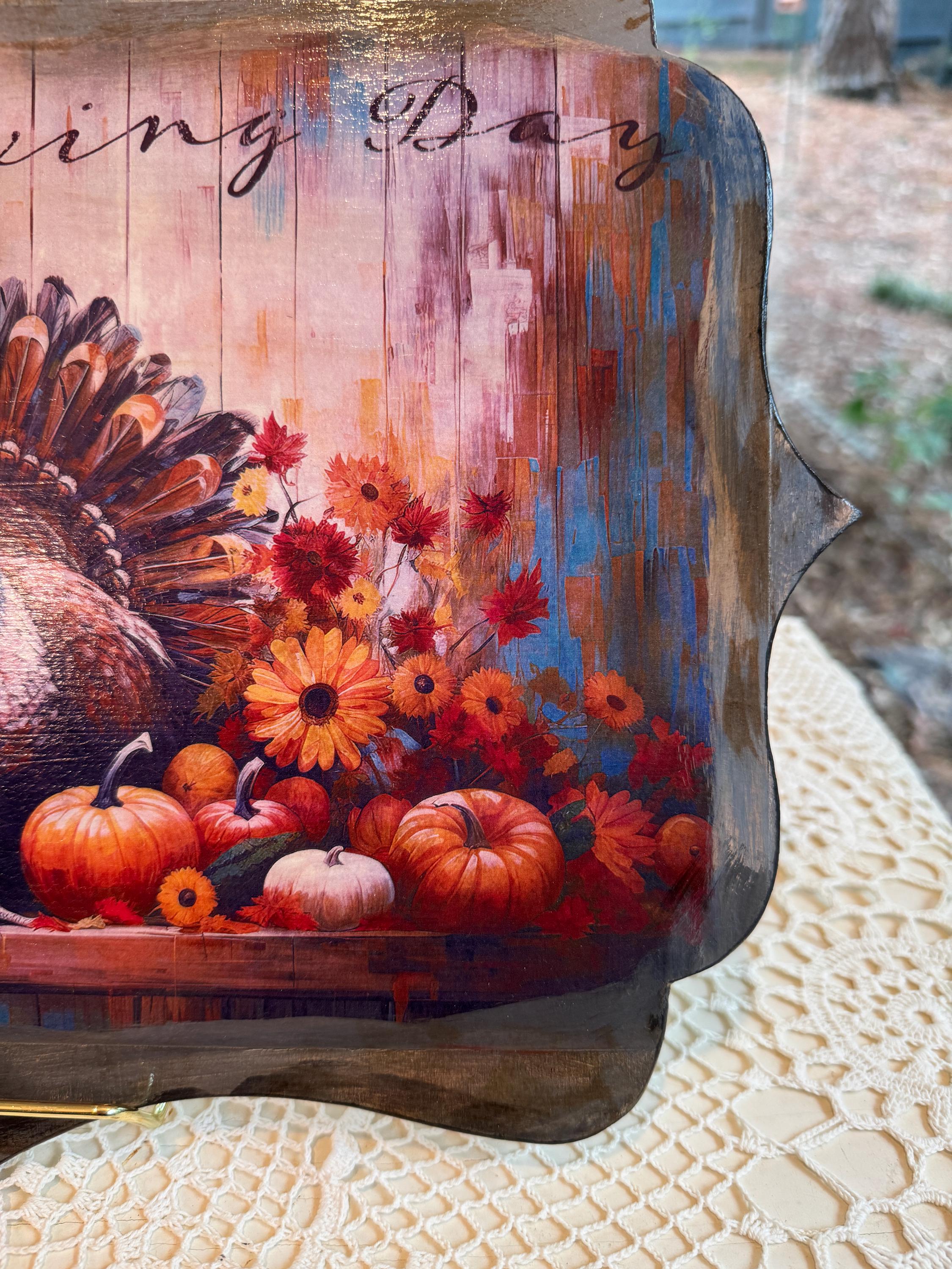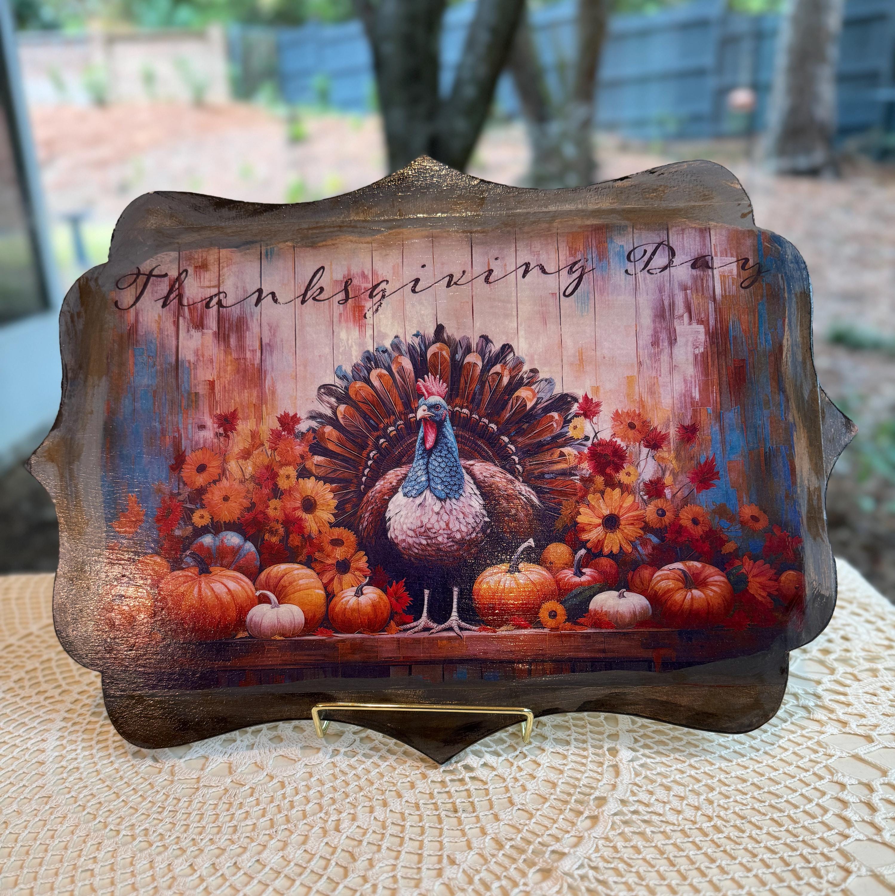 Celebrate the season of gratitude with this beautiful rustic wood plaque. The decorative art features a majestic Thanksgiving turkey with its feathers spread, surrounded by vibrant pumpkins and colorful autumn flowers. The design has a distressed, farmhouse-style aesthetic, with "Thanksgiving Day" written in an elegant script. This fall harvest sign is perfect for adding seasonal charm to any room in your home, from the kitchen to the entryway. It serves as a wonderful piece of holiday decor and makes a thoughtful hostess gift. This vintage-inspired wall hanging is an excellent choice for anyone who loves country decor and wants to bring the spirit of autumn indoors.