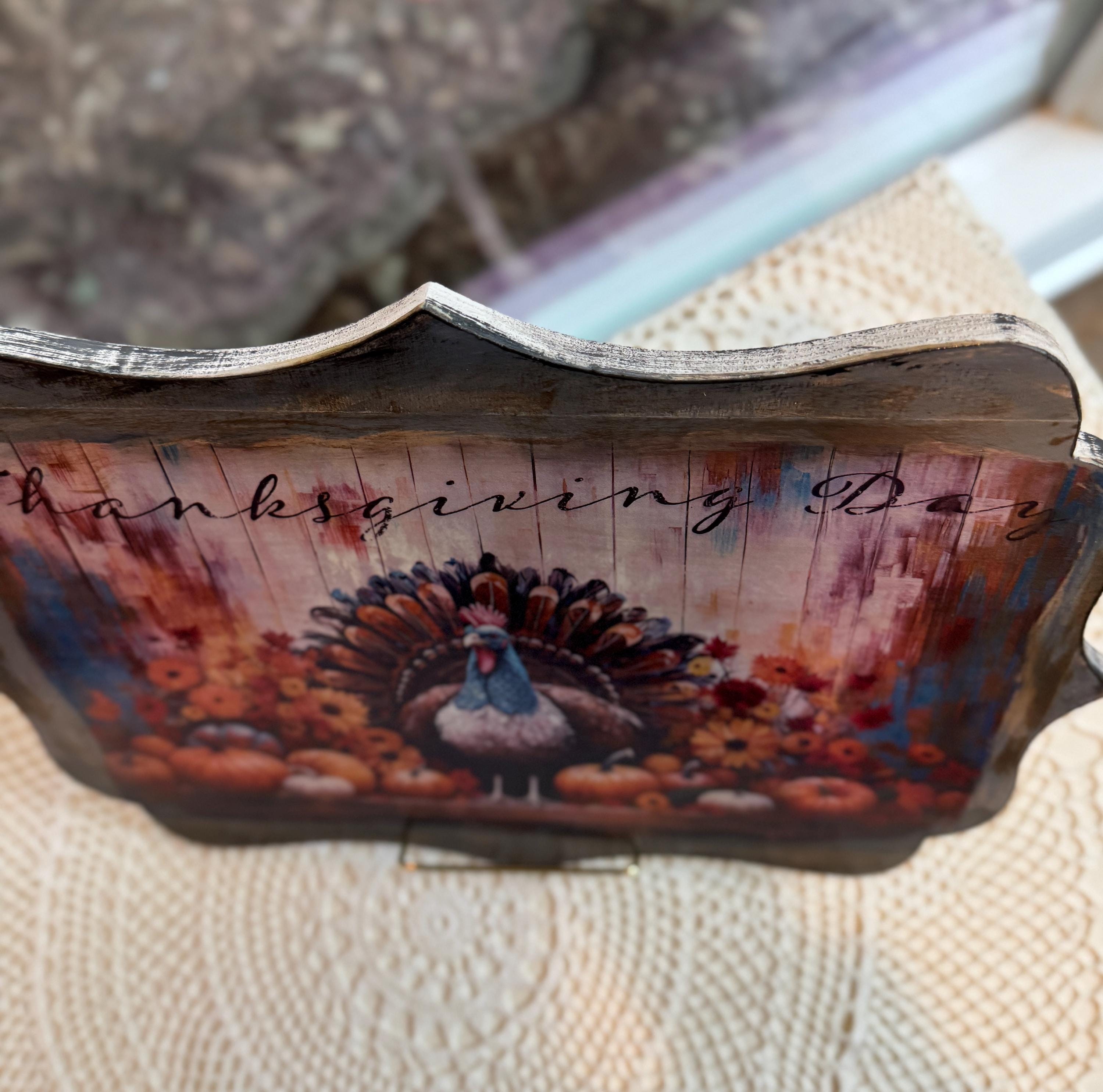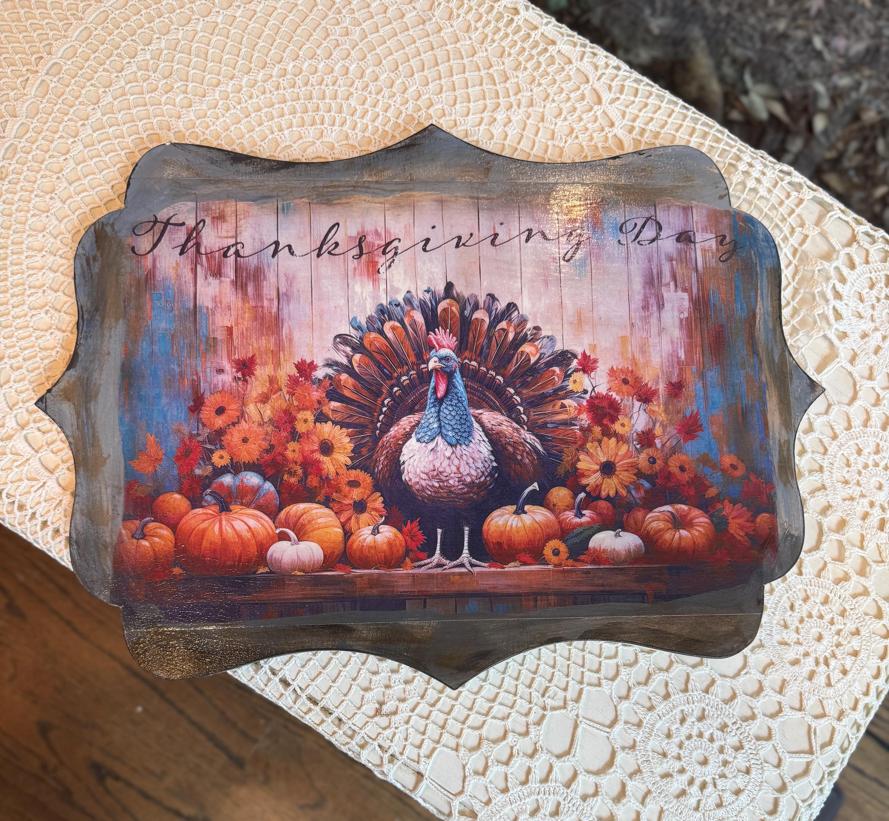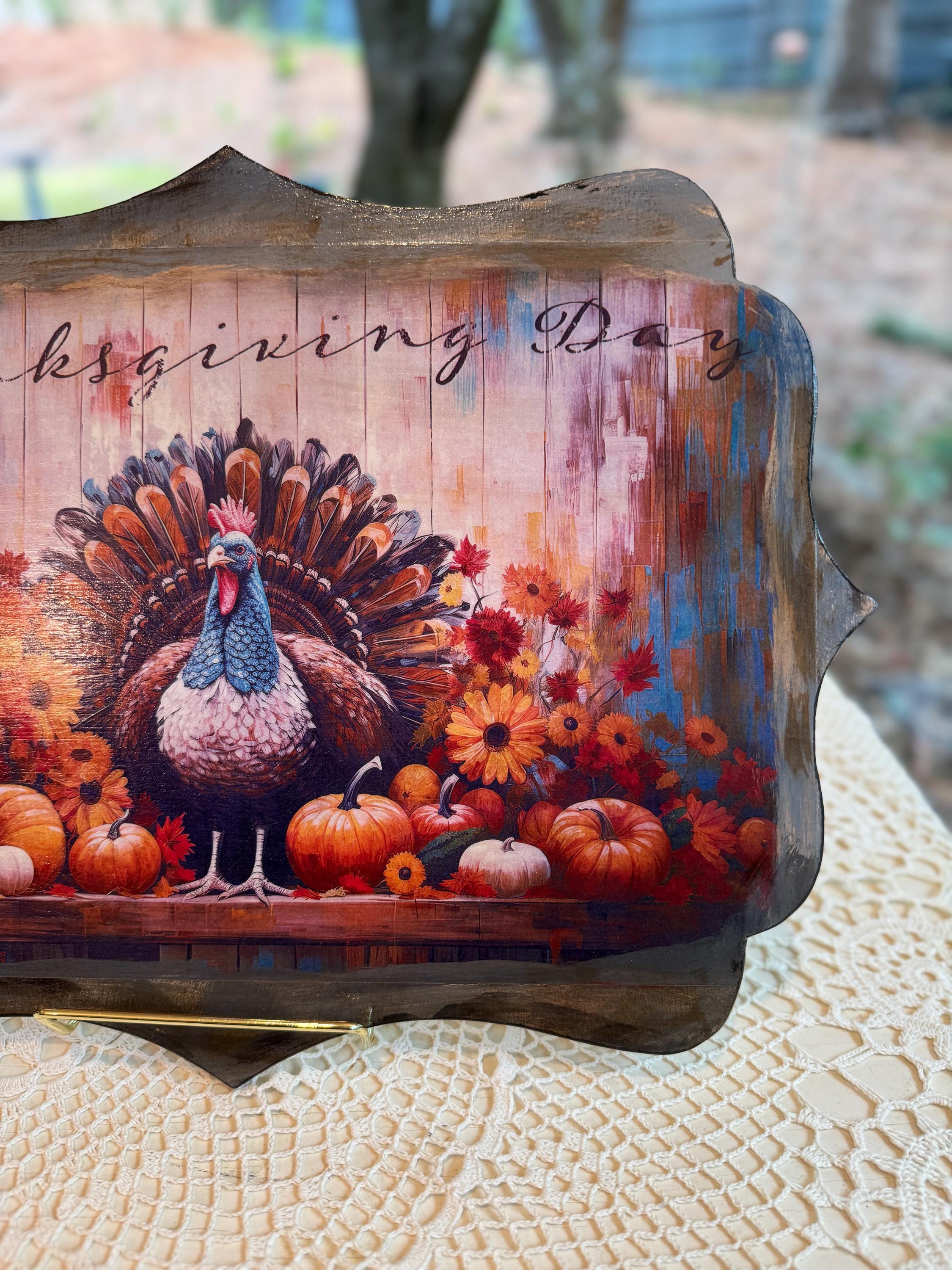 Celebrate the season of gratitude with this beautiful rustic wood plaque. The decorative art features a majestic Thanksgiving turkey with its feathers spread, surrounded by vibrant pumpkins and colorful autumn flowers. The design has a distressed, farmhouse-style aesthetic, with "Thanksgiving Day" written in an elegant script. This fall harvest sign is perfect for adding seasonal charm to any room in your home, from the kitchen to the entryway. It serves as a wonderful piece of holiday decor and makes a thoughtful hostess gift. This vintage-inspired wall hanging is an excellent choice for anyone who loves country decor and wants to bring the spirit of autumn indoors.