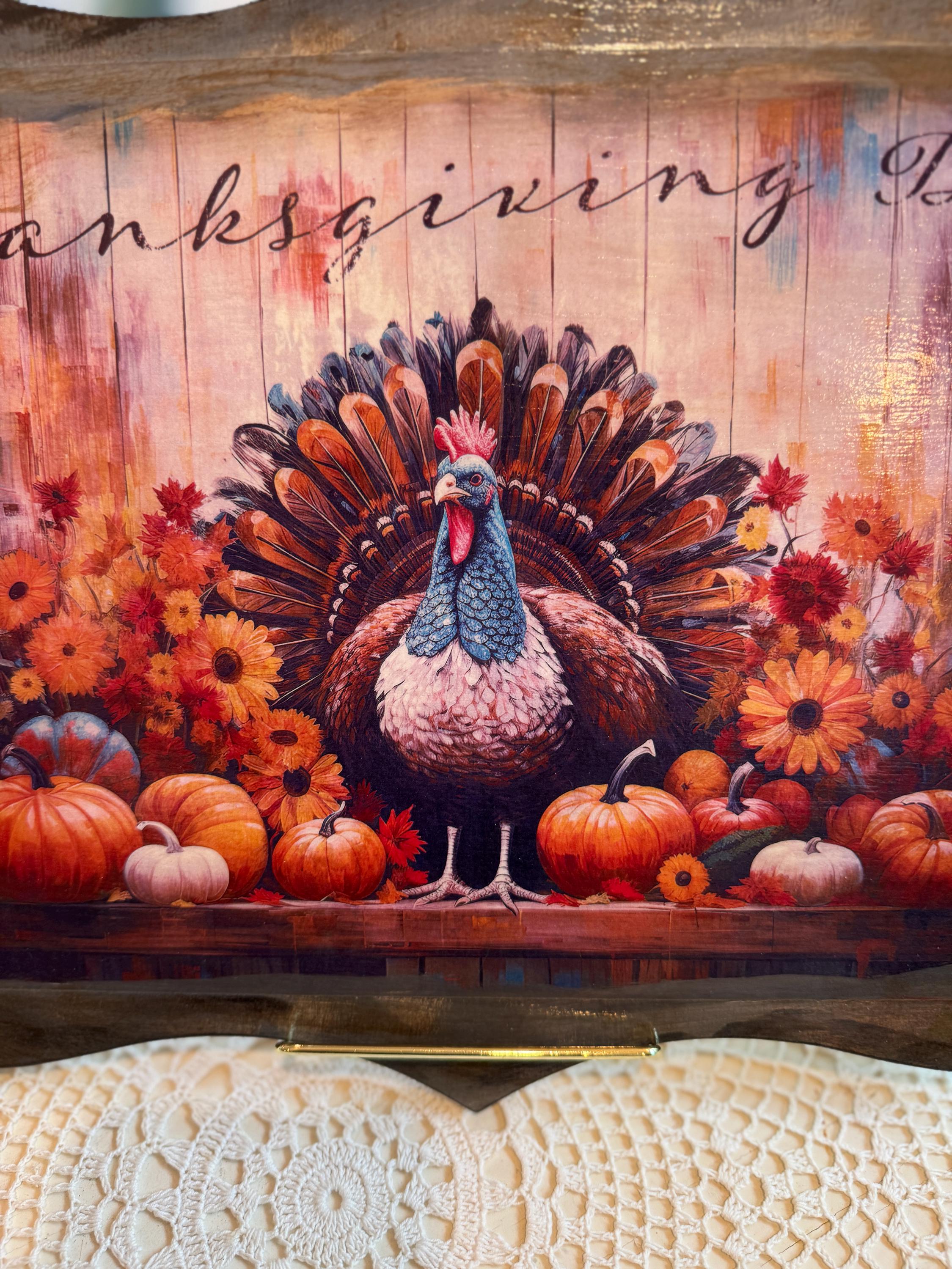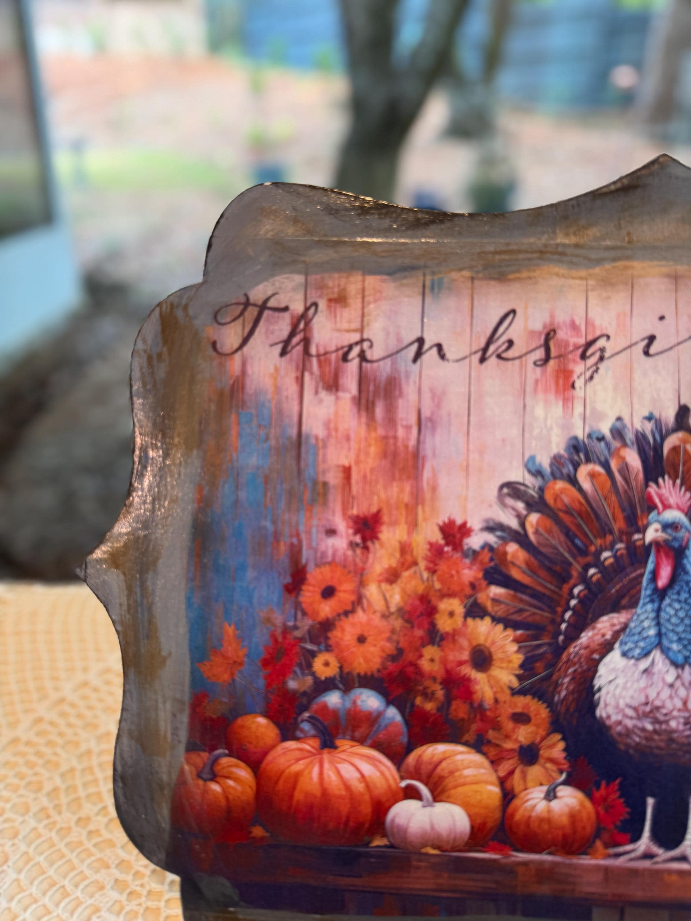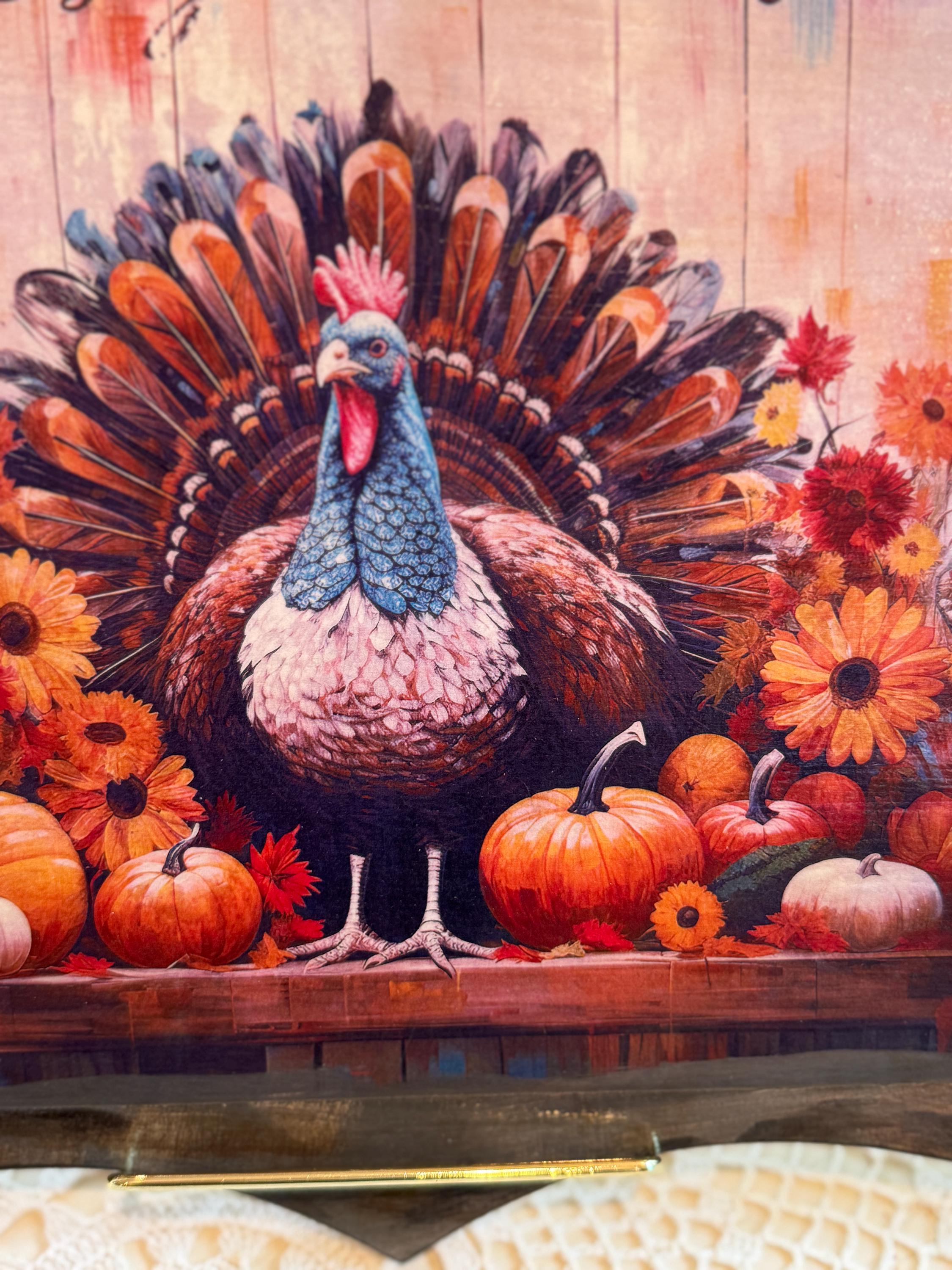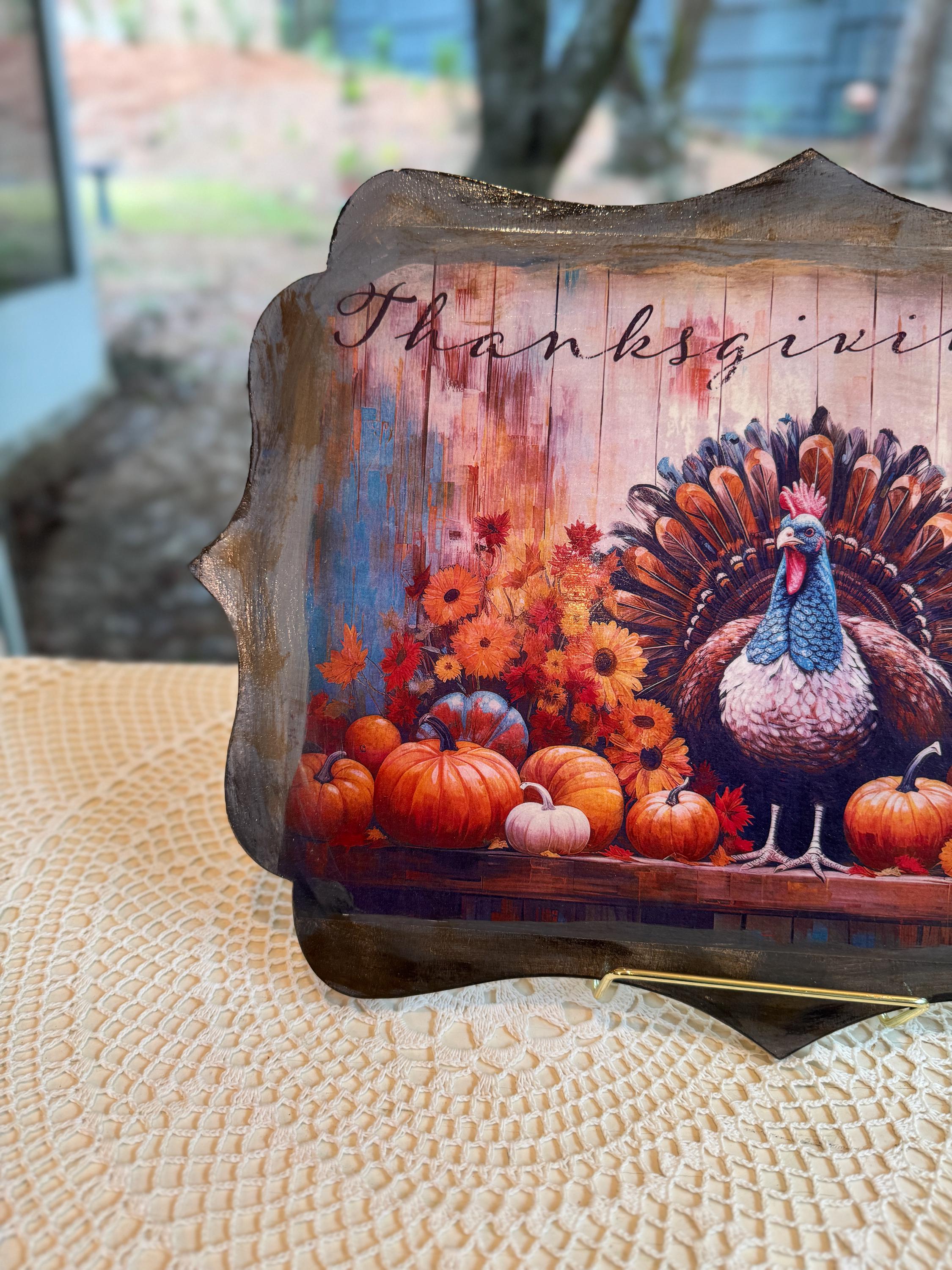Celebrate the season of gratitude with this beautiful rustic wood plaque. The decorative art features a majestic Thanksgiving turkey with its feathers spread, surrounded by vibrant pumpkins and colorful autumn flowers. The design has a distressed, farmhouse-style aesthetic, with "Thanksgiving Day" written in an elegant script. This fall harvest sign is perfect for adding seasonal charm to any room in your home, from the kitchen to the entryway. It serves as a wonderful piece of holiday decor and makes a thoughtful hostess gift. This vintage-inspired wall hanging is an excellent choice for anyone who loves country decor and wants to bring the spirit of autumn indoors.