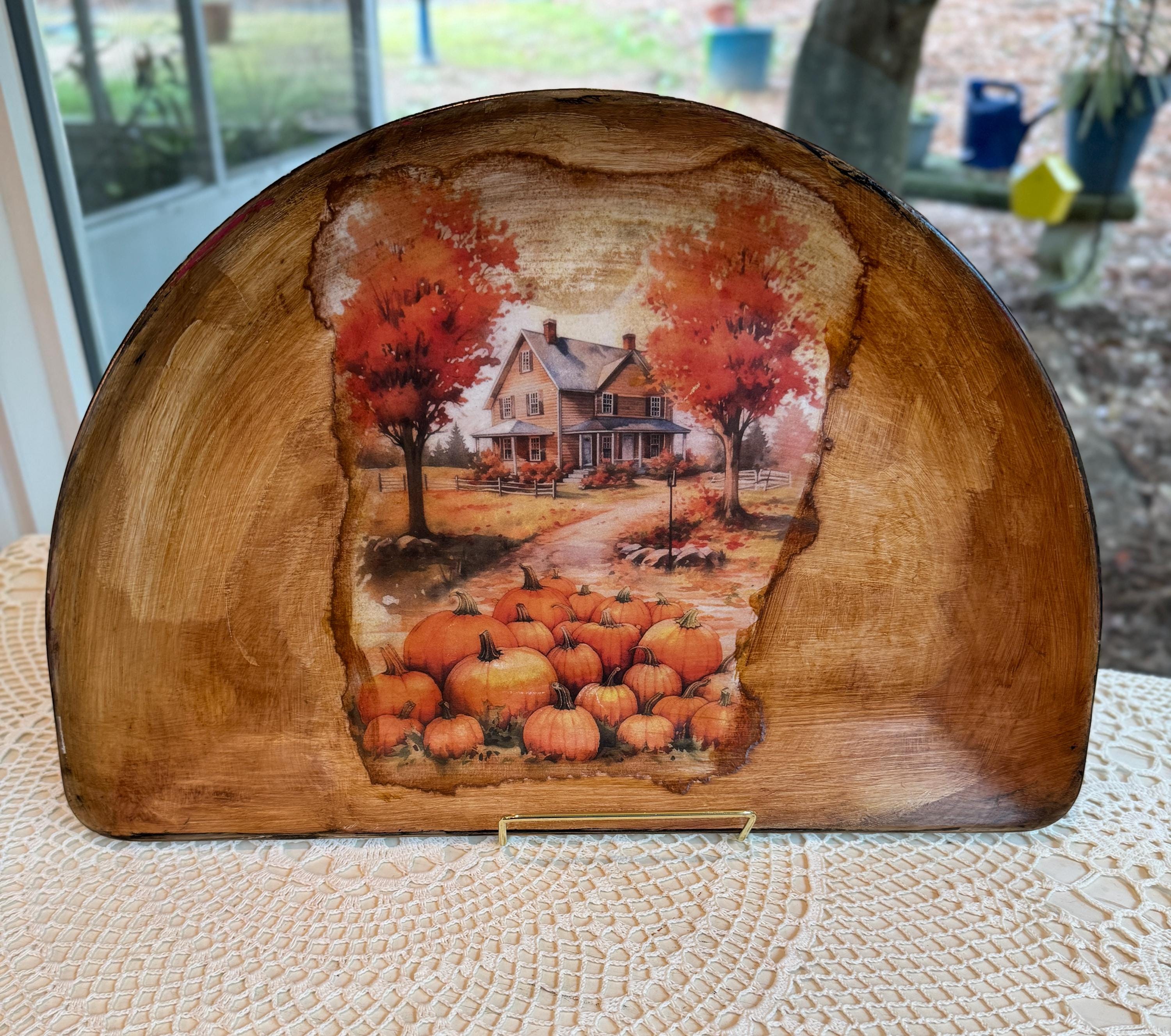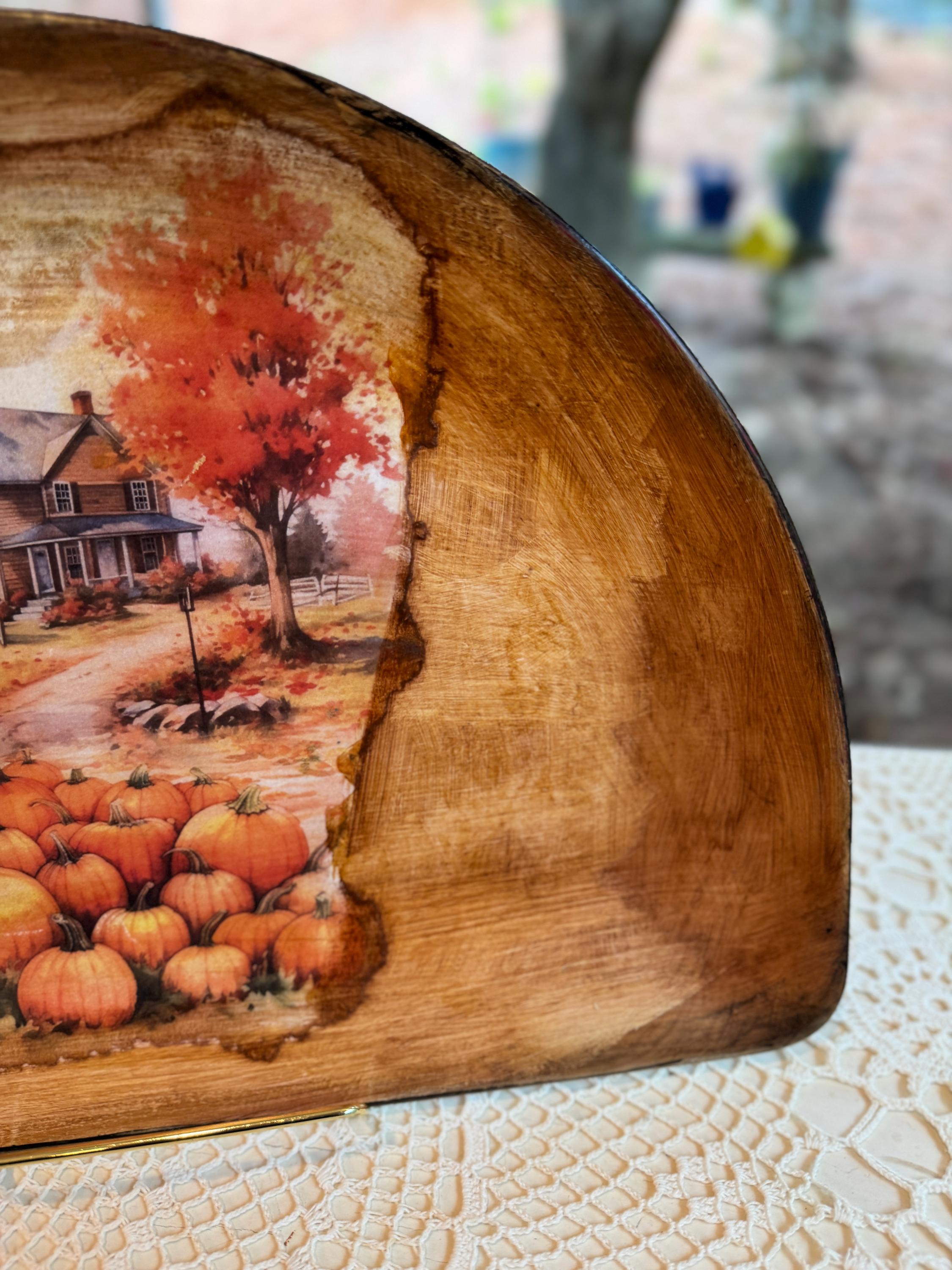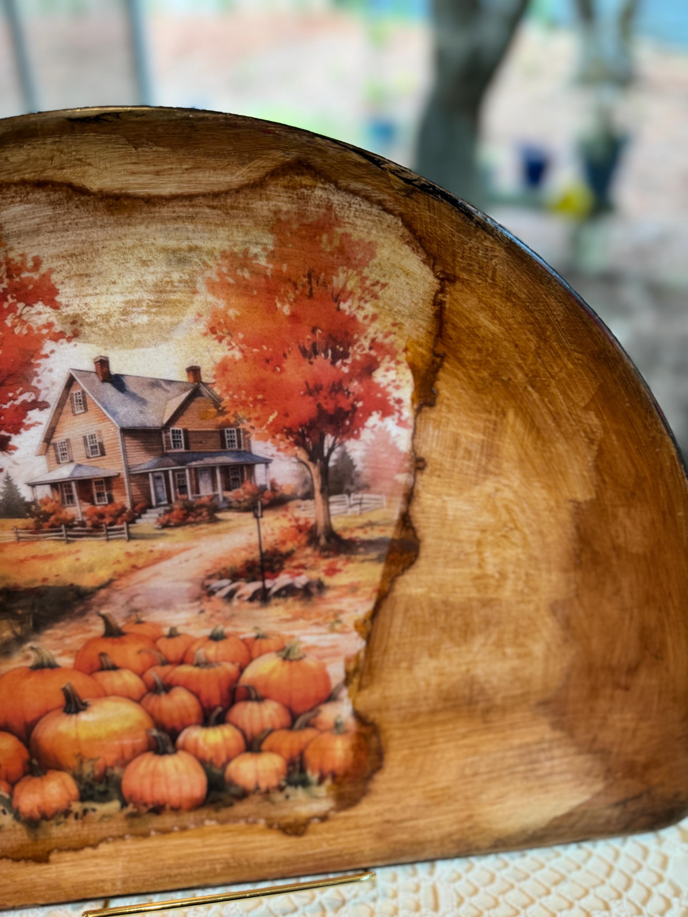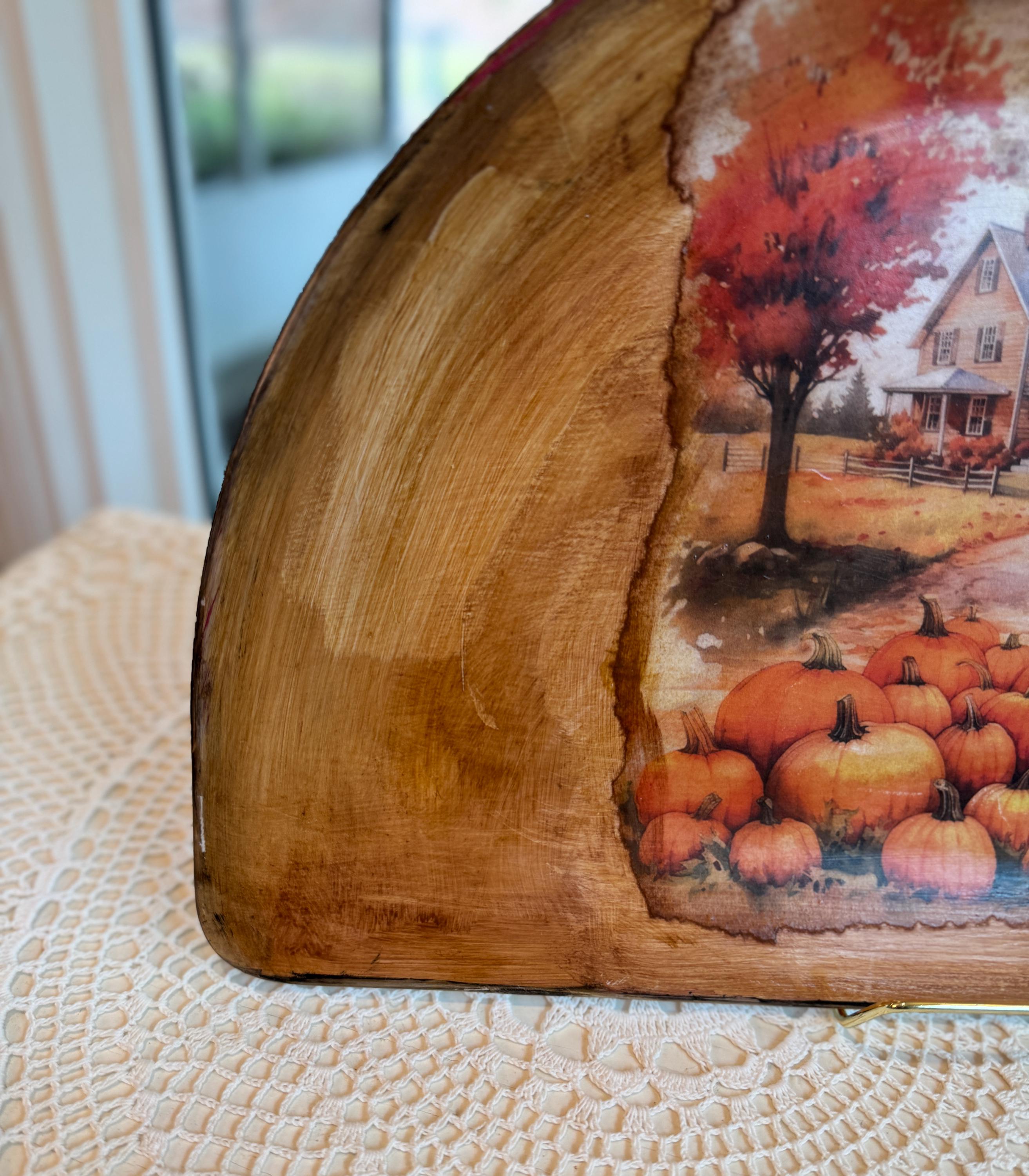 This beautiful, upcycled wooden tray is a unique find, perfect for adding rustic charm to your fall decor. A thrift store find, this tray has been lovingly transformed with a charming decoupage design featuring a farmhouse, autumn trees, and a bountiful harvest of pumpkins. It serves as a wonderful decorative piece for a tiered tray, coffee table, or as a festive serving platter for the season. The tray's semi-circular shape and warm, natural wood finish complement the classic fall scene, making it a cozy addition to any home.