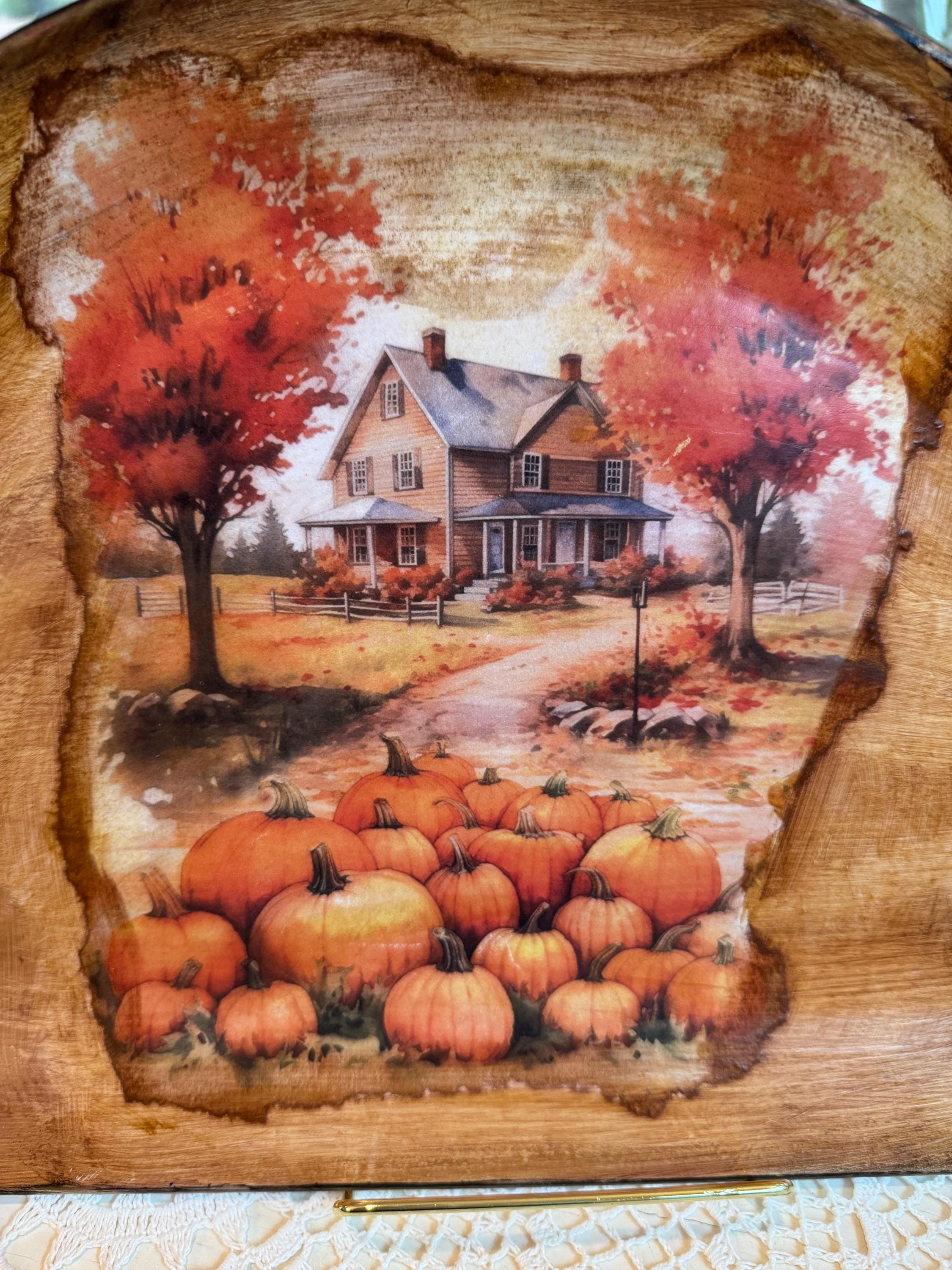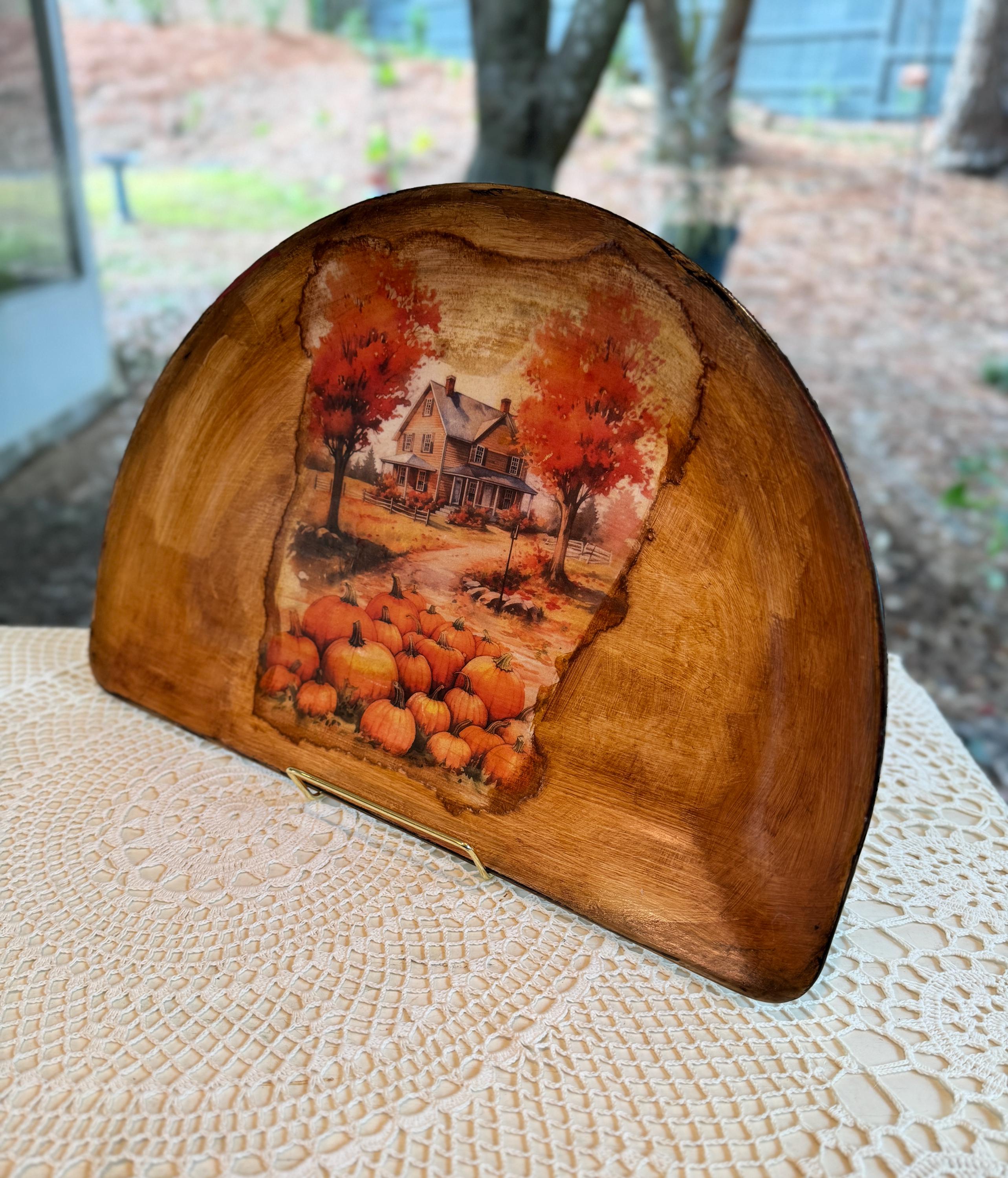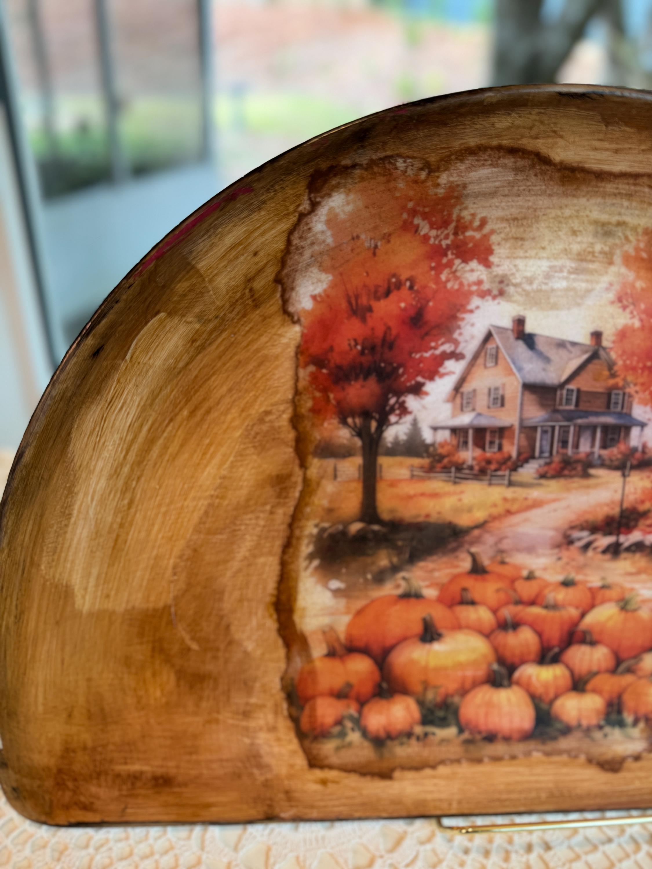 This beautiful, upcycled wooden tray is a unique find, perfect for adding rustic charm to your fall decor. A thrift store find, this tray has been lovingly transformed with a charming decoupage design featuring a farmhouse, autumn trees, and a bountiful harvest of pumpkins. It serves as a wonderful decorative piece for a tiered tray, coffee table, or as a festive serving platter for the season. The tray's semi-circular shape and warm, natural wood finish complement the classic fall scene, making it a cozy addition to any home.