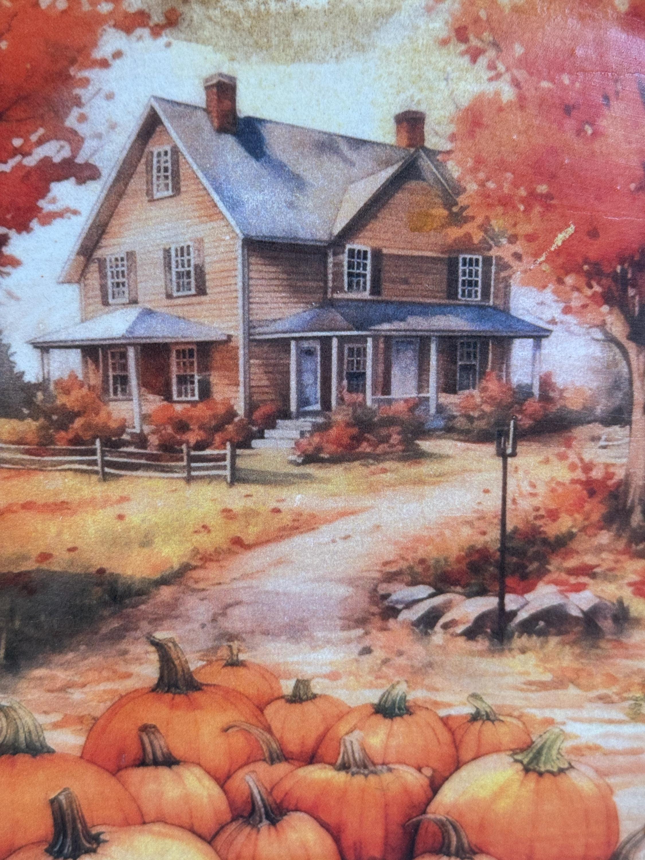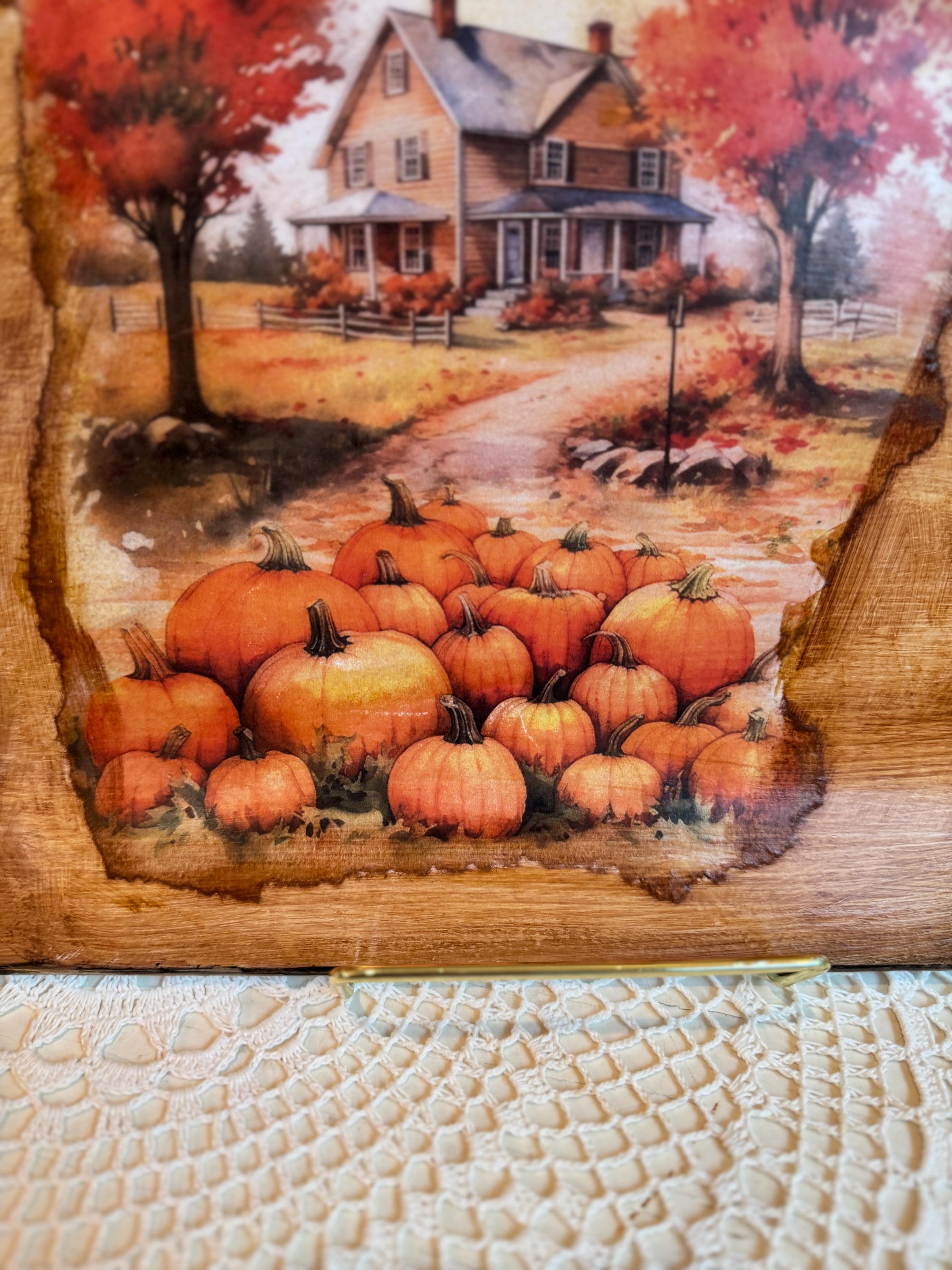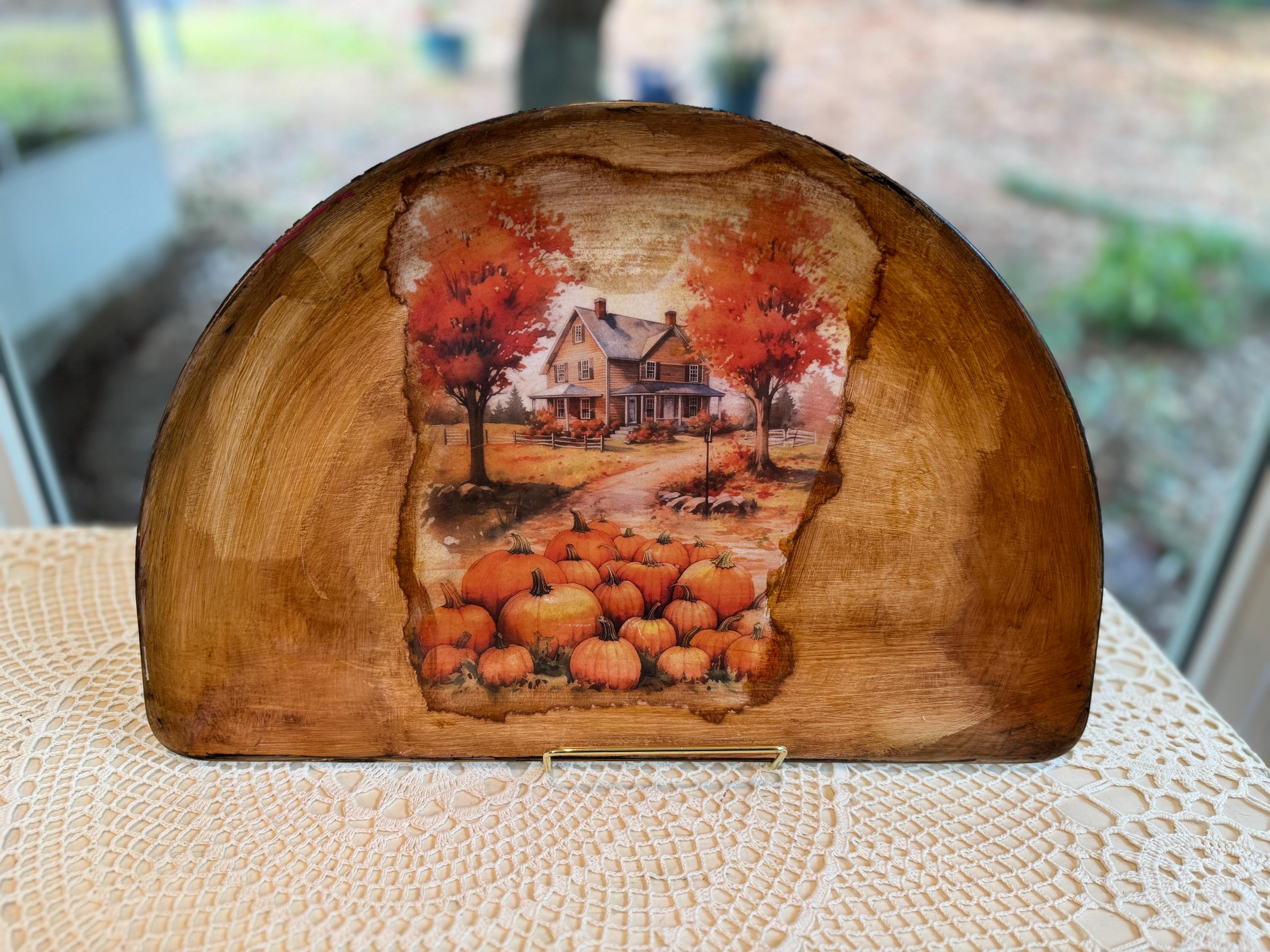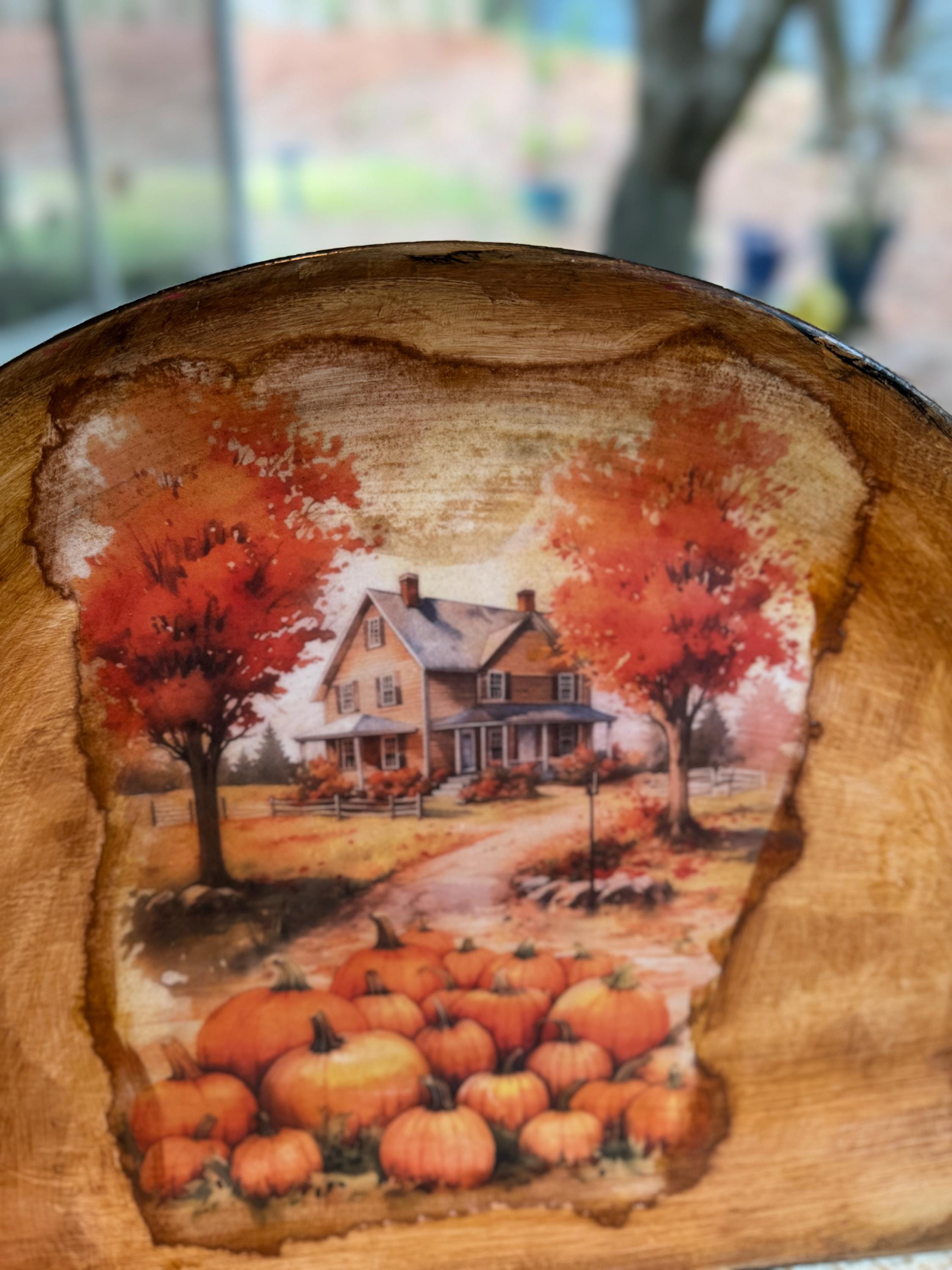 This beautiful, upcycled wooden tray is a unique find, perfect for adding rustic charm to your fall decor. A thrift store find, this tray has been lovingly transformed with a charming decoupage design featuring a farmhouse, autumn trees, and a bountiful harvest of pumpkins. It serves as a wonderful decorative piece for a tiered tray, coffee table, or as a festive serving platter for the season. The tray's semi-circular shape and warm, natural wood finish complement the classic fall scene, making it a cozy addition to any home.