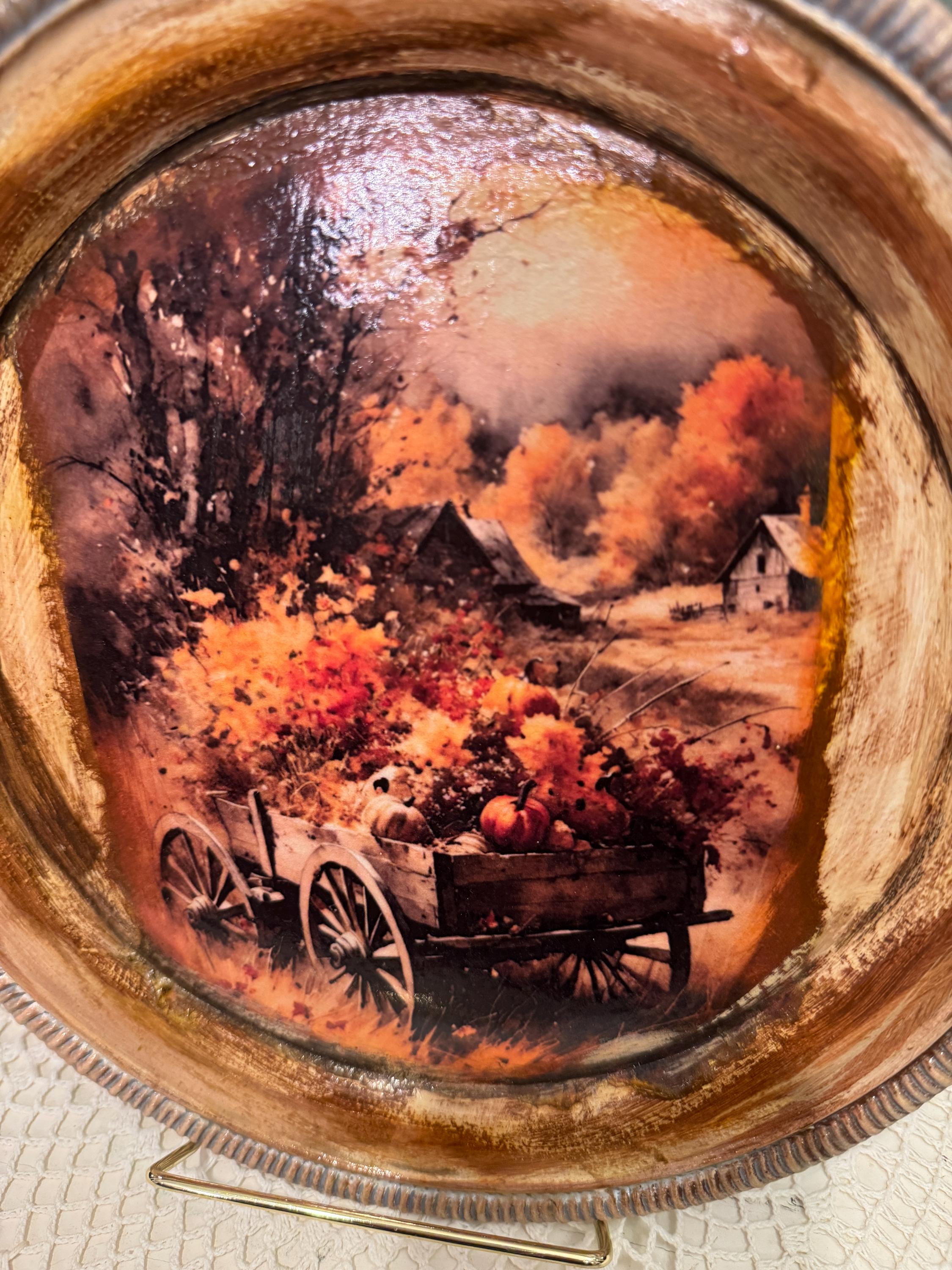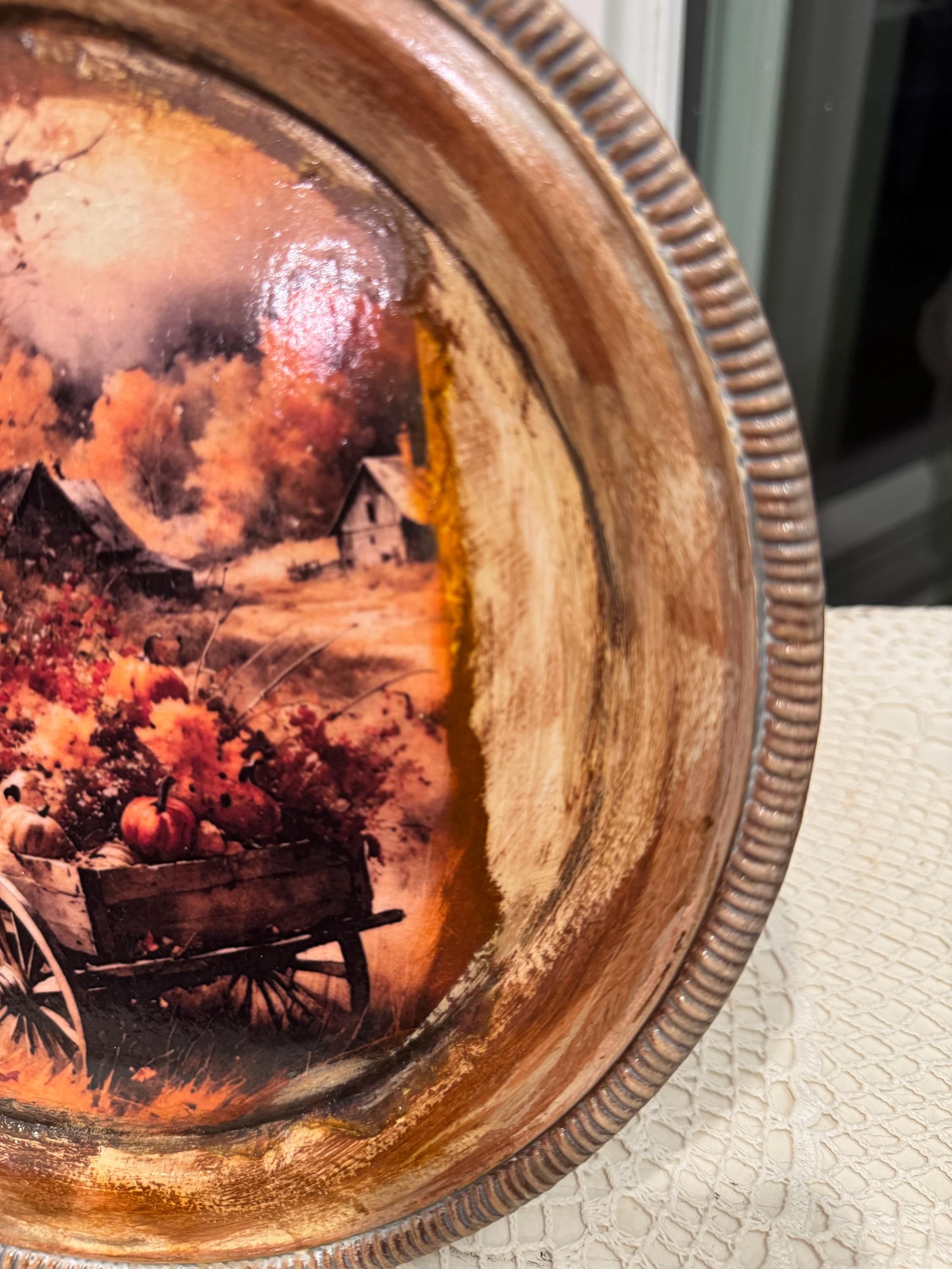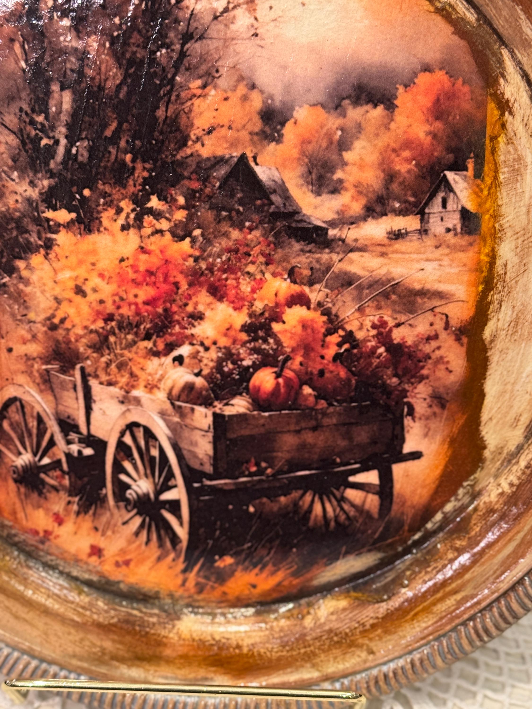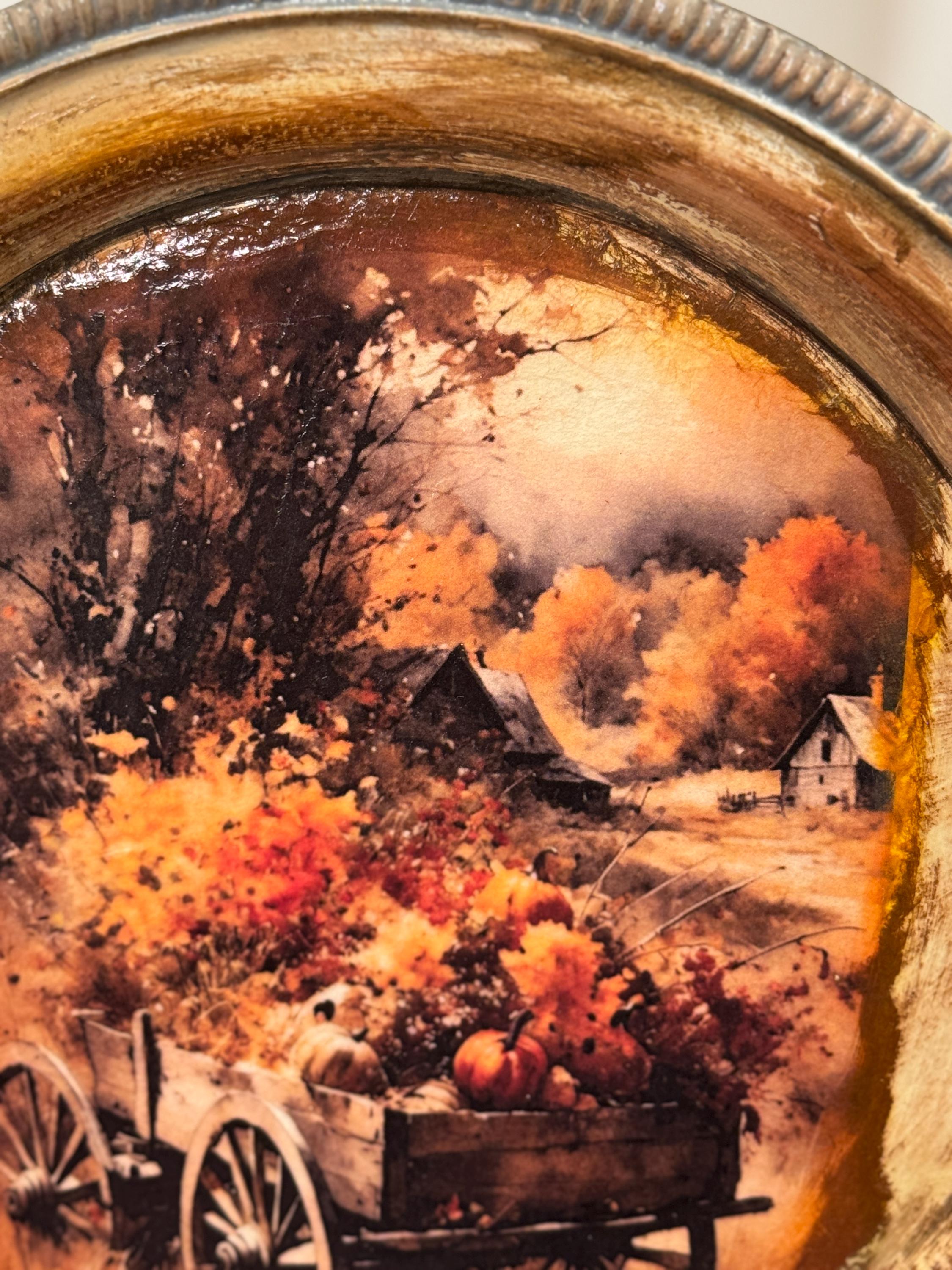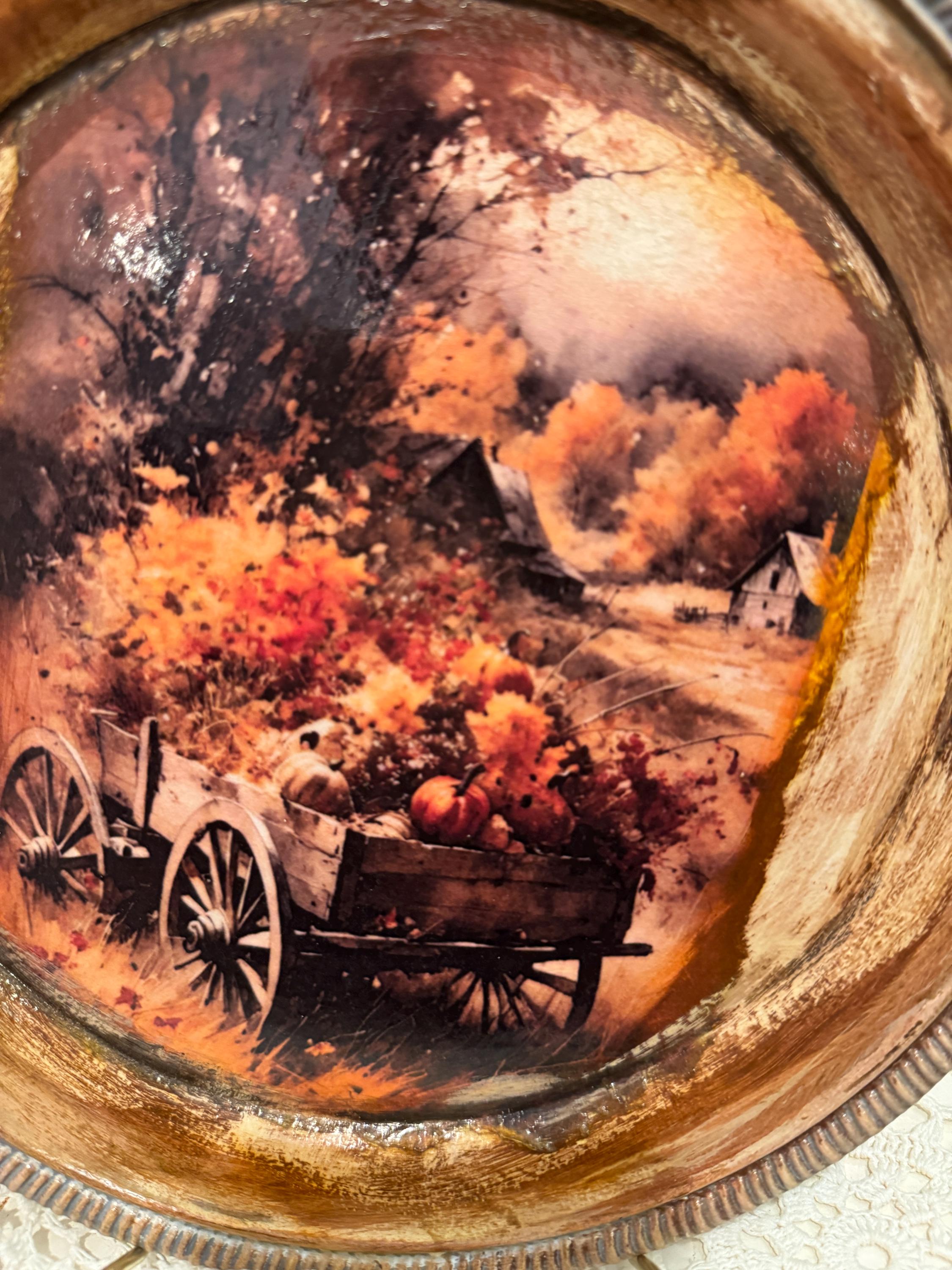 This charming decorative tray is a unique find, perfect for adding cozy, farmhouse style to your autumn decor. A thrift store find, this metal tray has been upcycled with a decoupage image featuring a rustic wooden wagon overflowing with pumpkins and gourds. The scene is set in a peaceful countryside with a farmhouse and barn in the background, making it a perfect piece for the harvest season. The tray's distressed finish and decorative braided rim add to its vintage charm, making it a wonderful centerpiece for a coffee table or a decorative wall hanging.