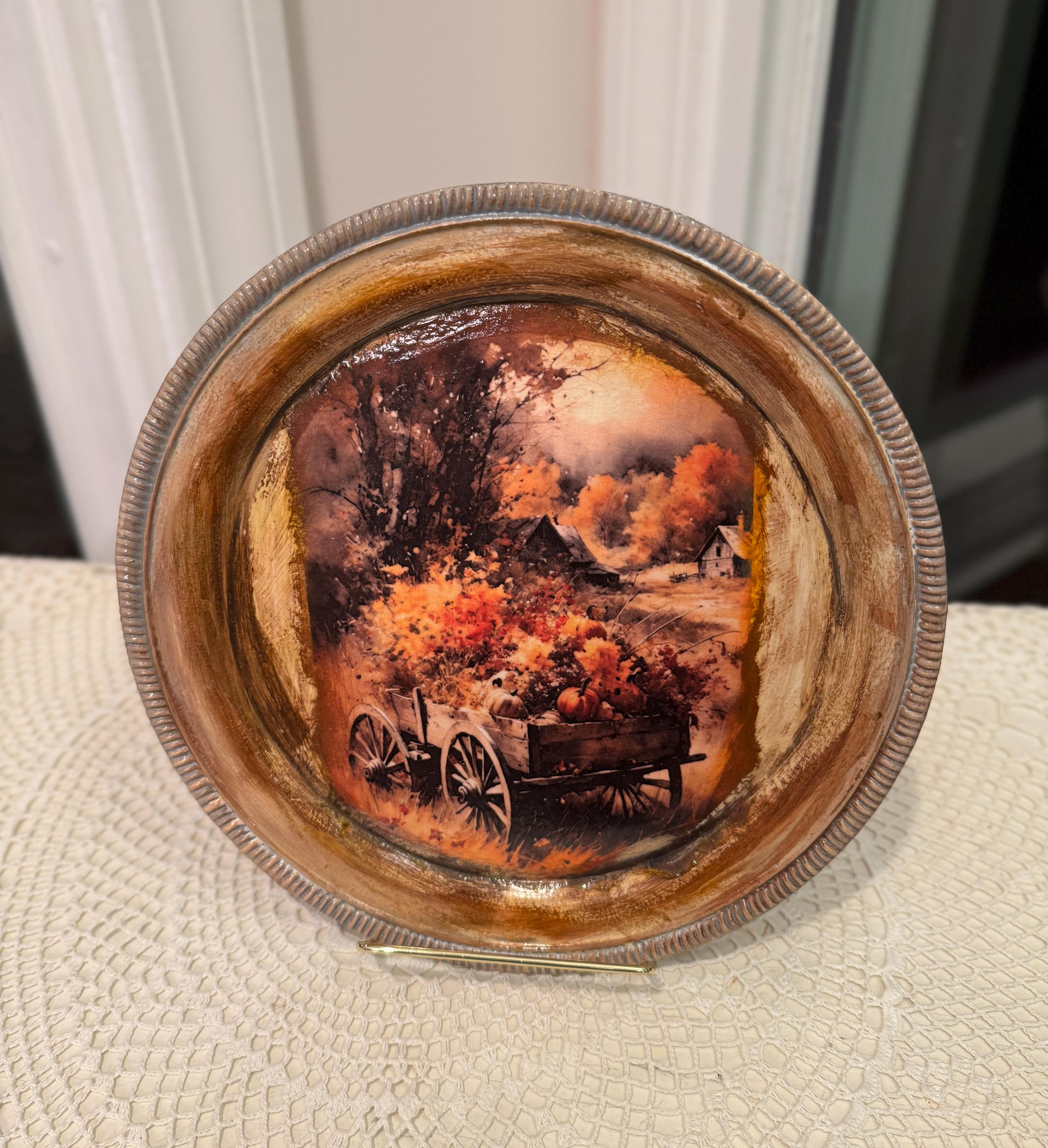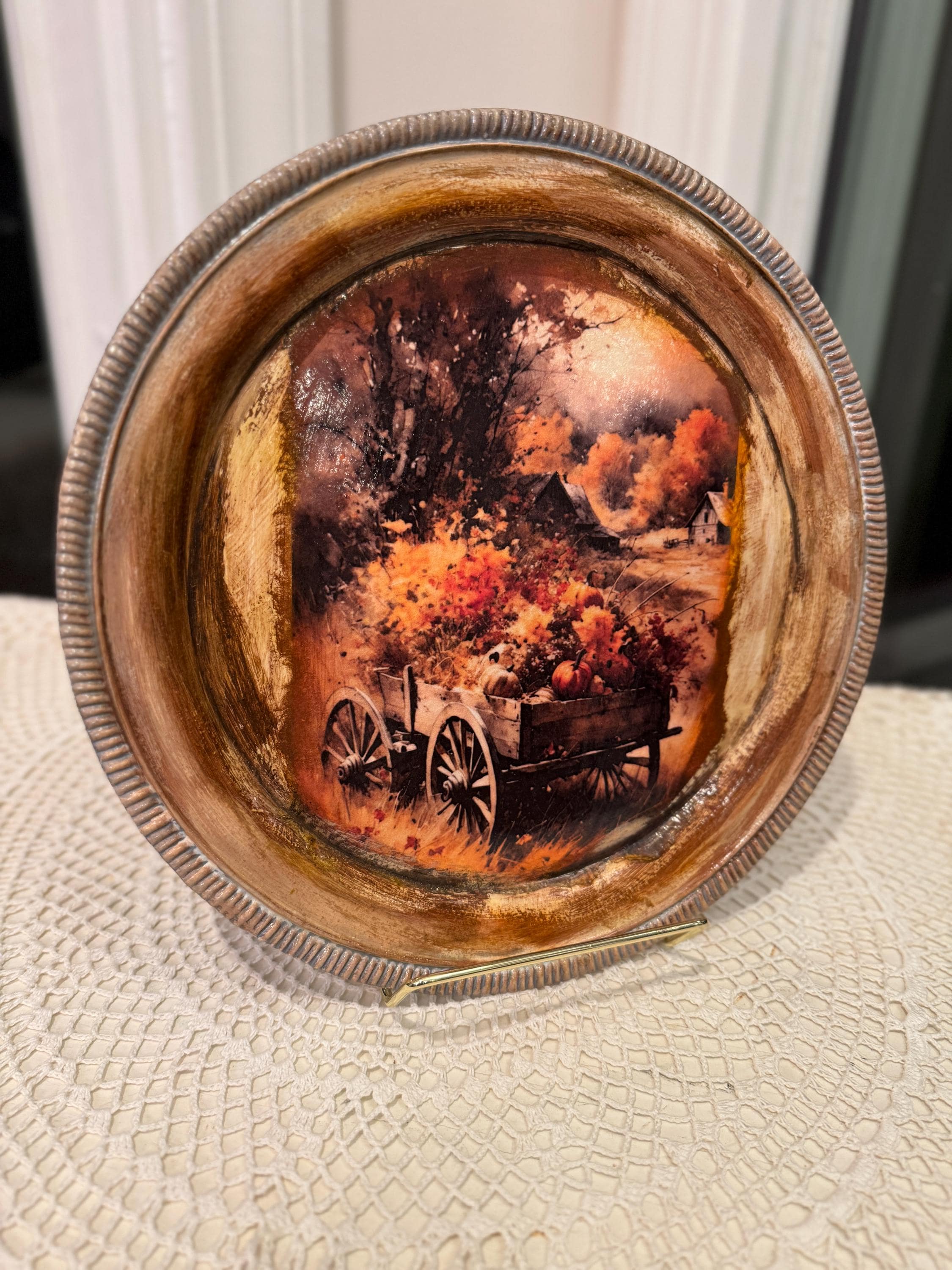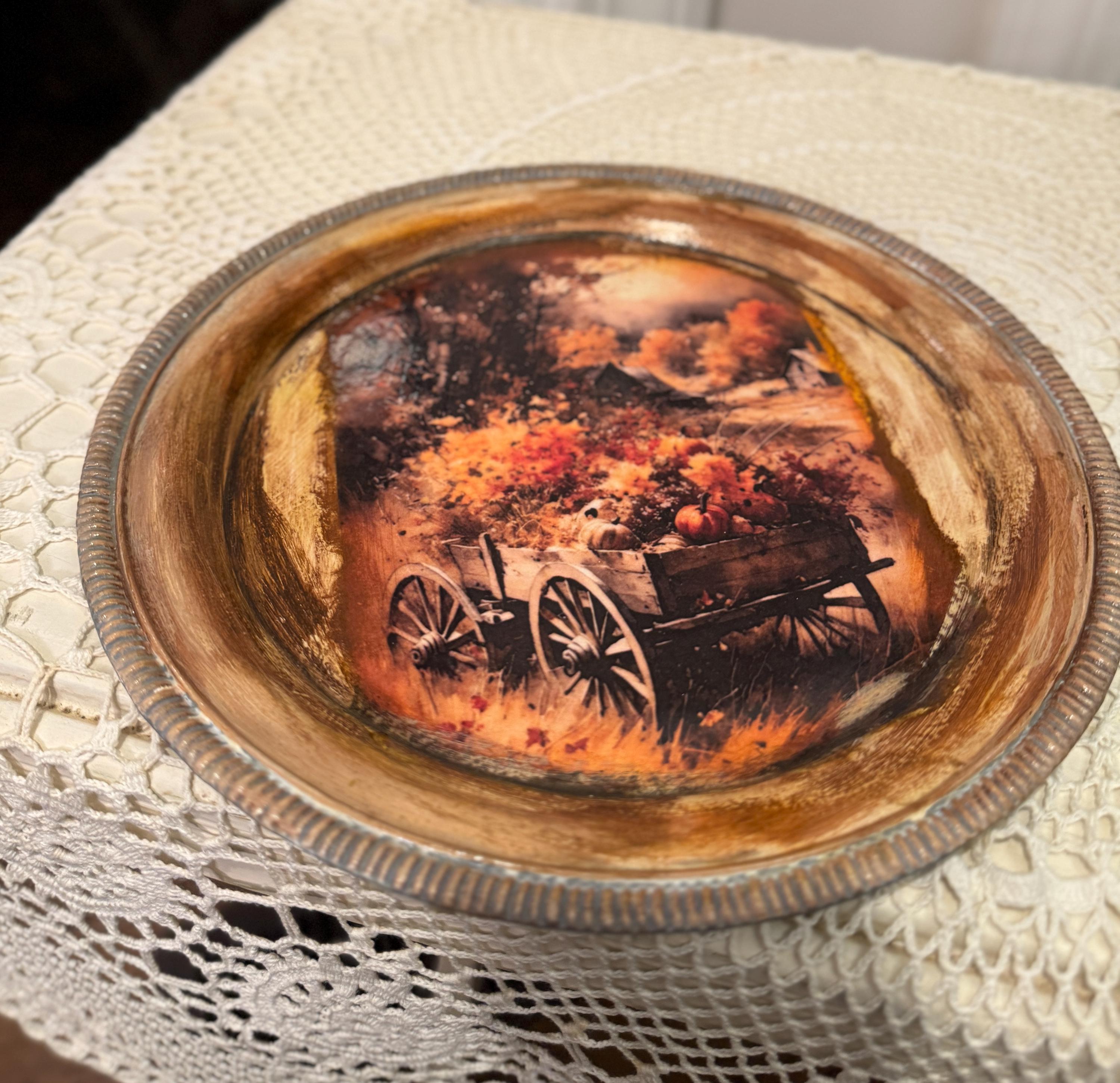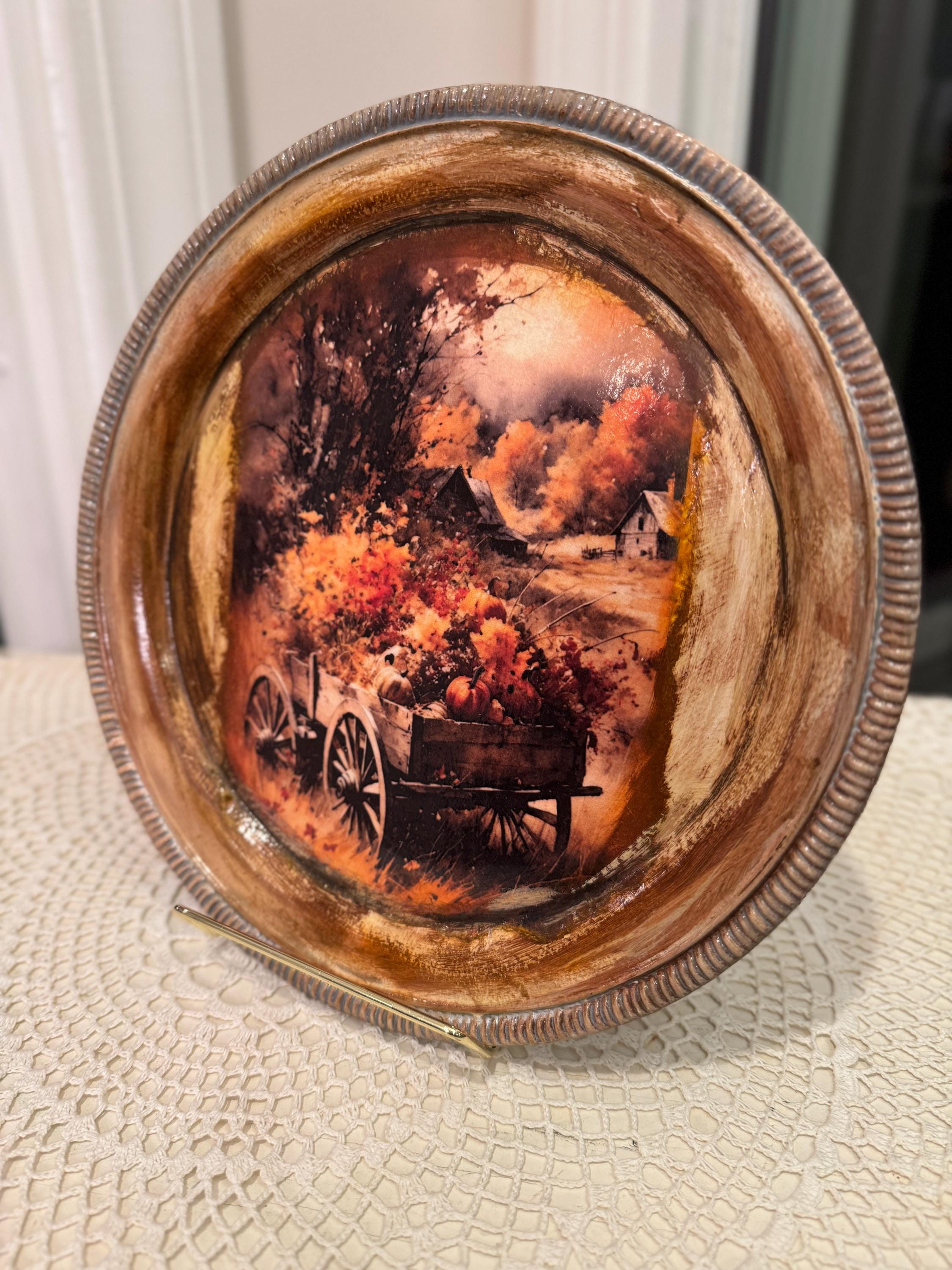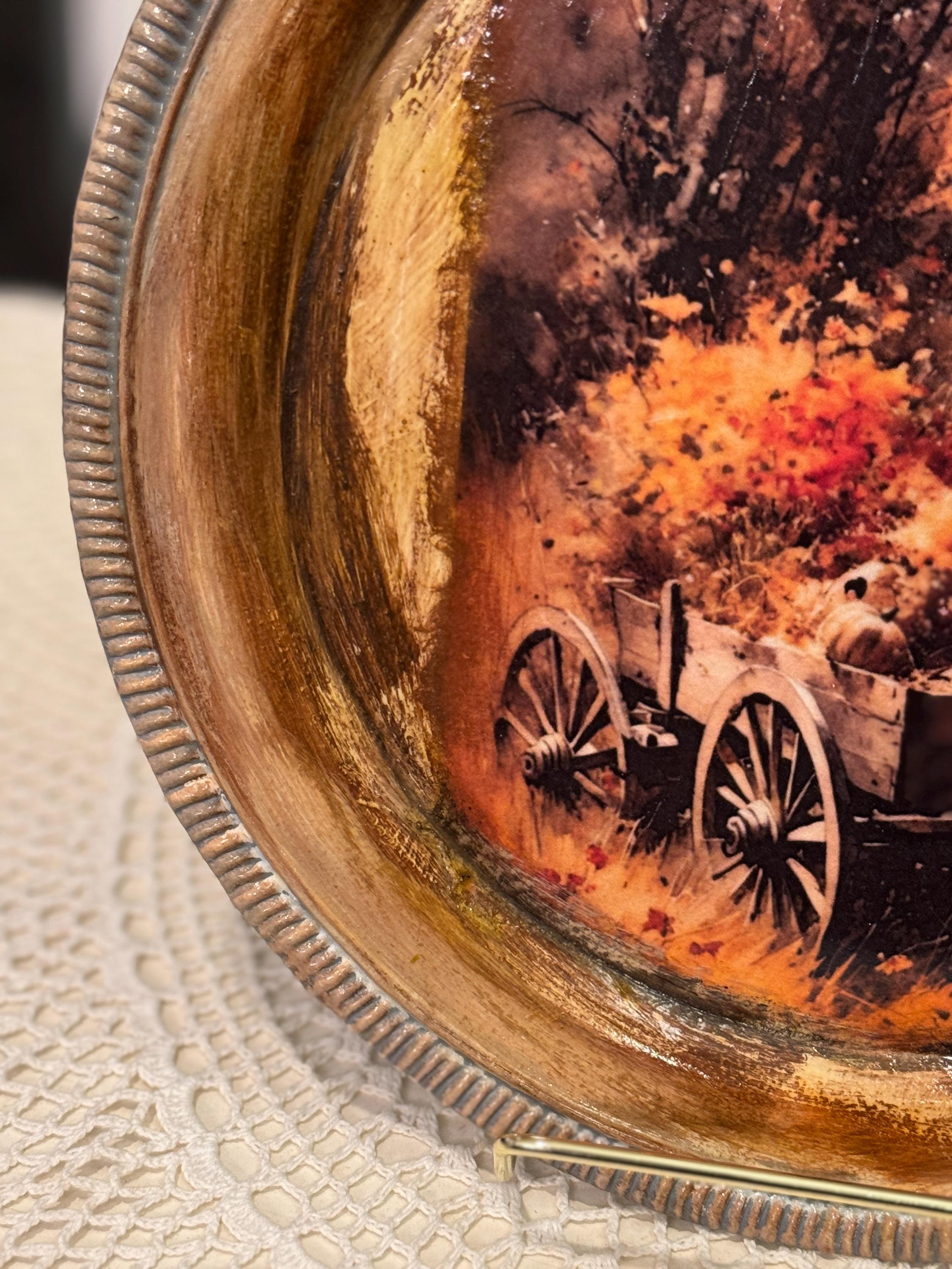 This charming decorative tray is a unique find, perfect for adding cozy, farmhouse style to your autumn decor. A thrift store find, this metal tray has been upcycled with a decoupage image featuring a rustic wooden wagon overflowing with pumpkins and gourds. The scene is set in a peaceful countryside with a farmhouse and barn in the background, making it a perfect piece for the harvest season. The tray's distressed finish and decorative braided rim add to its vintage charm, making it a wonderful centerpiece for a coffee table or a decorative wall hanging.