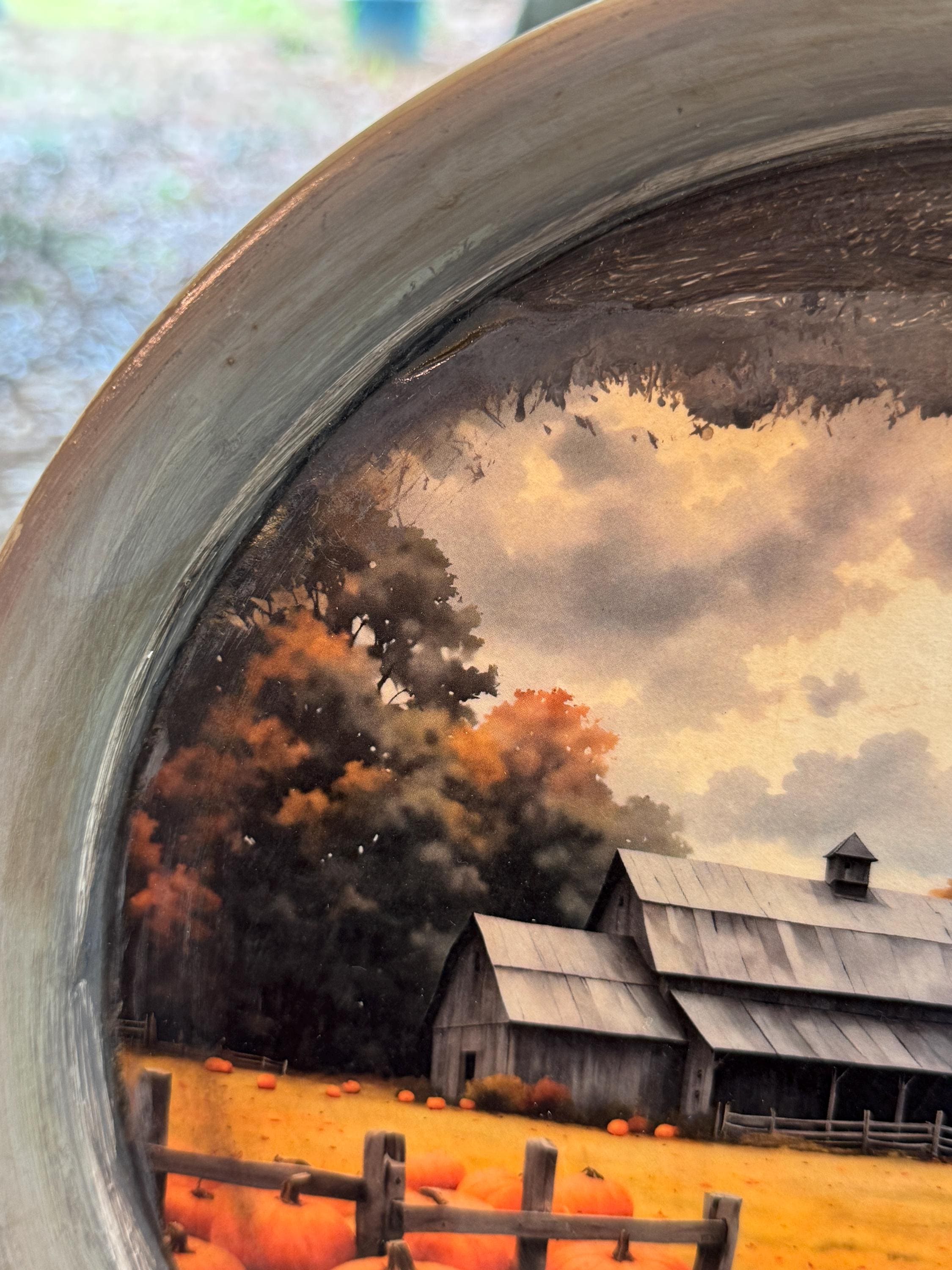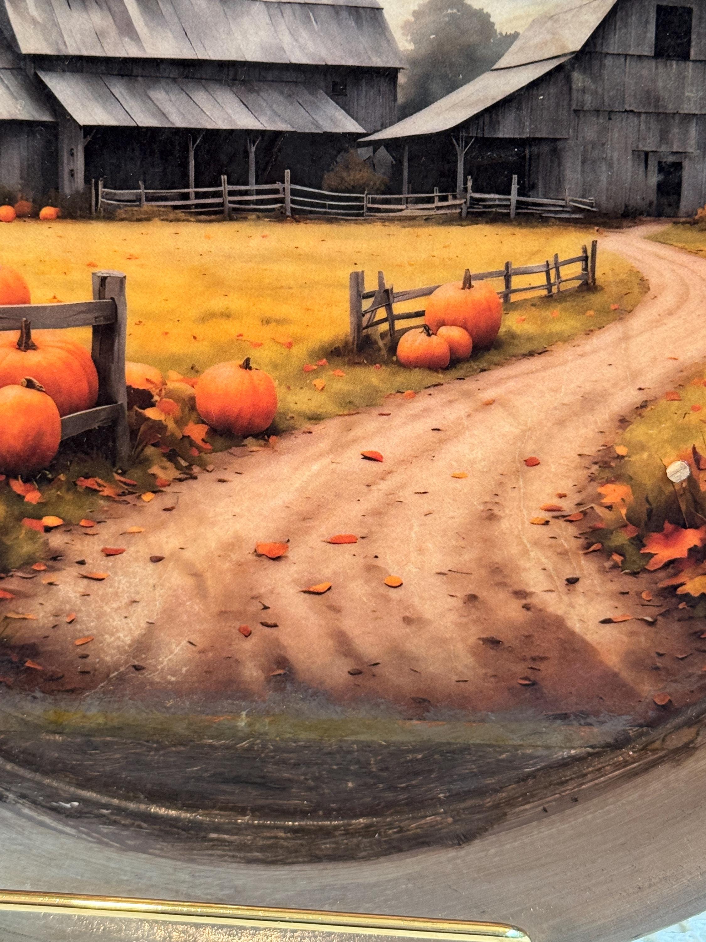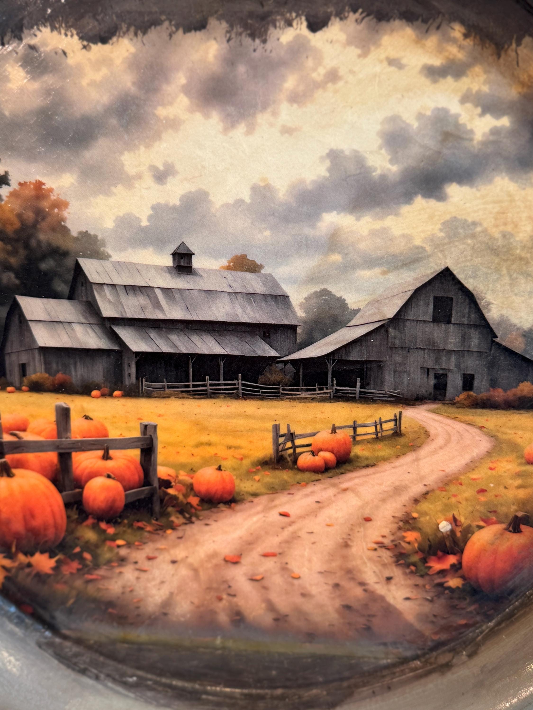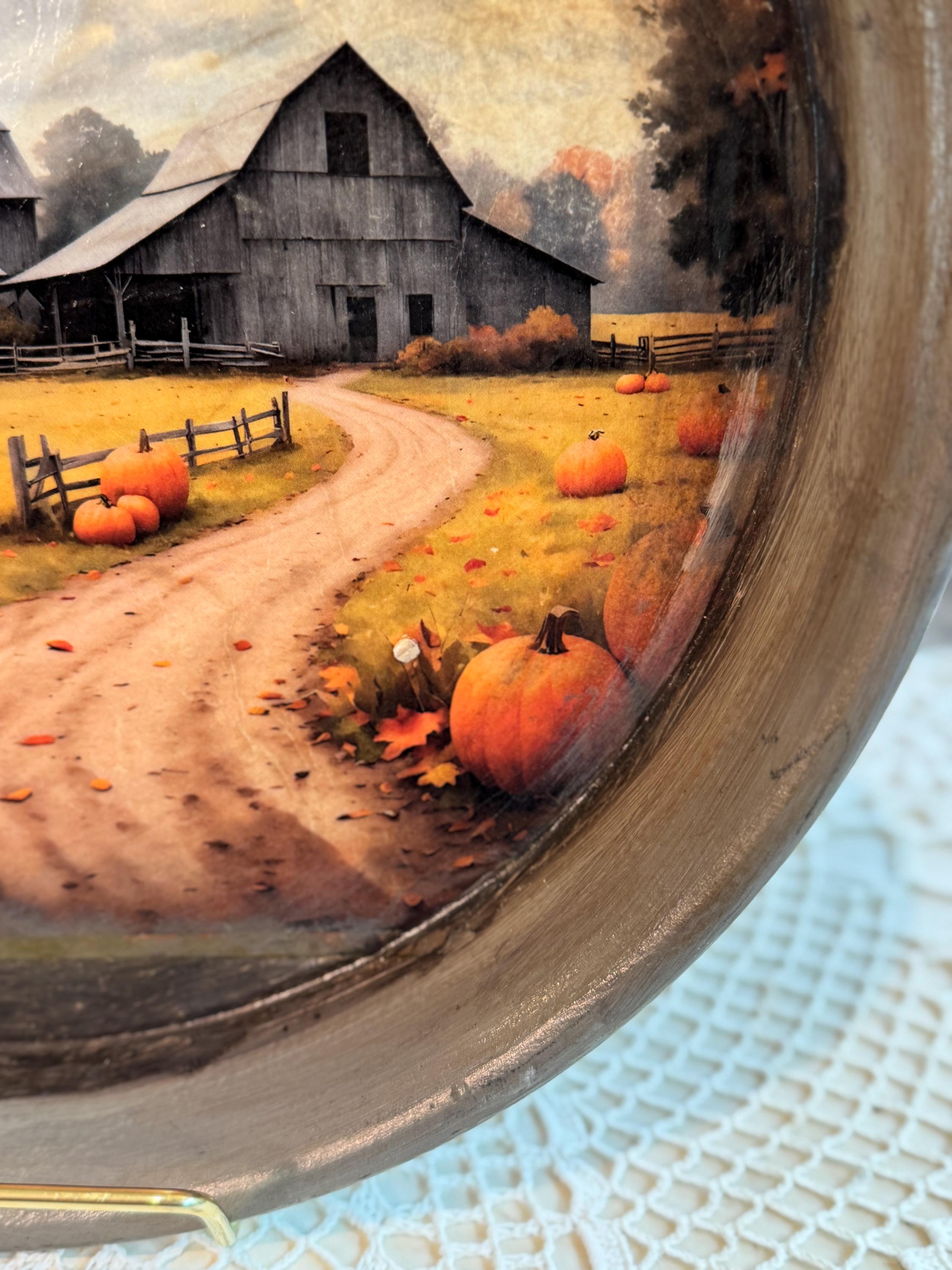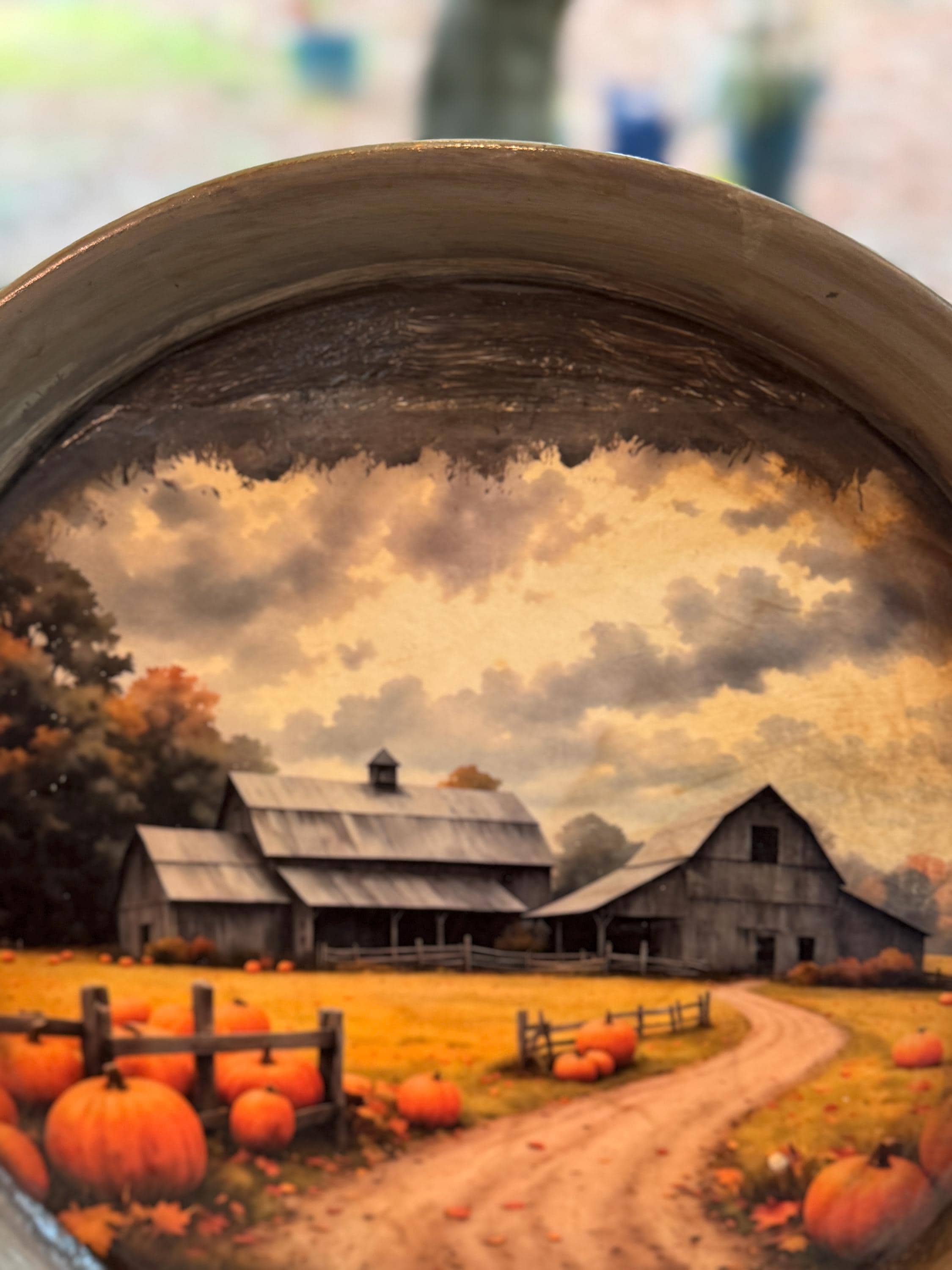 This beautiful upcycled metal tray is a unique find, perfect for adding rustic charm to your fall decor. Originally a thrift store find, this tray has been lovingly transformed with a charming decoupage design featuring a classic farmhouse barn, a dirt road, and a bountiful patch of pumpkins. The image is set under a dramatic cloudy sky, giving it a cozy, seasonal feel. This tray can be used as a decorative piece for a tiered tray, coffee table, or as a festive wall hanging. The tray's sturdy, recycled metal frame and warm tones complement the classic autumn scene, making it a perfect addition to any home.