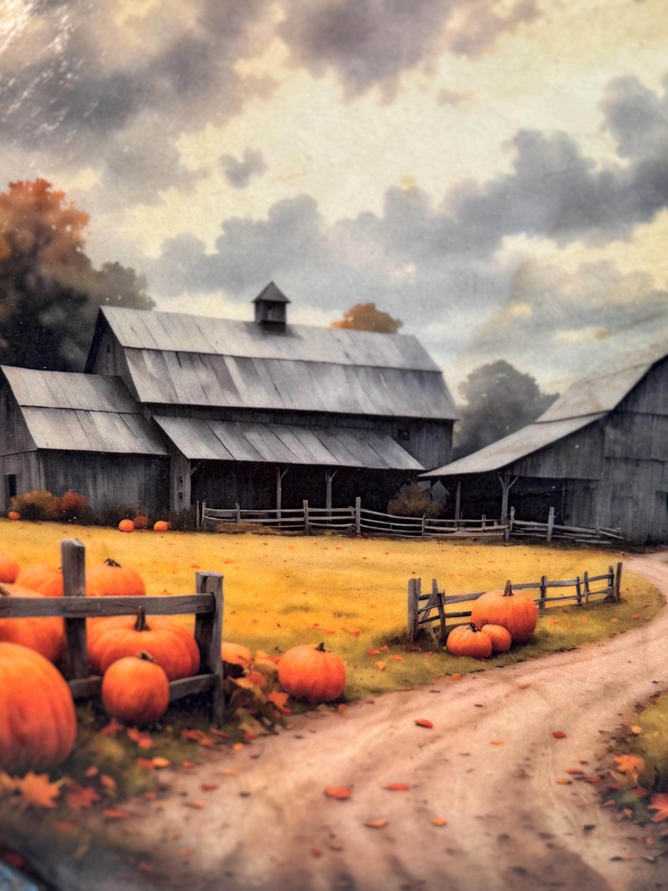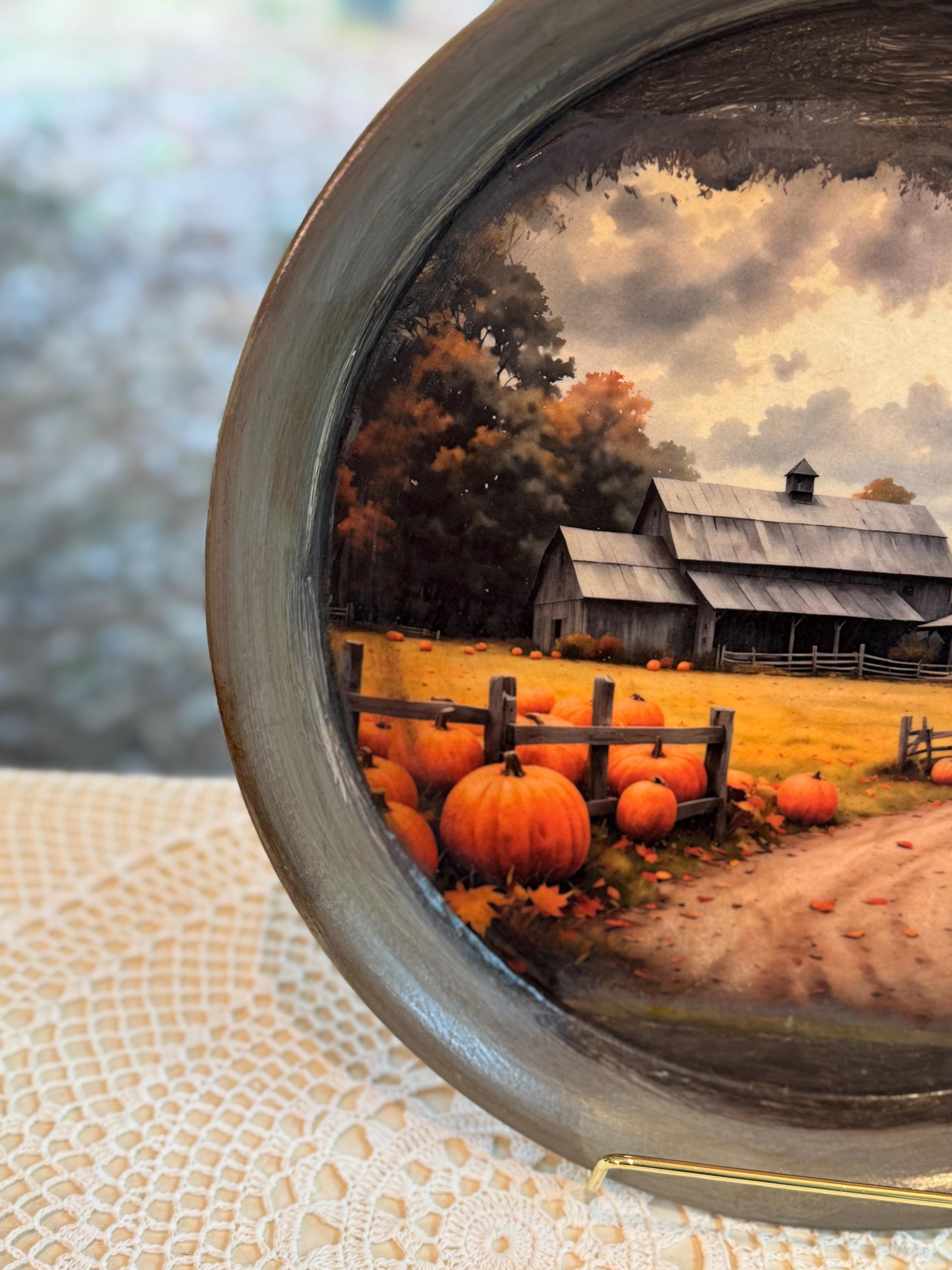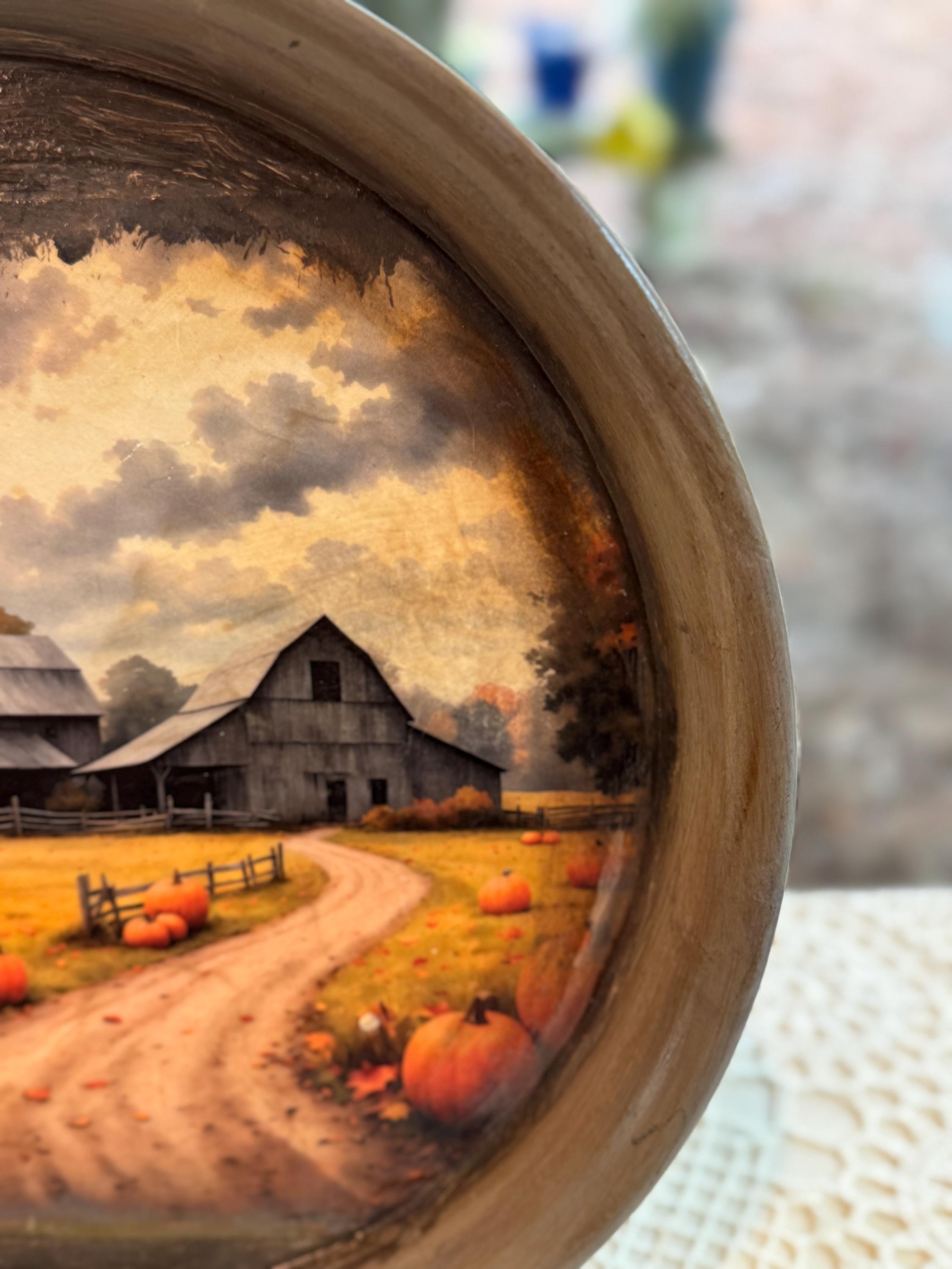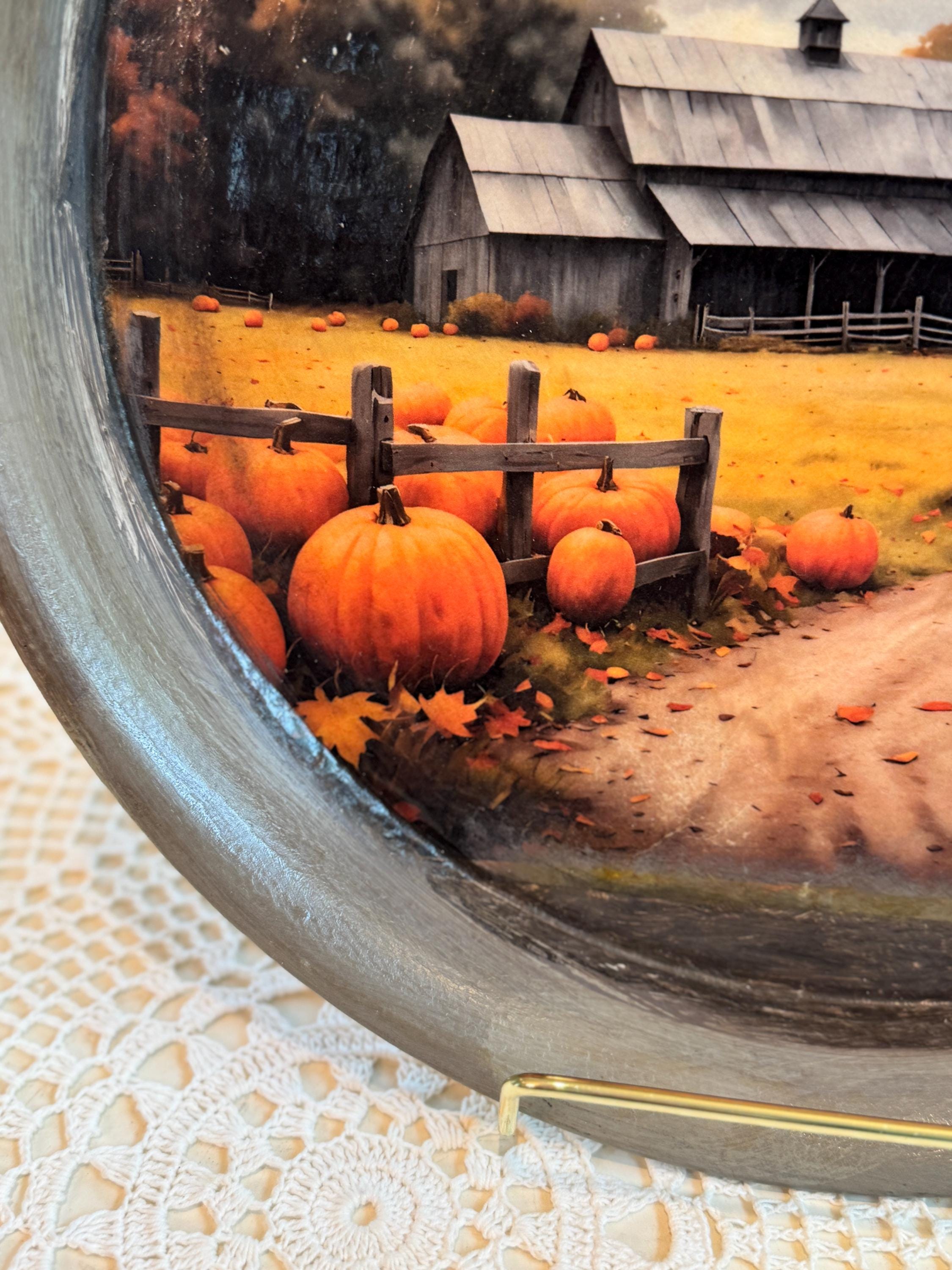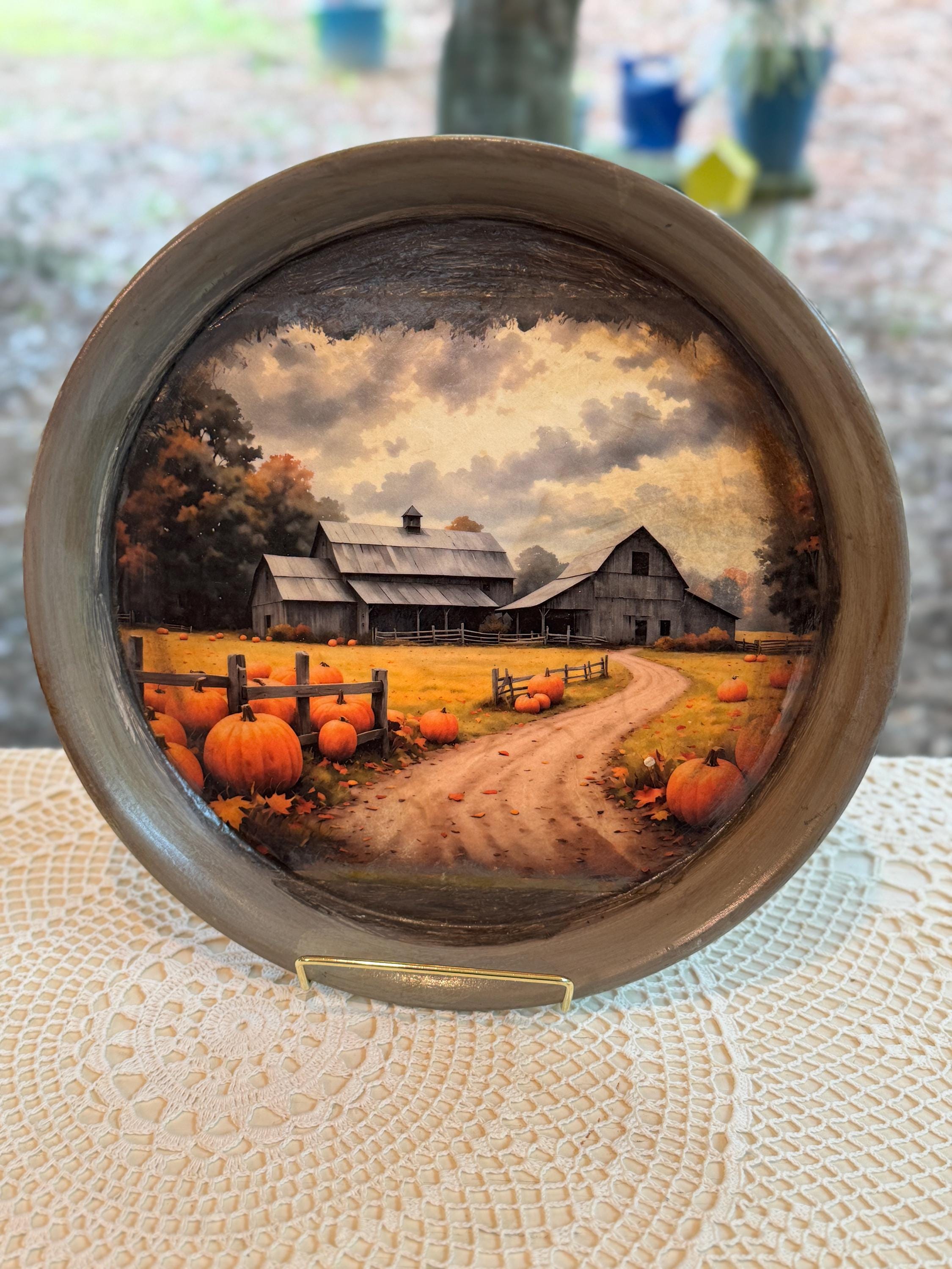 This beautiful upcycled metal tray is a unique find, perfect for adding rustic charm to your fall decor. Originally a thrift store find, this tray has been lovingly transformed with a charming decoupage design featuring a classic farmhouse barn, a dirt road, and a bountiful patch of pumpkins. The image is set under a dramatic cloudy sky, giving it a cozy, seasonal feel. This tray can be used as a decorative piece for a tiered tray, coffee table, or as a festive wall hanging. The tray's sturdy, recycled metal frame and warm tones complement the classic autumn scene, making it a perfect addition to any home.