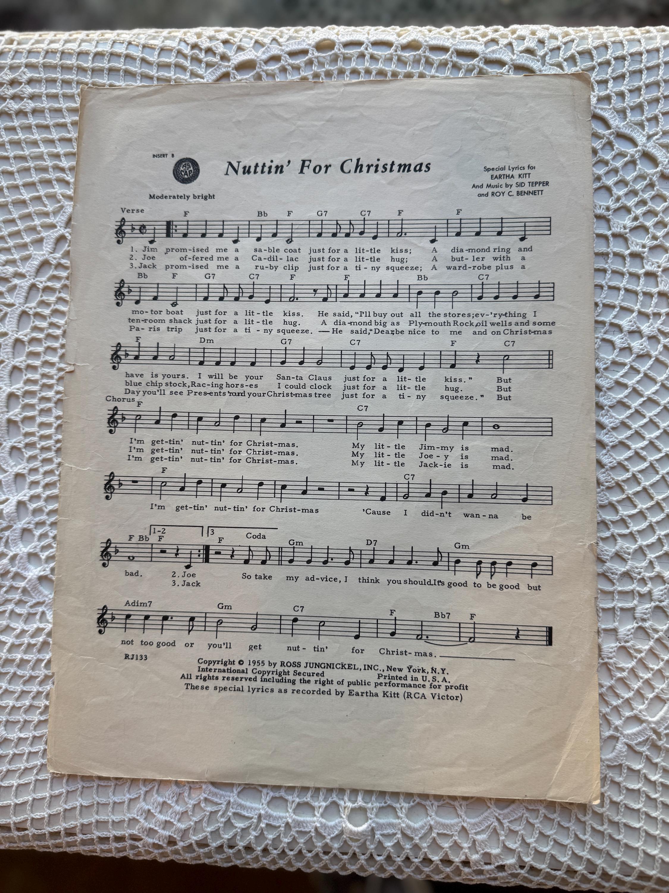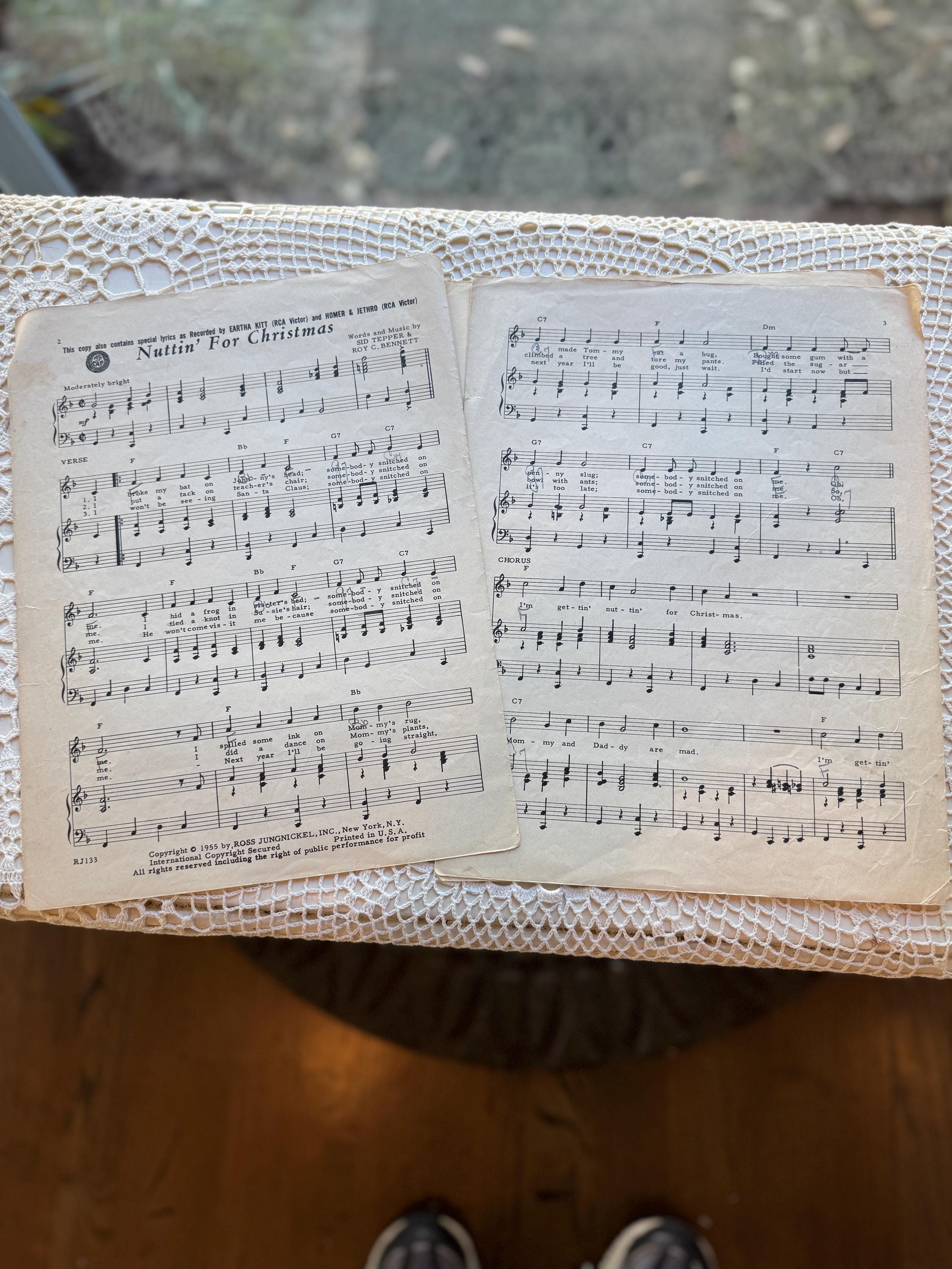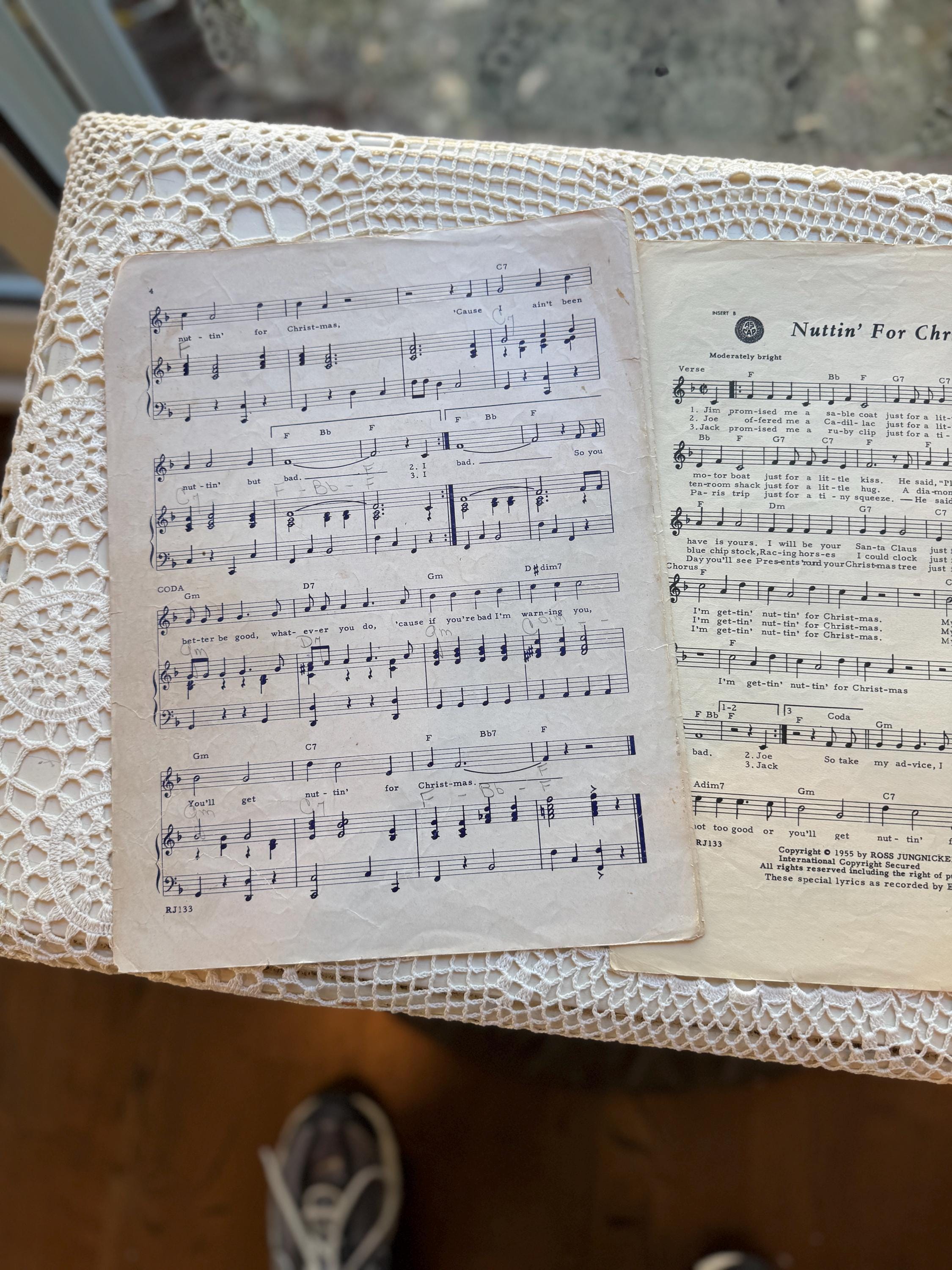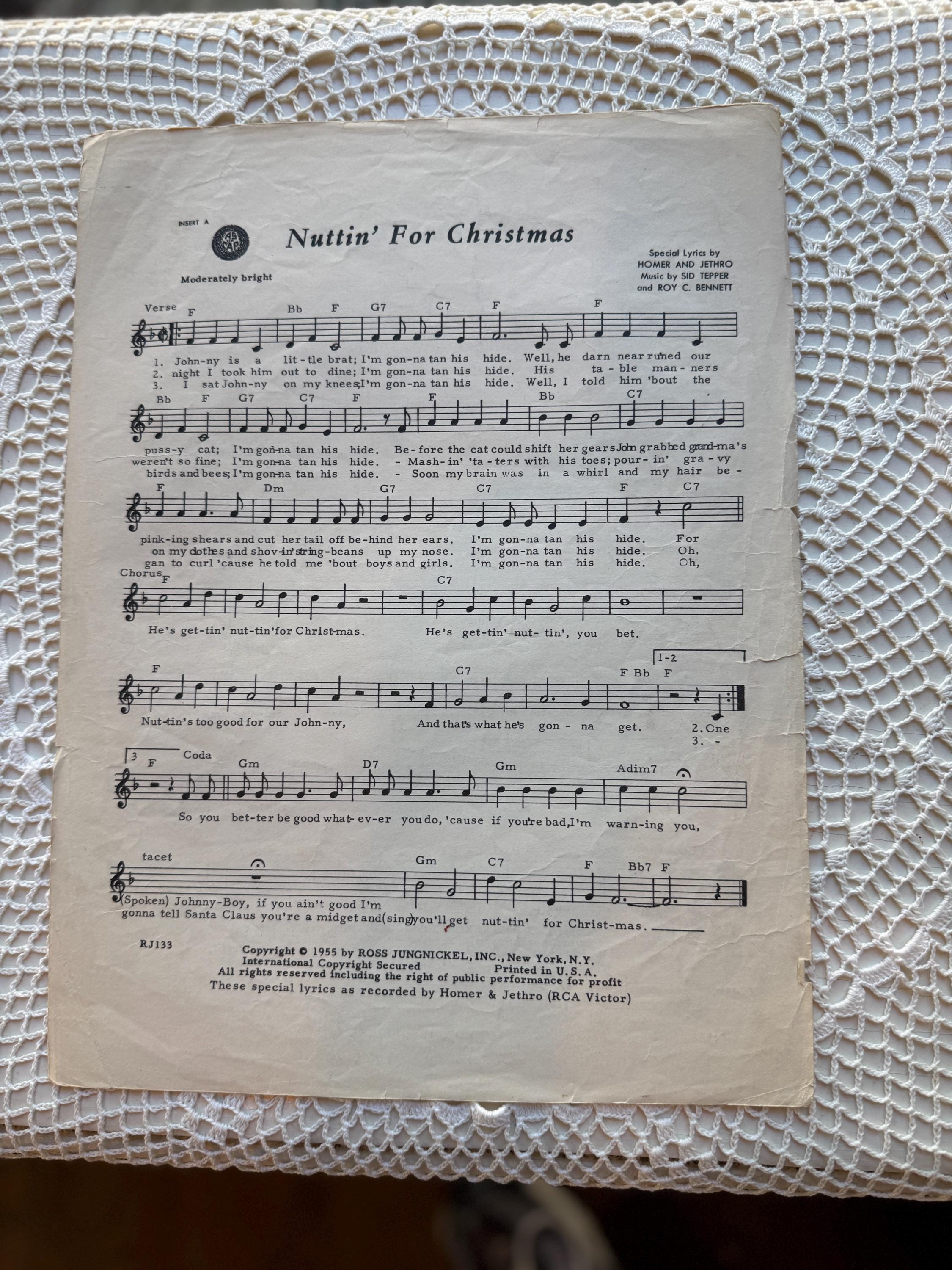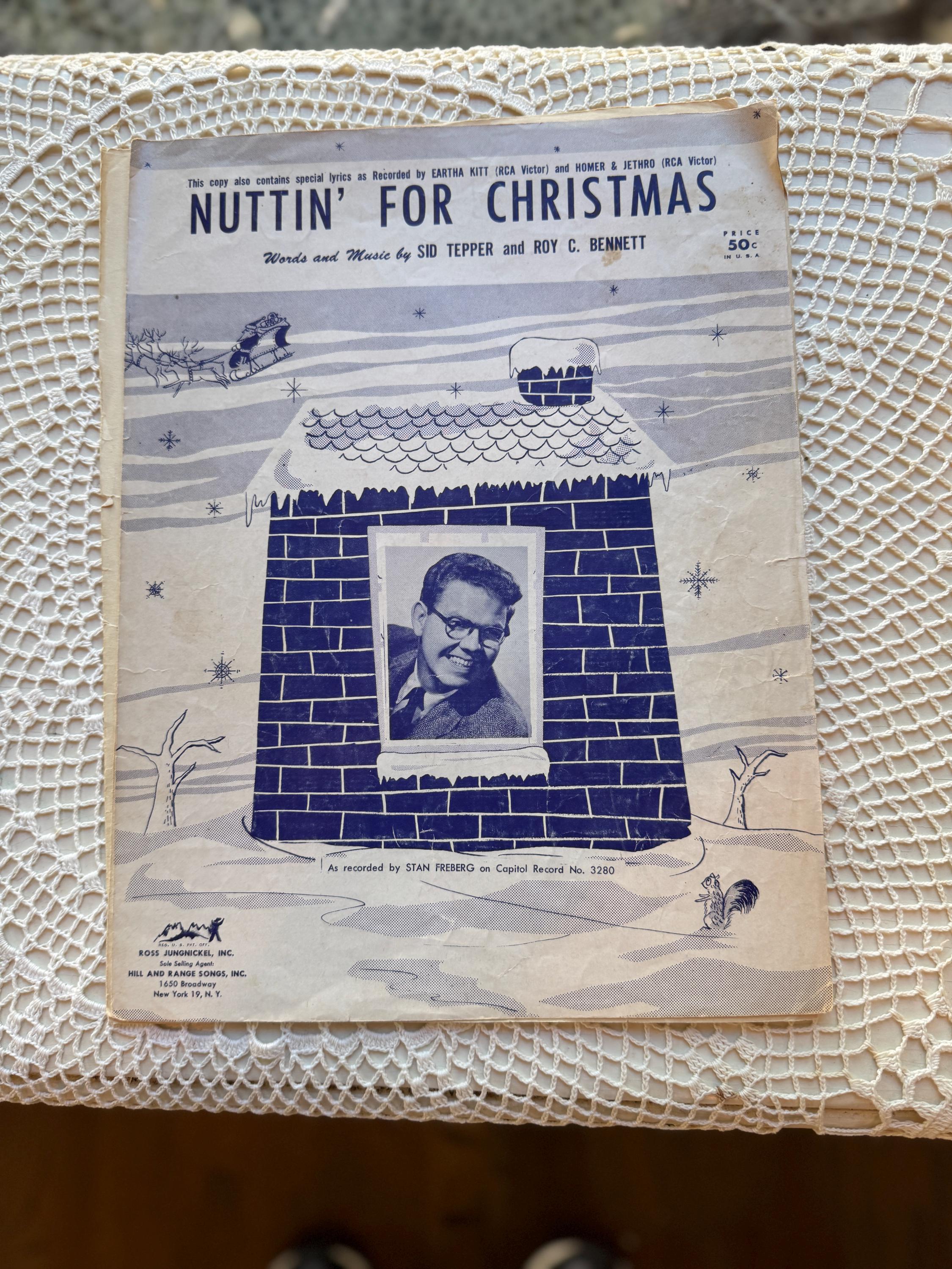 A classic piece of mid-century Christmas music history. This vintage sheet music for the novelty song "Nuttin' For Christmas" features the lyrics and music by Sid Tepper and Roy C. Bennett. It is a perfect addition for collectors of unique holiday items or vintage paper ephemera.