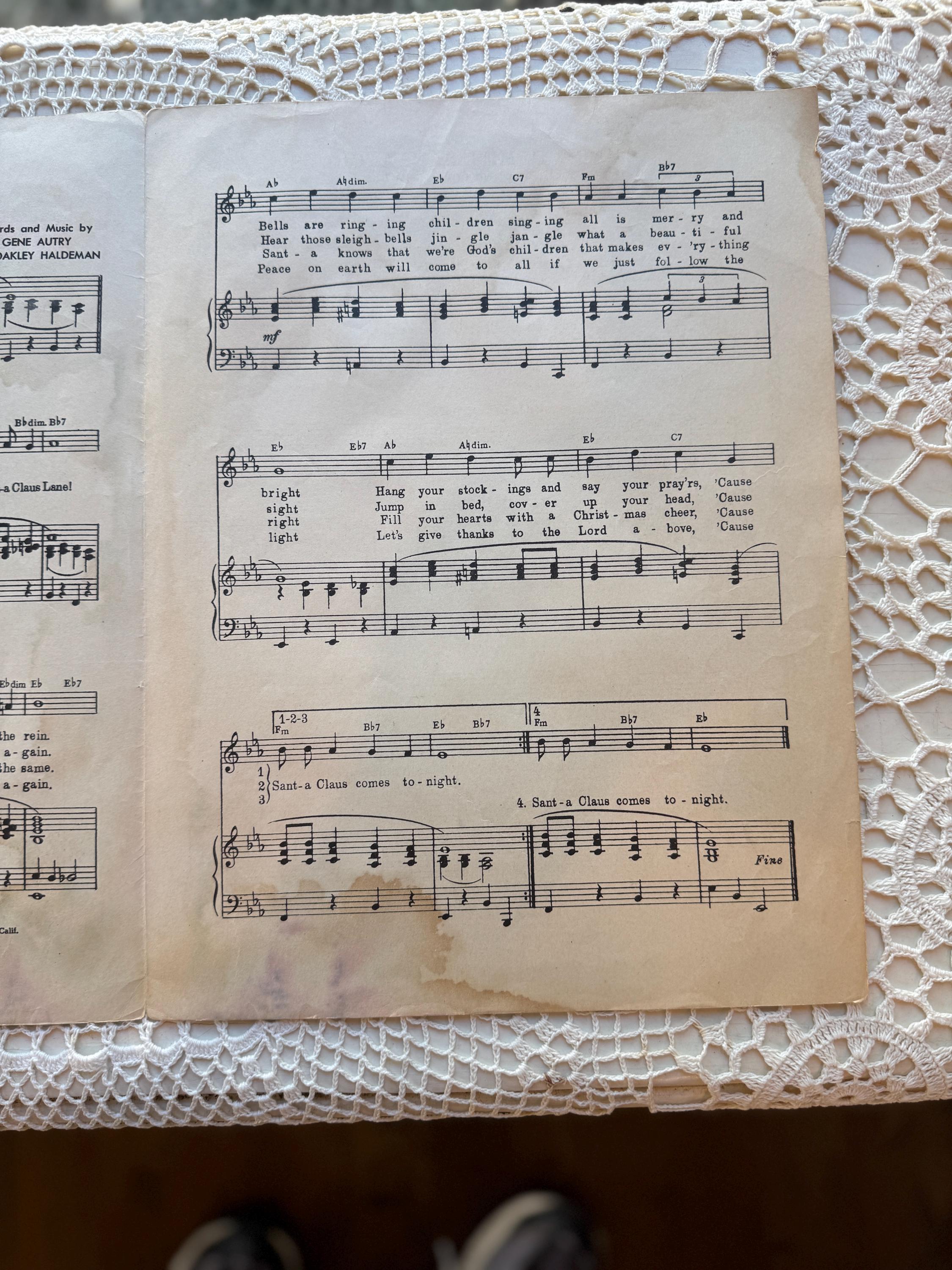 A piece of classic Christmas music history. This is the original vintage sheet music for "Here Comes Santa Claus (Right Down Santa Claus Lane)", co-written and introduced by the "Singing Cowboy" Gene Autry.
