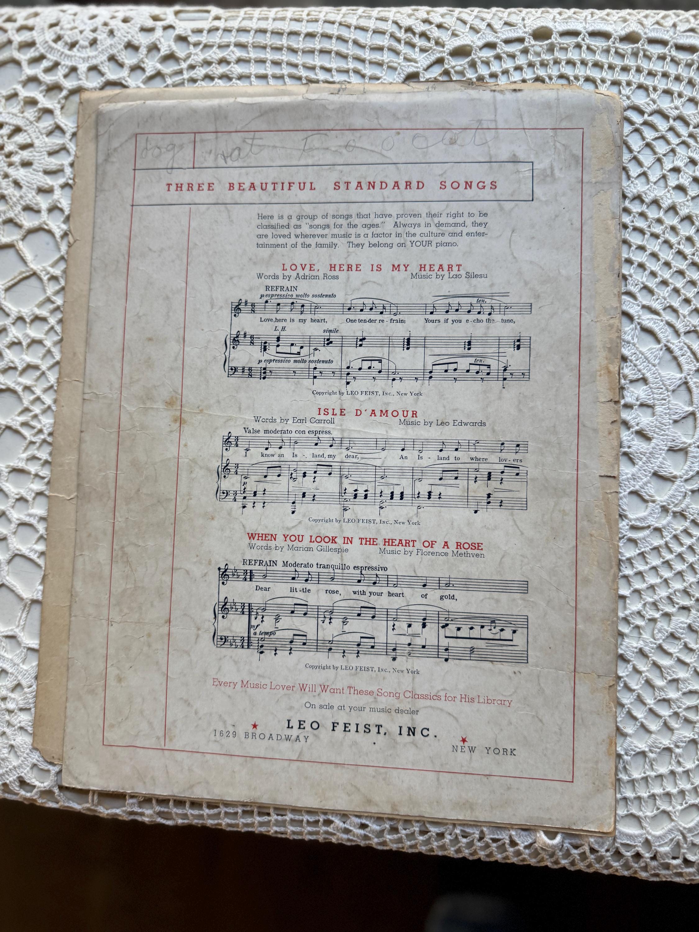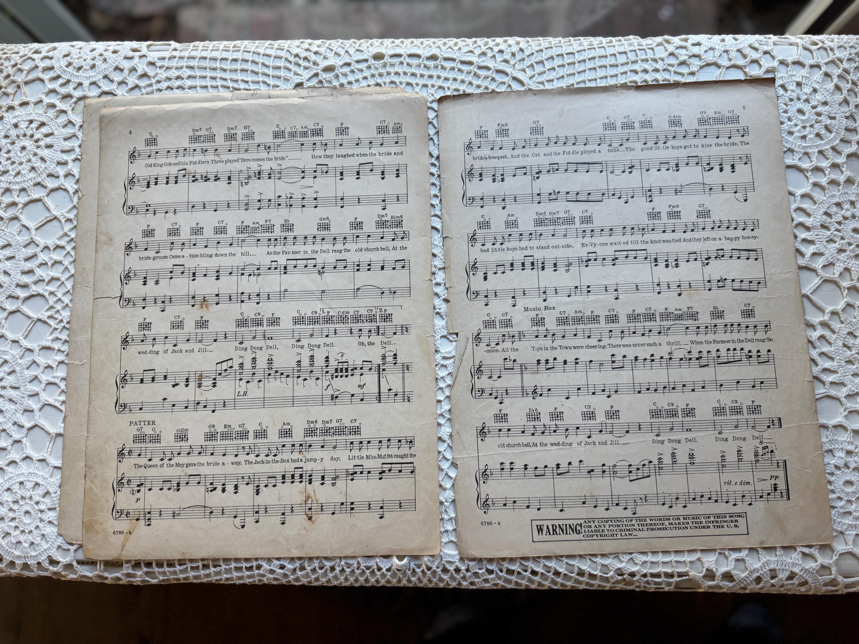This is a vintage piece of original "The Wedding of Jack and Jill" sheet music, a whimsical song from the 1930s. The music was written by J. Fred Coots and featured by Ben Bernie (The Old Maestro). This arrangement for piano, vocals, and "Match-A-Chord" diagrams is a unique piece of musical ephemera.