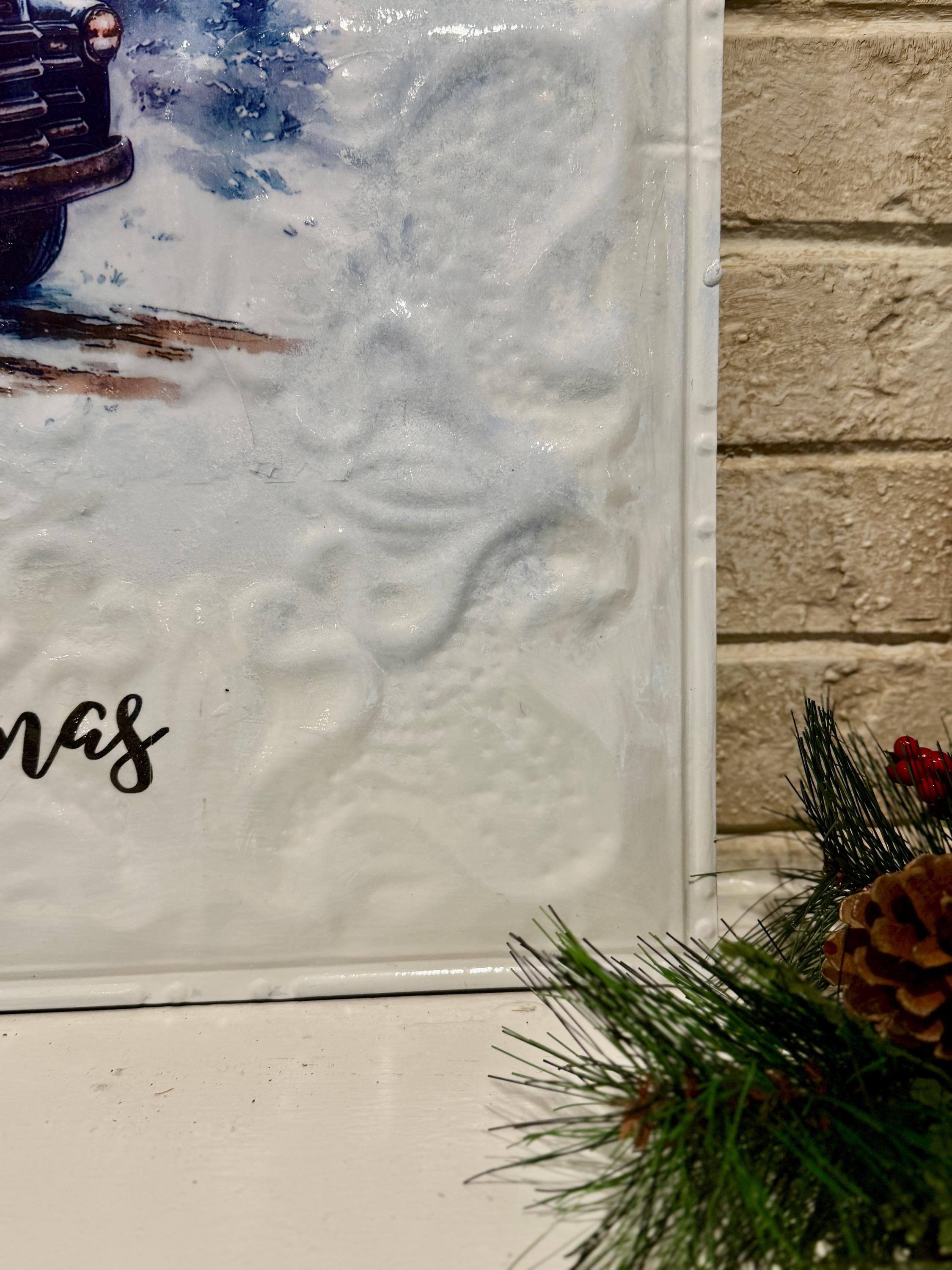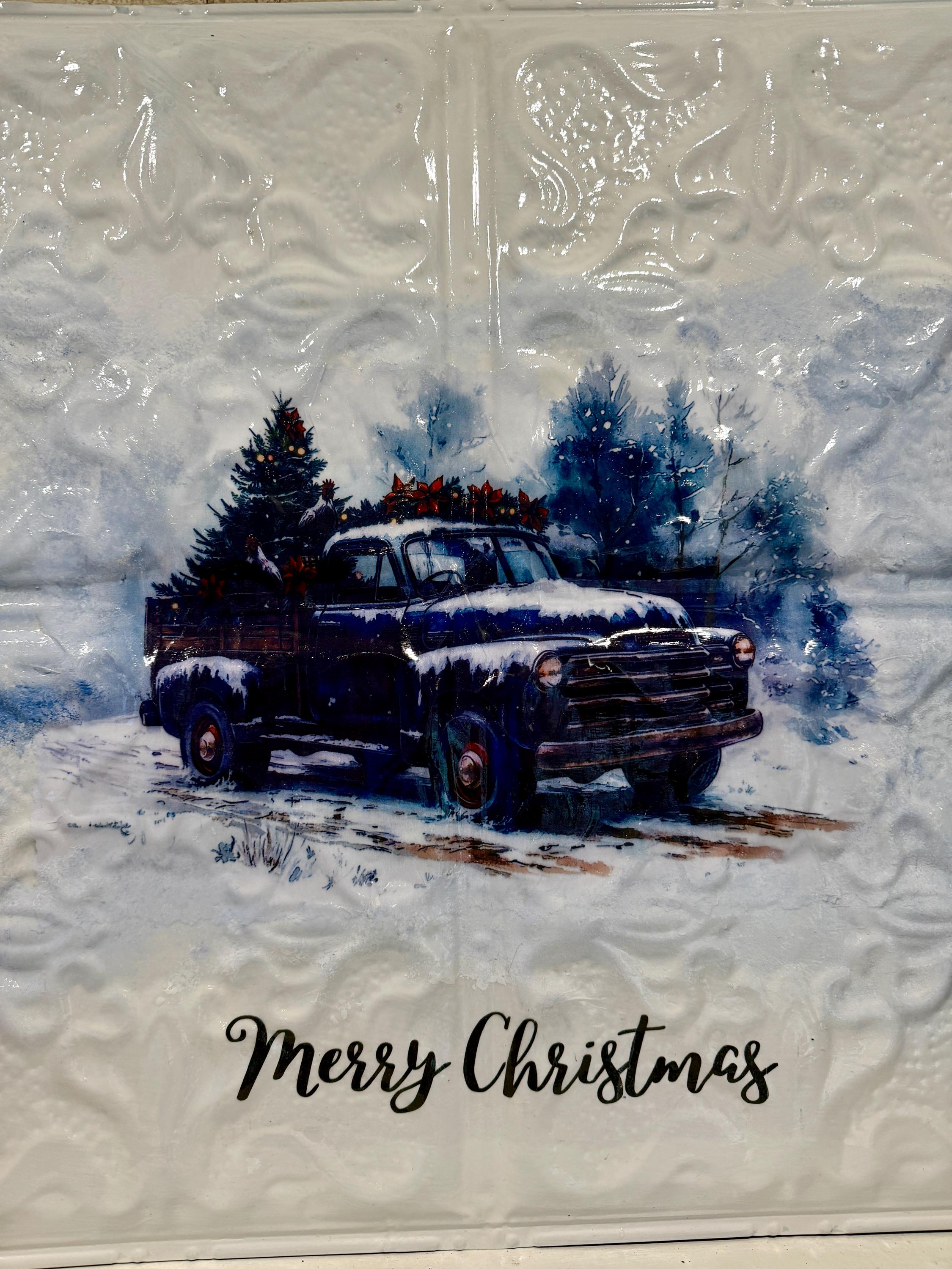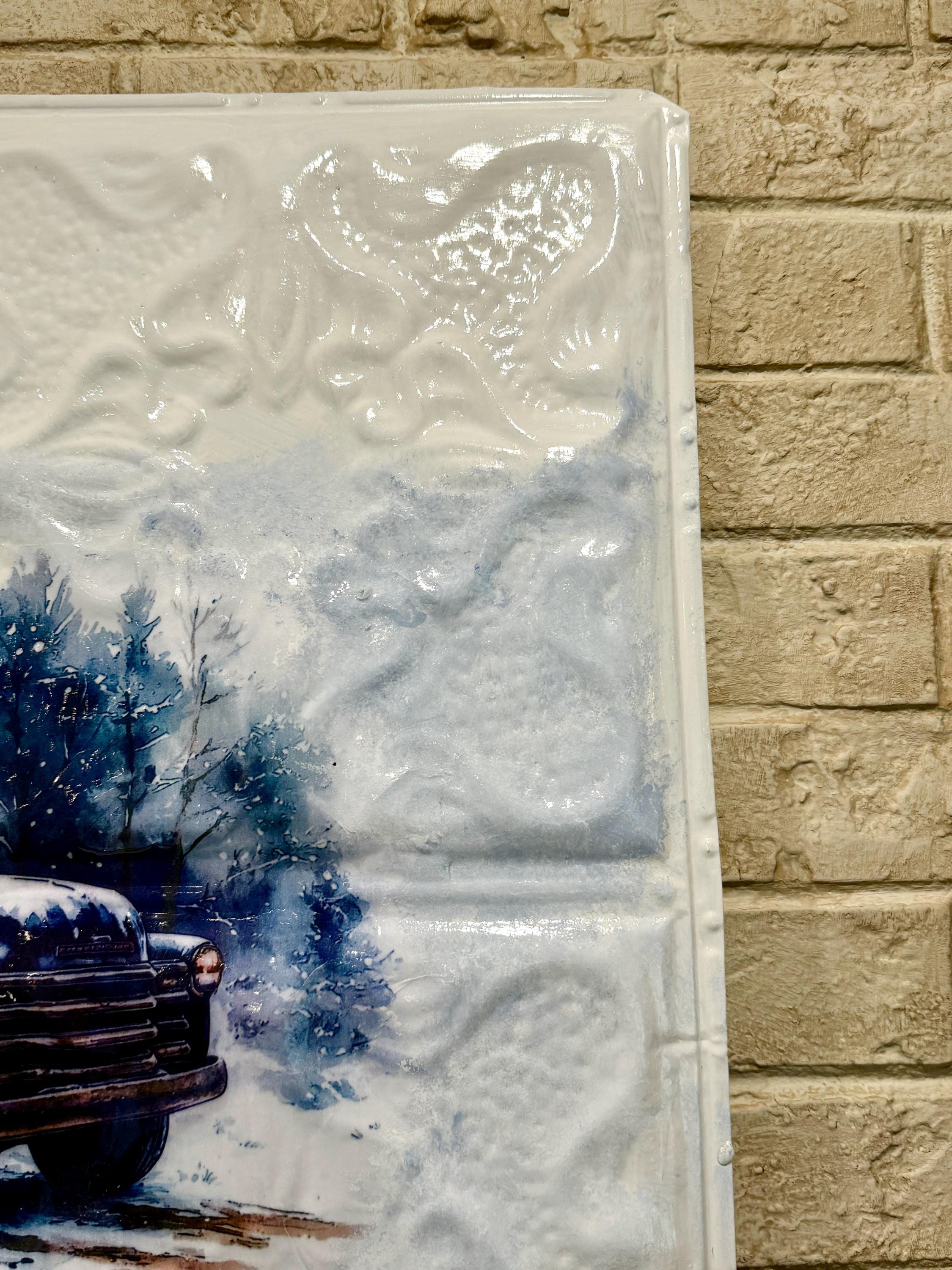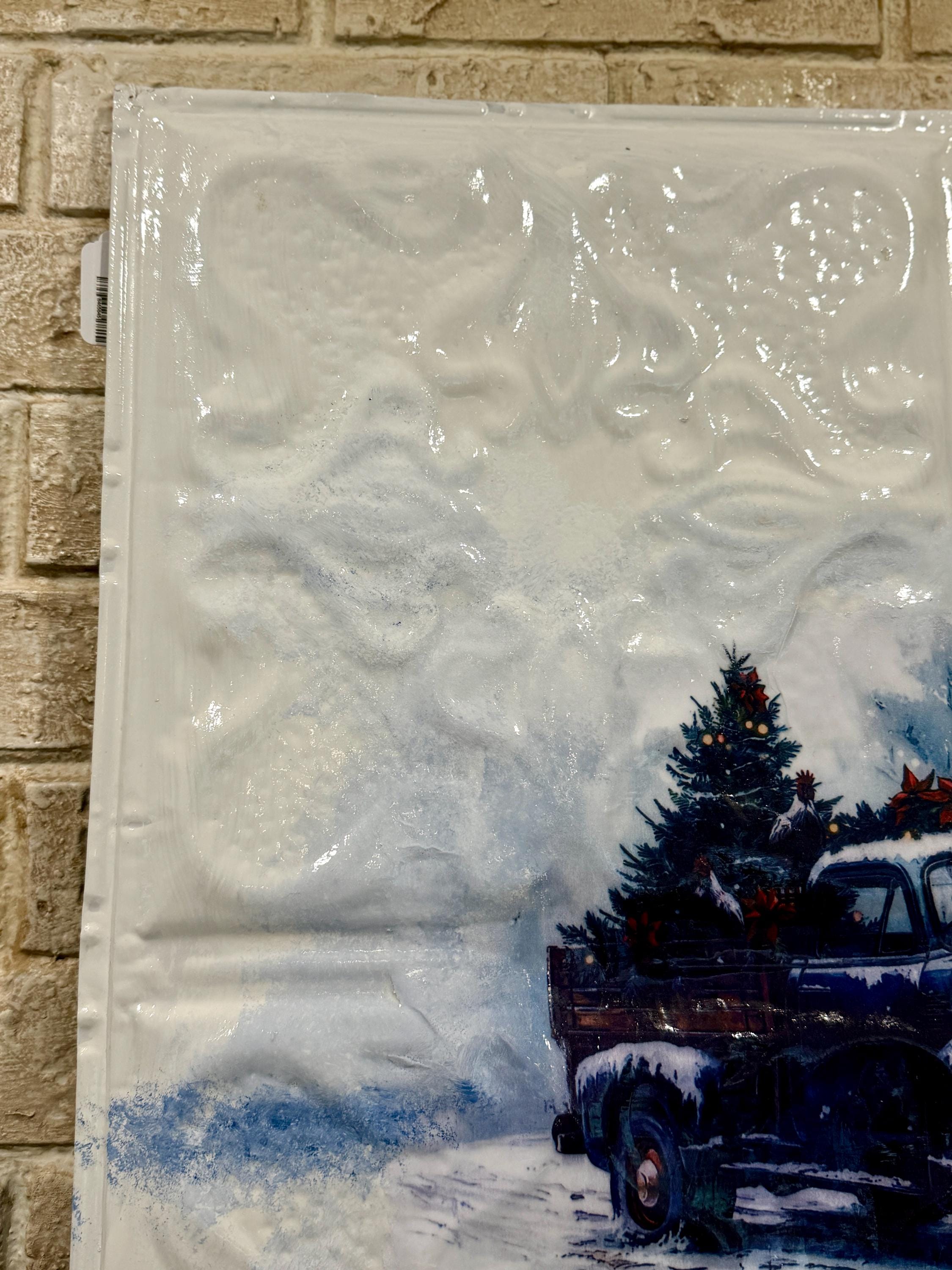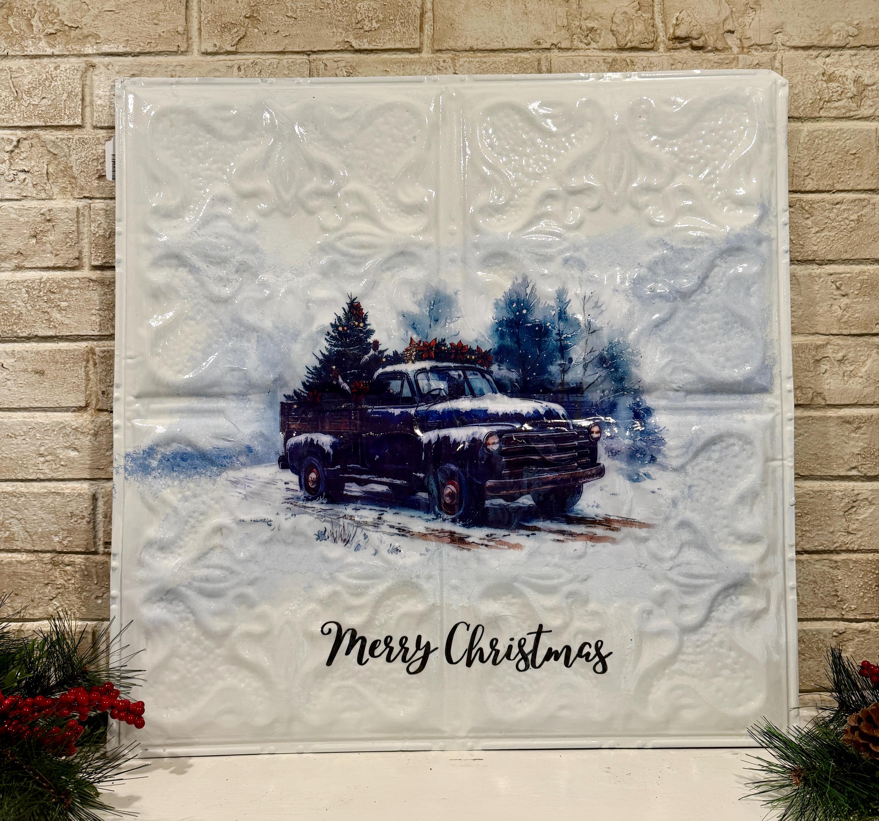 Celebrate rustic charm with this 24" square wall hanging featuring a vintage blue truck crafted from recycled metal. Perfect for farmhouse, country, or Americana-themed spaces, this eco-friendly piece adds nostalgic warmth to any room. Hand-cut and embossed for texture, it’s ideal for living rooms, man caves, or holiday displays