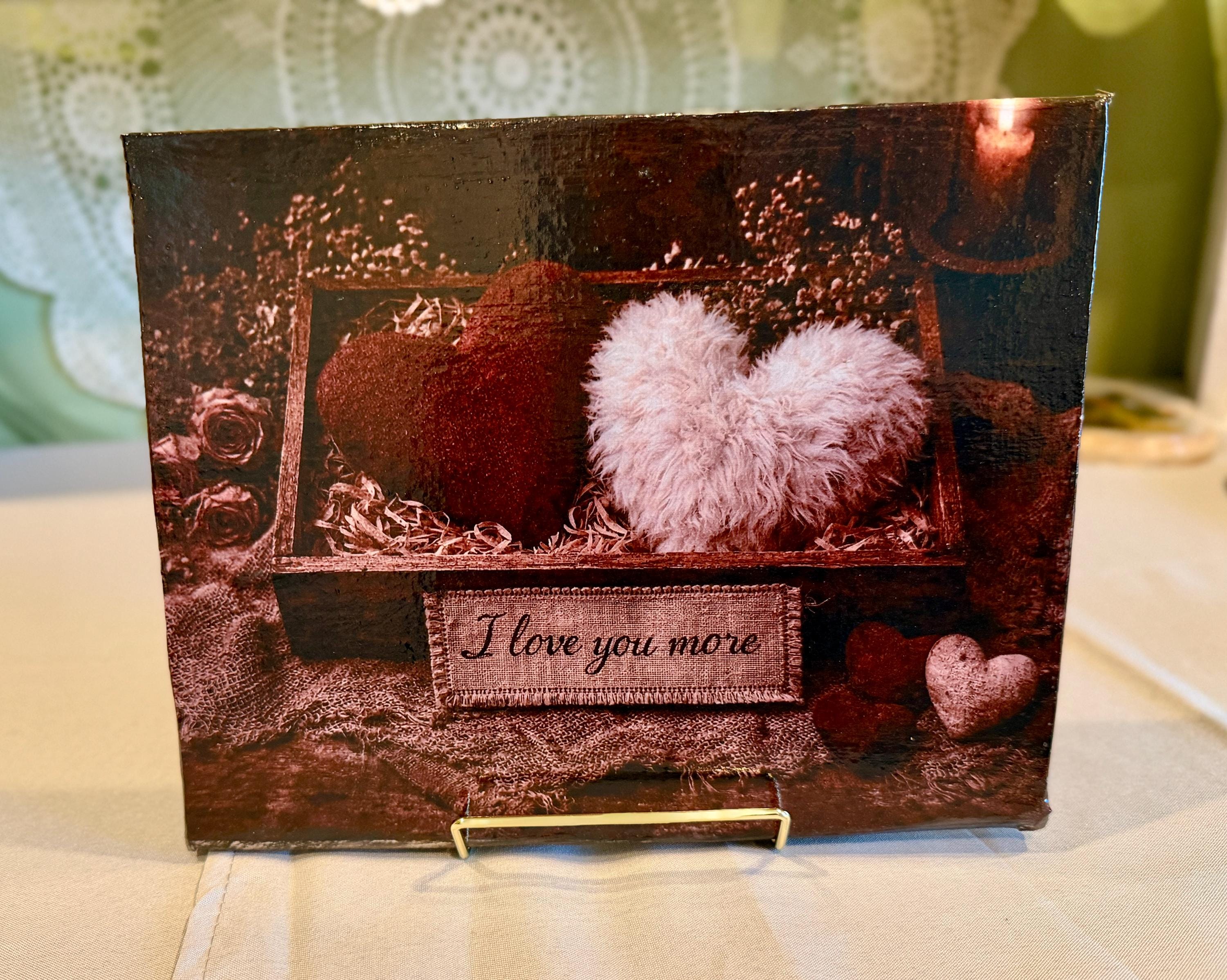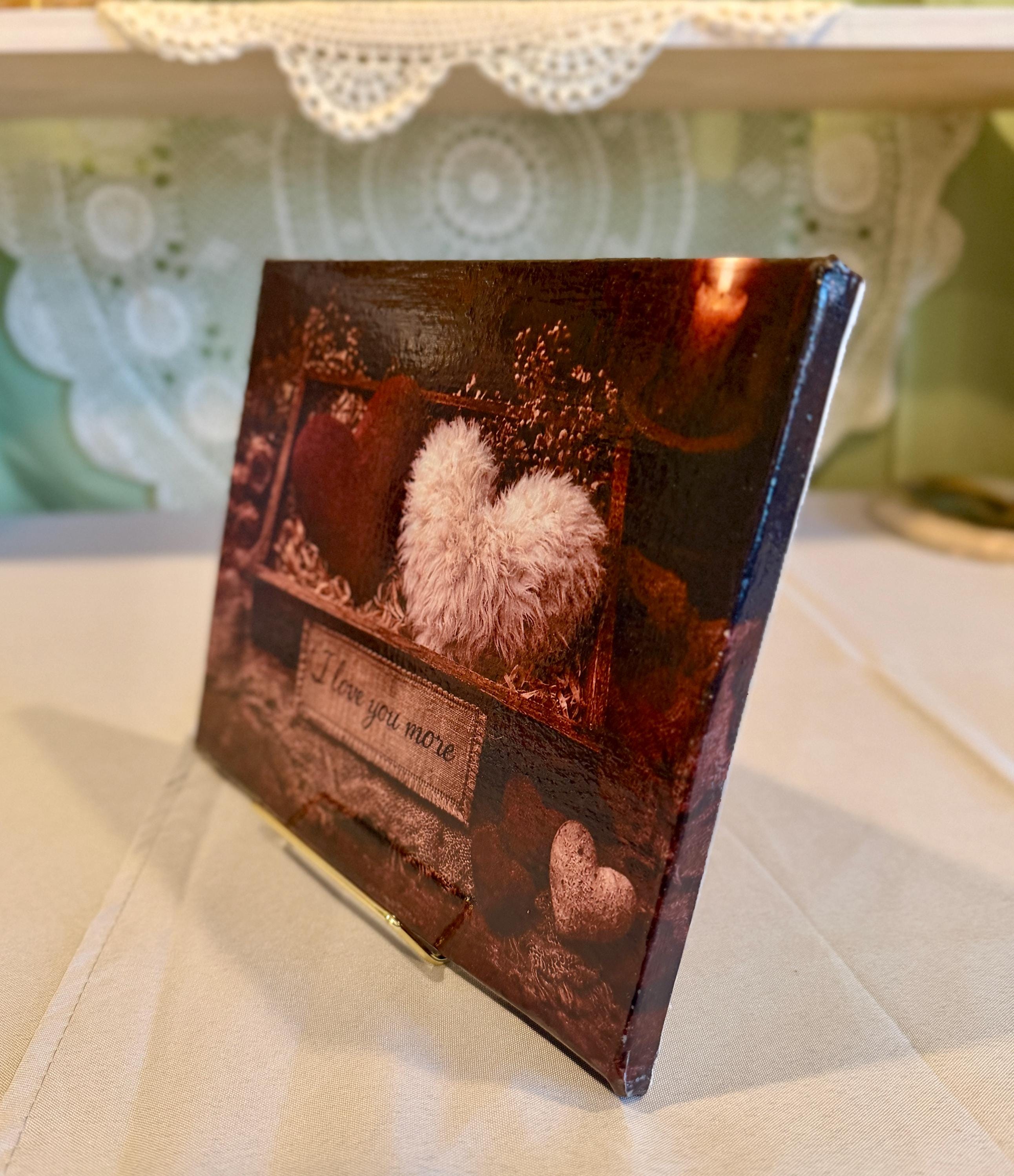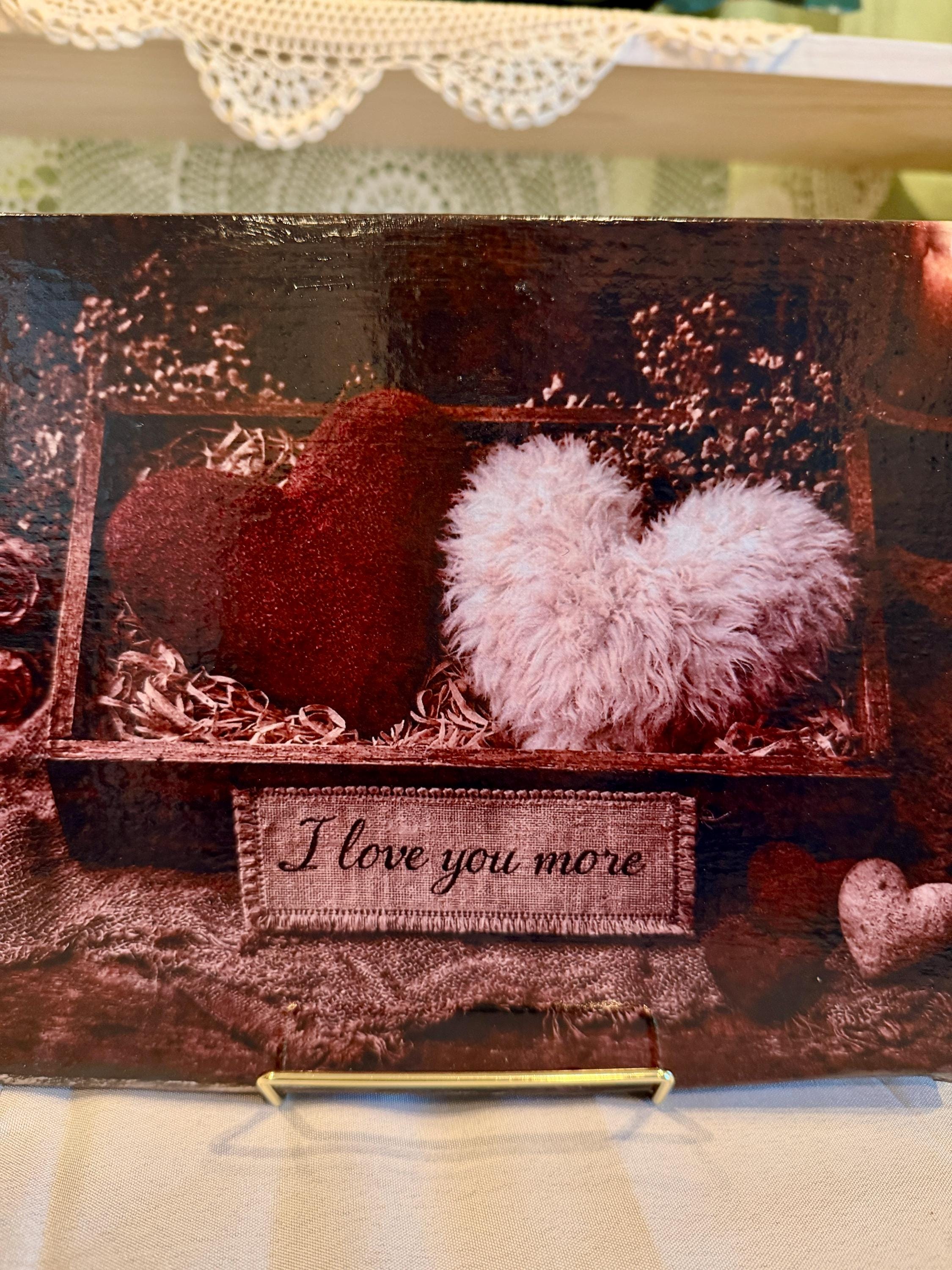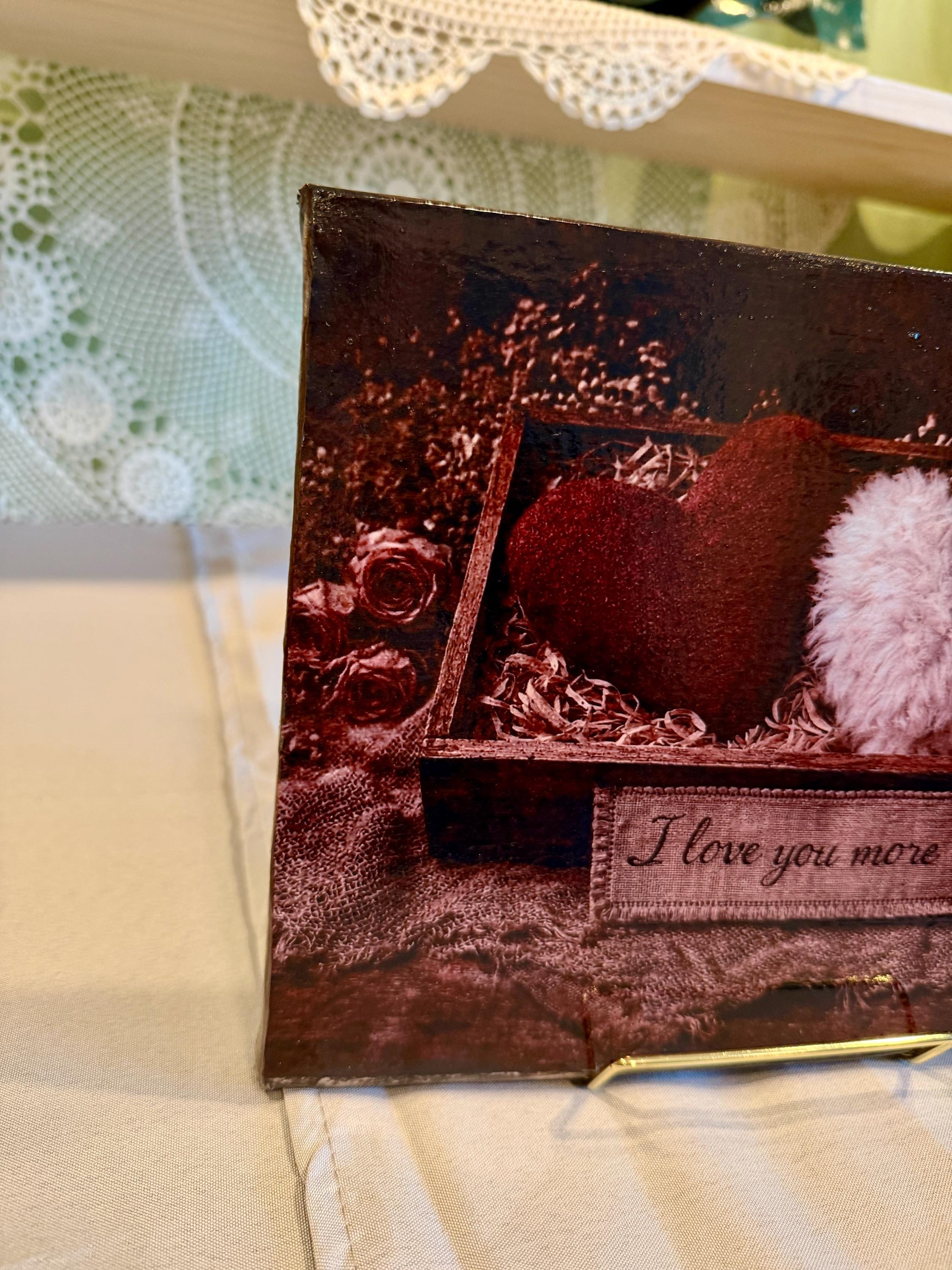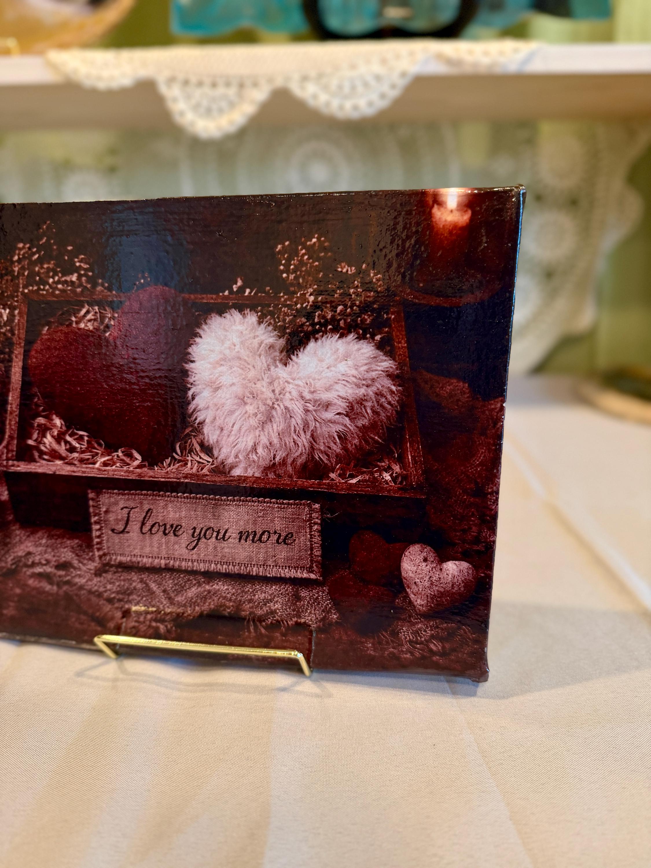Express your love with this heartfelt 8" x 10" Valentine’s Day canvas frame, featuring a cozy rustic box of hearts and the embroidered message “I love you more”. With its textured red and white hearts nestled in straw and surrounded by dried roses, this piece radiates warmth, nostalgia, and affection.